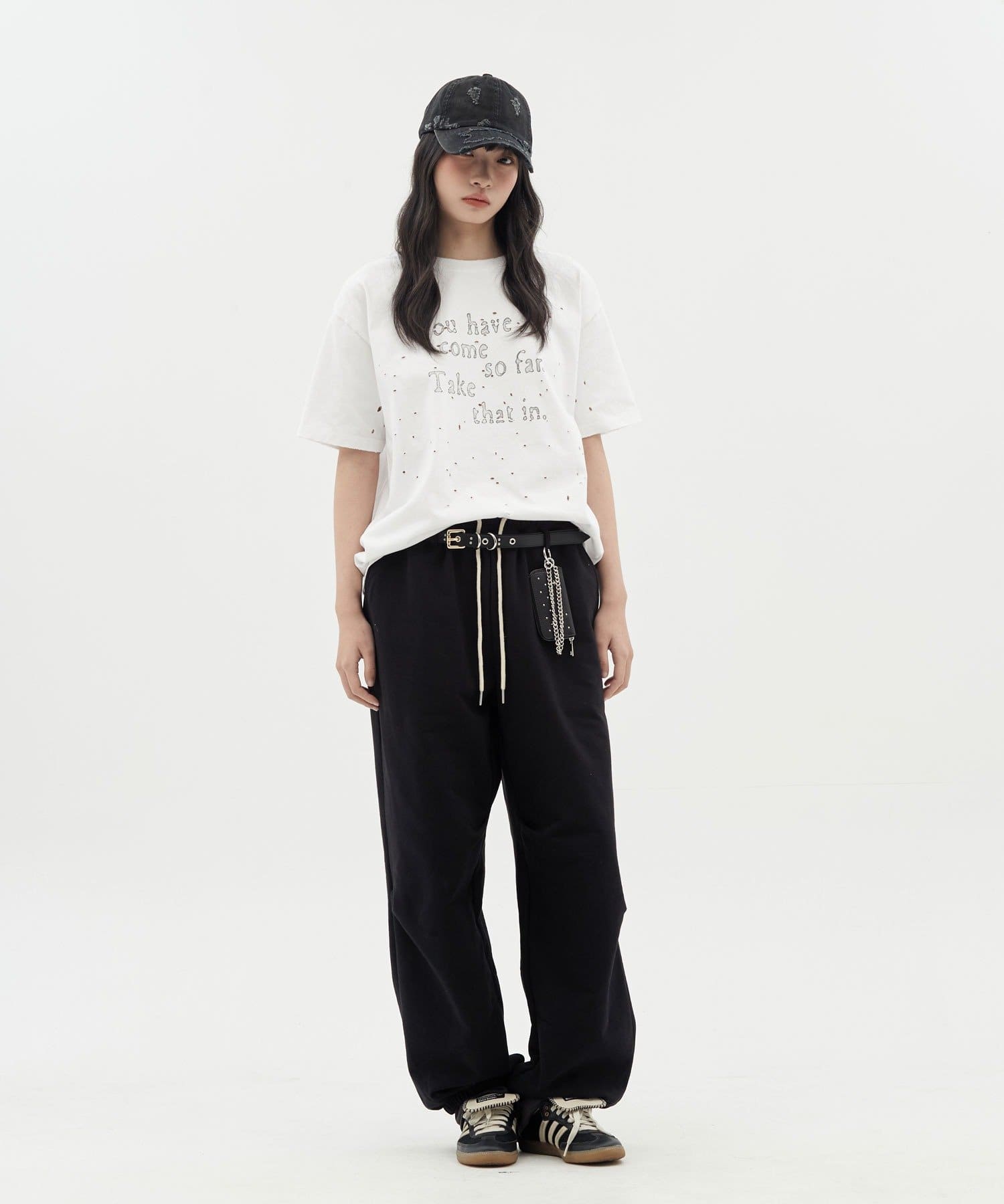 クラック感のあるグラフィックデザインにダメージ加工を加えることで、ラフさとヴィンテージ感が絶妙に融合した佇まいに。