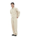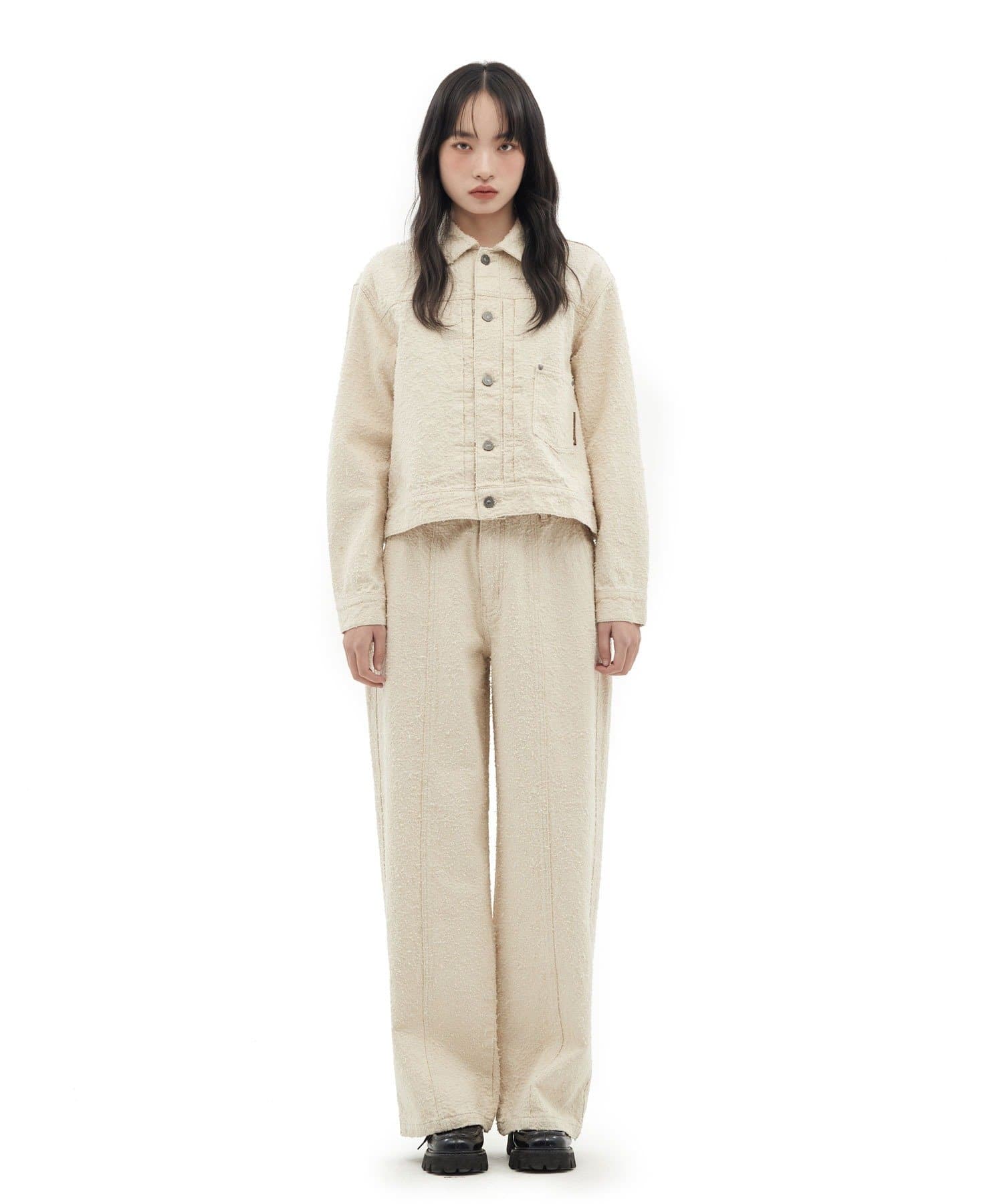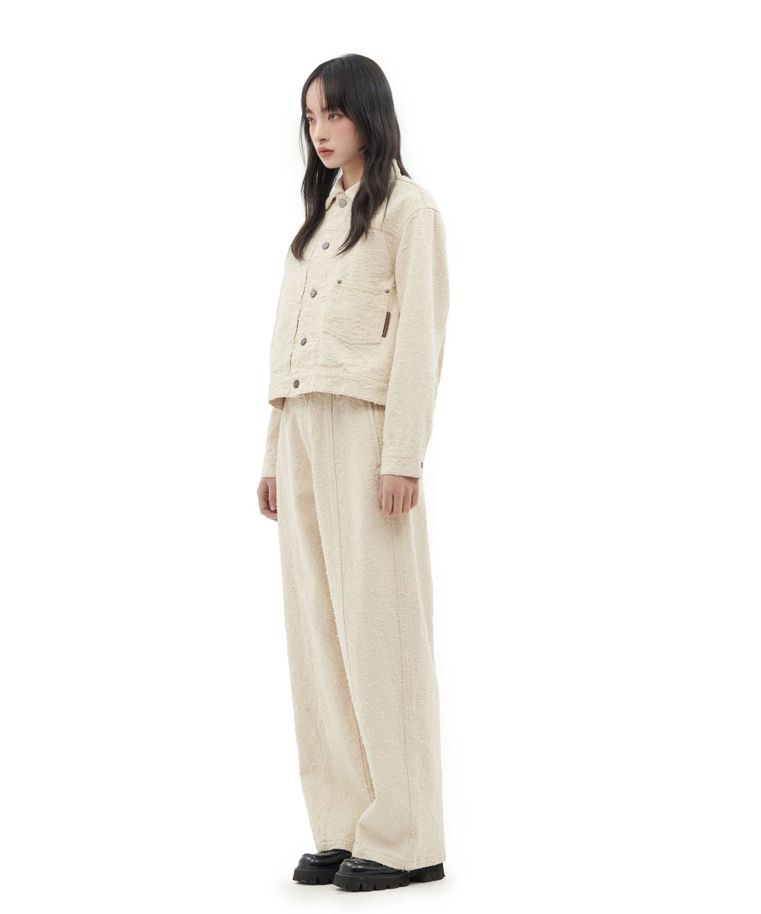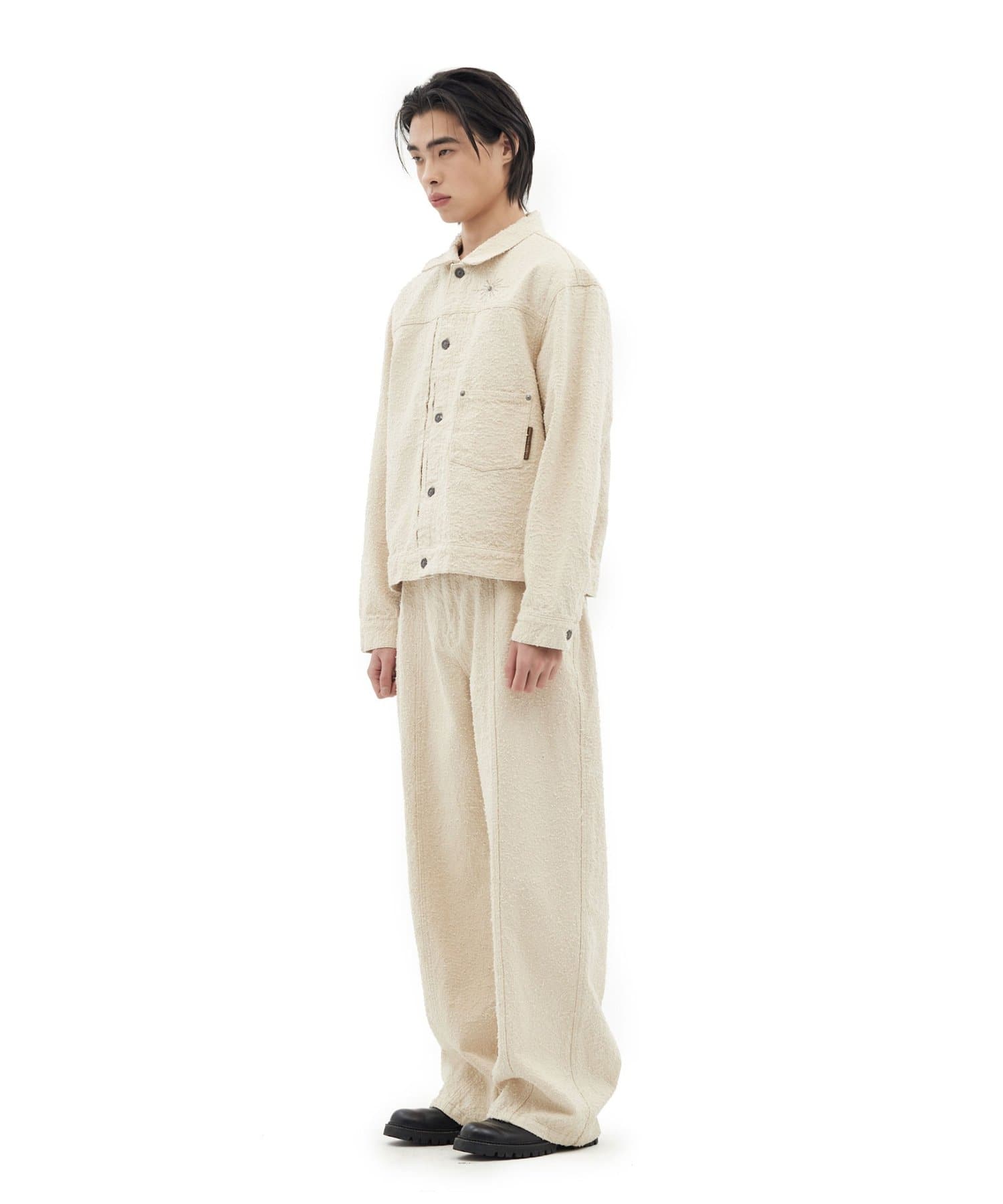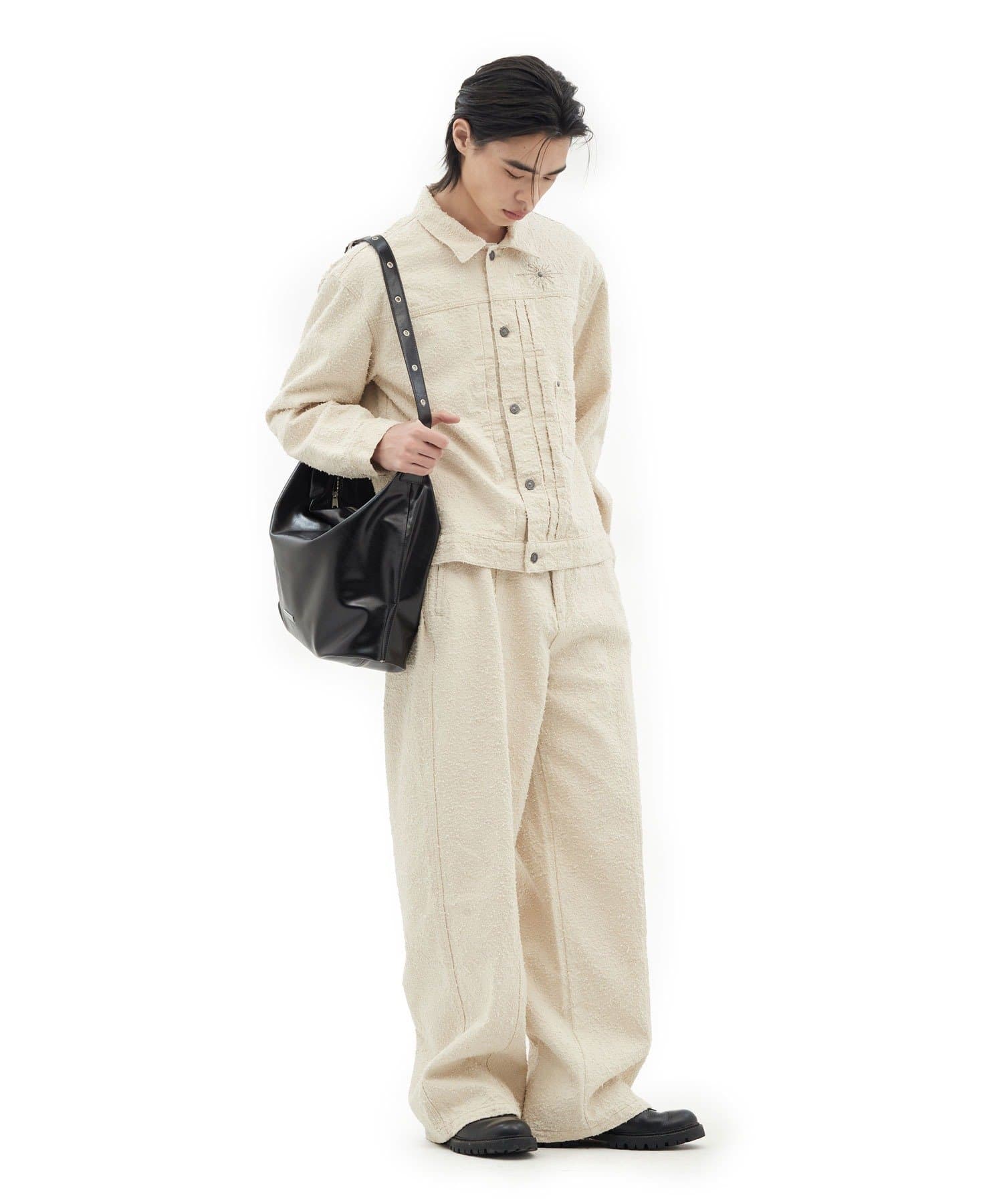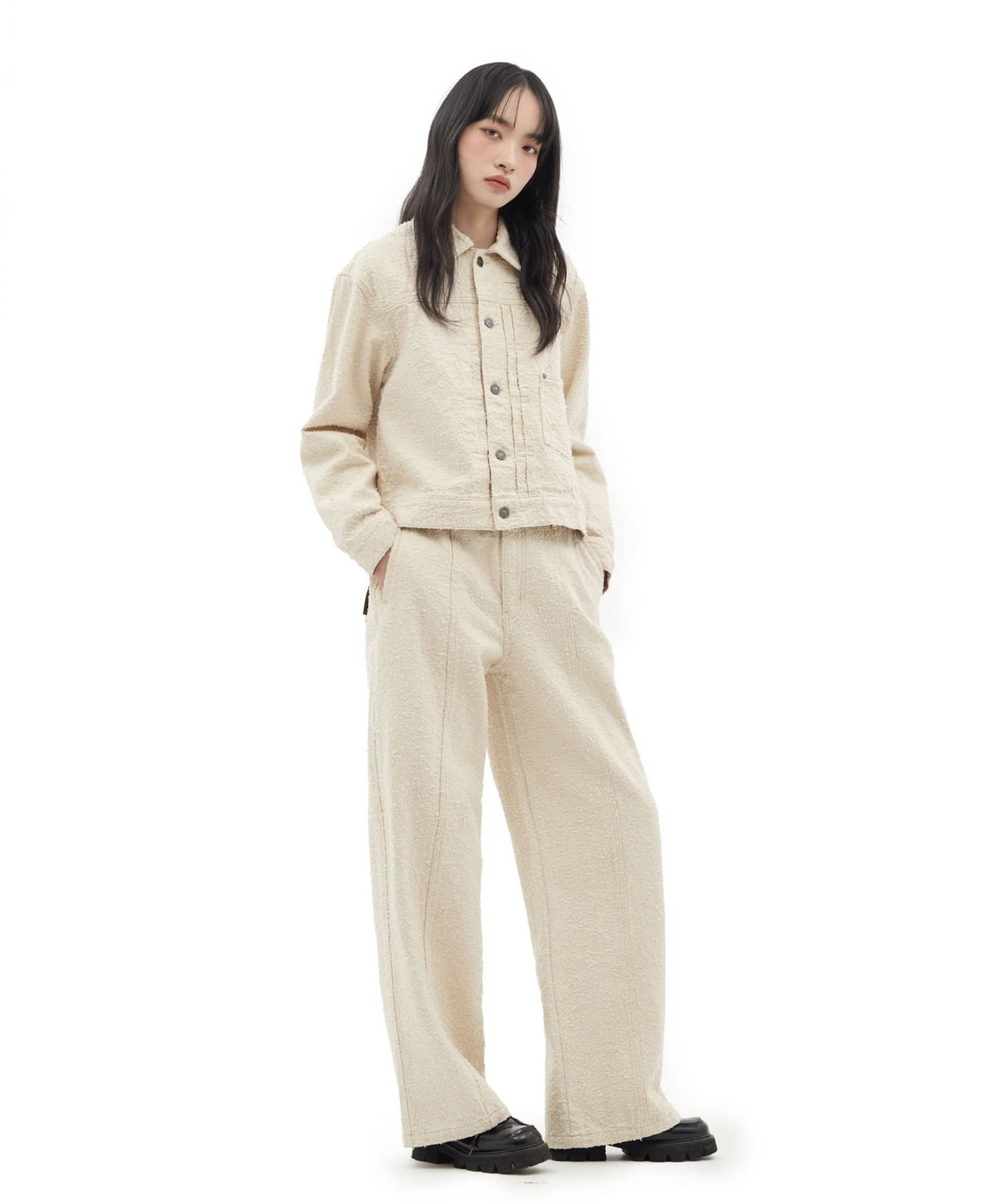 思わず触れたくなるような立体的な生地の表情が、ワントーンのカラーリングに奥行きを与え、上品かつリラックスしたムードを醸し出します。