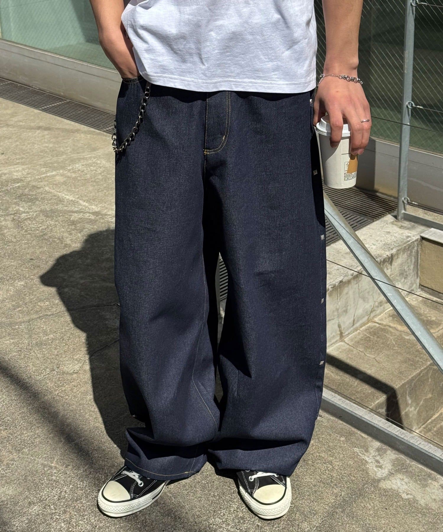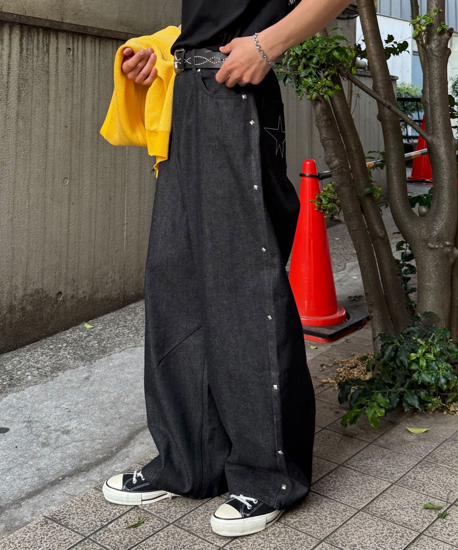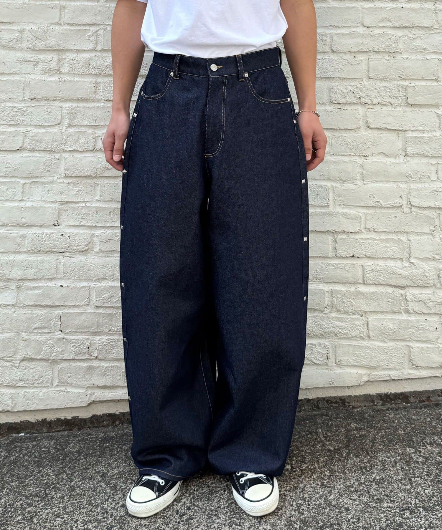 サイドにずらりと並んだスタッズデザインがエッジを効かせるワイドデニムパンツ。