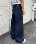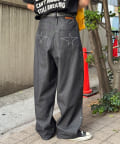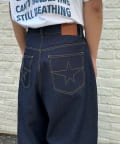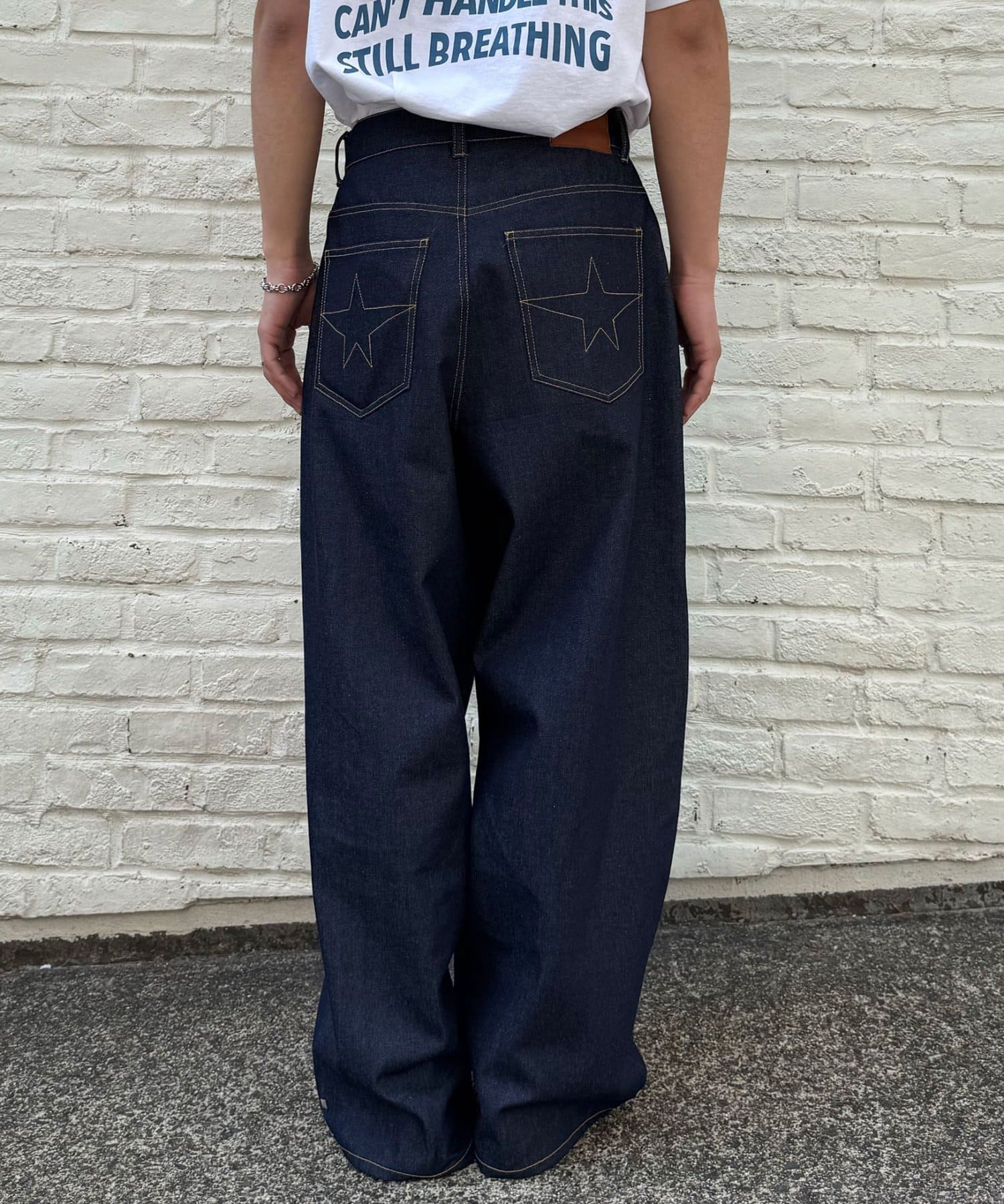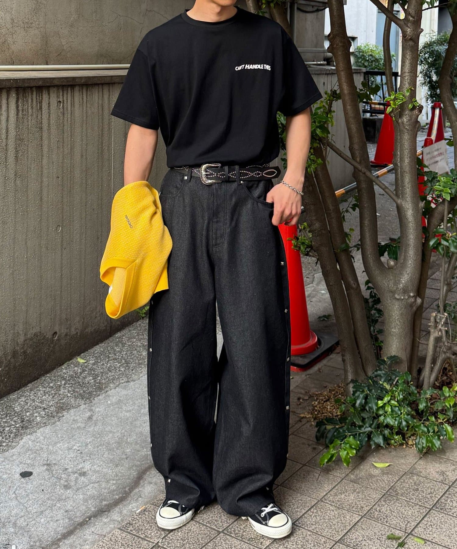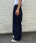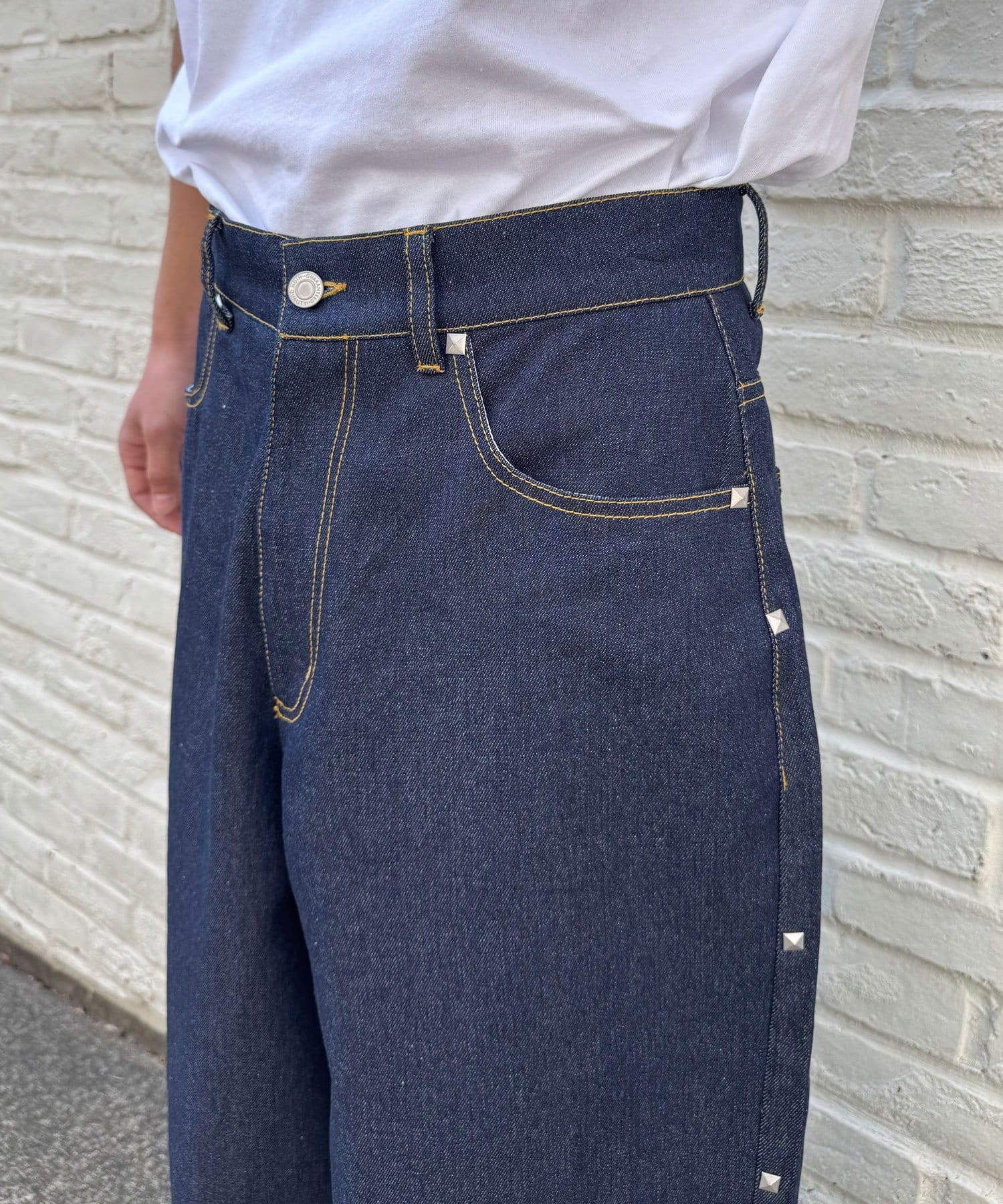 サイドにずらりと並んだスタッズデザインがエッジを効かせるワイドデニムパンツ。