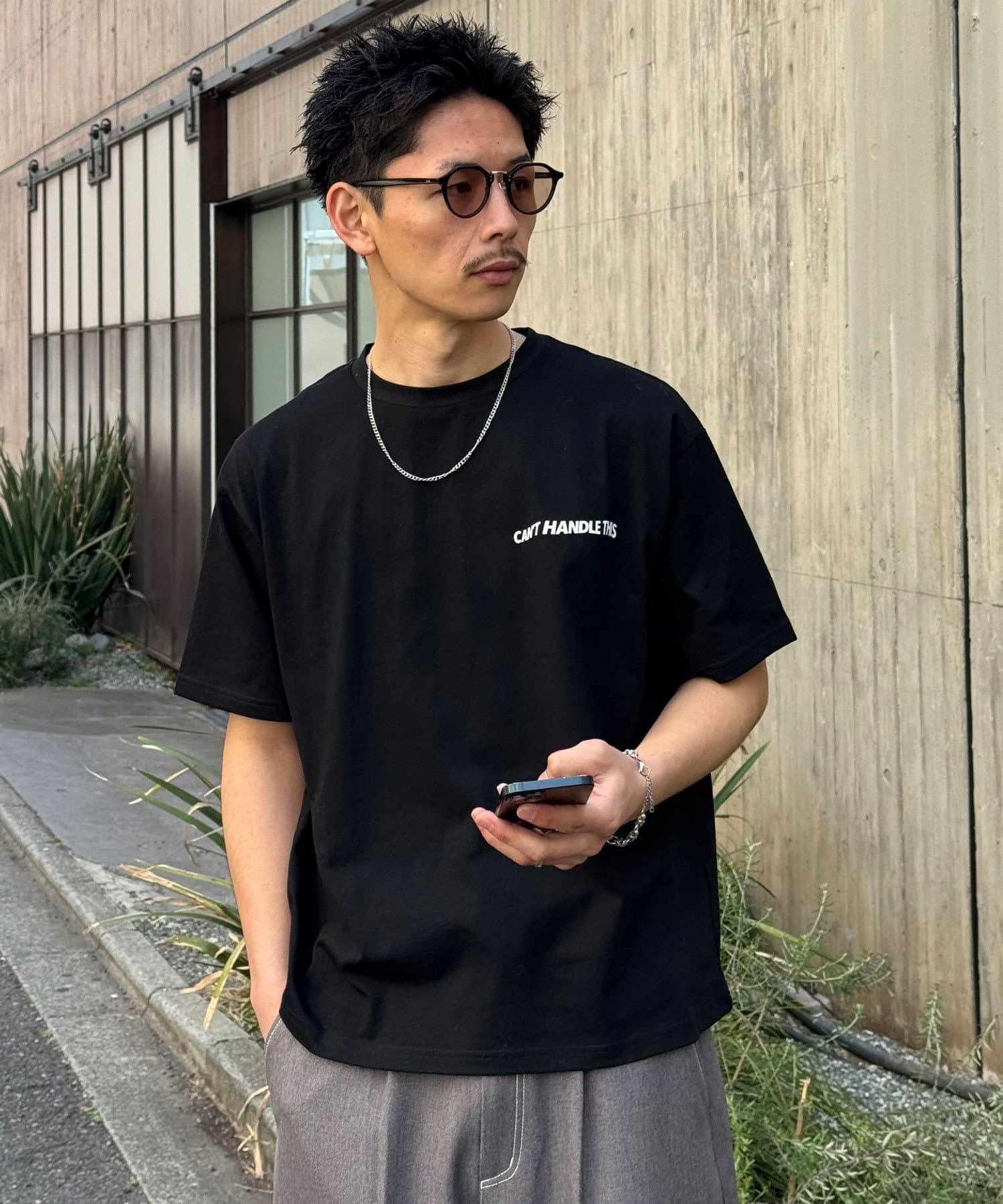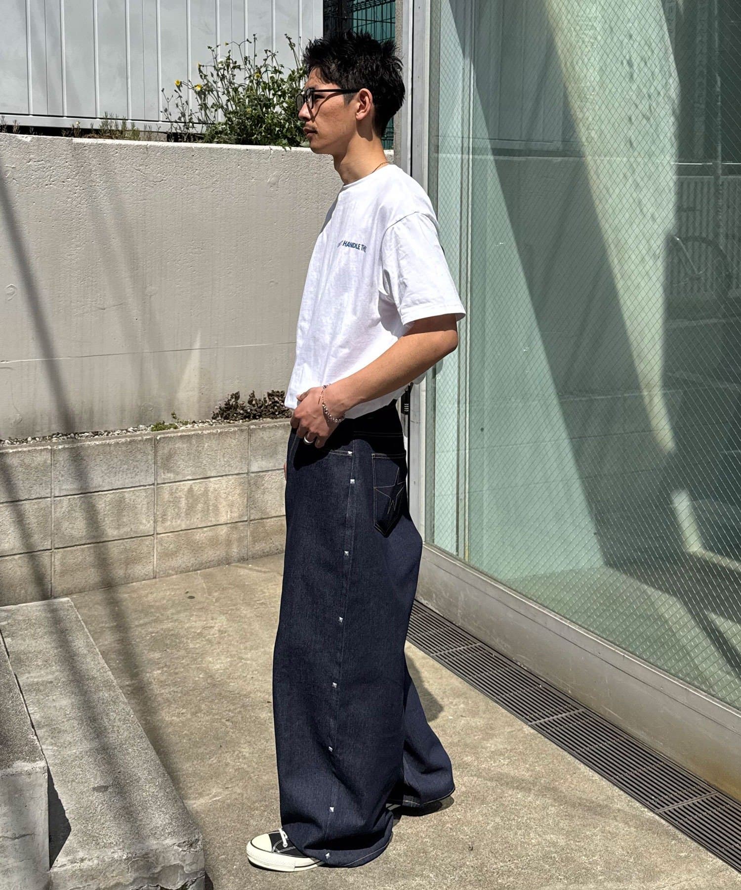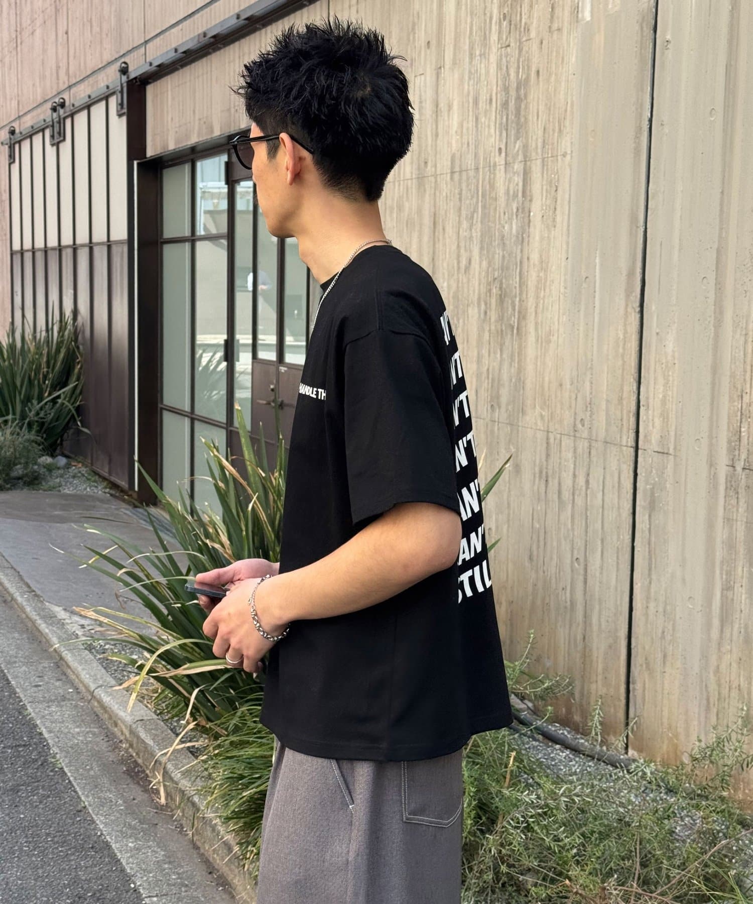 太めのスラックスやデニムと合わせた、ルーズなストリートスタイルが相性抜群。