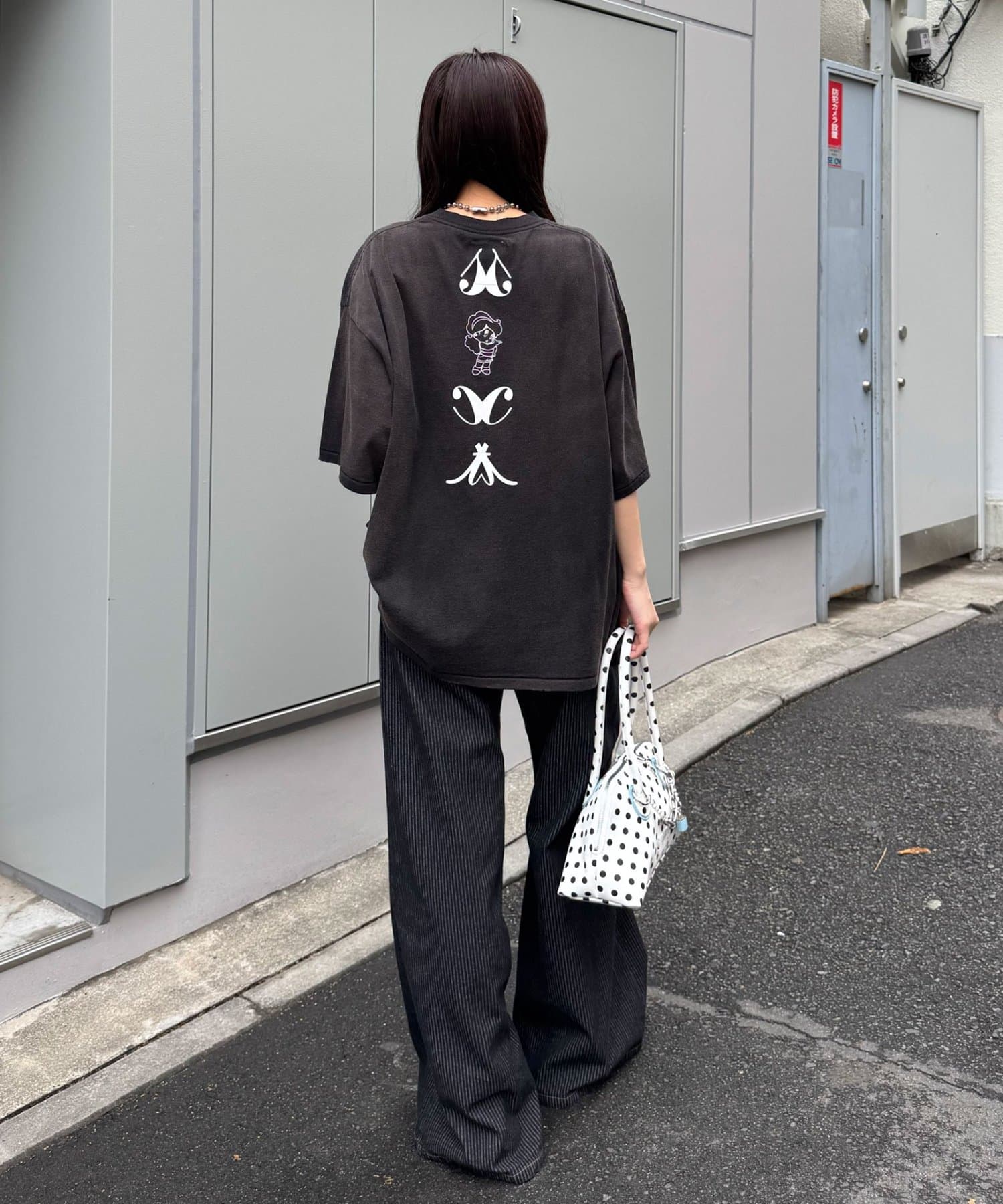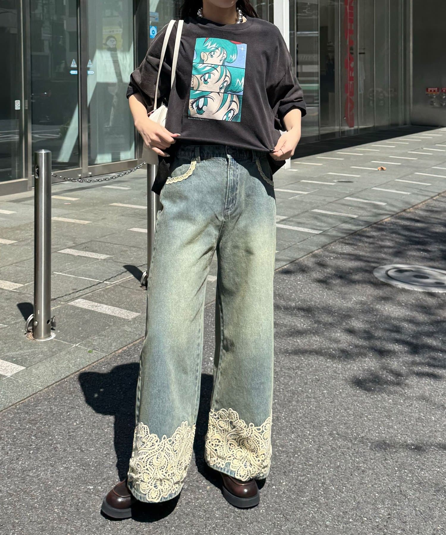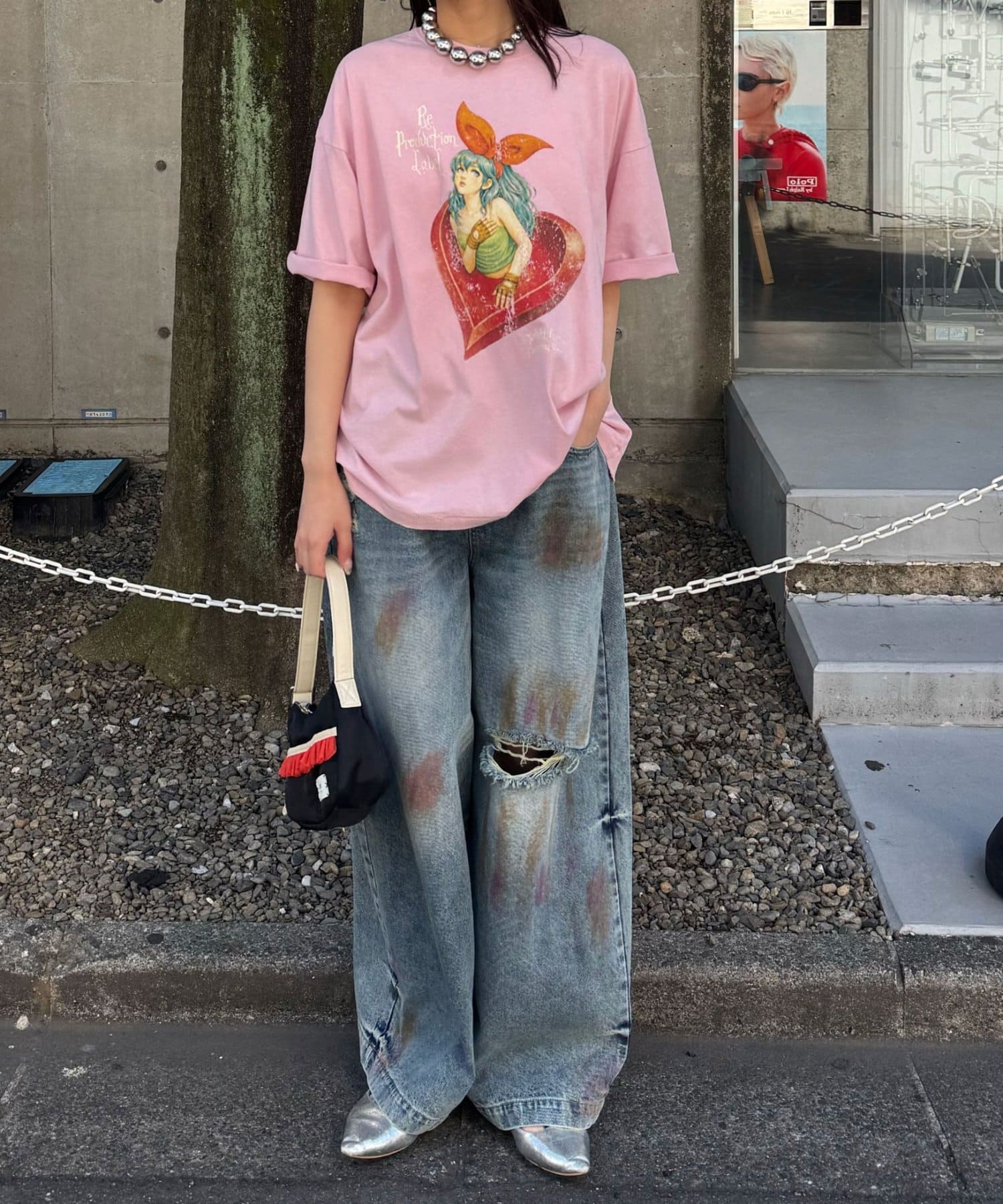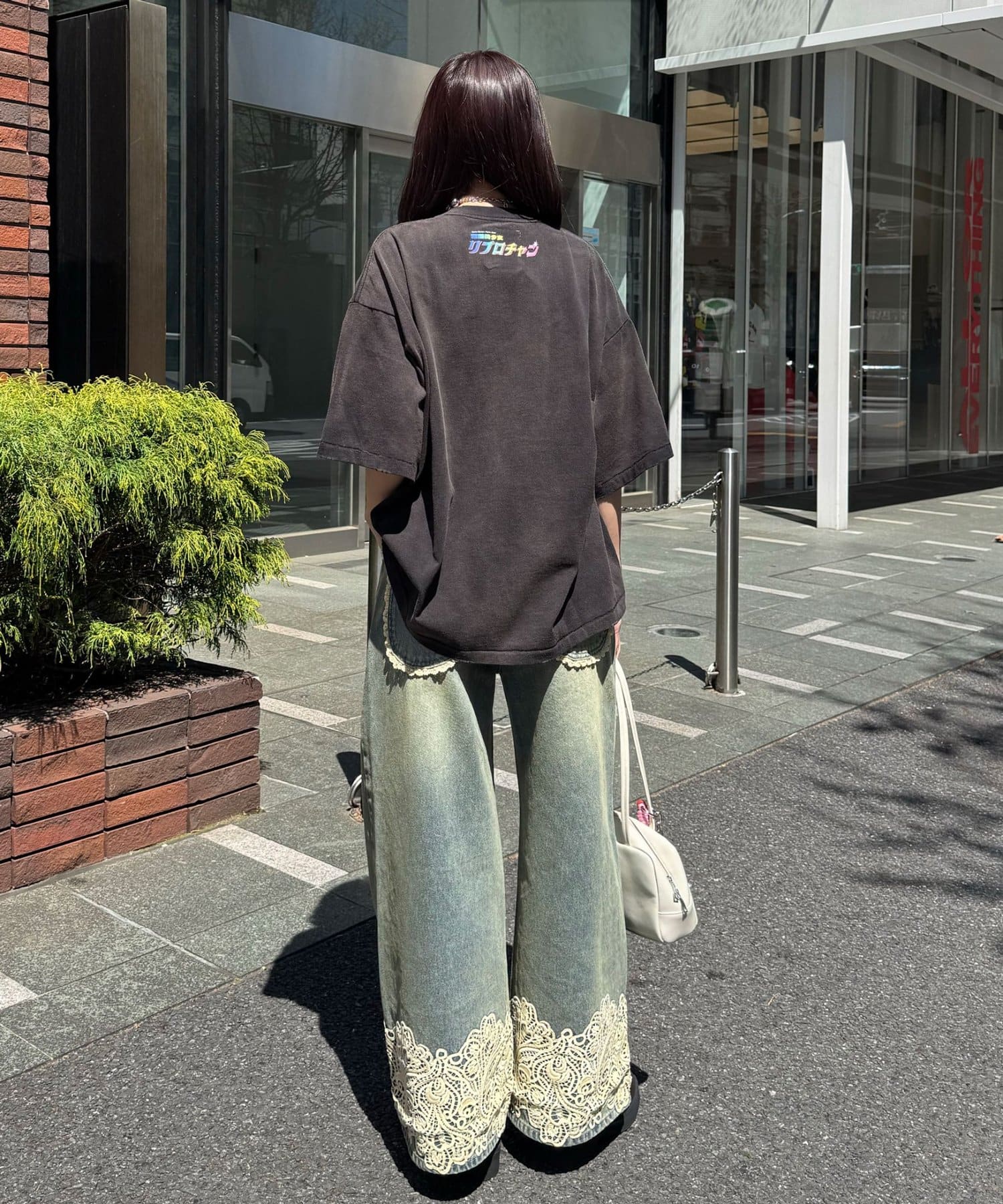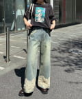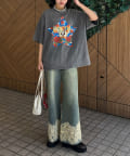 絶妙な色落ち感と、あえてラフに仕上げたグラインダーダメージ、味のあるひび割れプリントが古着のような奥行きを感じさせます。