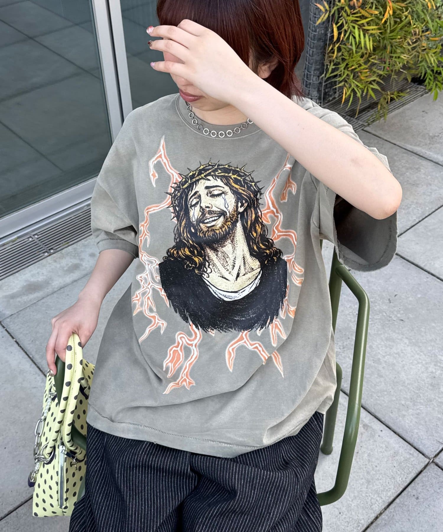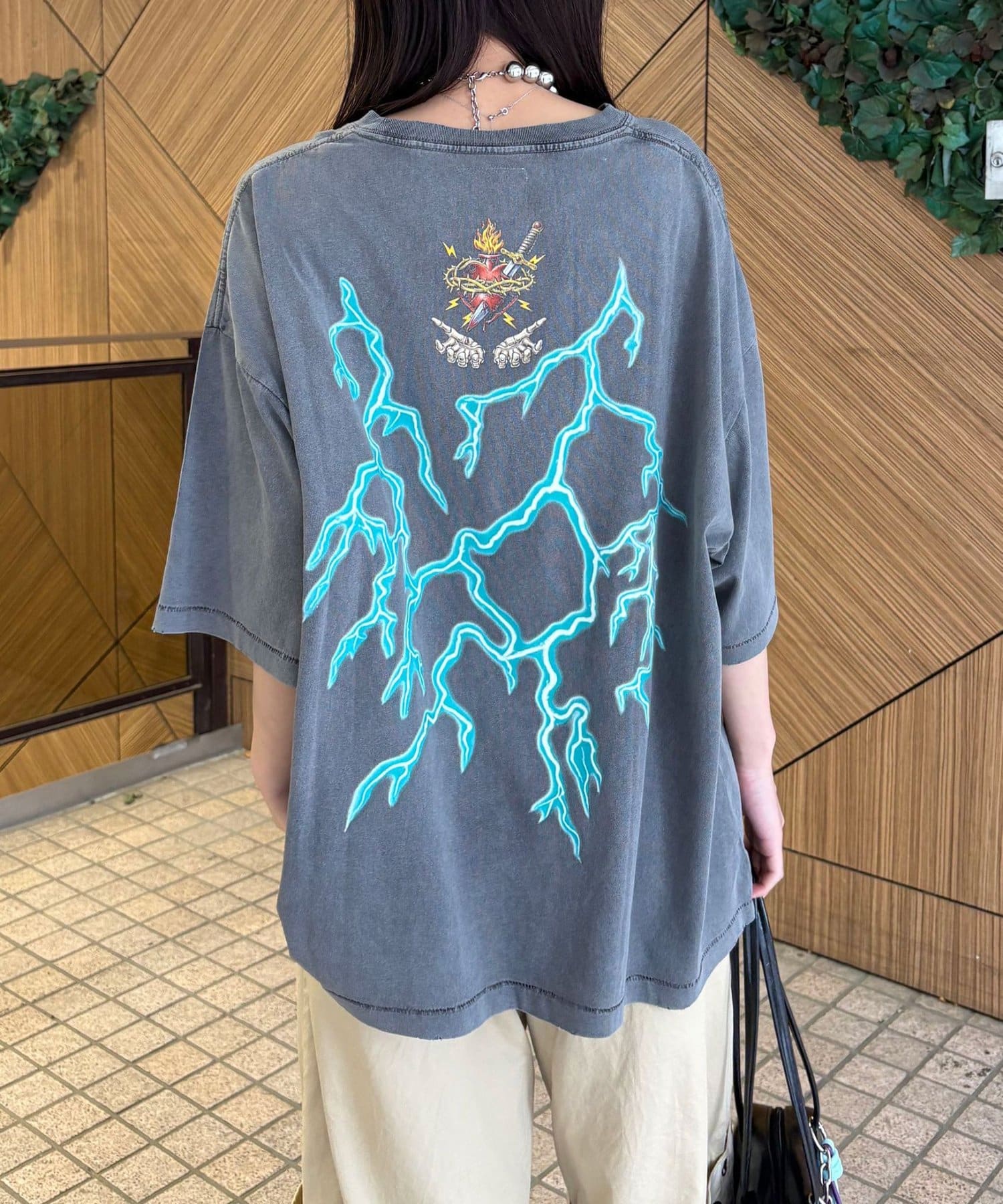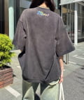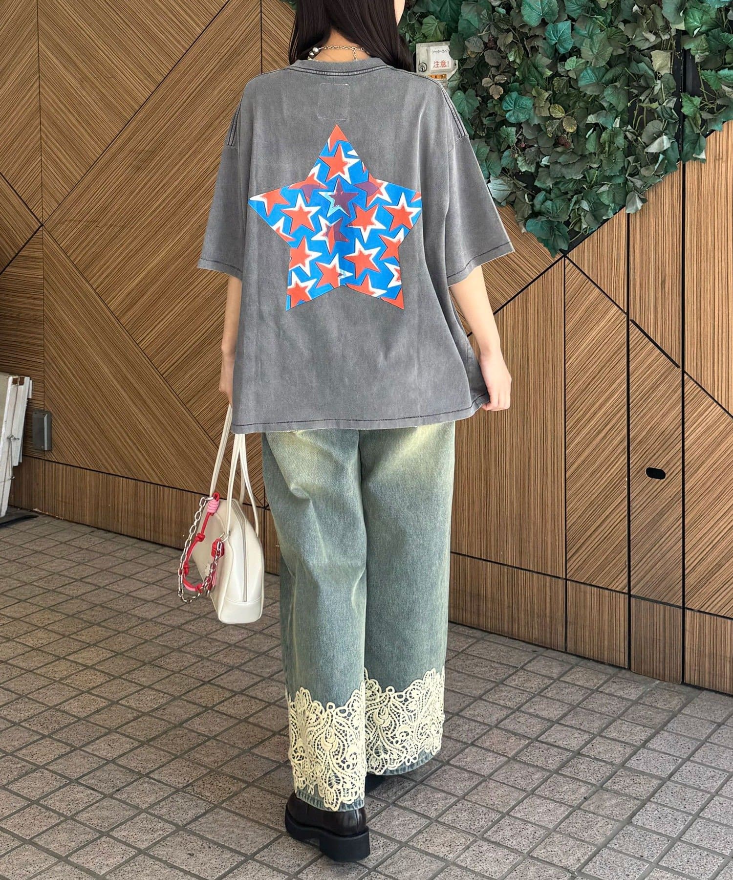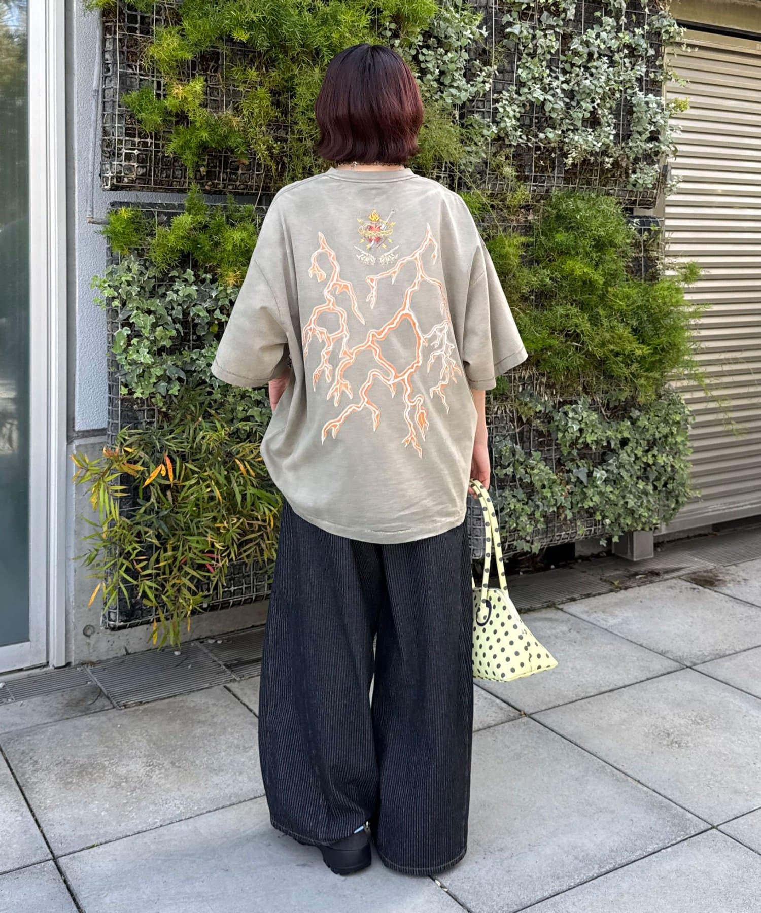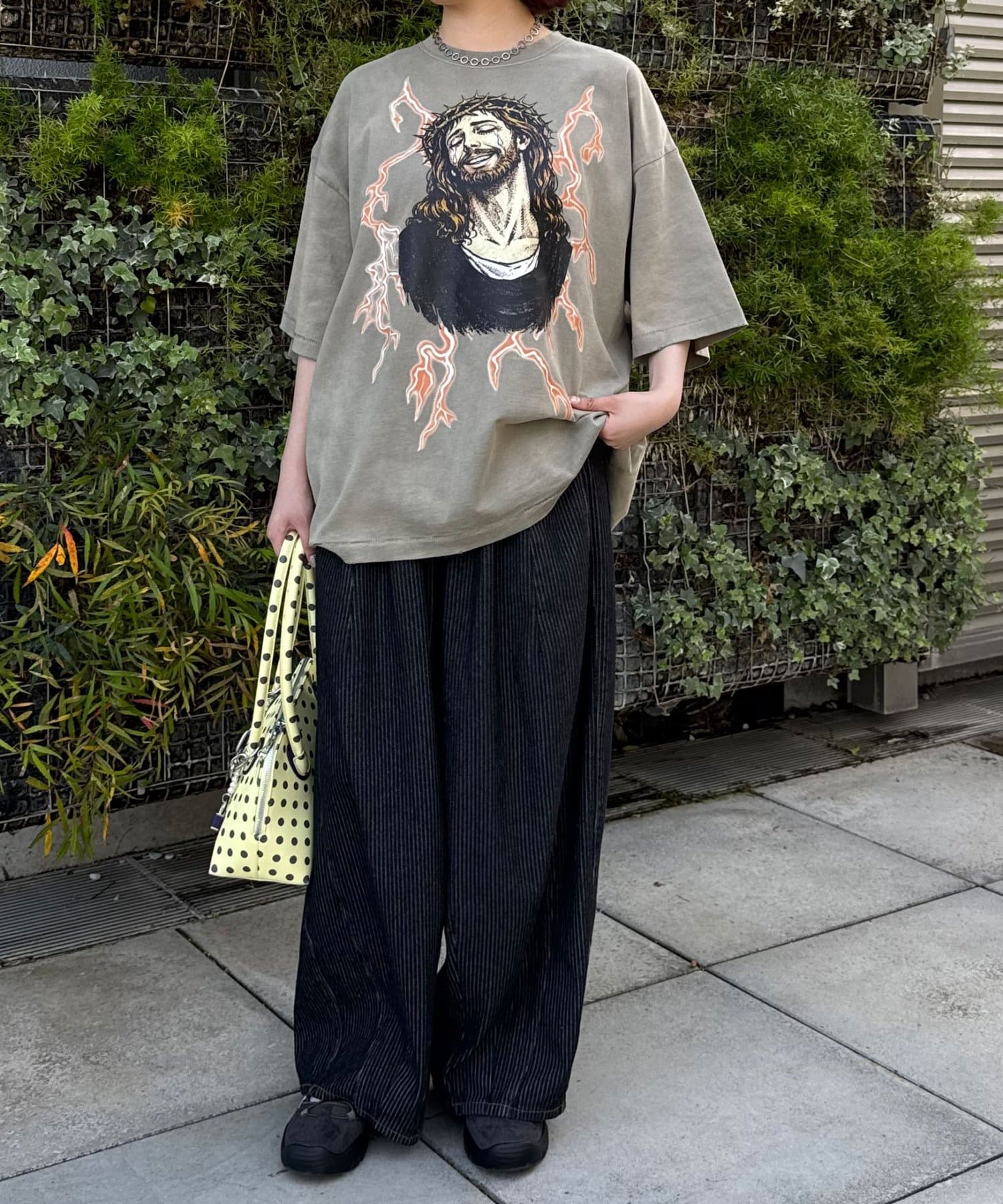 絶妙な色落ち感と、あえてラフに仕上げたグラインダーダメージ、味のあるひび割れプリントが古着のような奥行きを感じさせます。
