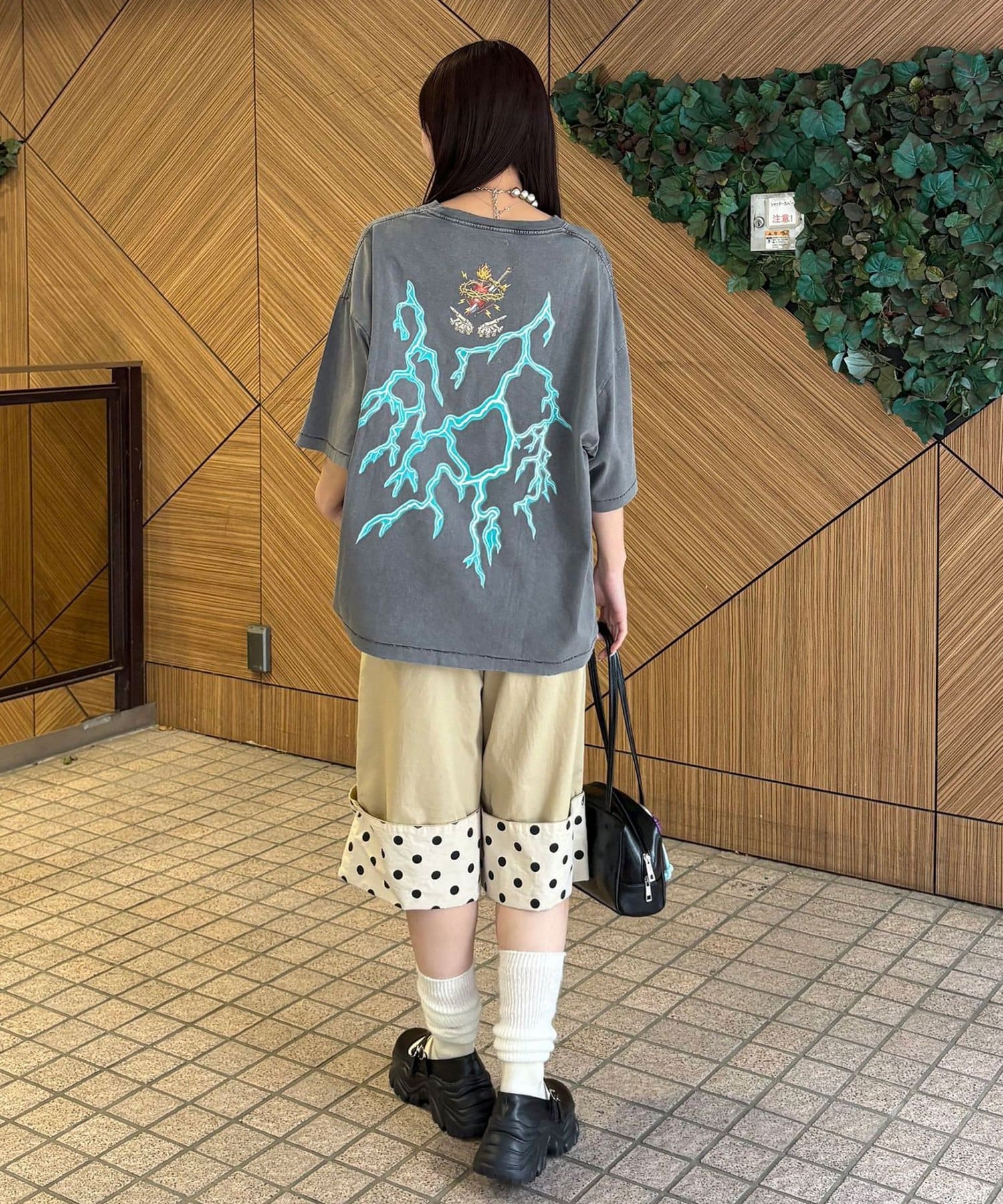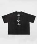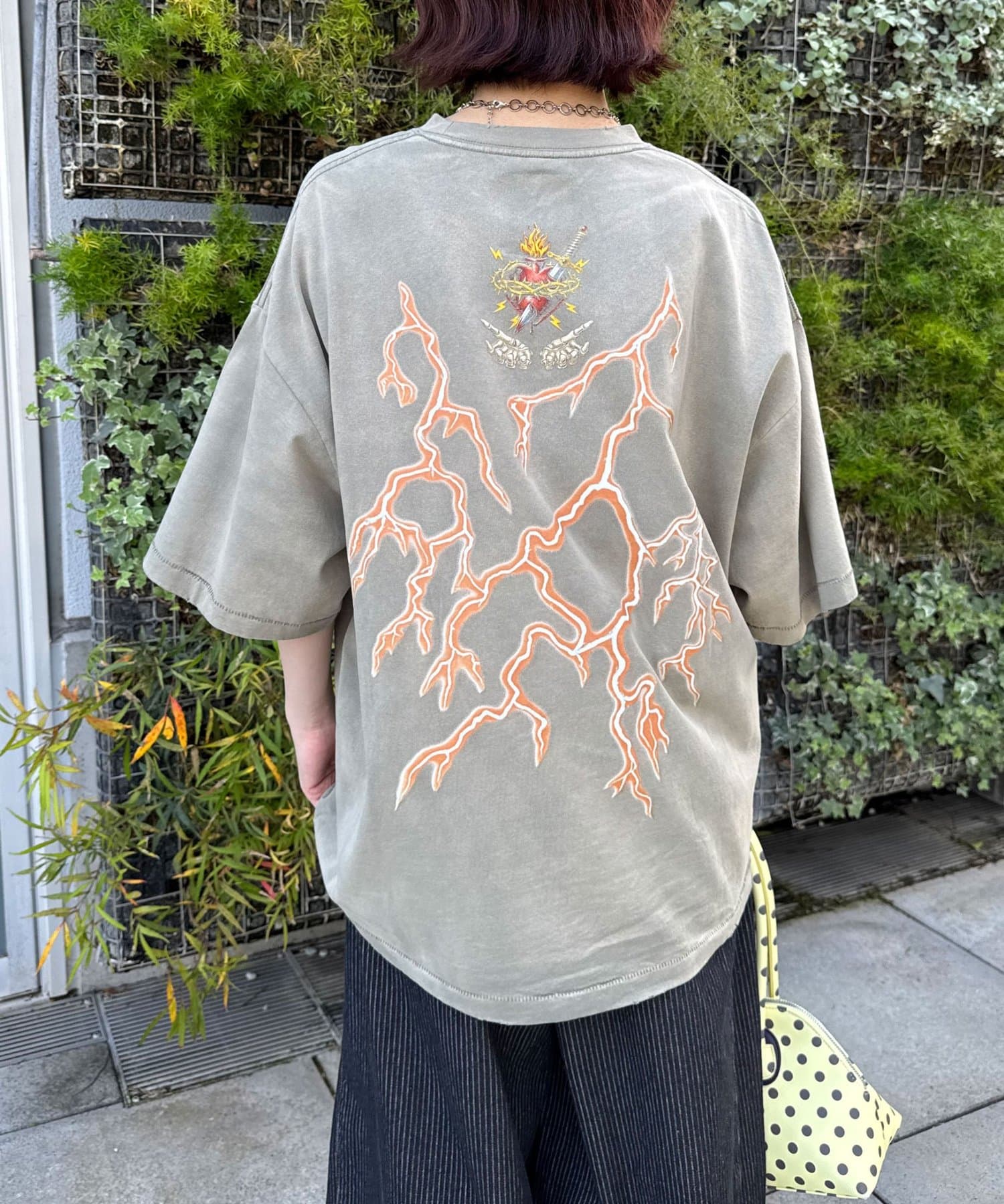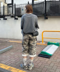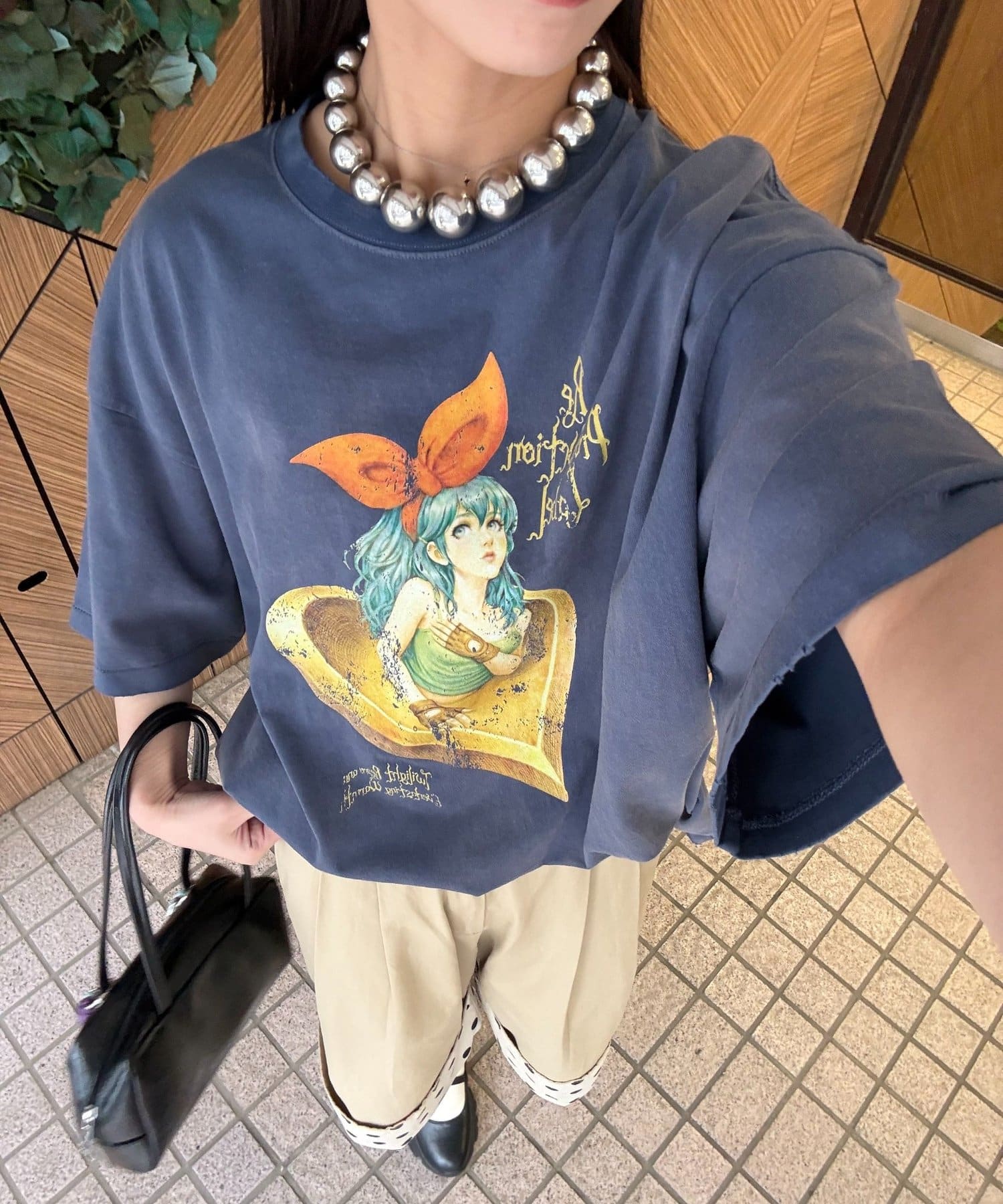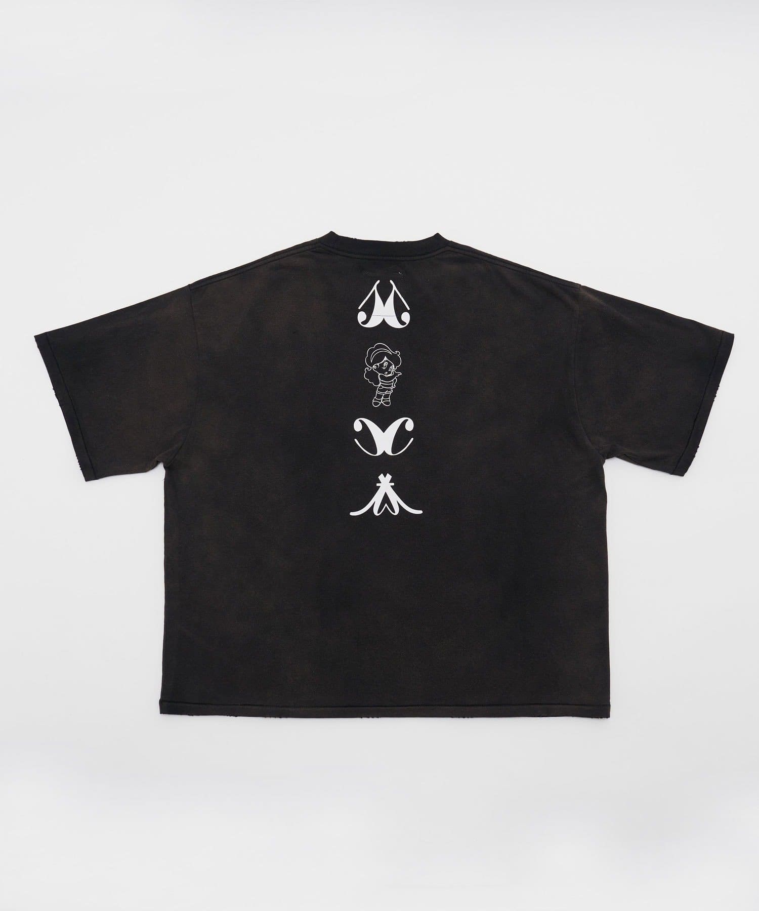 絶妙な色落ち感と、あえてラフに仕上げたグラインダーダメージ、味のあるひび割れプリントが古着のような奥行きを感じさせます。