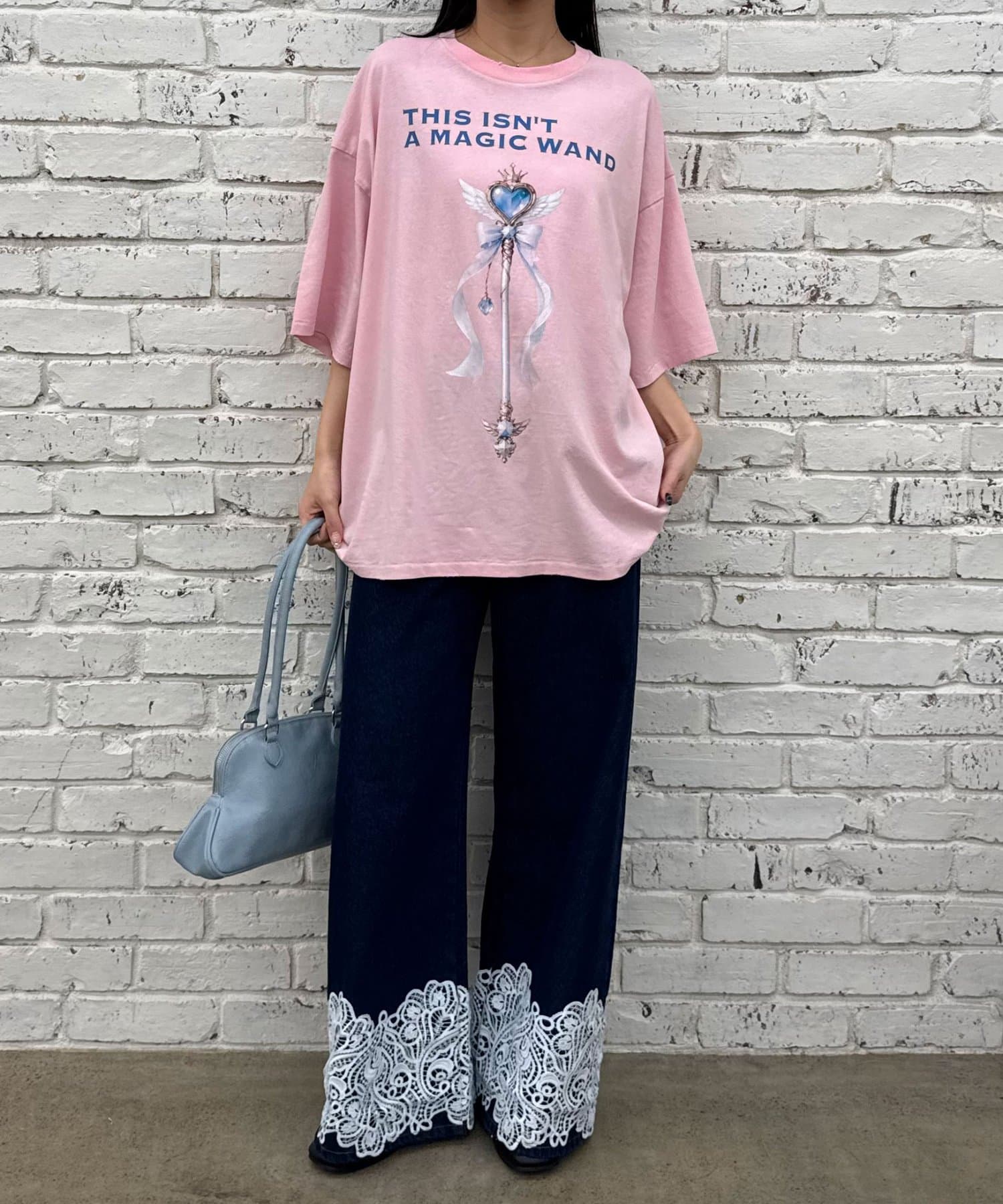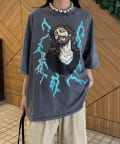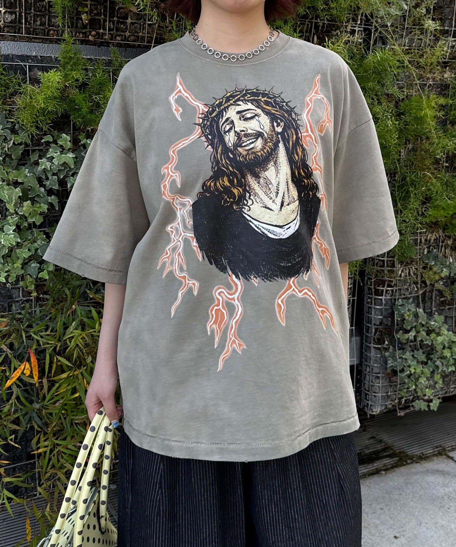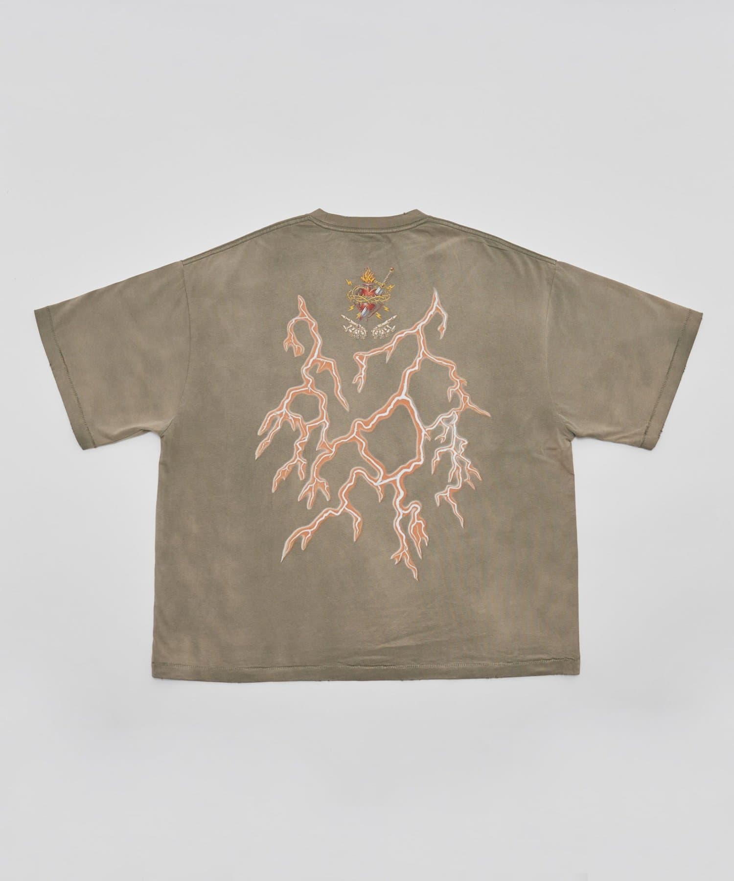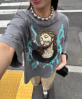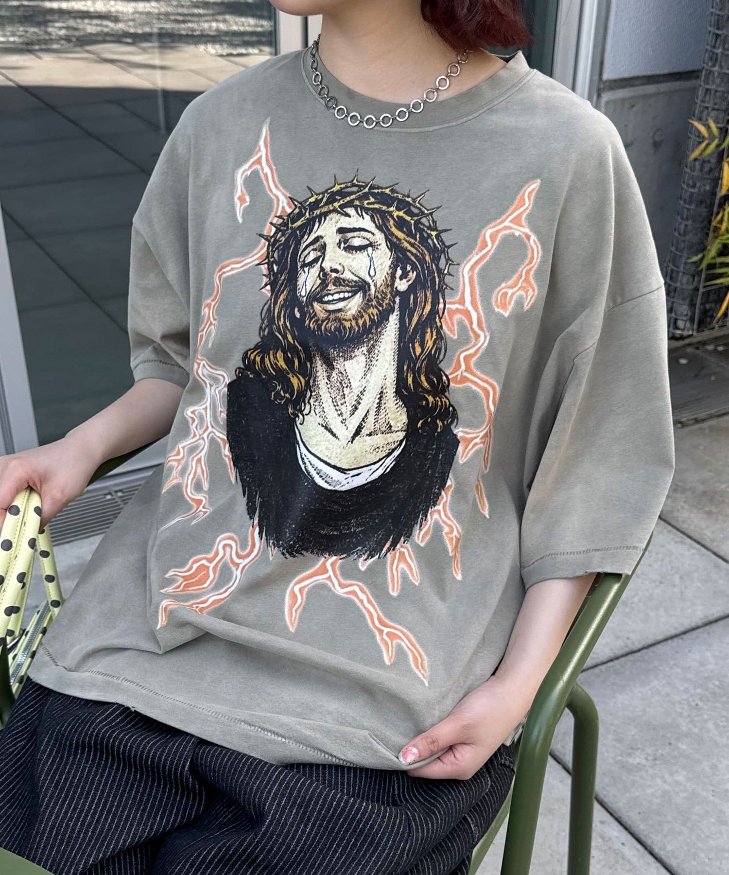 絶妙な色落ち感と、あえてラフに仕上げたグラインダーダメージ、味のあるひび割れプリントが古着のような奥行きを感じさせます。