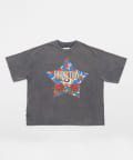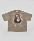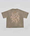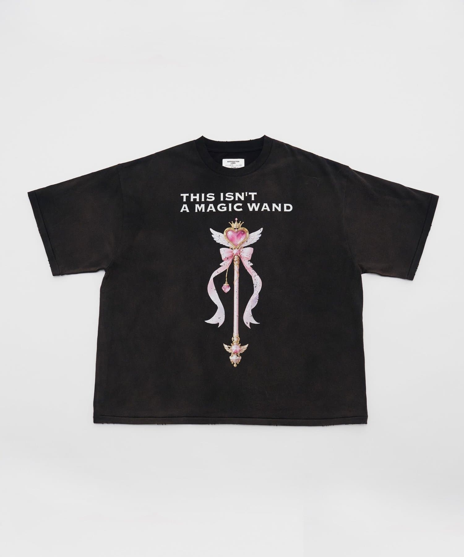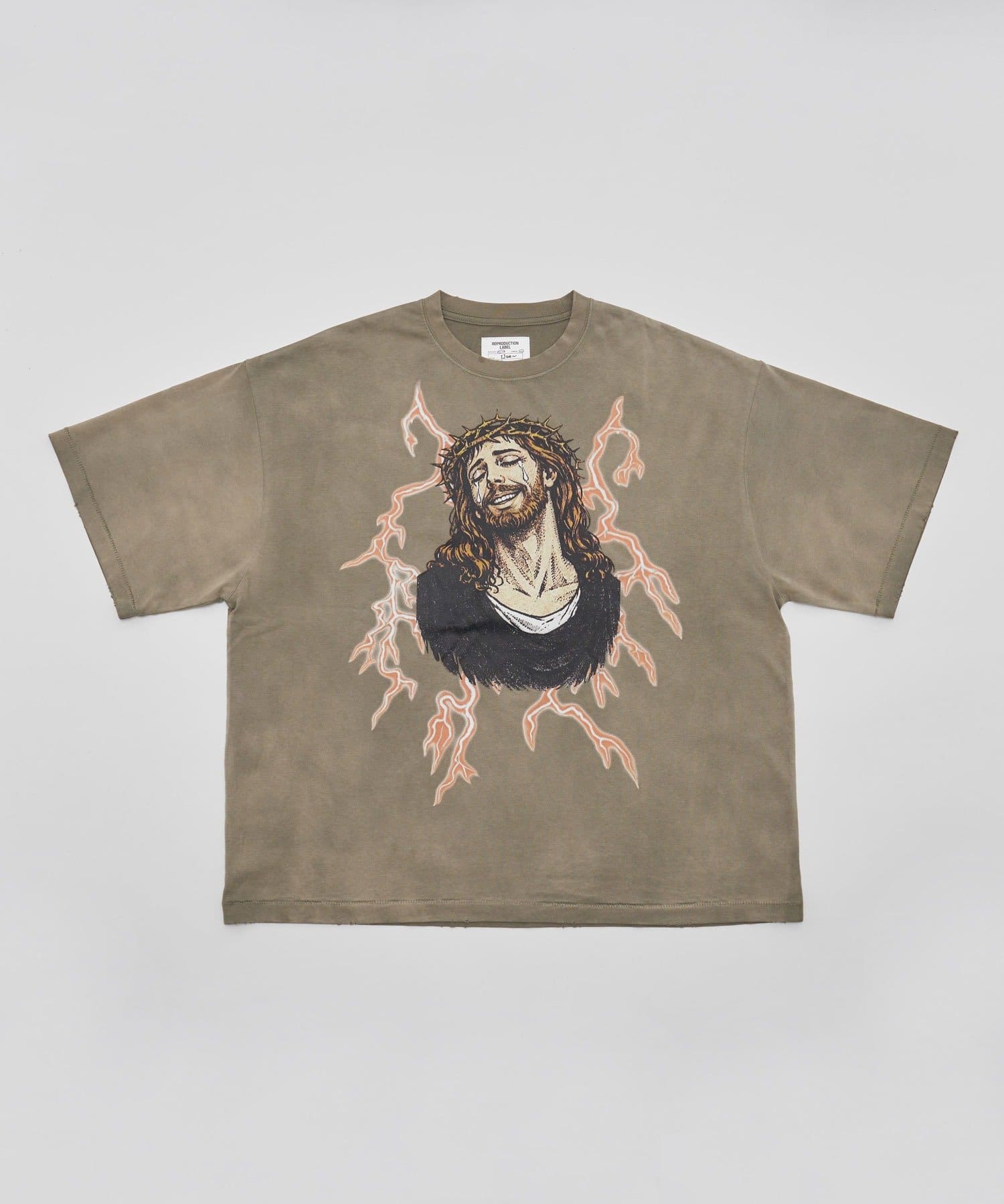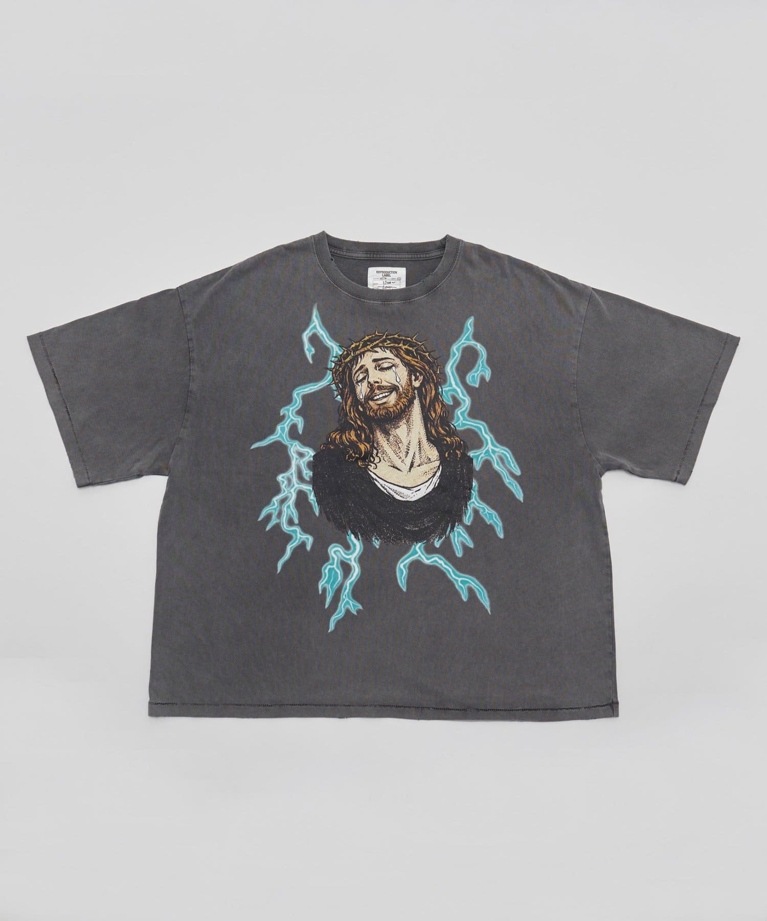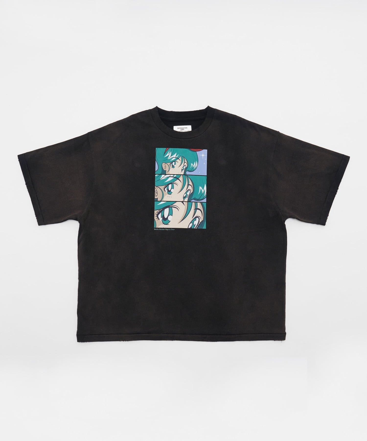 絶妙な色落ち感と、あえてラフに仕上げたグラインダーダメージ、味のあるひび割れプリントが古着のような奥行きを感じさせます。