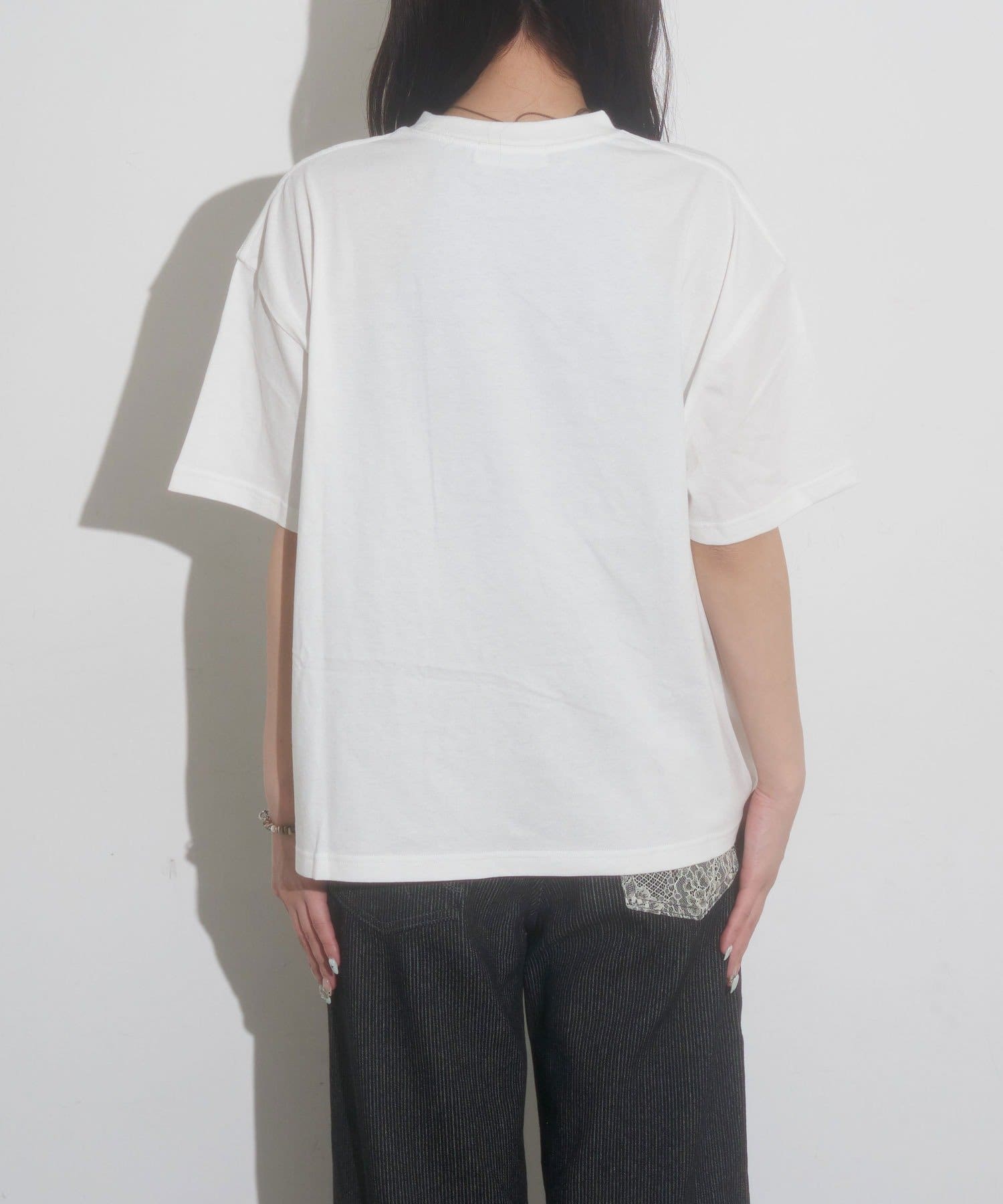 シアーシャツやジャケットのインナーとして使い、フロントのグラフィックをチラ見せさせるレイヤードスタイルもおすすめです。