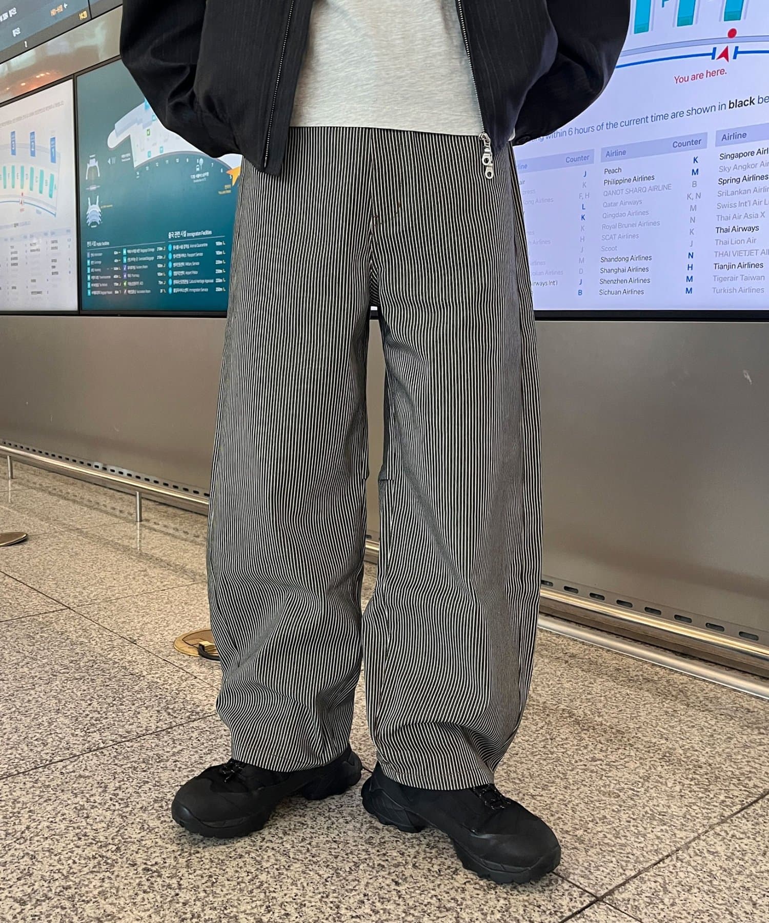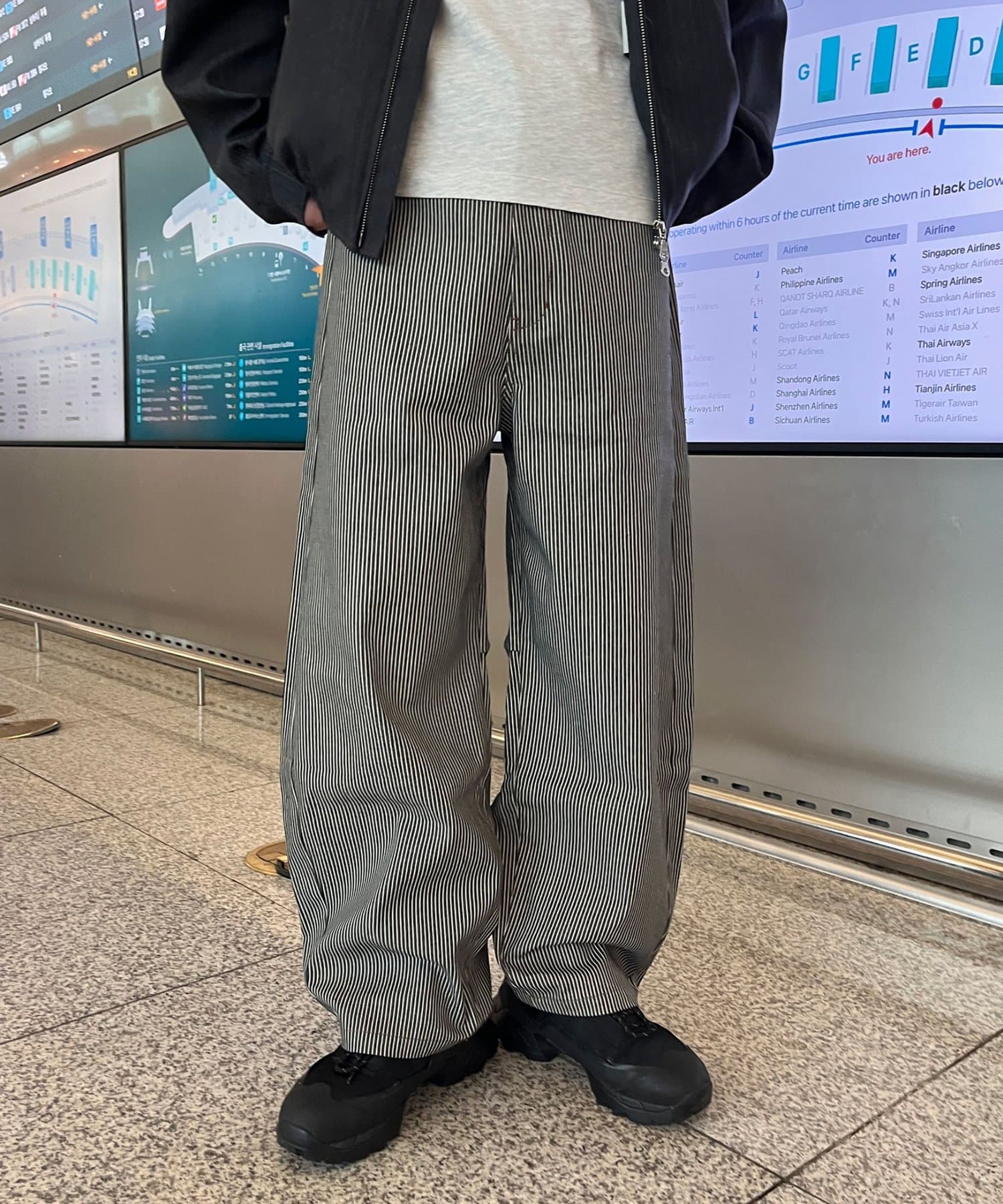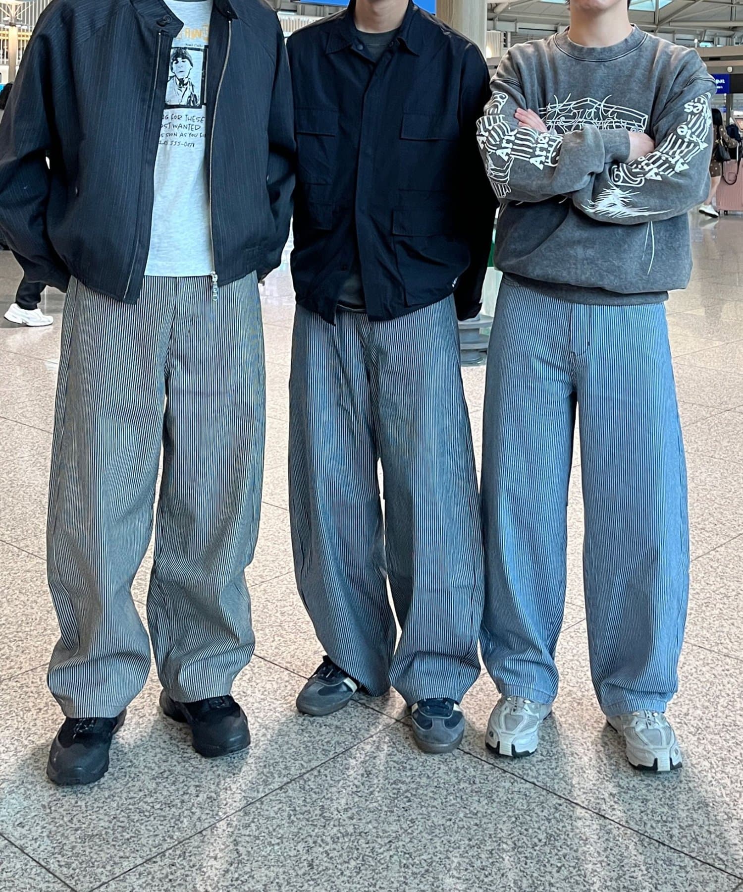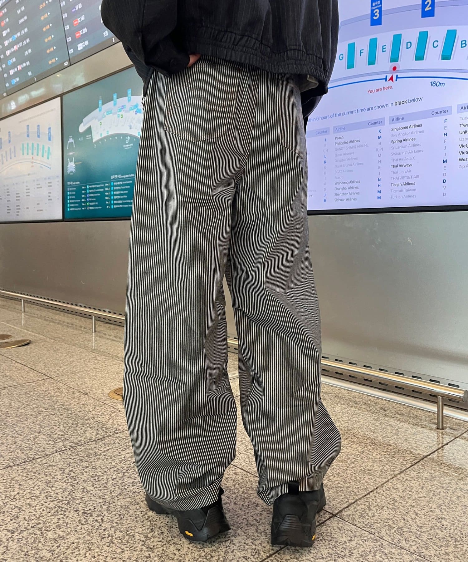 細めのストライプ柄なので、カジュアルになりすぎず、スタイリッシュな印象で穿きこなせるのもポイント。