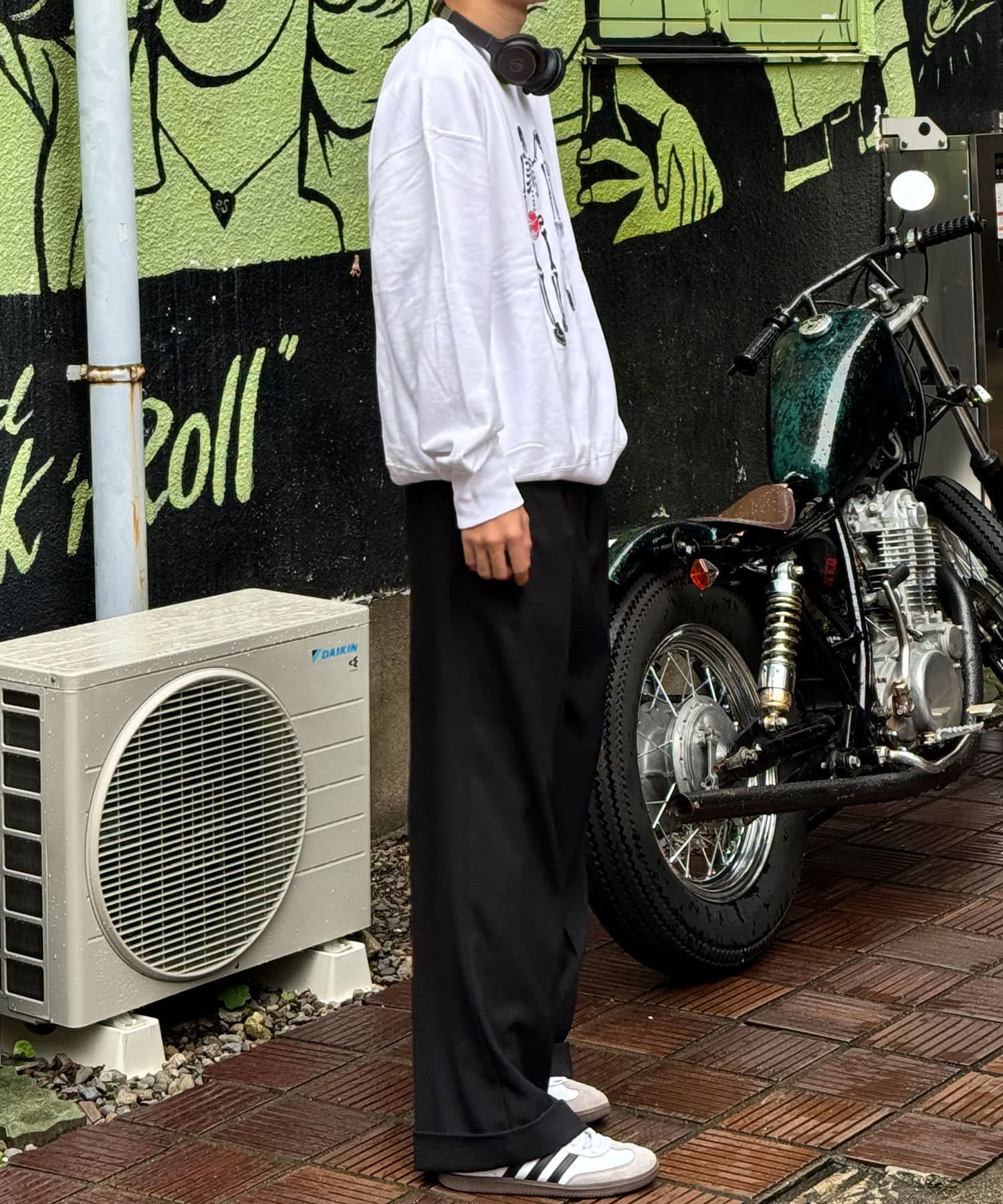 リラックスしたシルエットを活かして、ワイドパンツやカーゴパンツを合わせてもこなれた印象に仕上がります。
