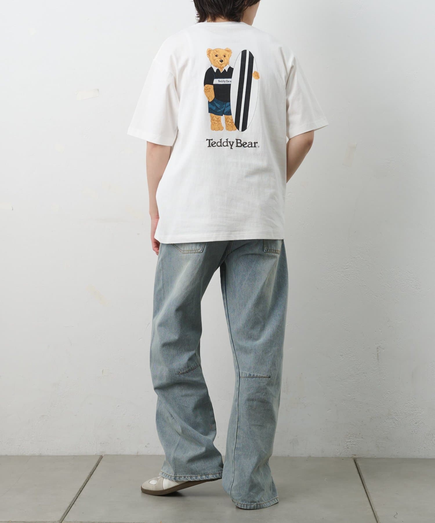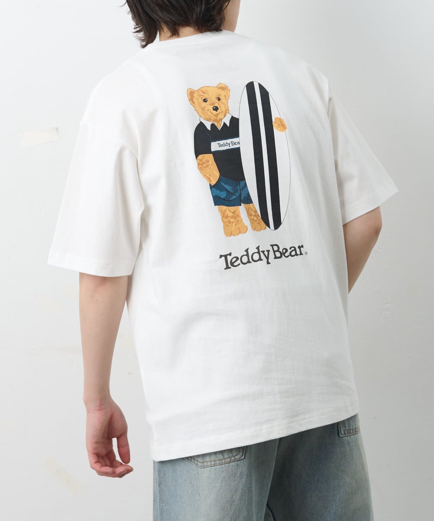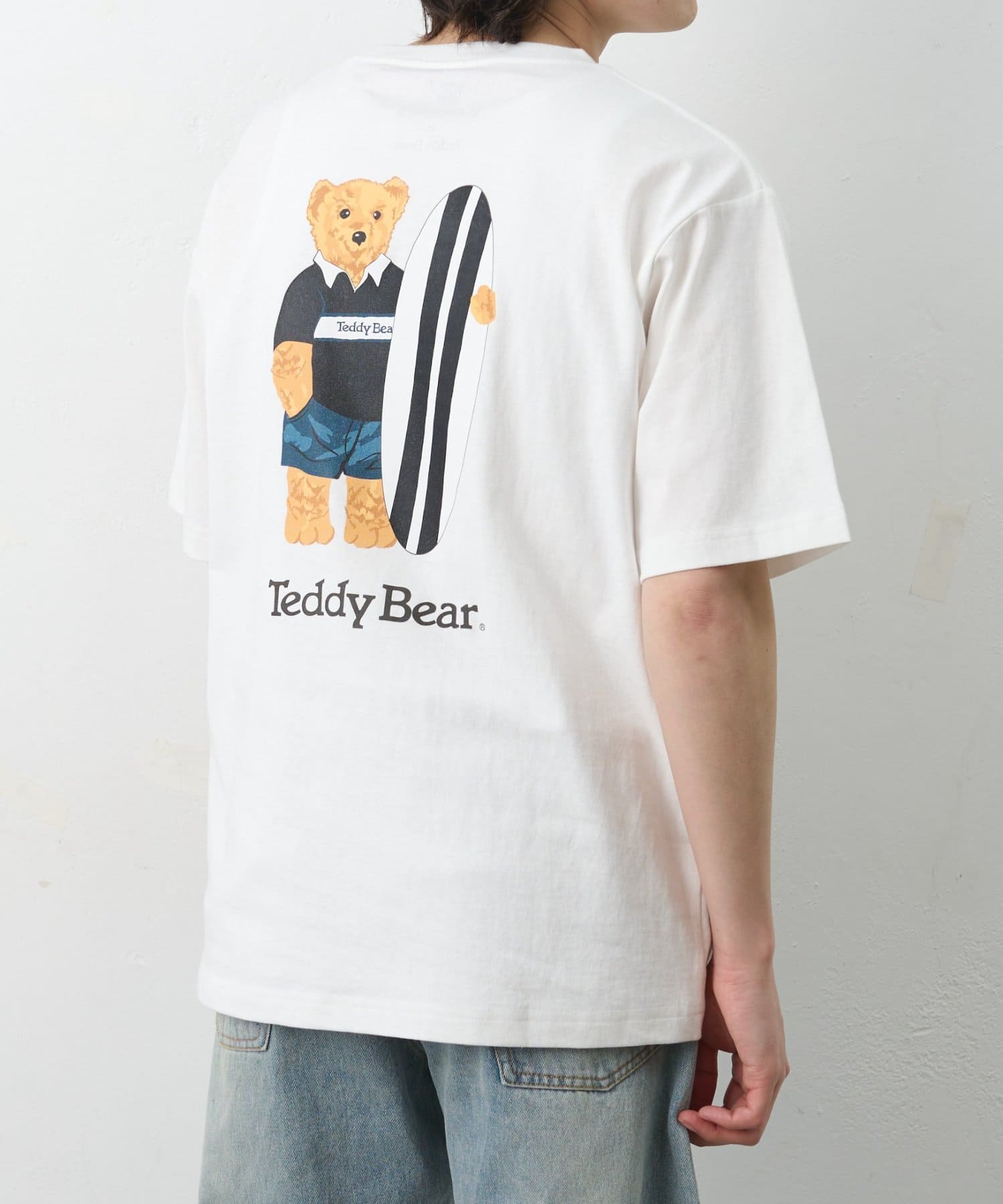 フロントは潔いほどシンプルなポケットTee。しかし、その背中には大きなボードを抱え、遠くを見つめるテディベアのリアルなプリントが。