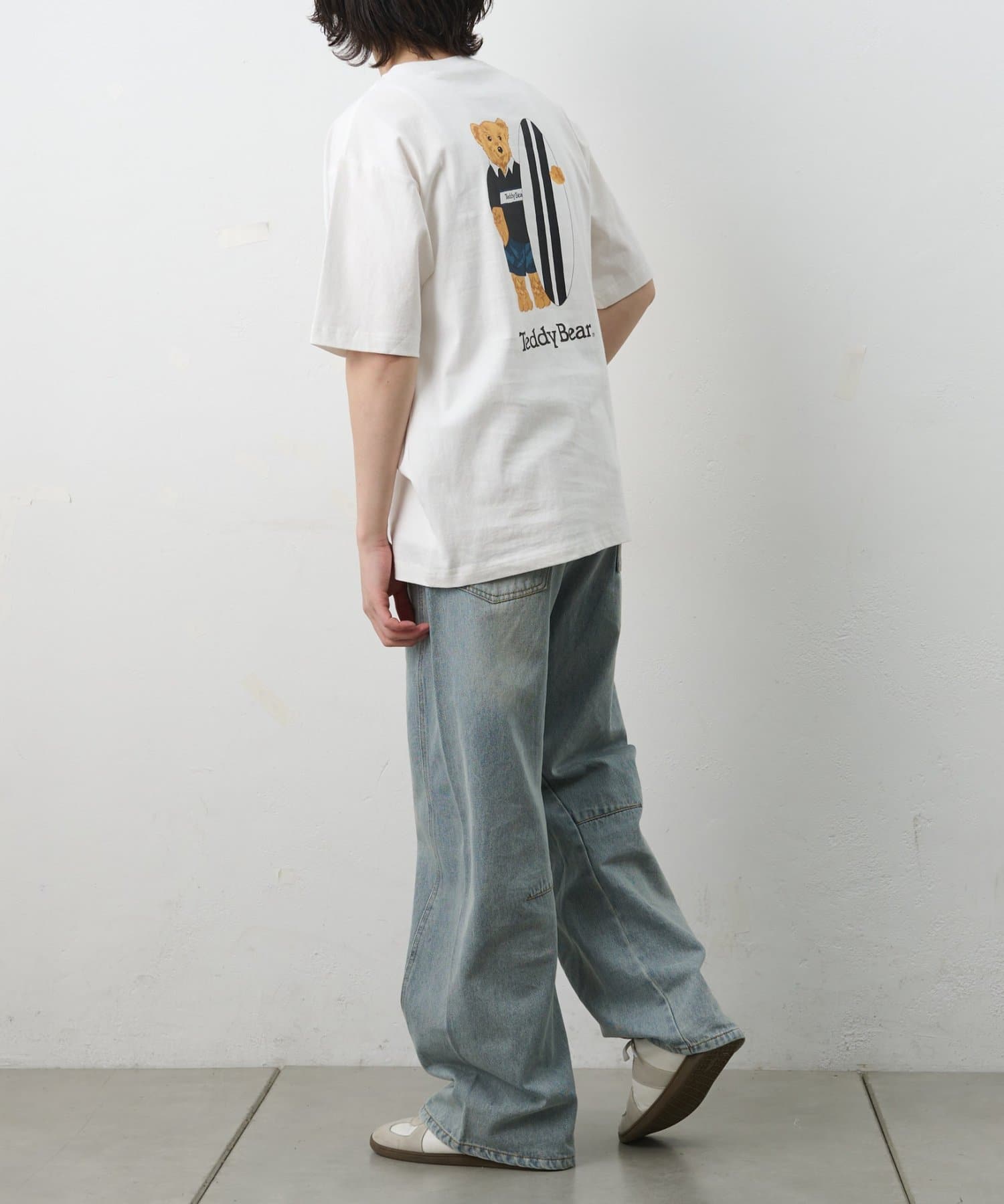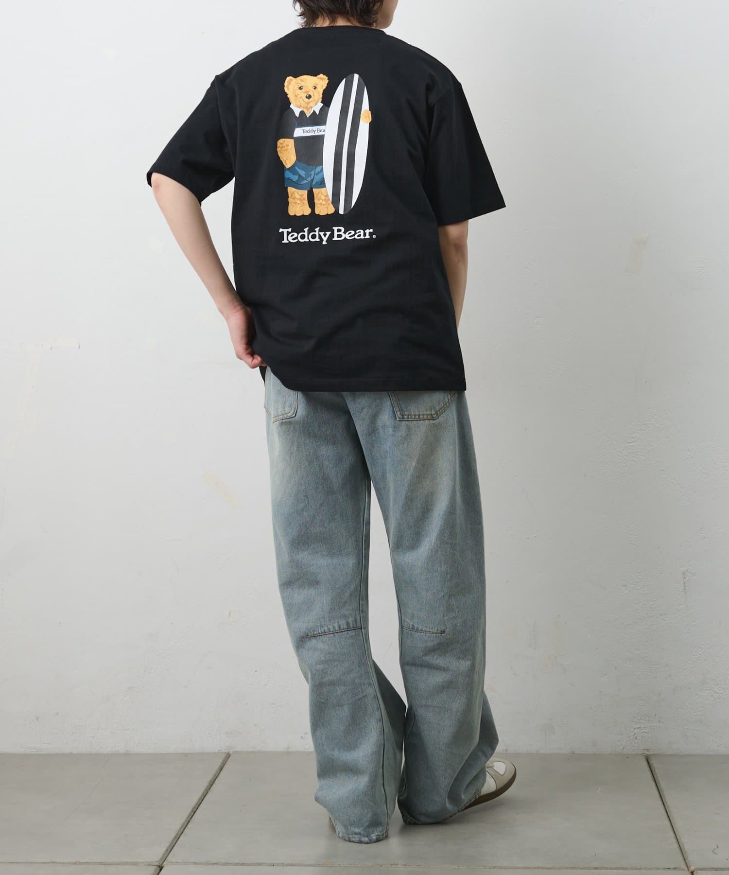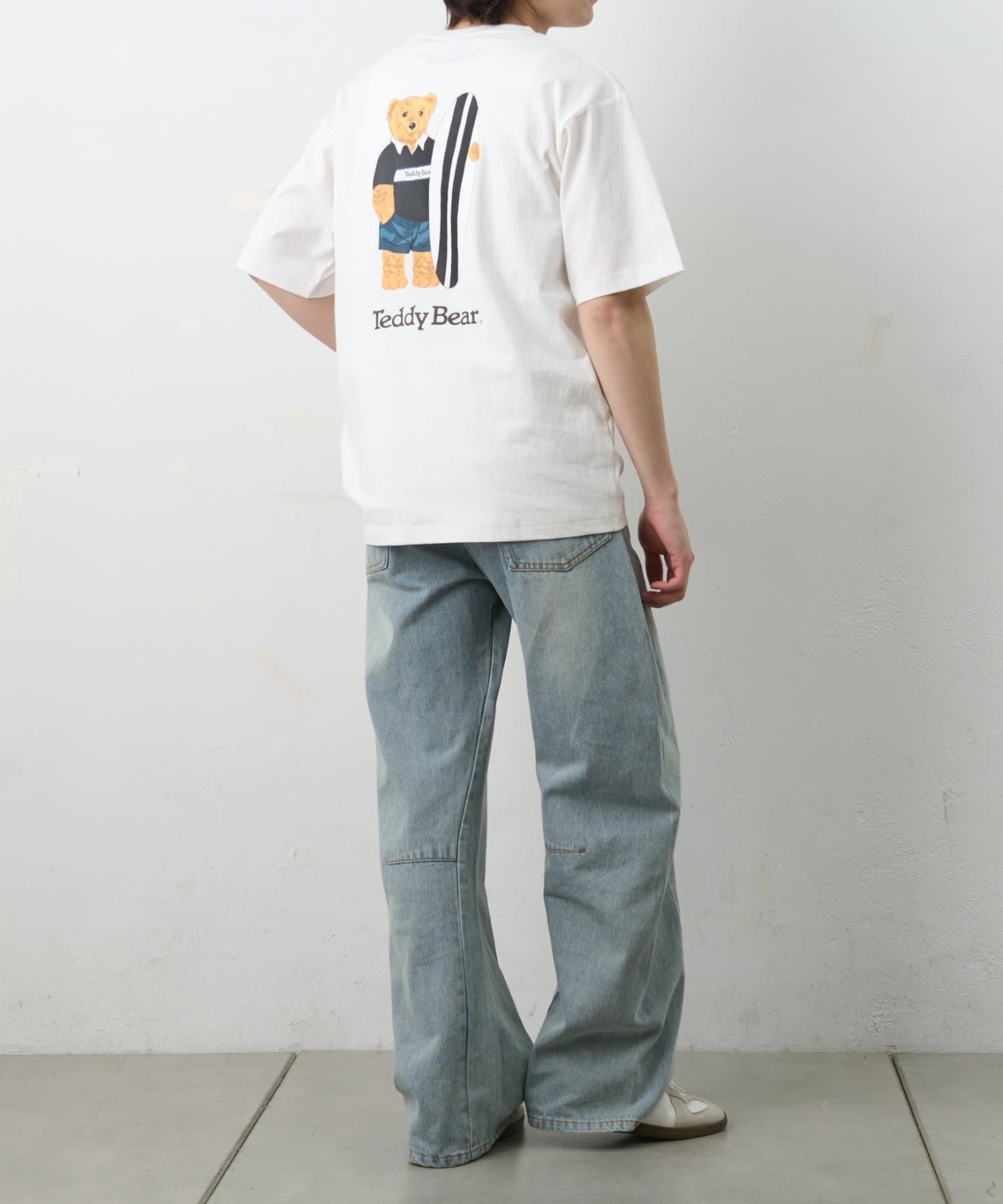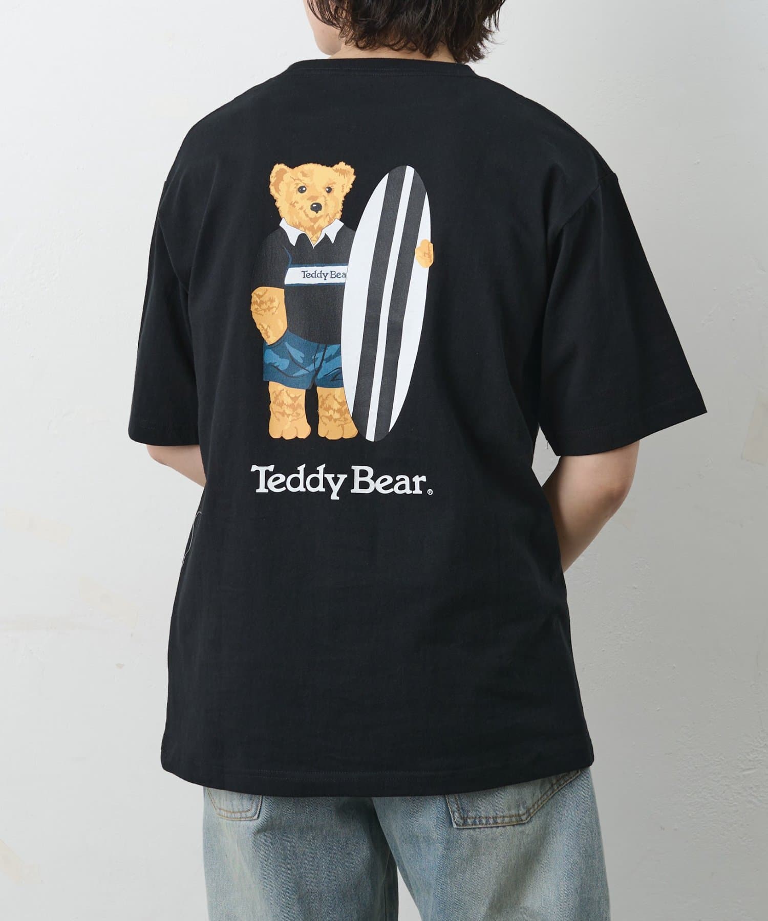 フロントは潔いほどシンプルなポケットTee。しかし、その背中には大きなボードを抱え、遠くを見つめるテディベアのリアルなプリントが。