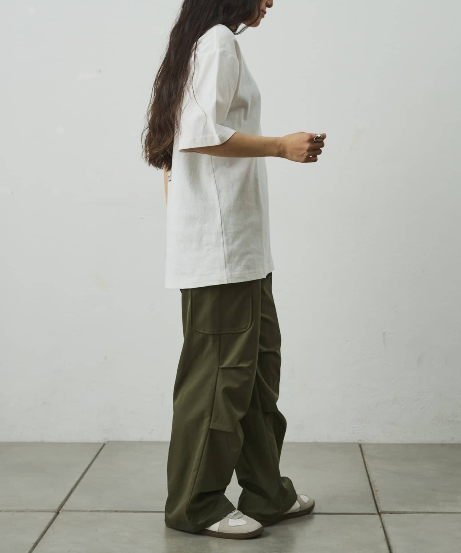 フロントは潔いほどシンプルなポケットTee。しかし、その背中には大きなボードを抱え、遠くを見つめるテディベアのリアルなプリントが。