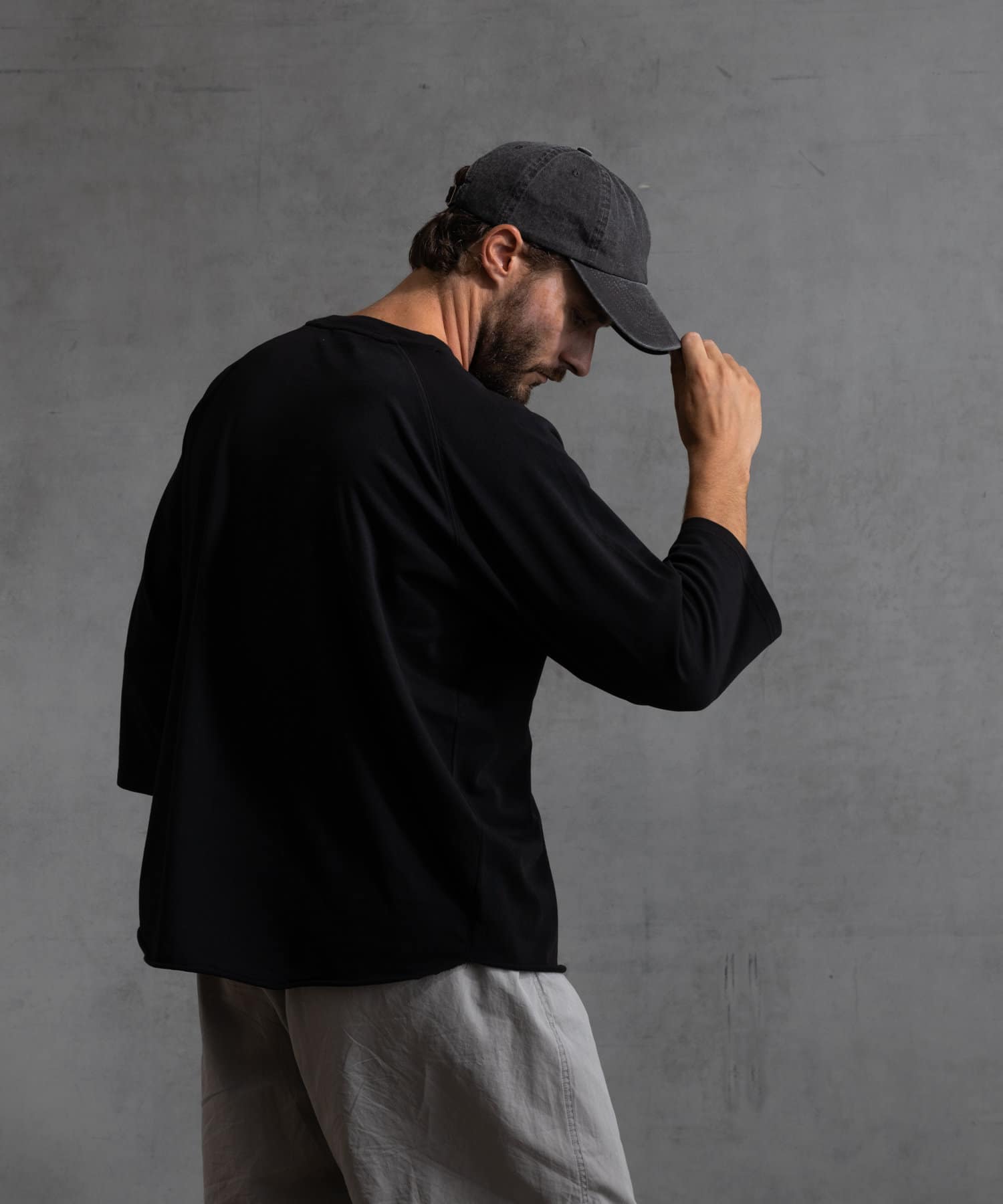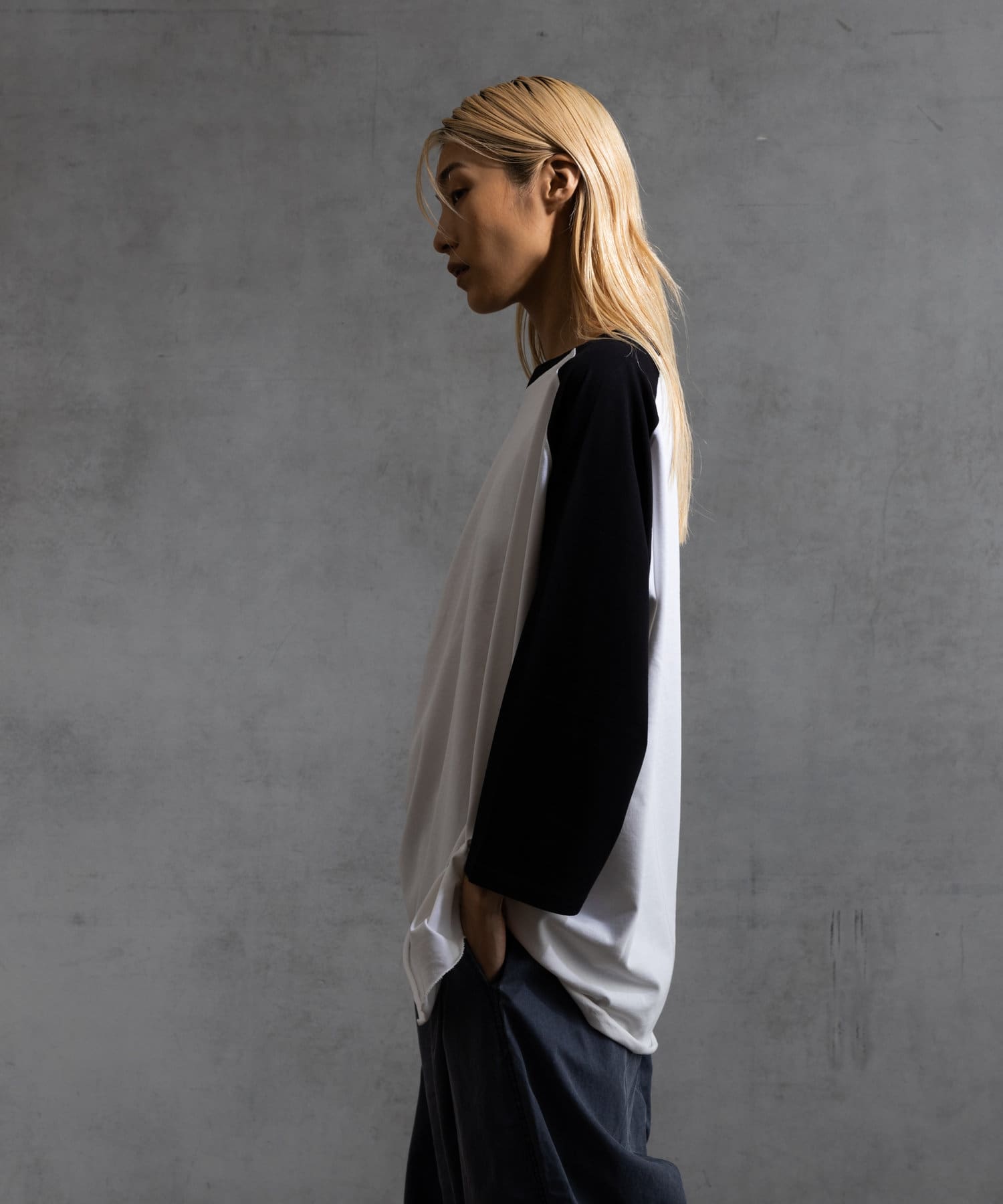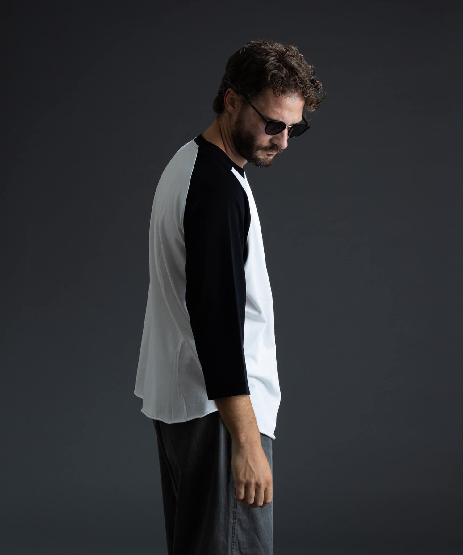 コットン100%で毛羽立ちが少なく、クリーンな表面かつなめらかな着心地が特徴的なガス焼き天竺を使用したラグランTです。