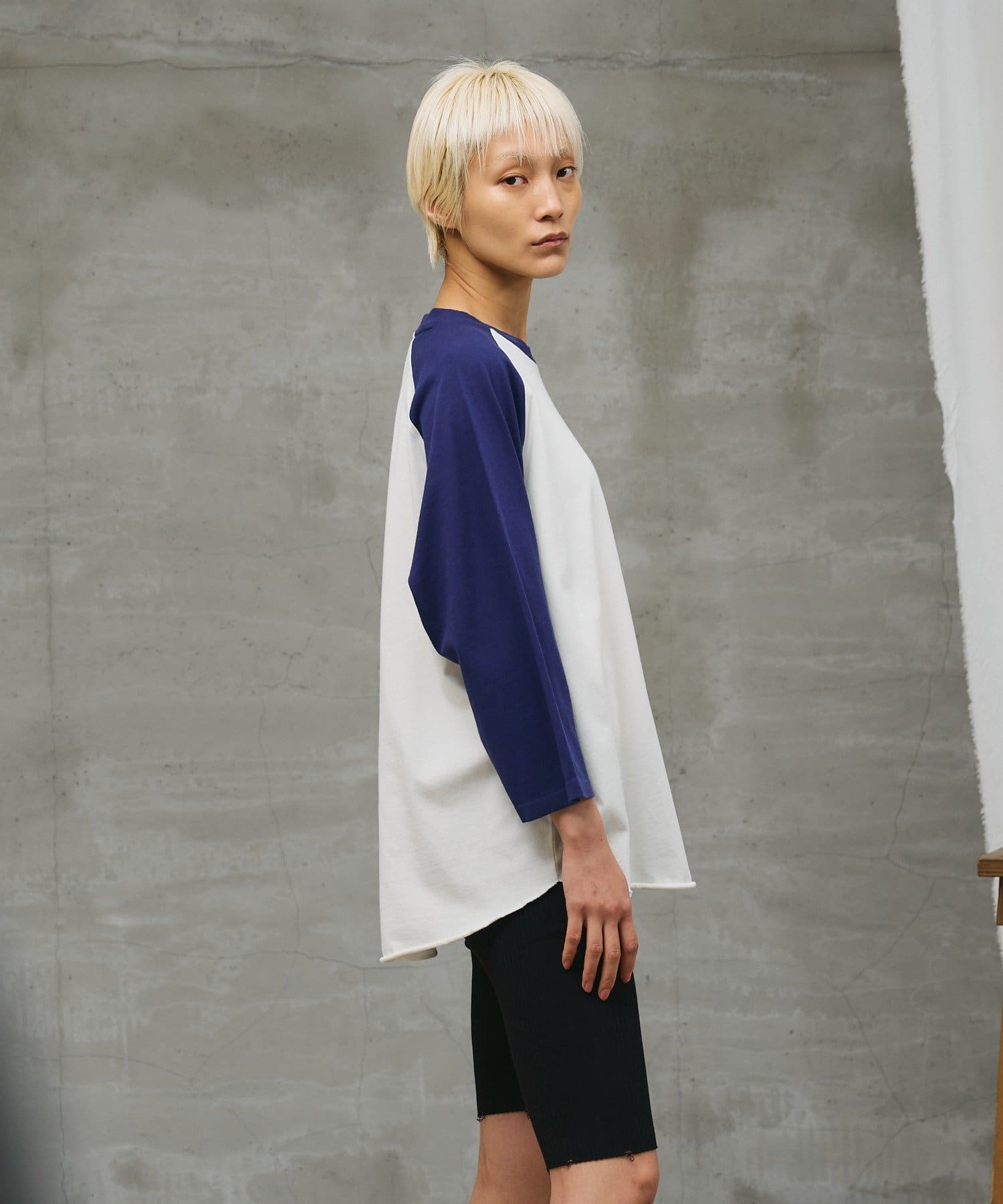 コットン100%で毛羽立ちが少なく、クリーンな表面かつなめらかな着心地が特徴的なガス焼き天竺を使用したラグランTです。