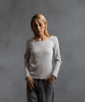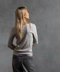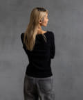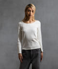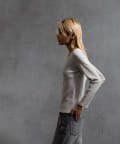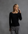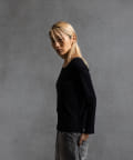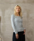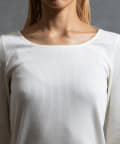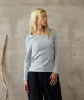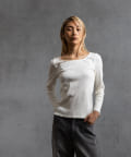 さりげなく光沢感が出る糸に柔らかく仕上げる加工を施し上品に編みたてたスクエアネックTです。