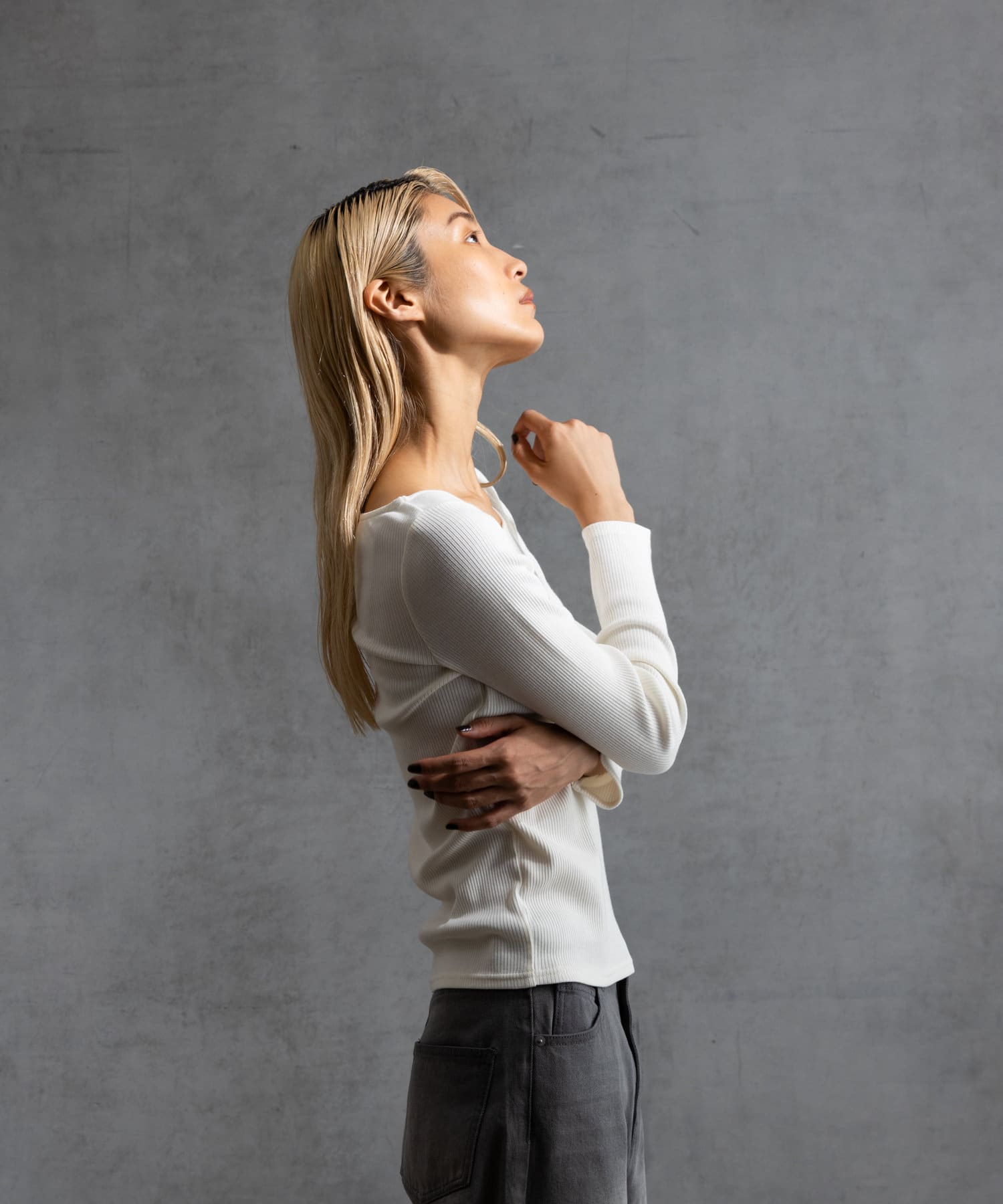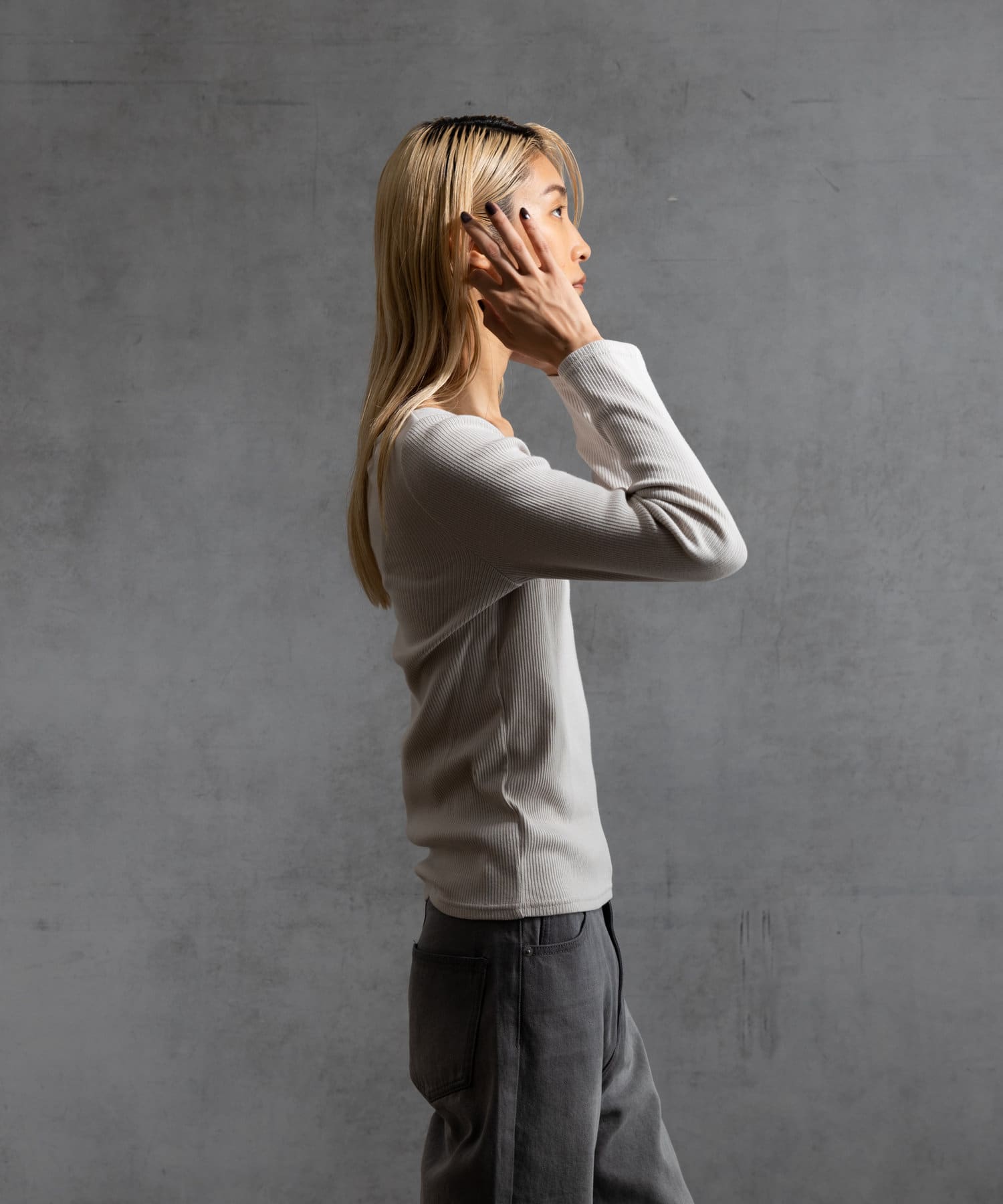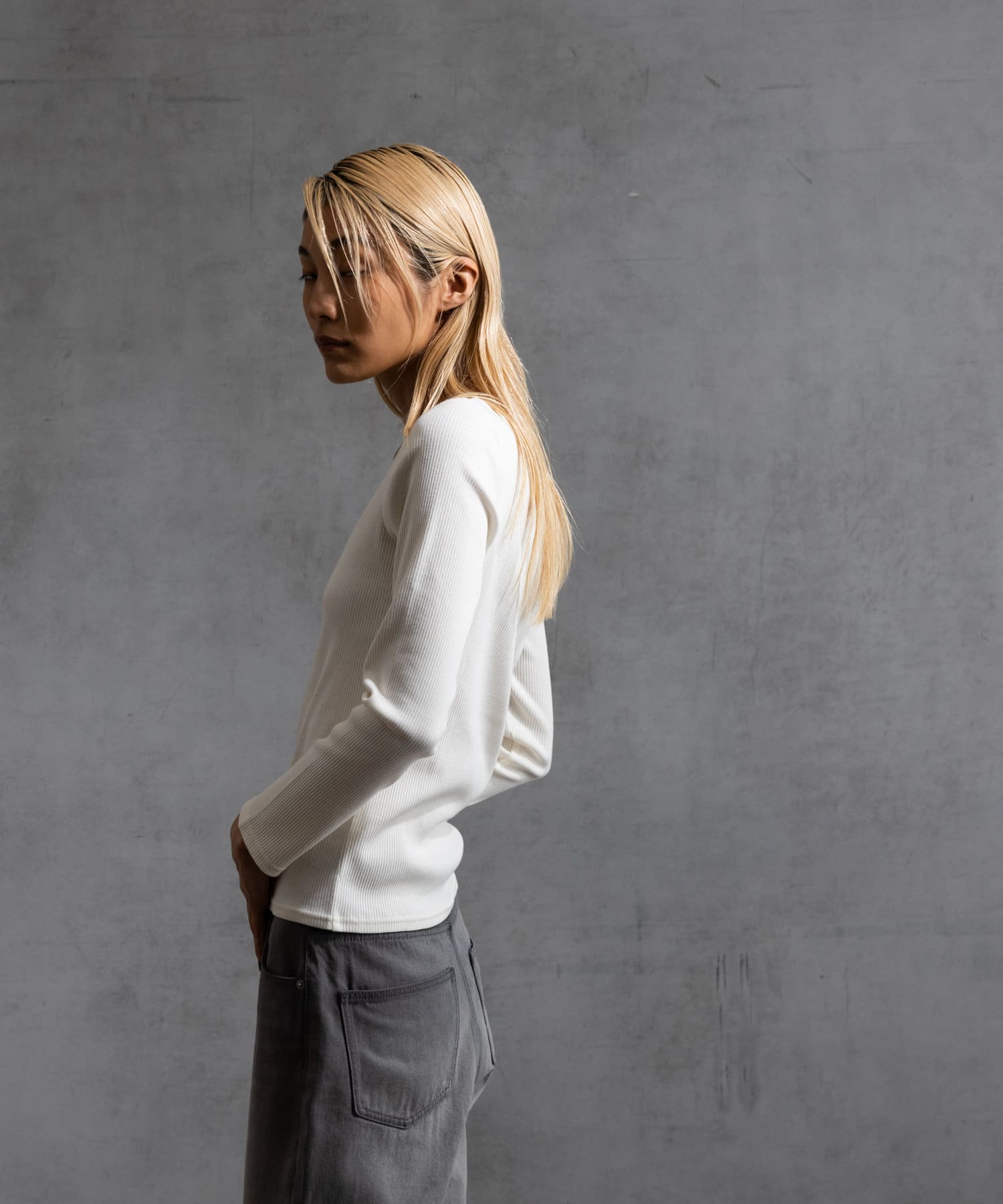 コンパクトなシルエットにし、インナーとしてはもちろん1枚着でもサマになるアイテムになっております。