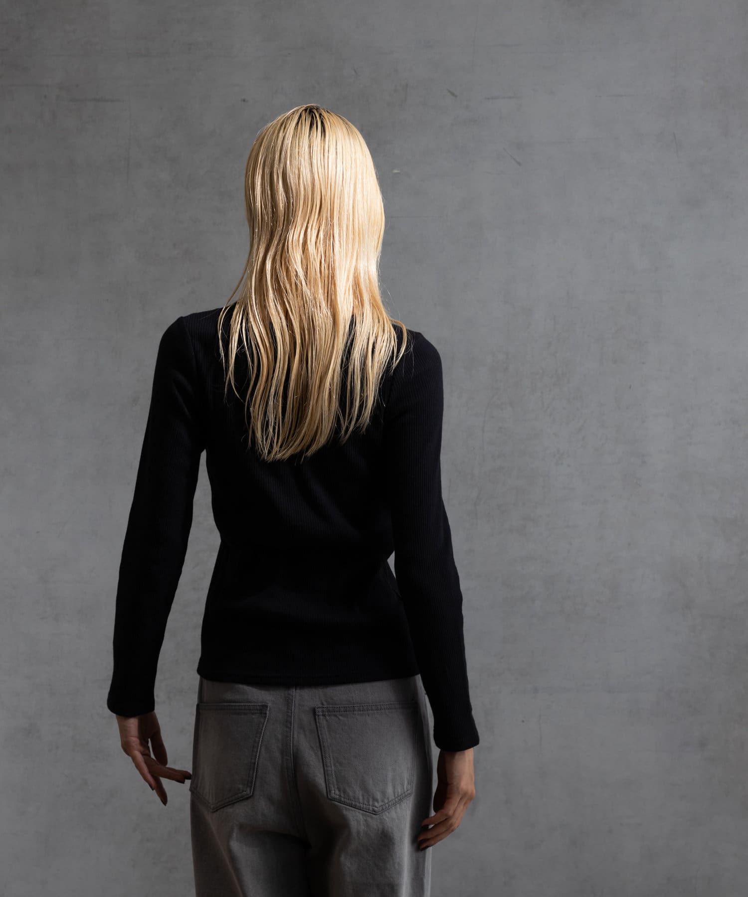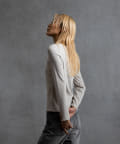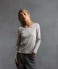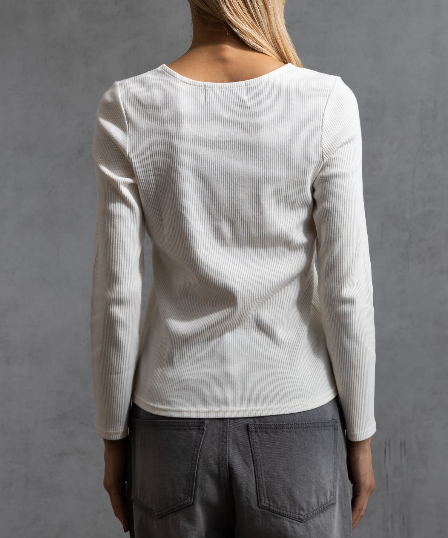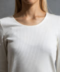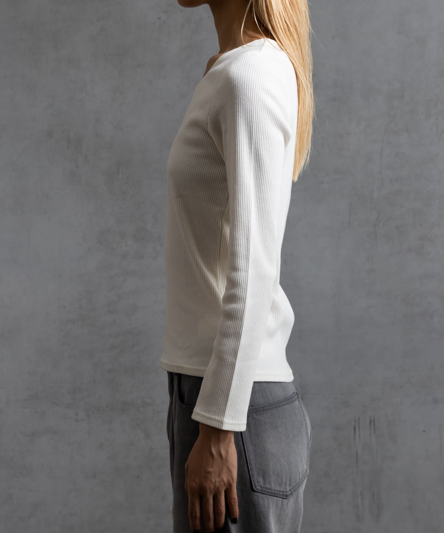 ややラウンドし丸みを持たせたネックラインにすることで、デコルテの見え方がより柔らかい印象になるように仕上げております。