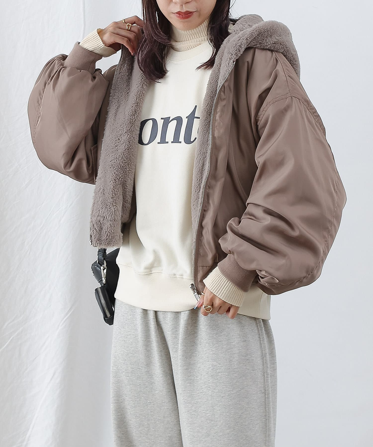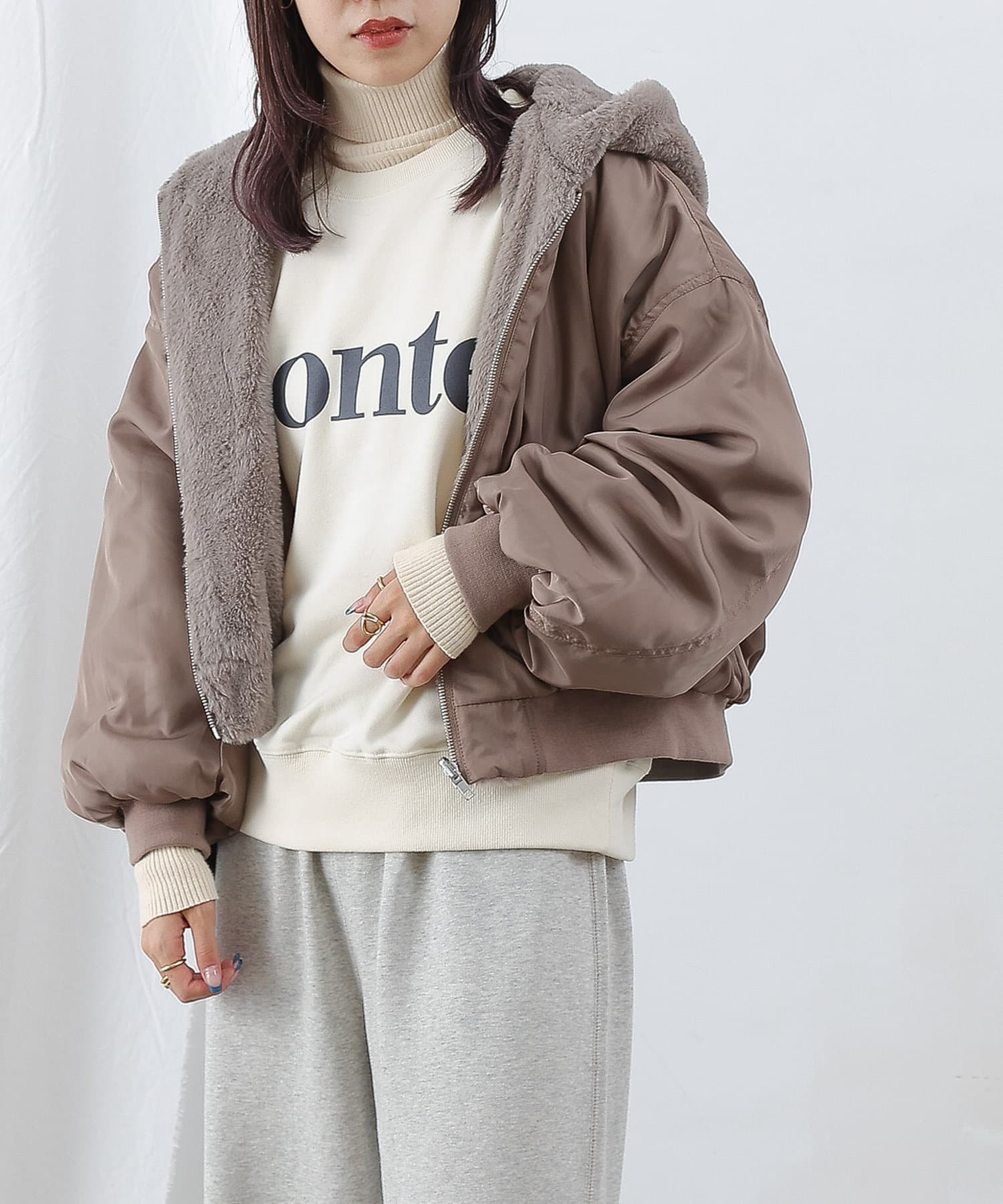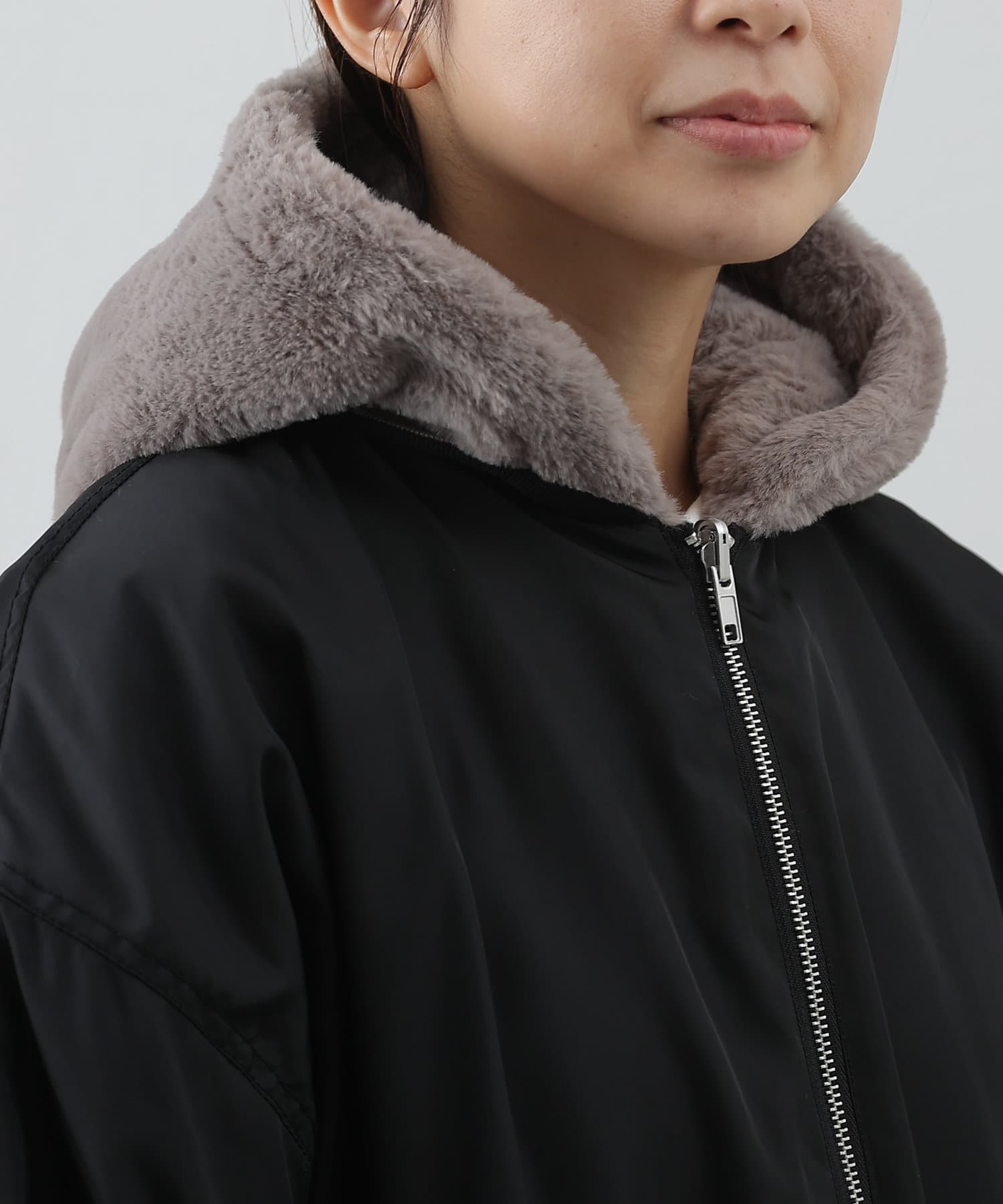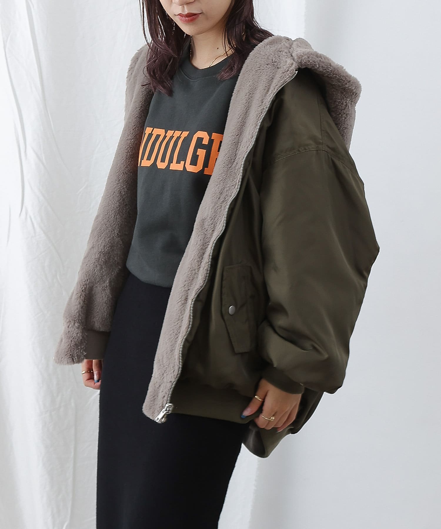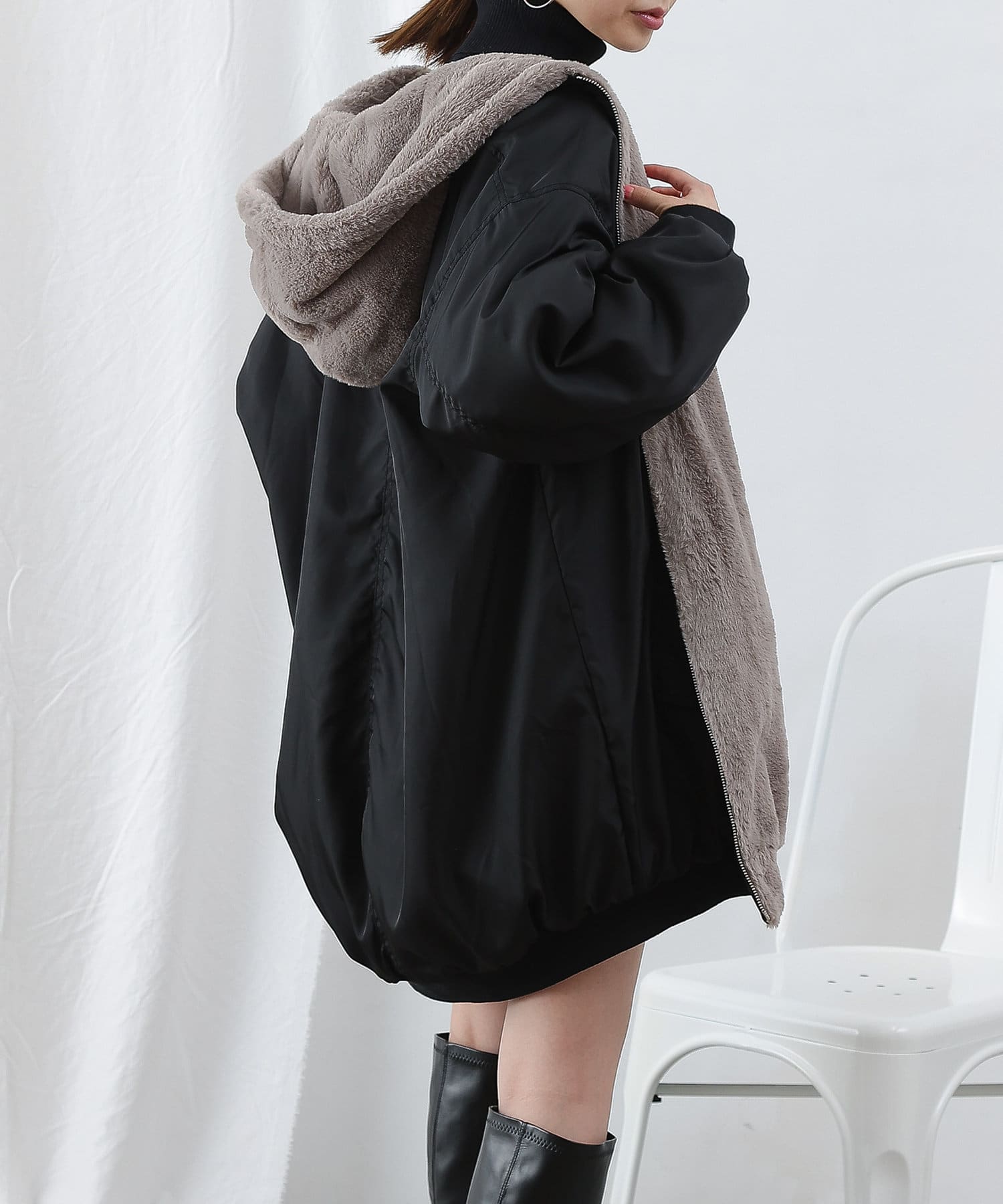もこもこファーの可愛い着こなしと、MA-1風のメンズライクな着こなしができるリバーシブル仕様。