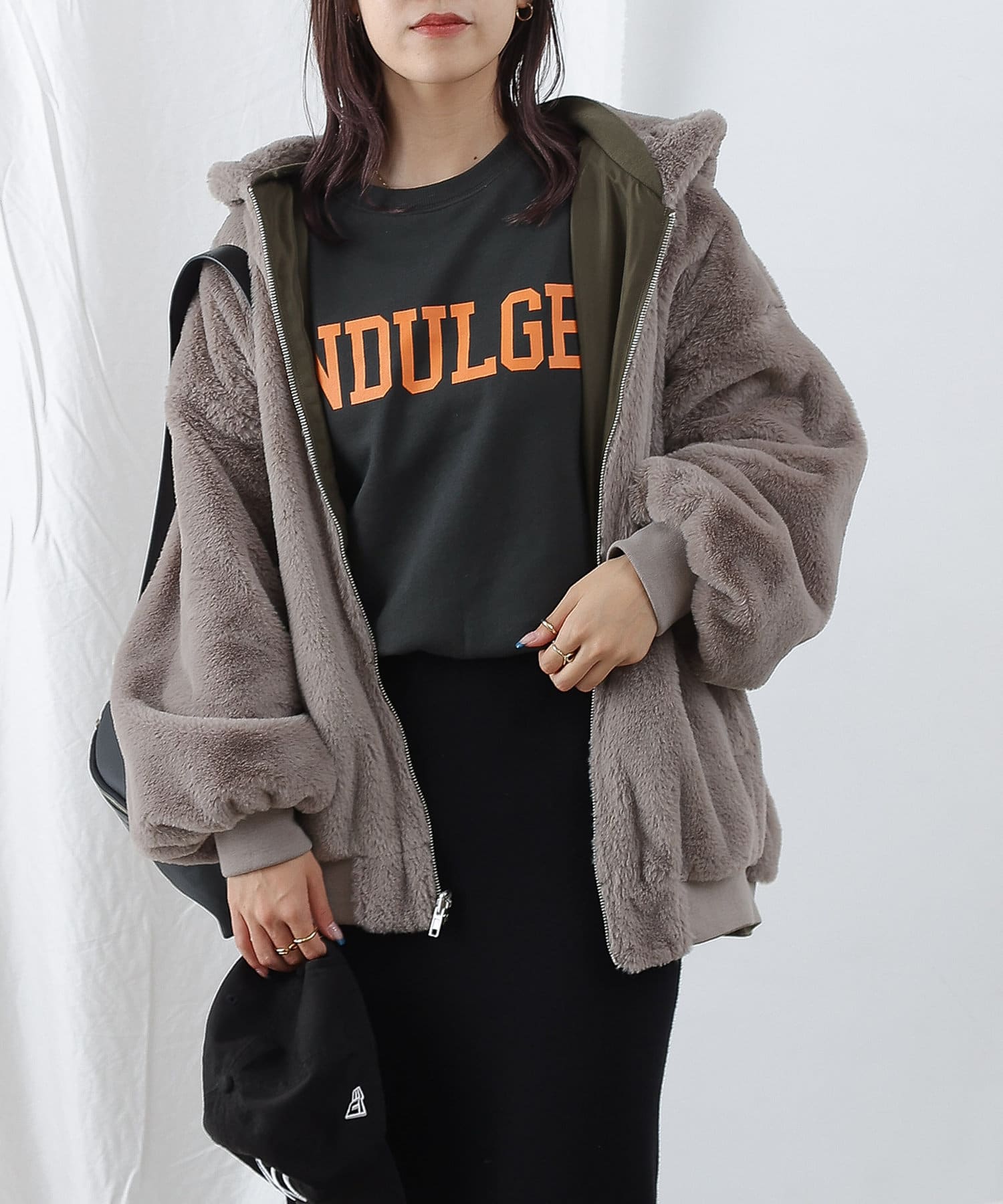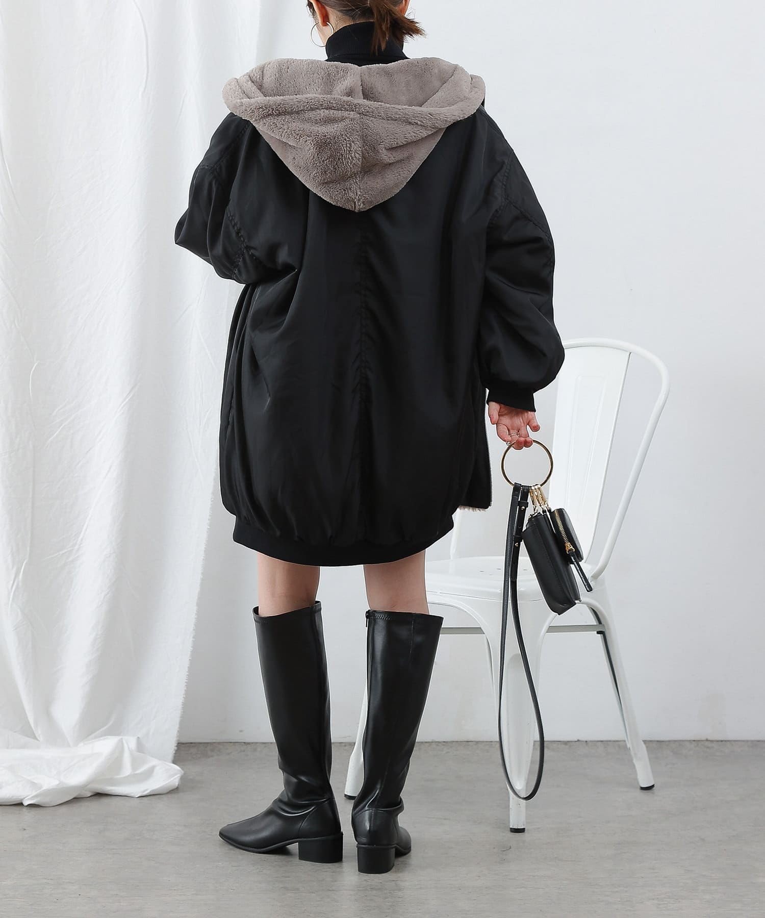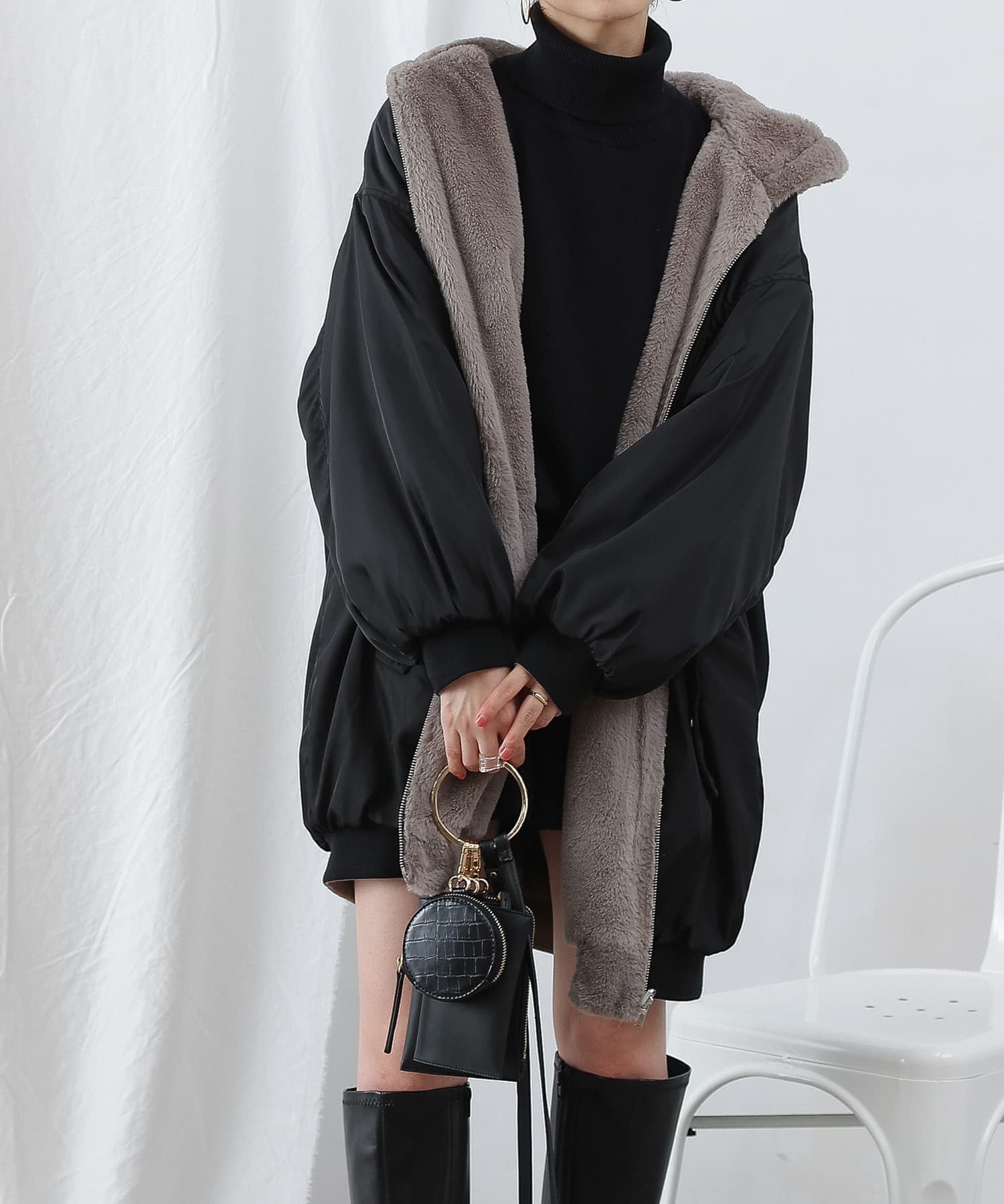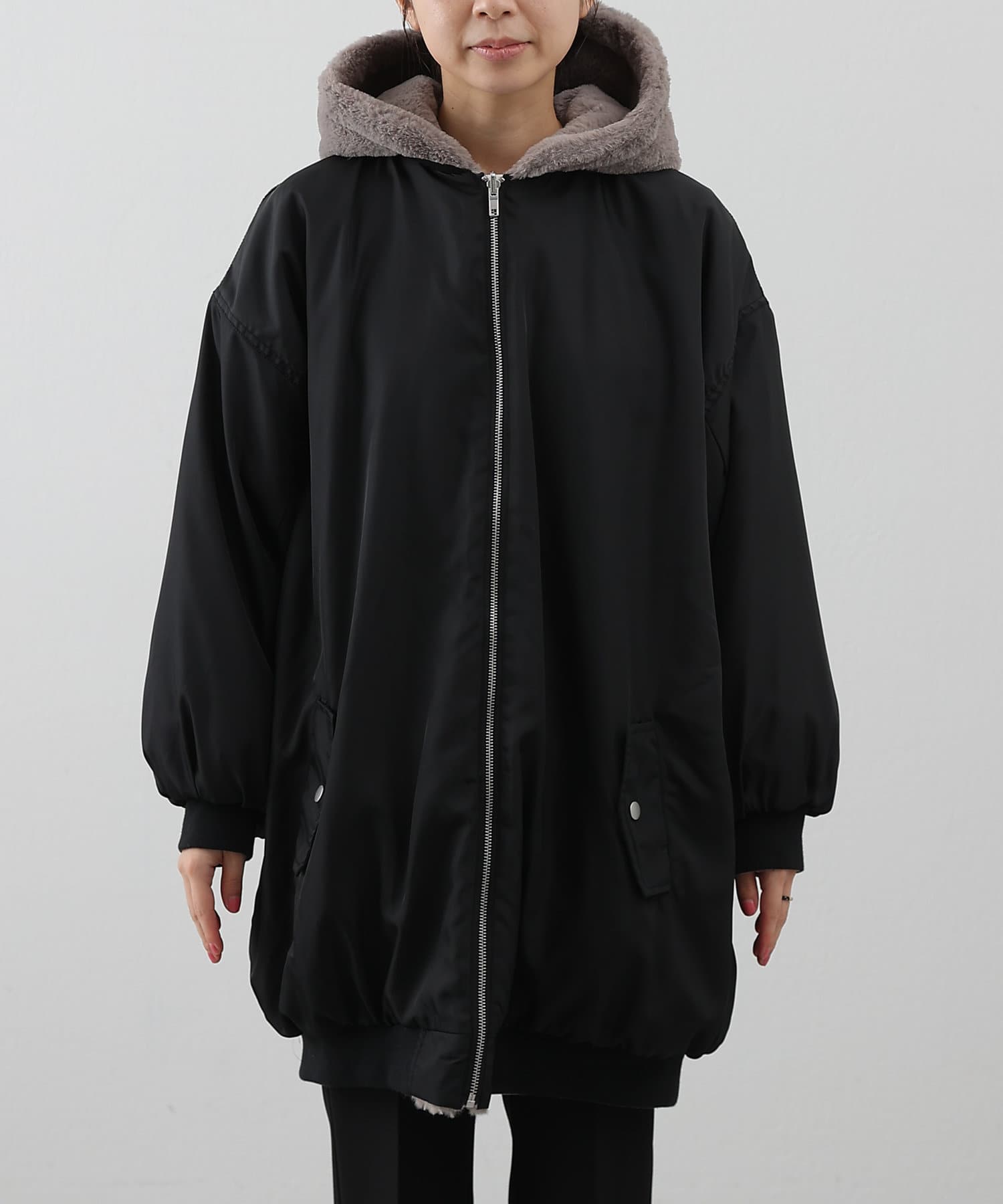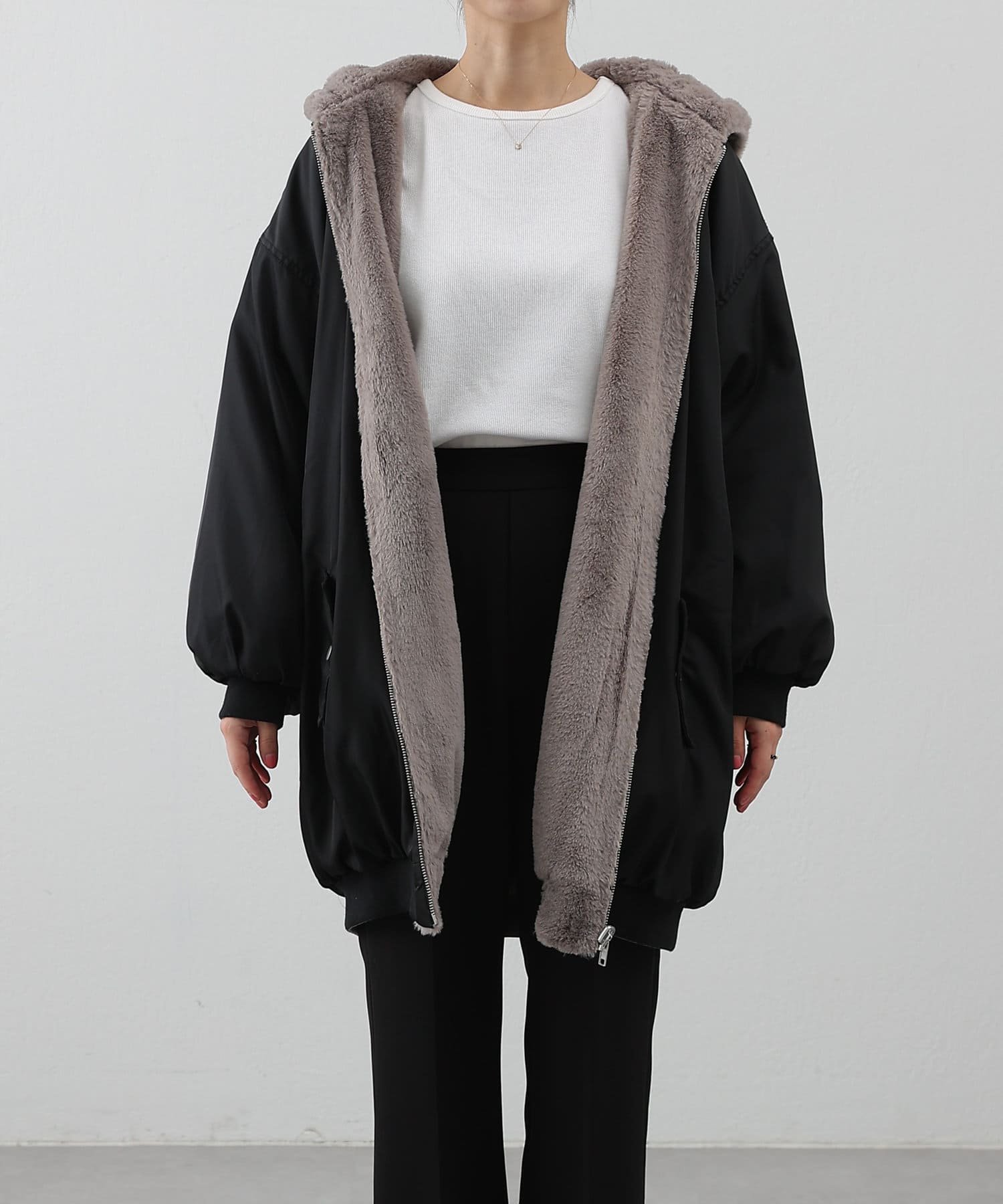 もこもこファーの可愛い着こなしと、MA-1風のメンズライクな着こなしができるリバーシブル仕様。