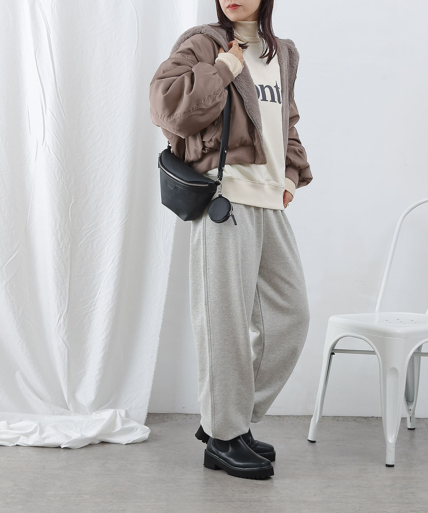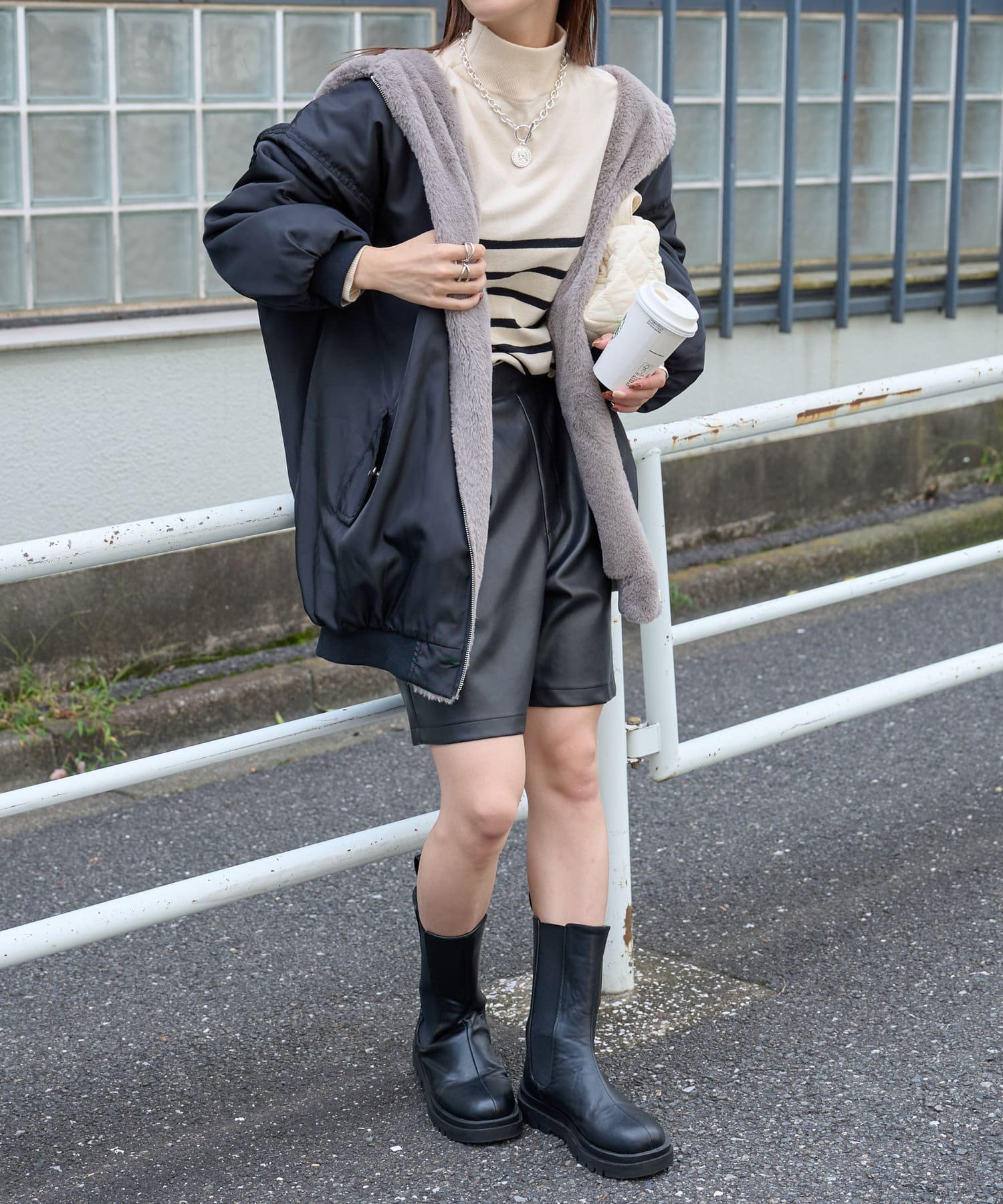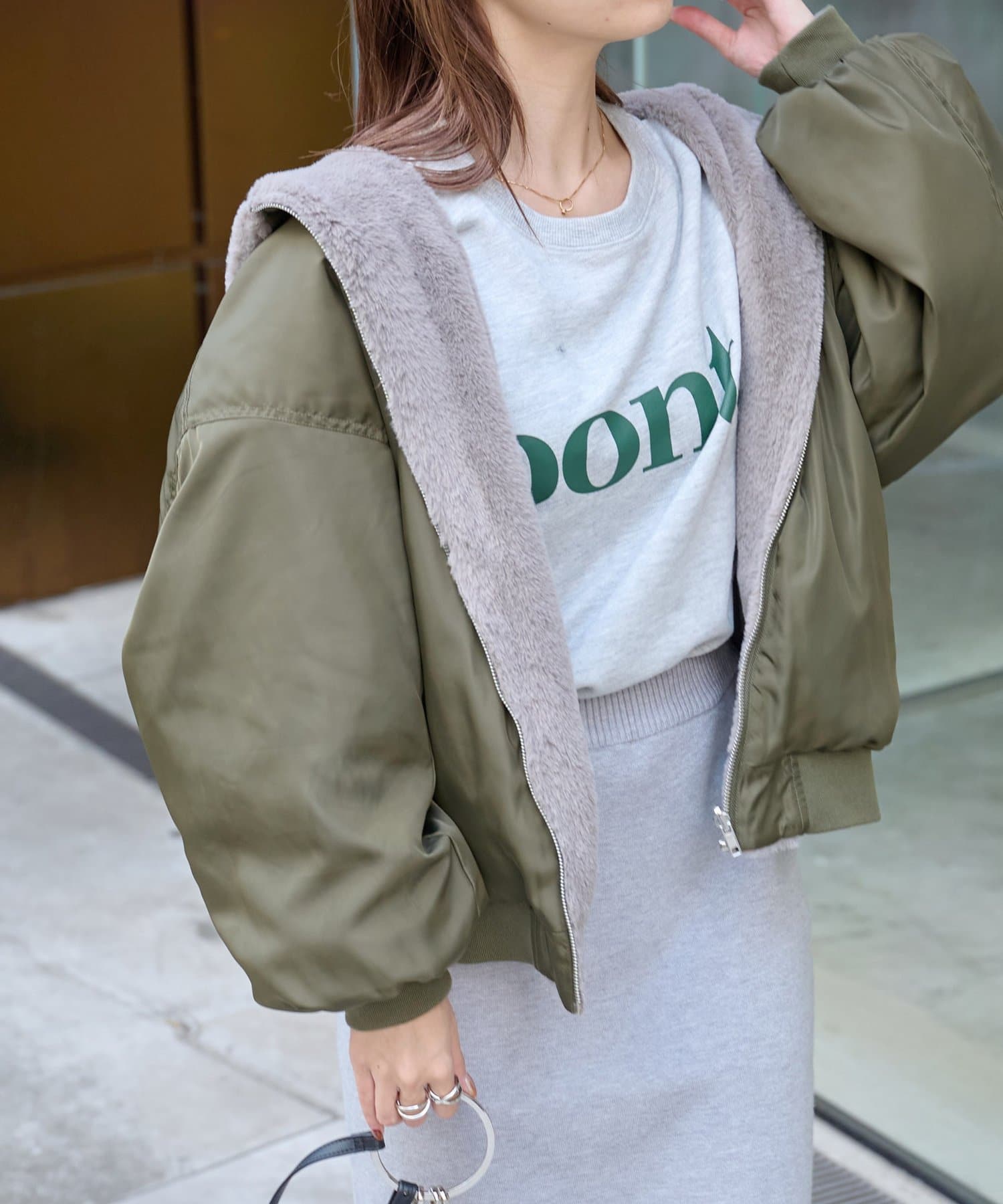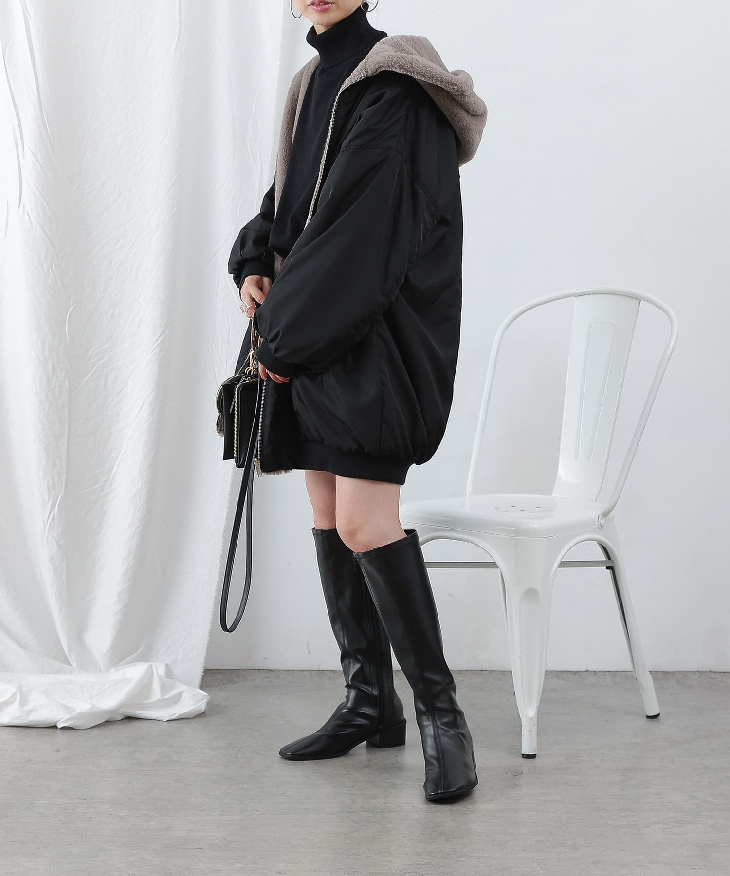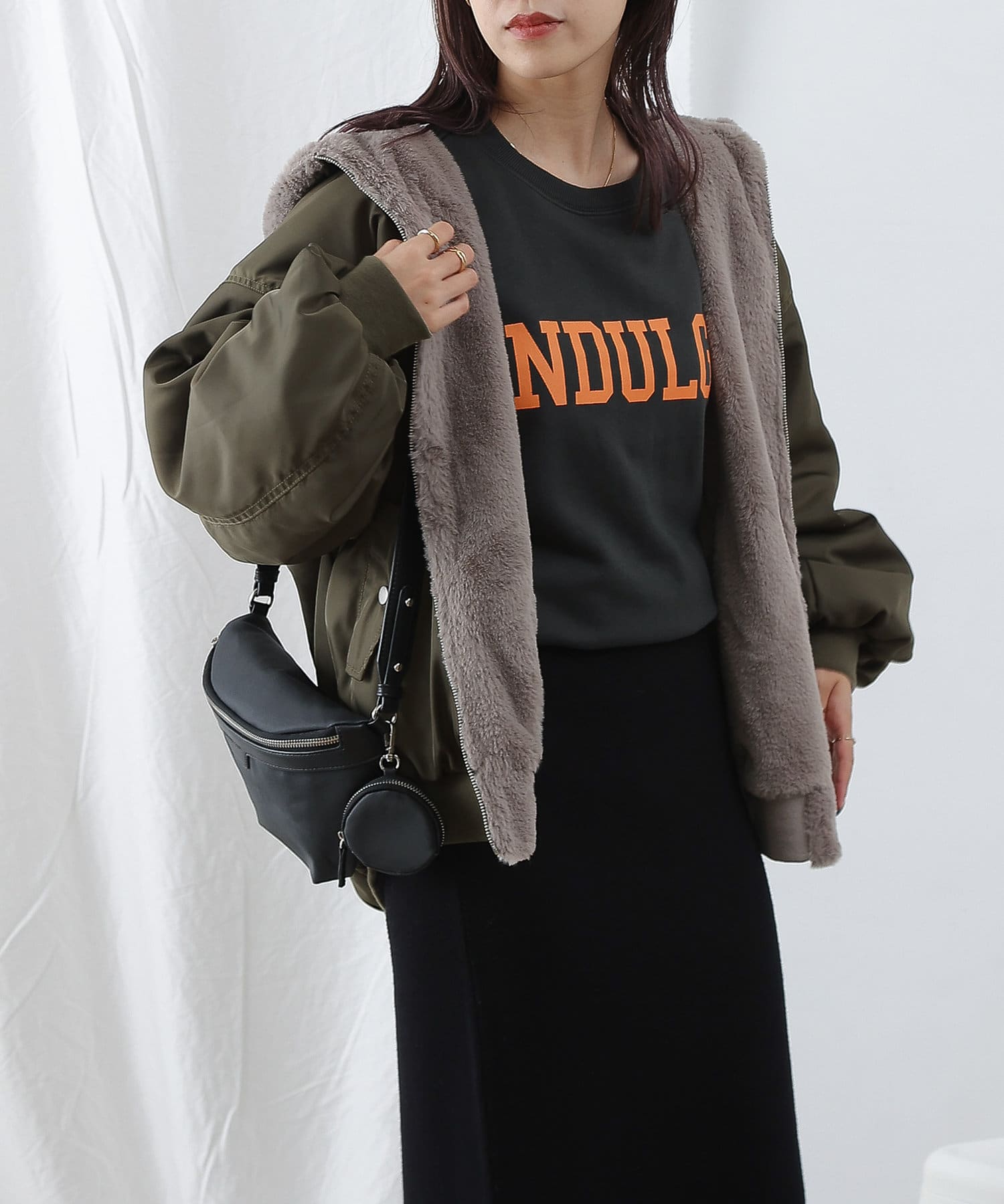 もこもこファーの可愛い着こなしと、MA-1風のメンズライクな着こなしができるリバーシブル仕様。