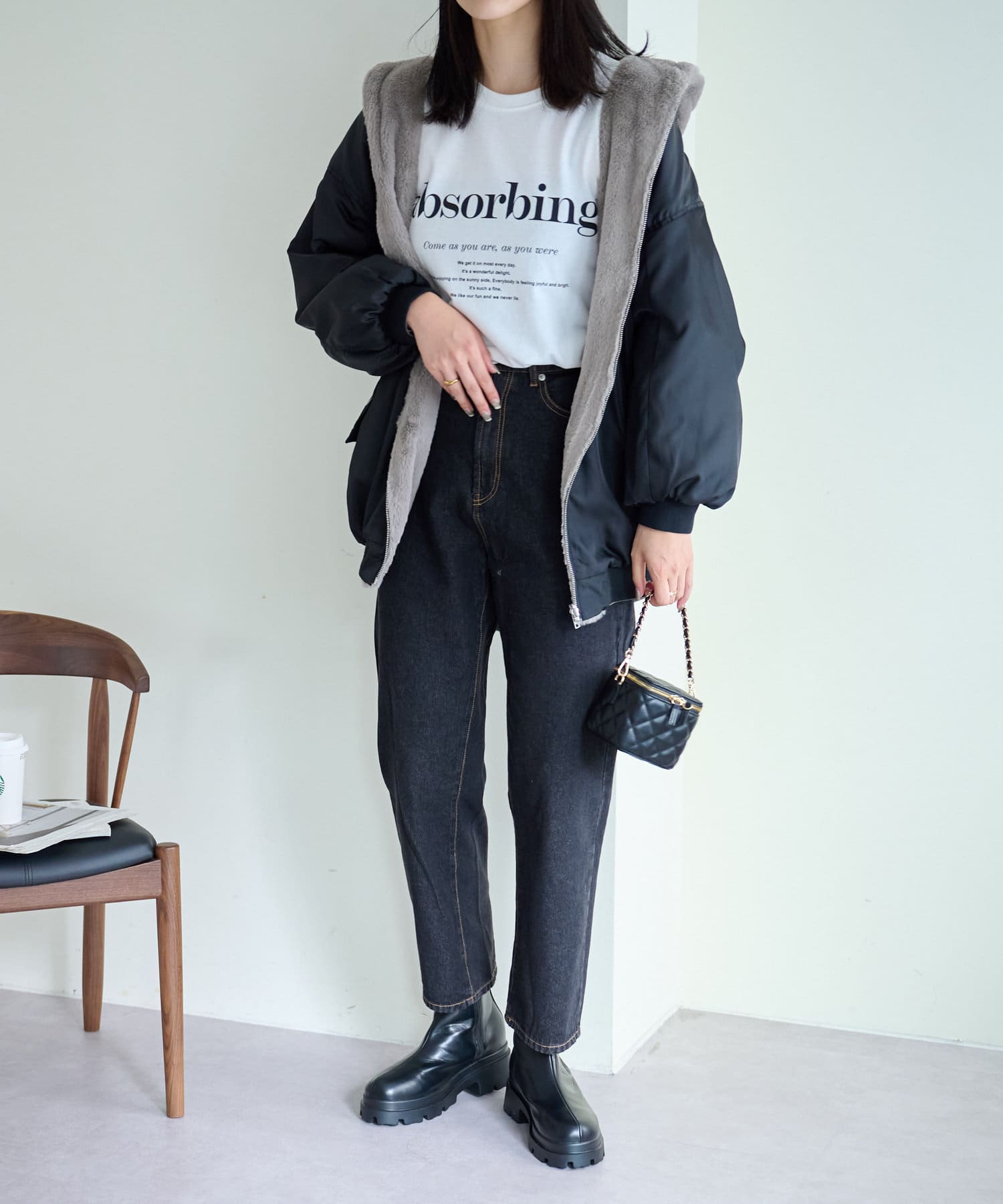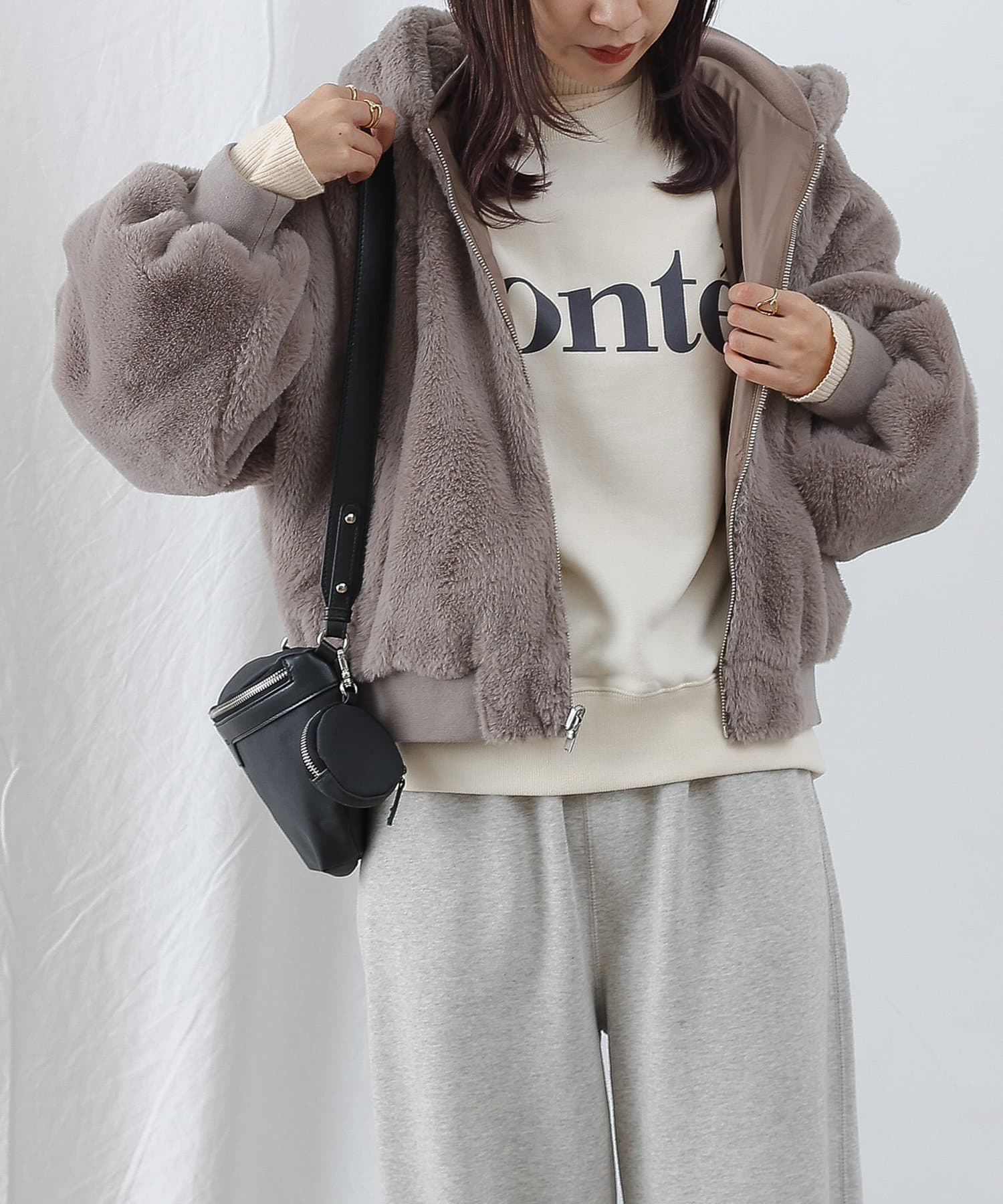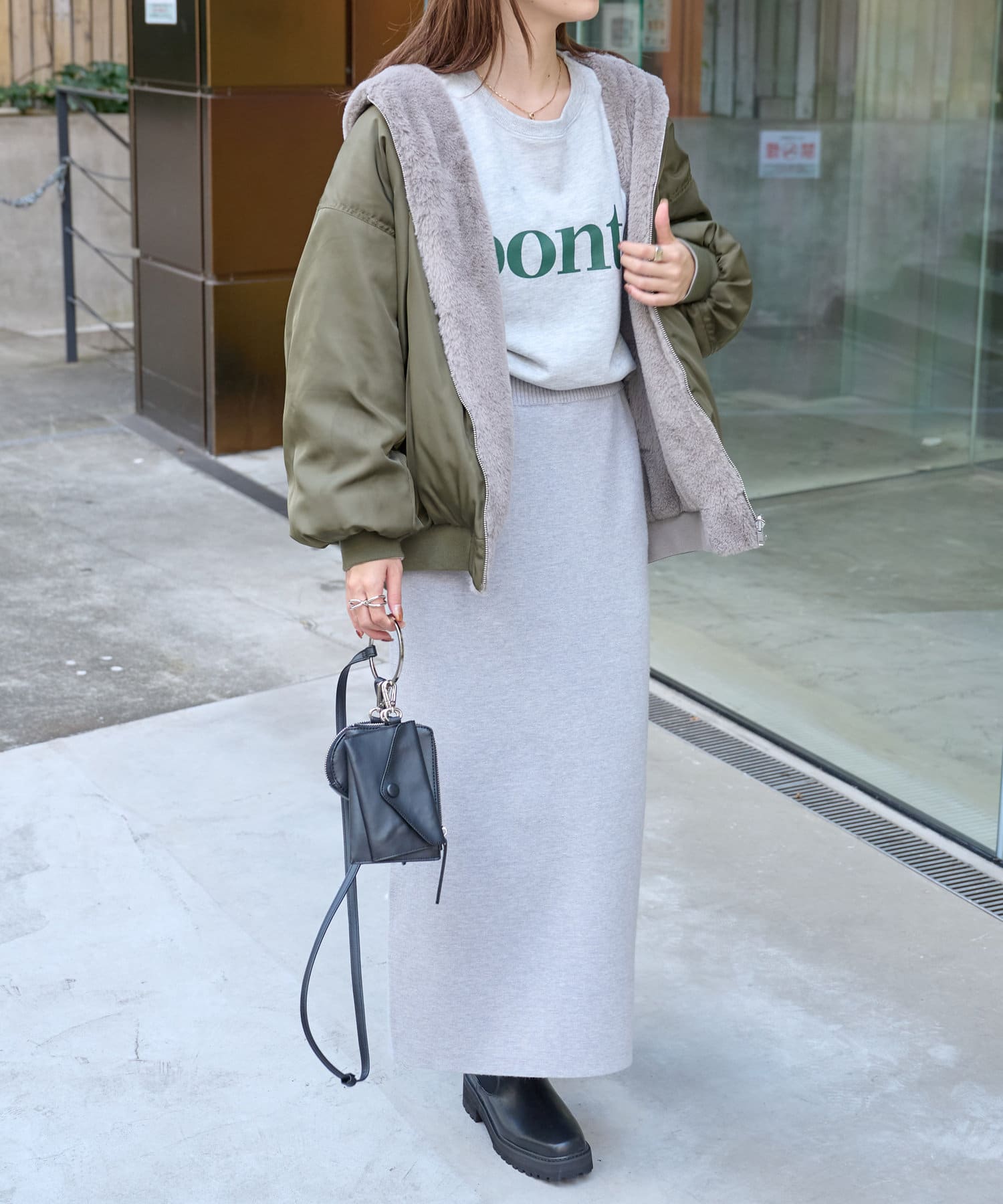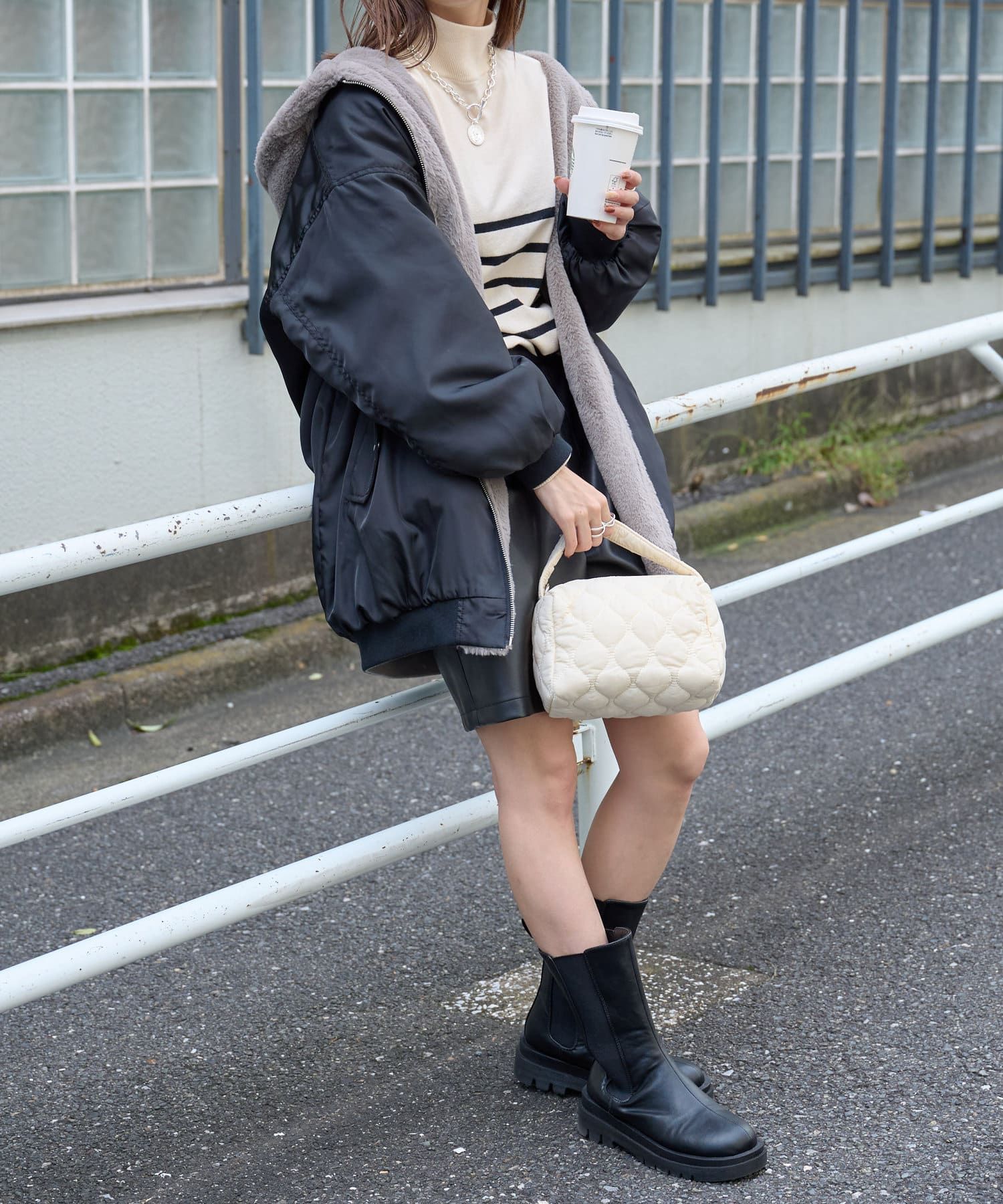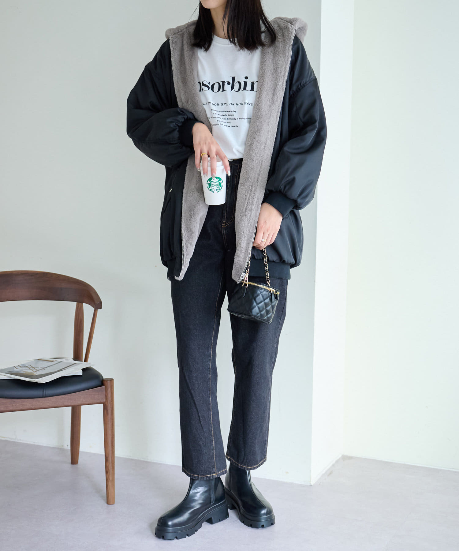 もこもこファーの可愛い着こなしと、MA-1風のメンズライクな着こなしができるリバーシブル仕様。