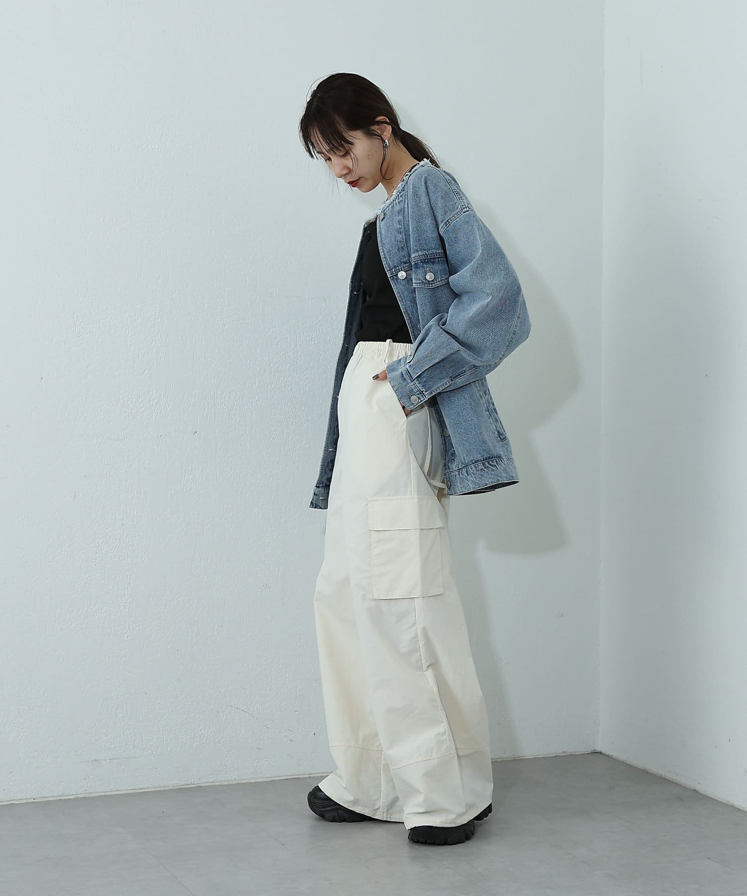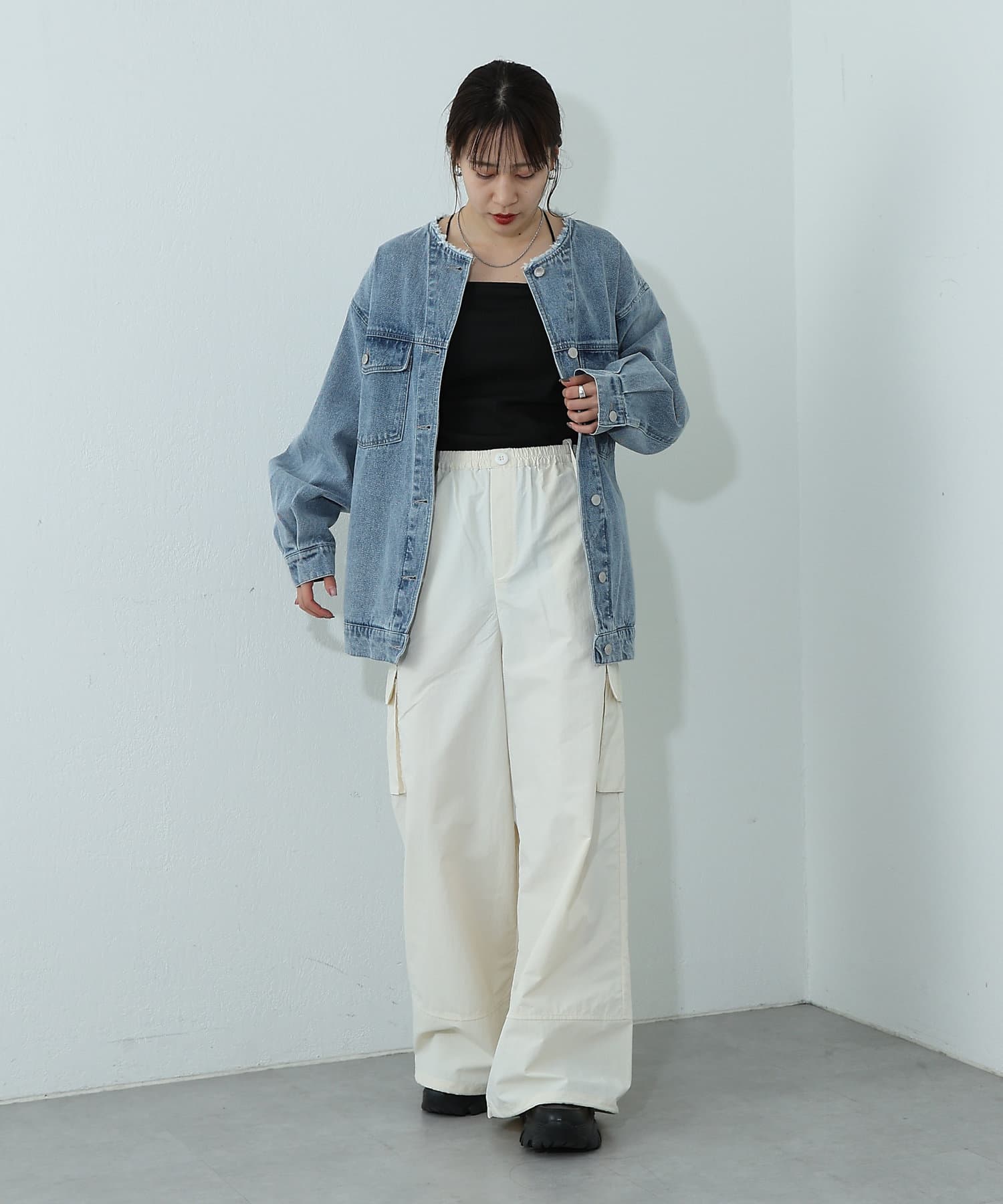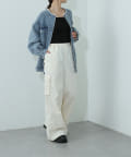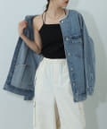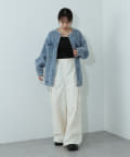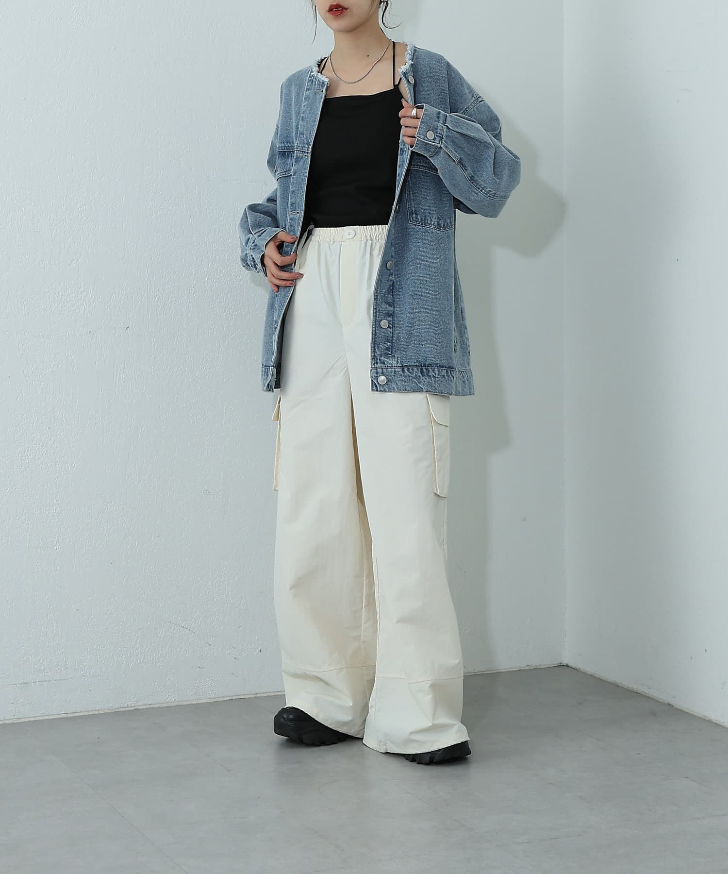 衿開きの広いトップスや透け感のあるアイテムで合わせると今年らしいトレンド感溢れるスタイルに。