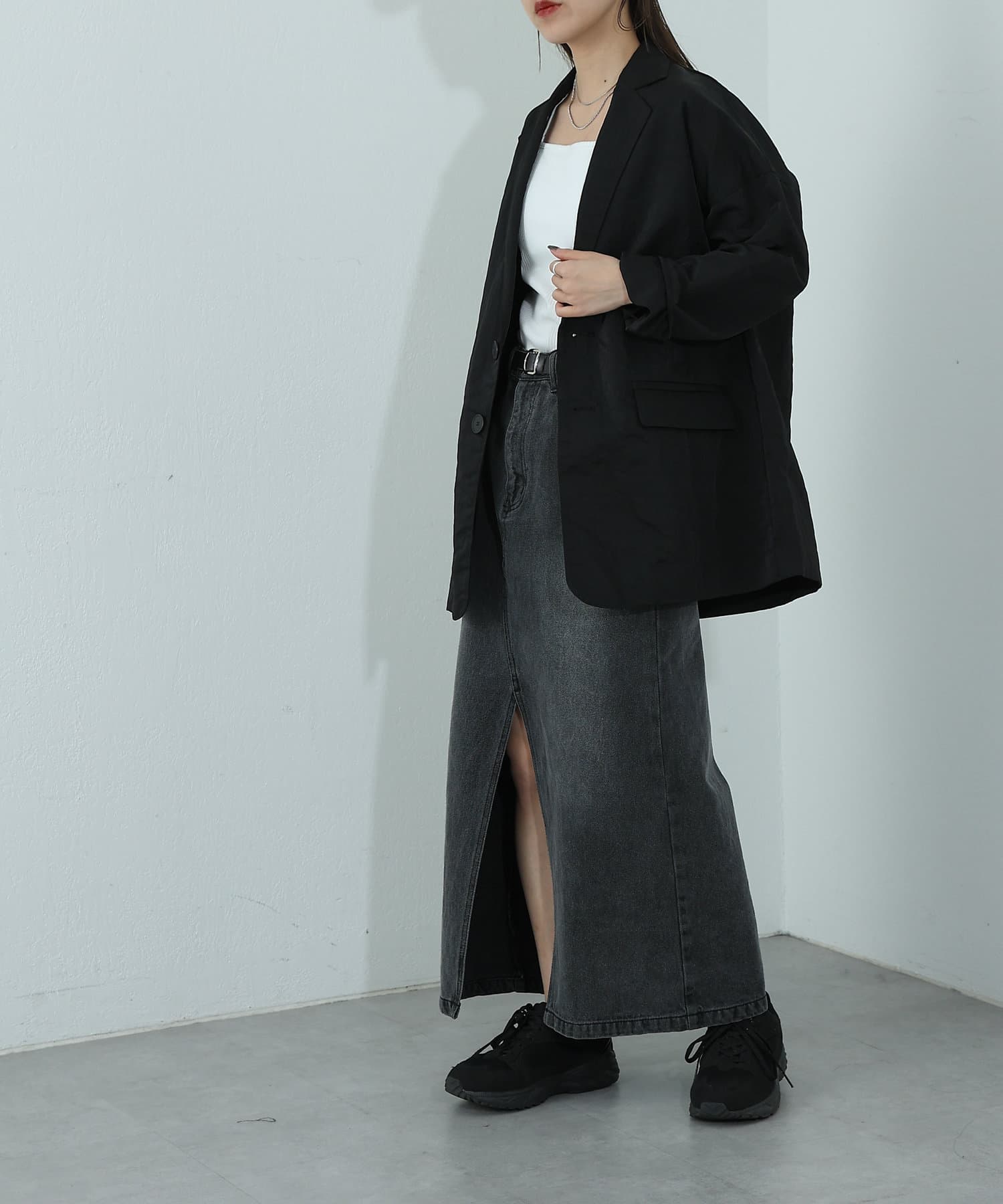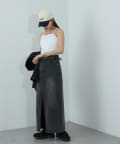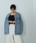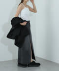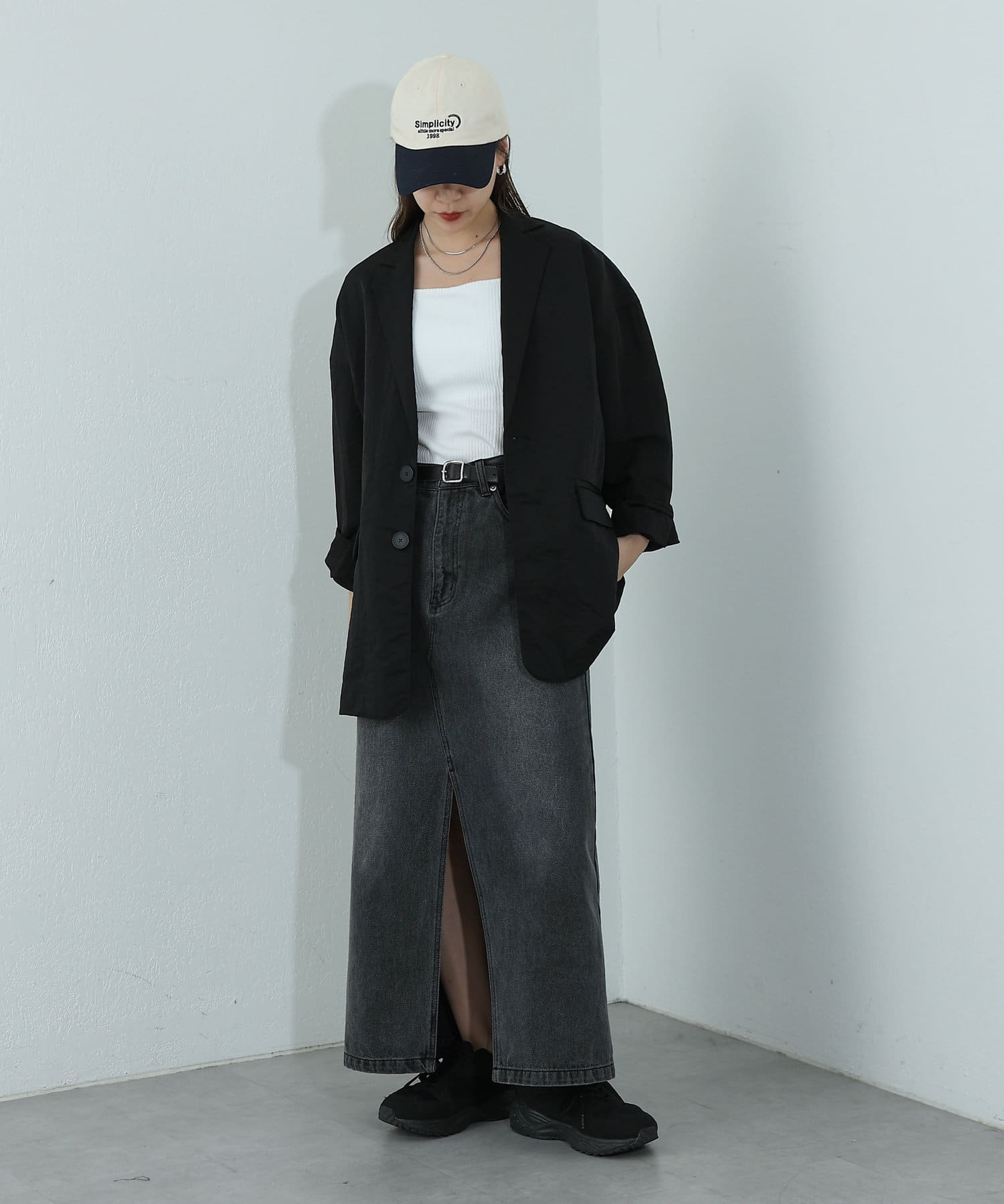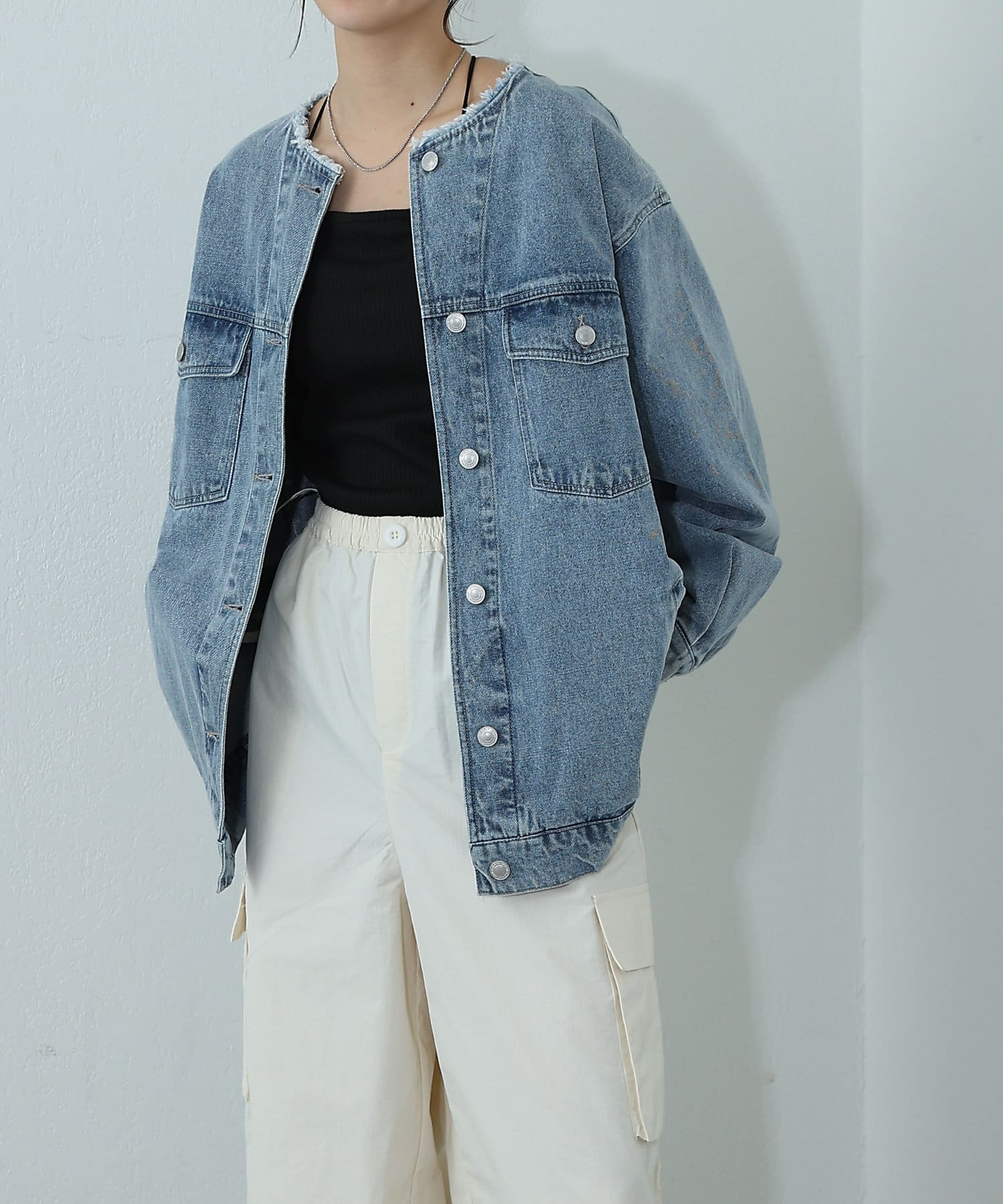 衿開きの広いトップスや透け感のあるアイテムで合わせると今年らしいトレンド感溢れるスタイルに。