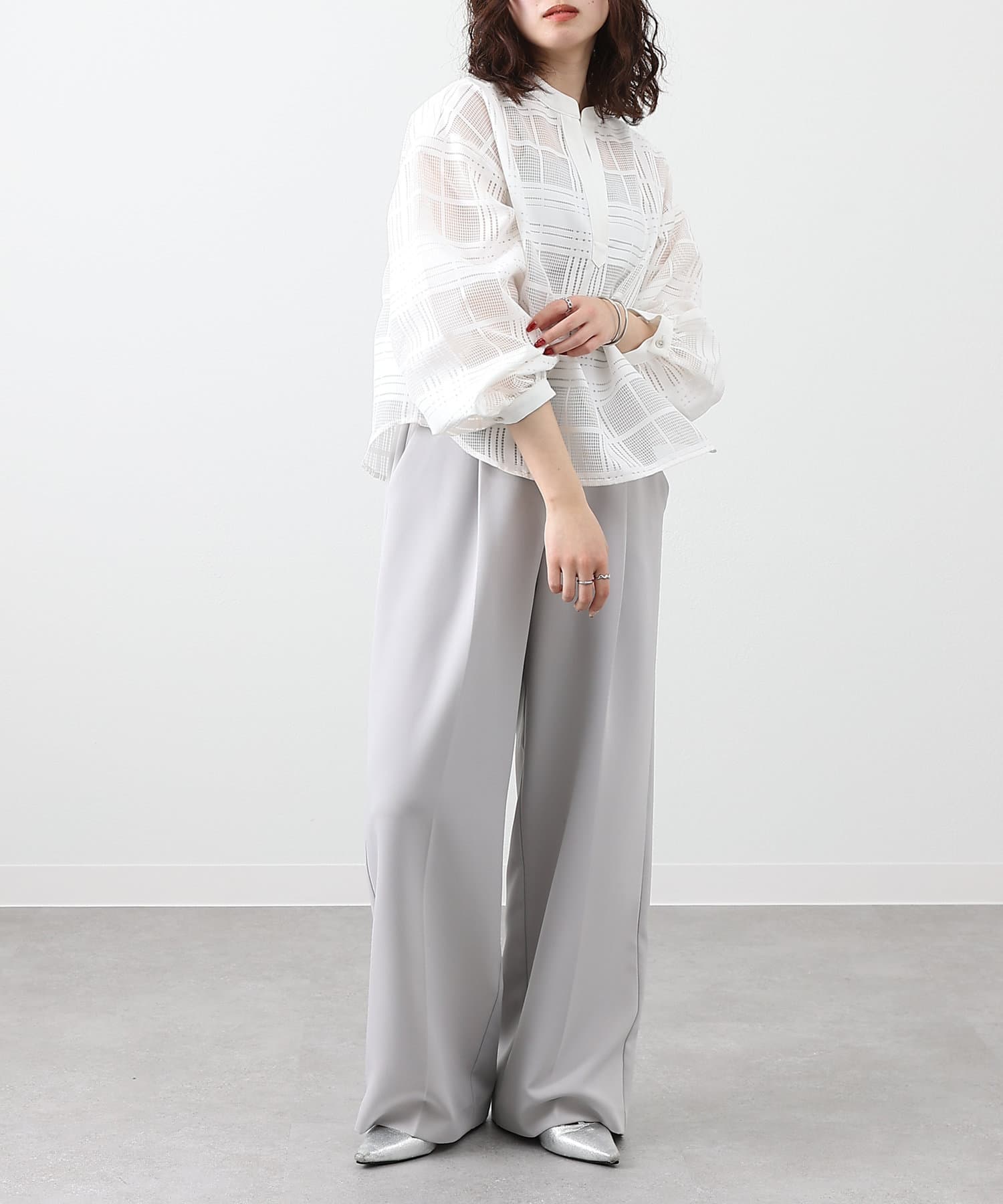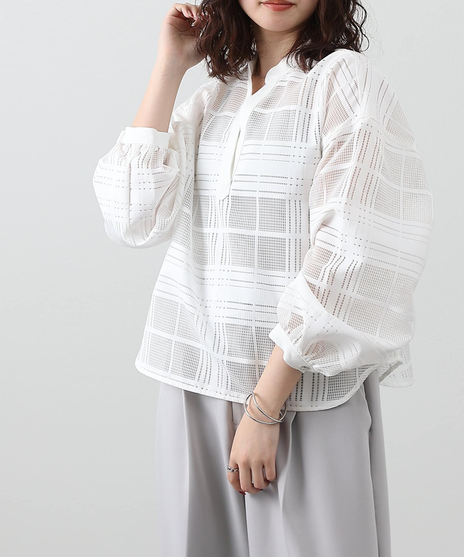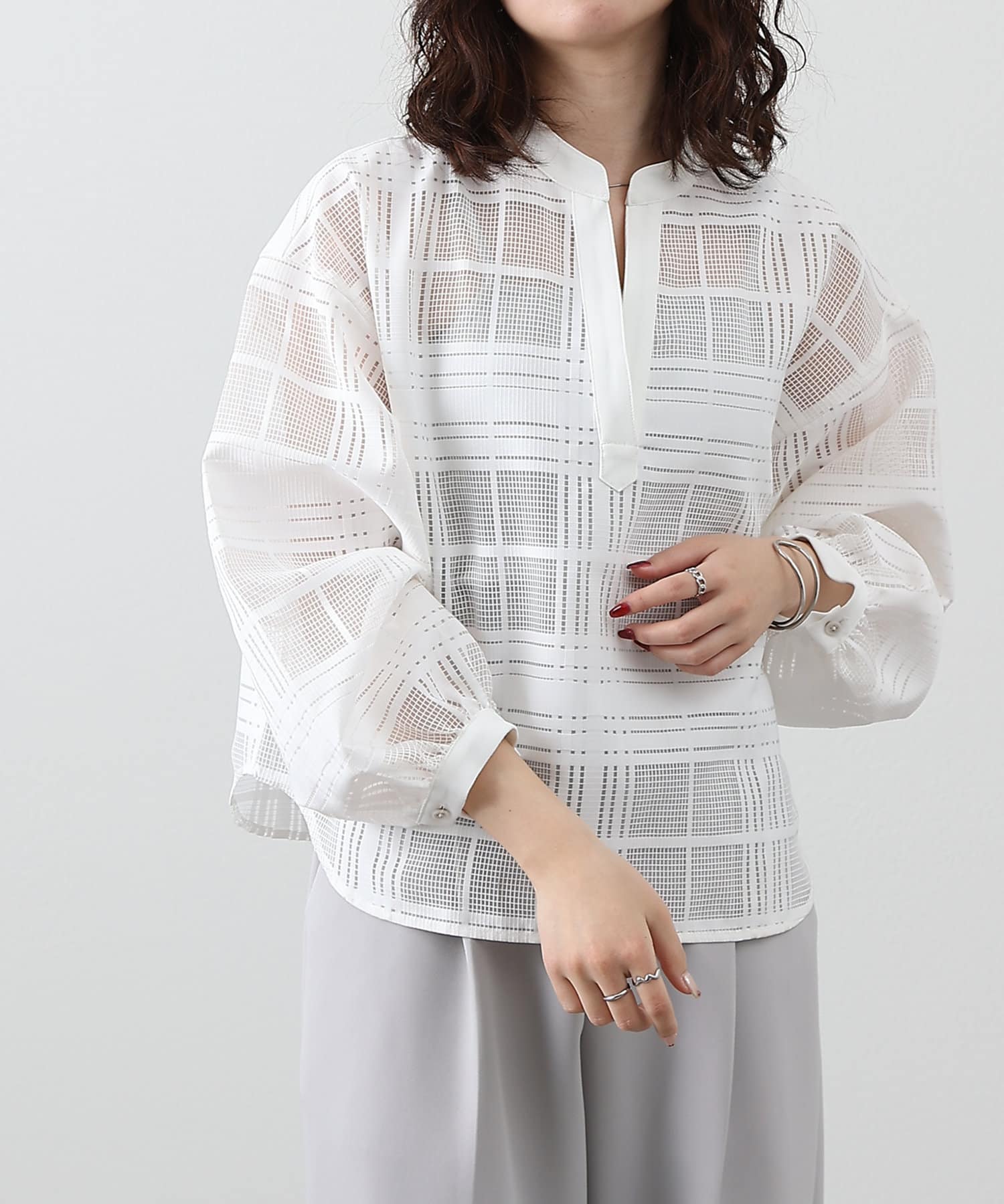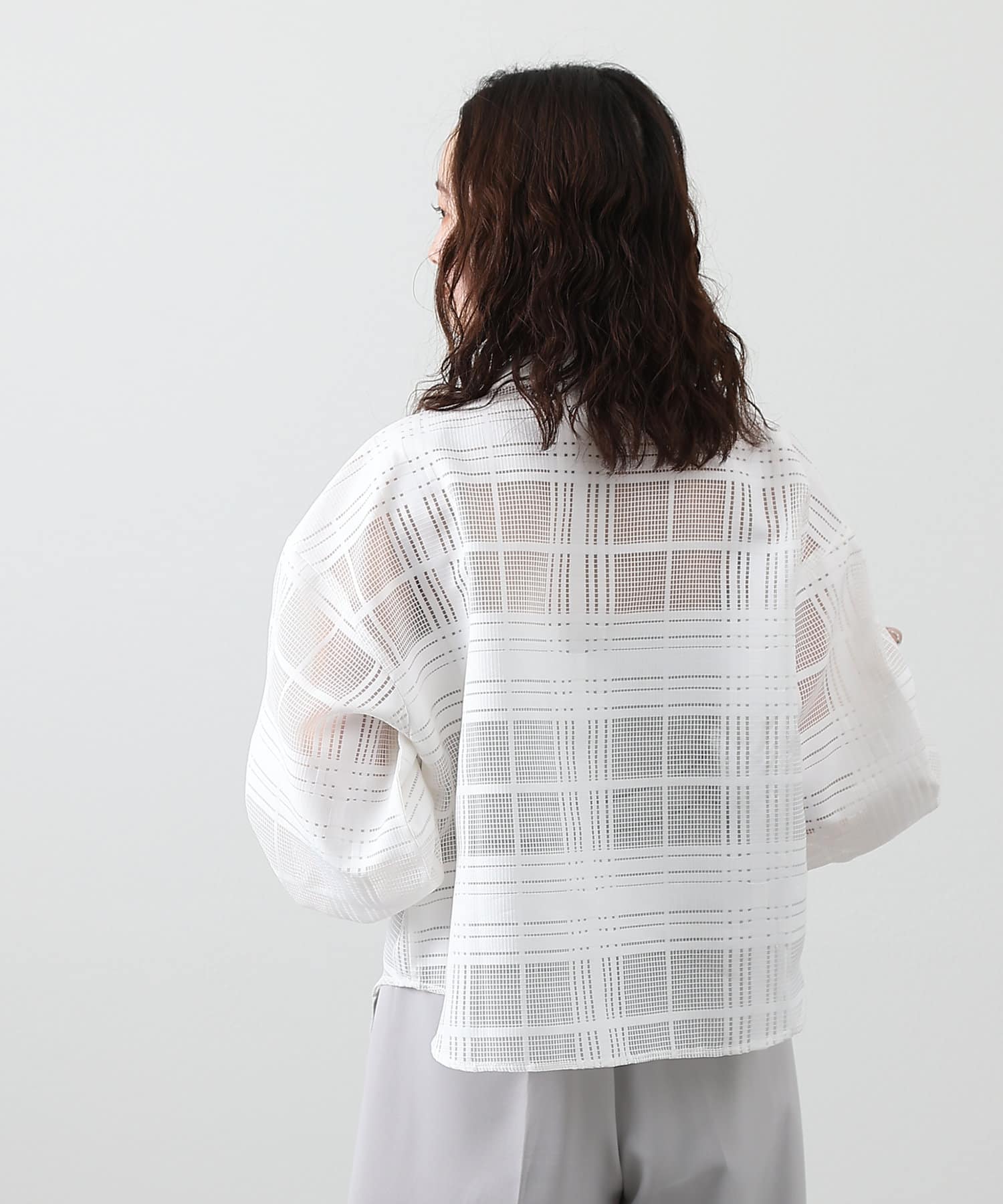 シアー素材と同色のチェック柄が季節感に媚びすぎないロングシーズン着用可能アイテム。