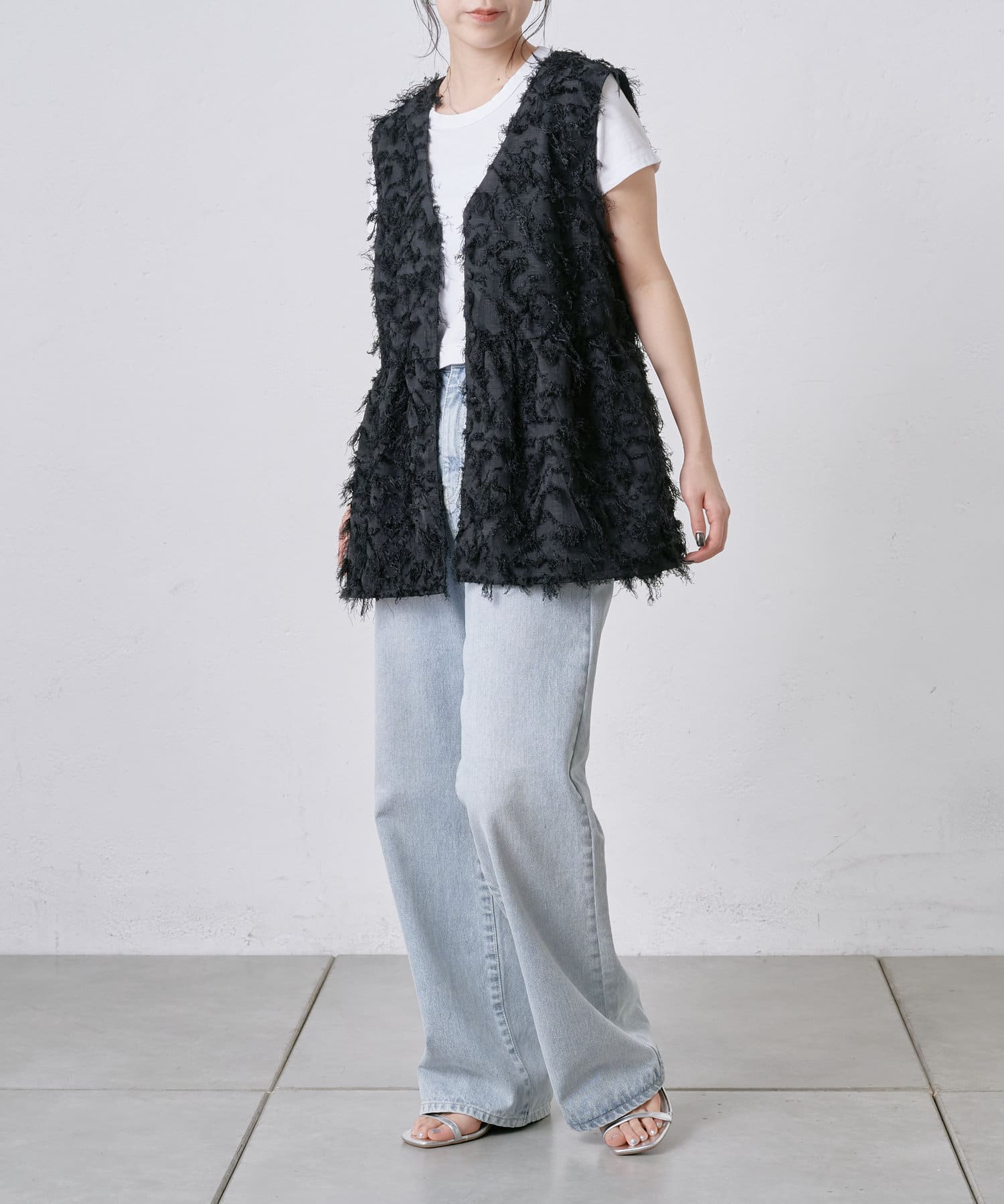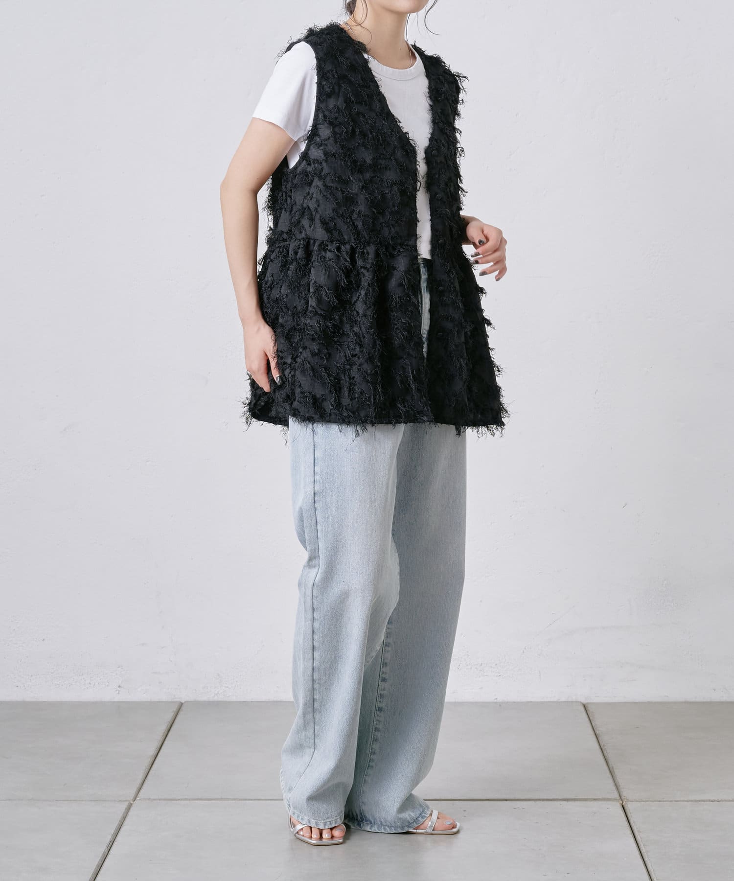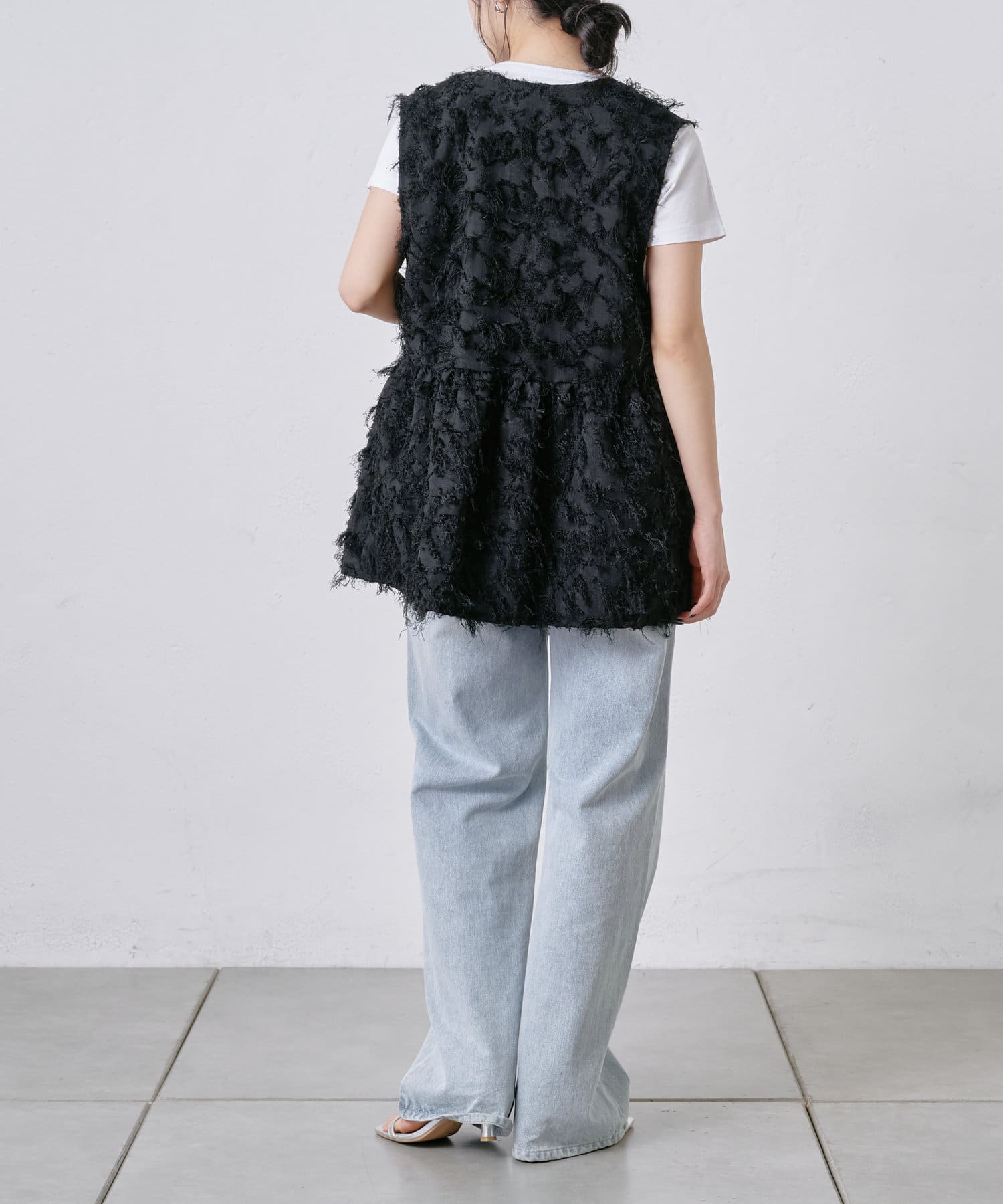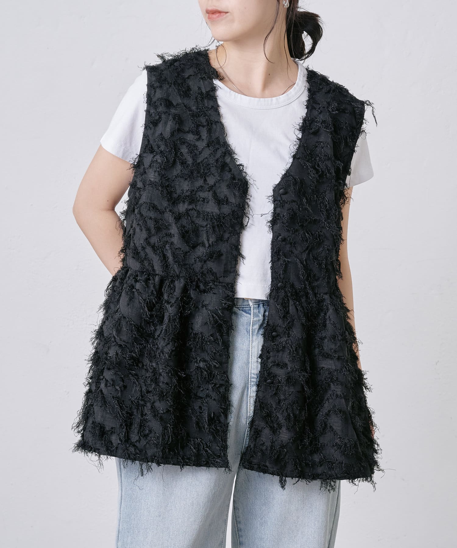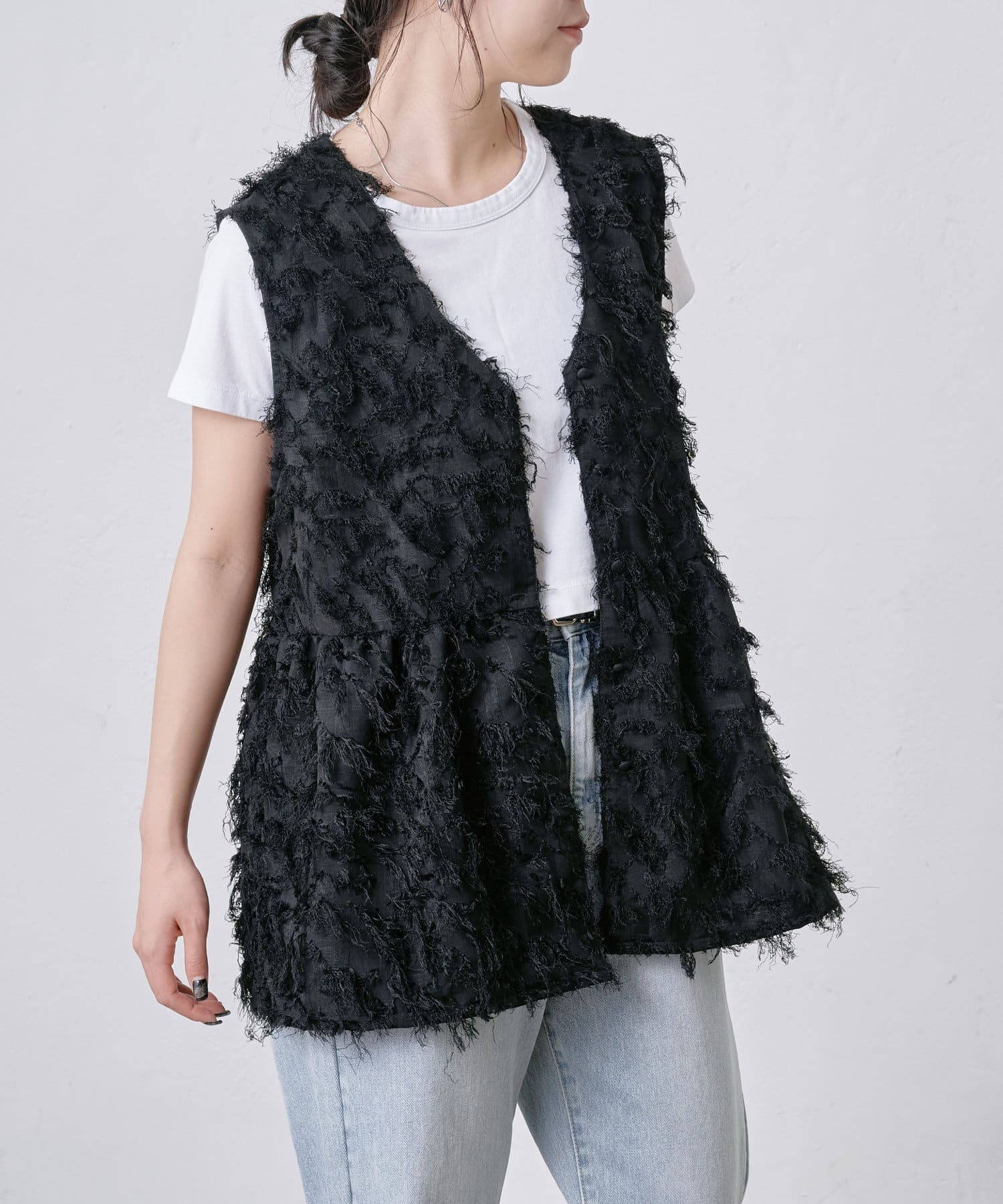 フリンジがたっぷりと施されたペプラムトップス。