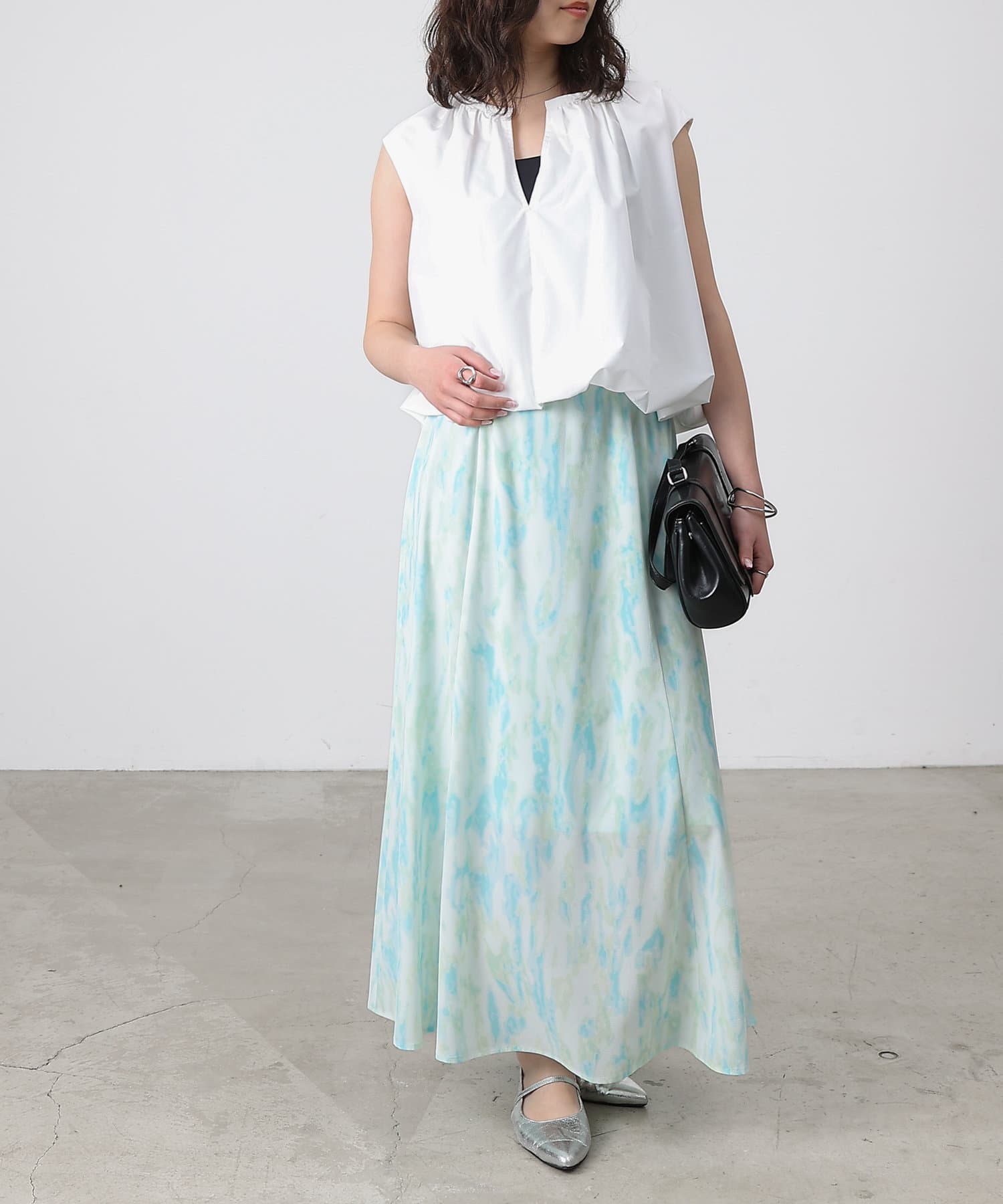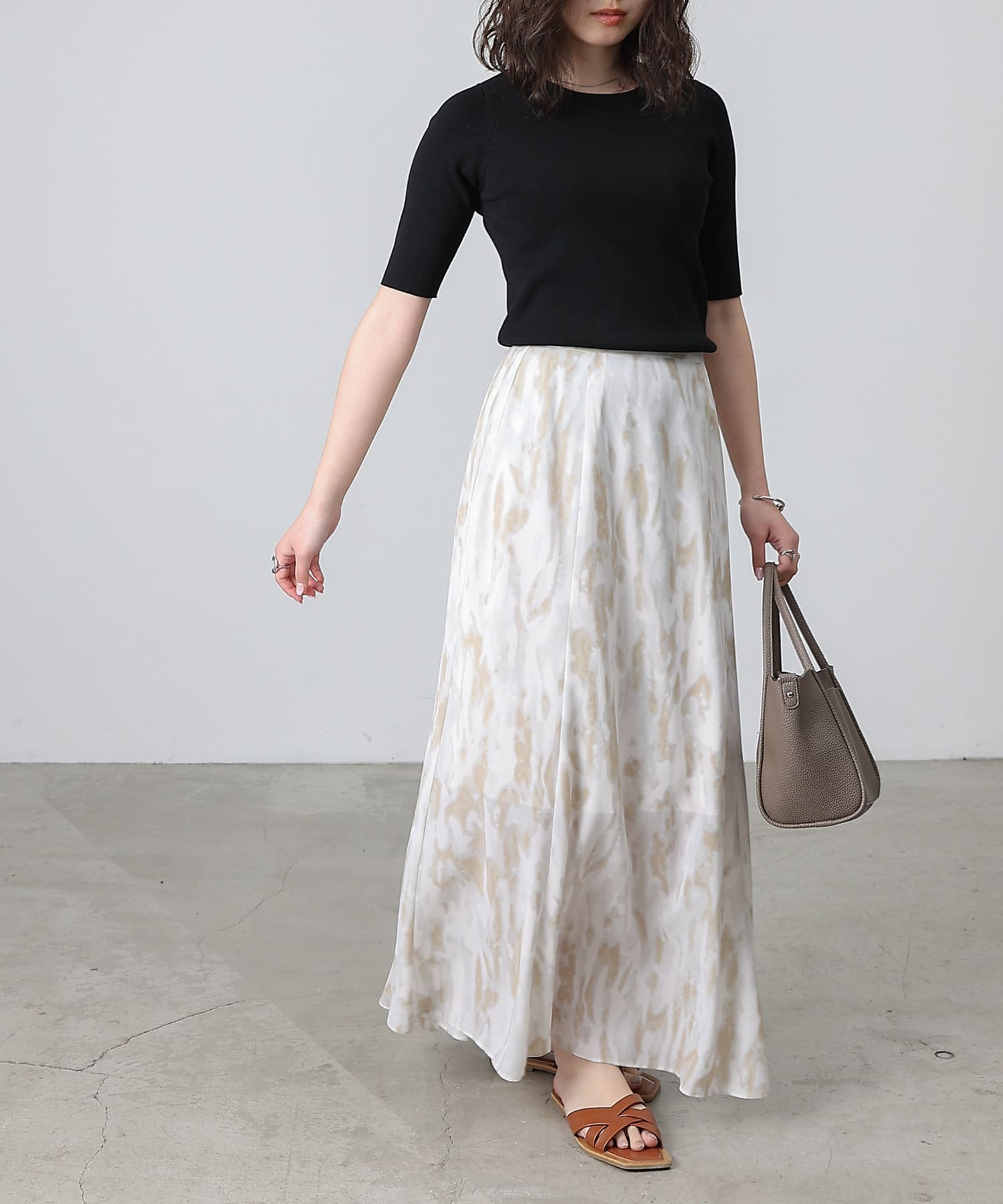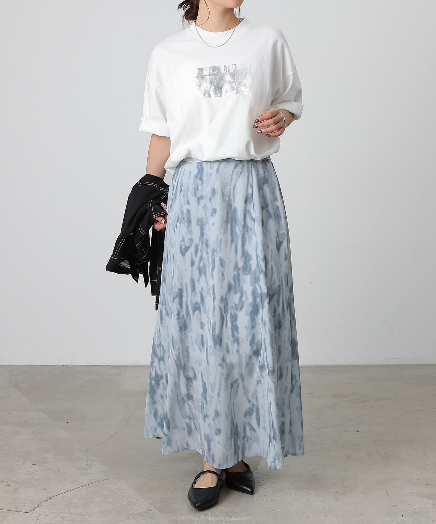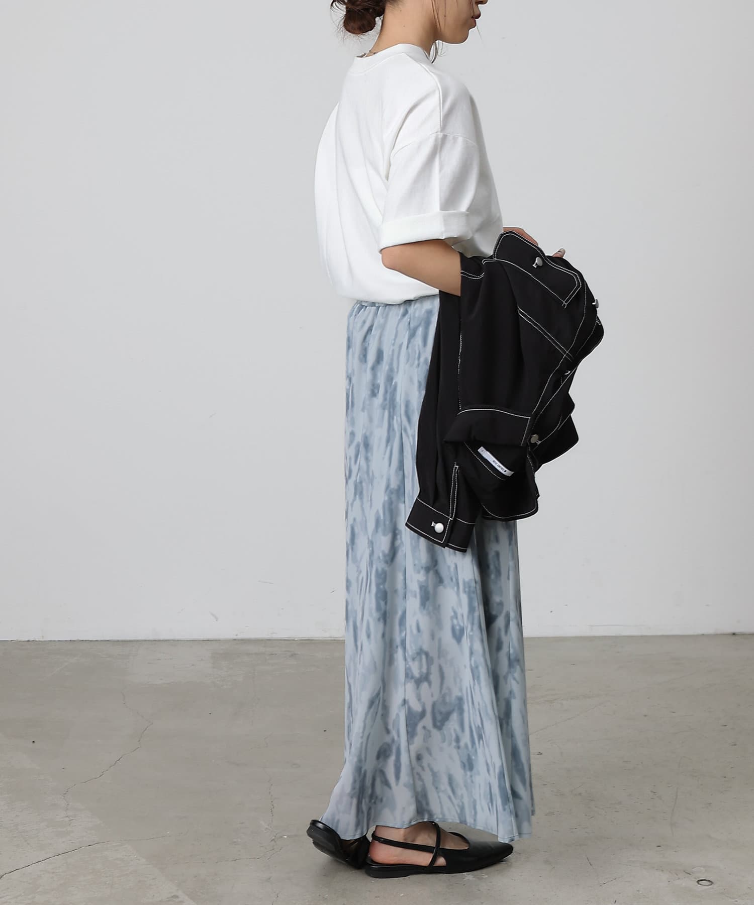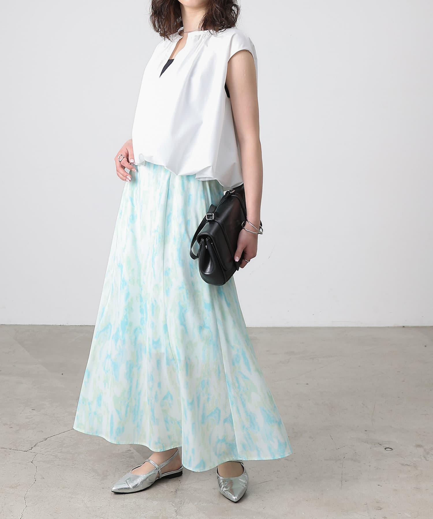 ノイズフローラルプリントが目を引きつつ、コーデに華やかさをプラスしてくれるアイテムです。