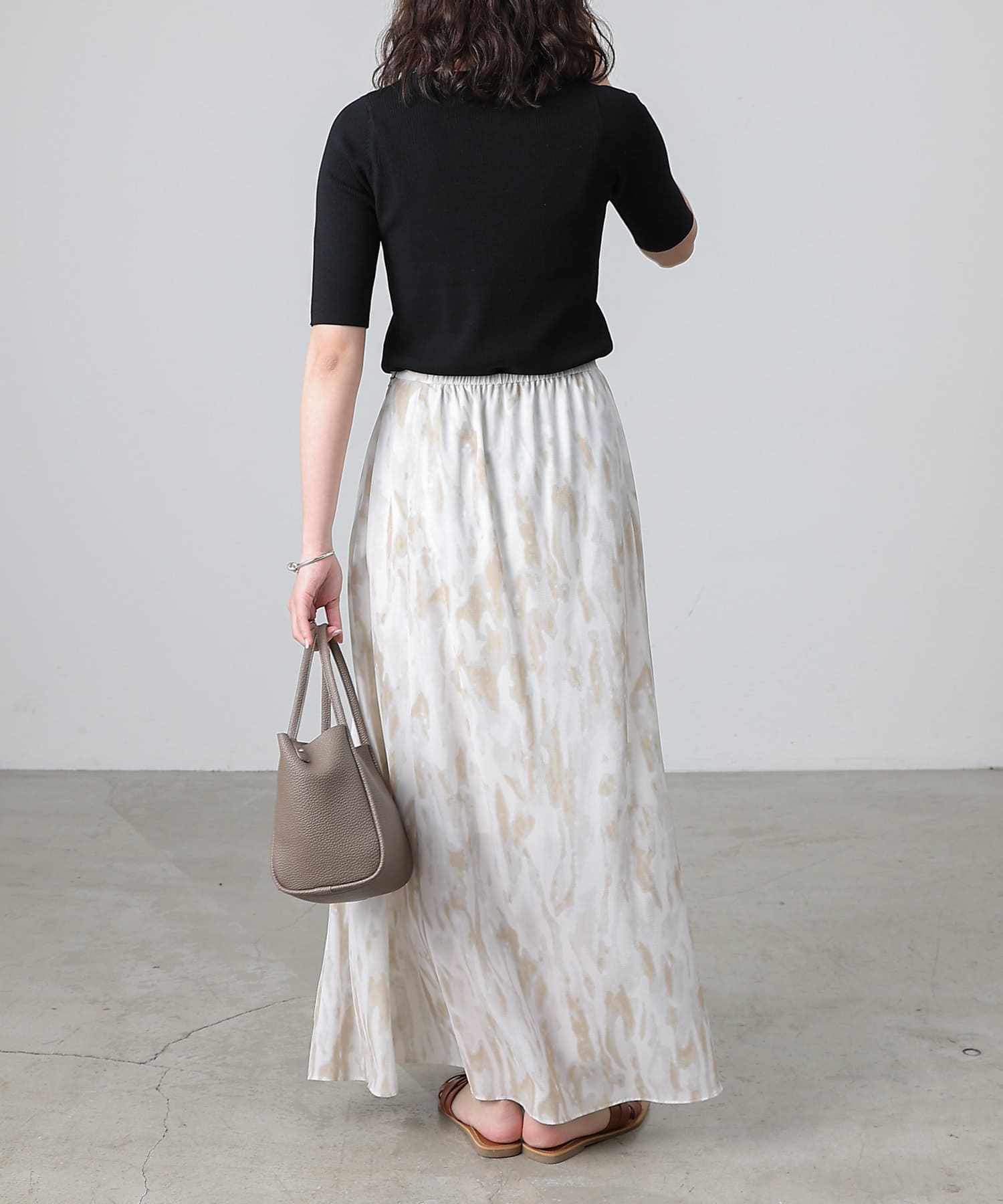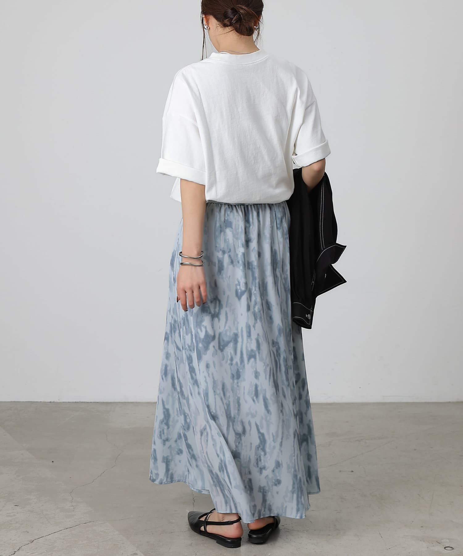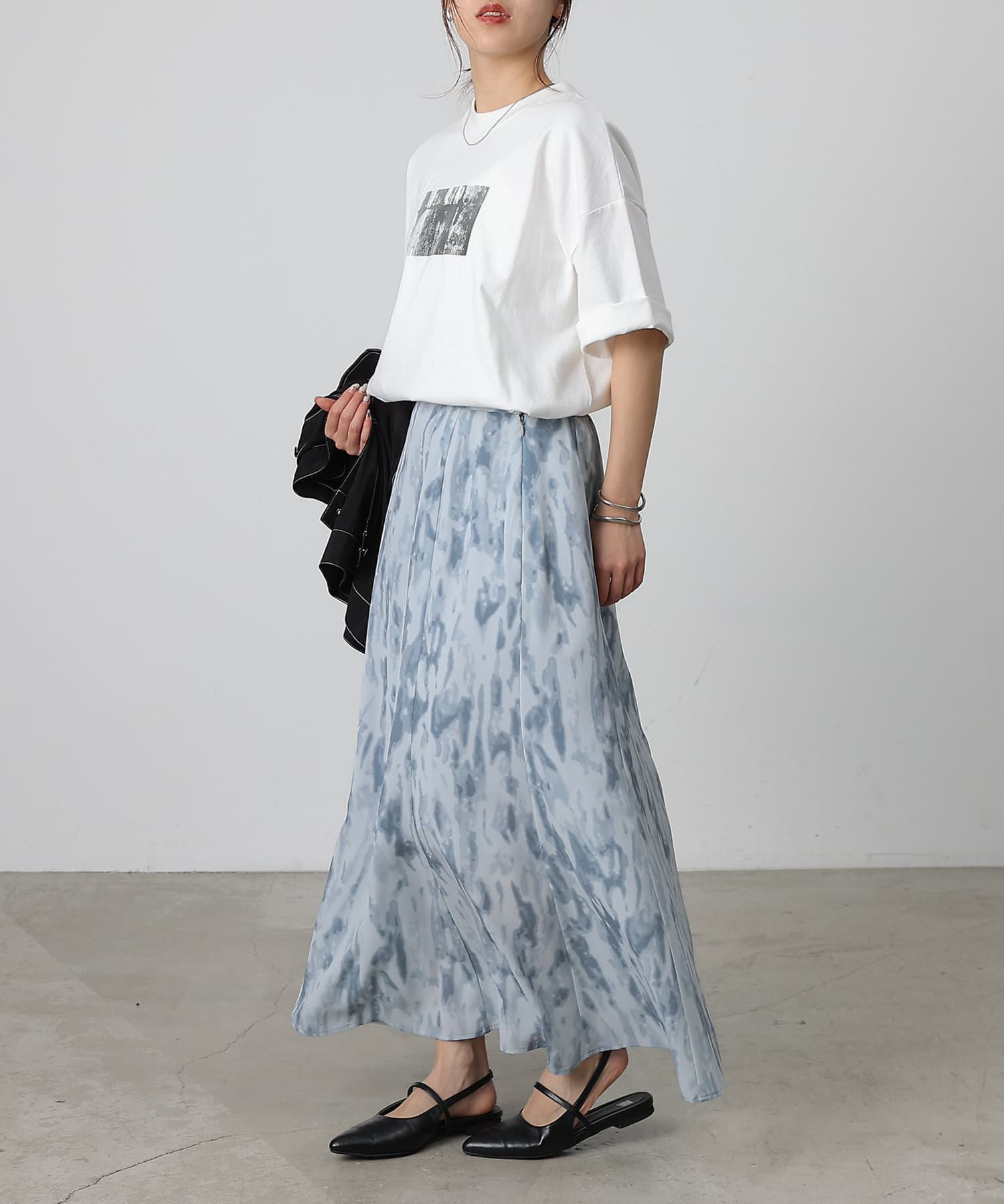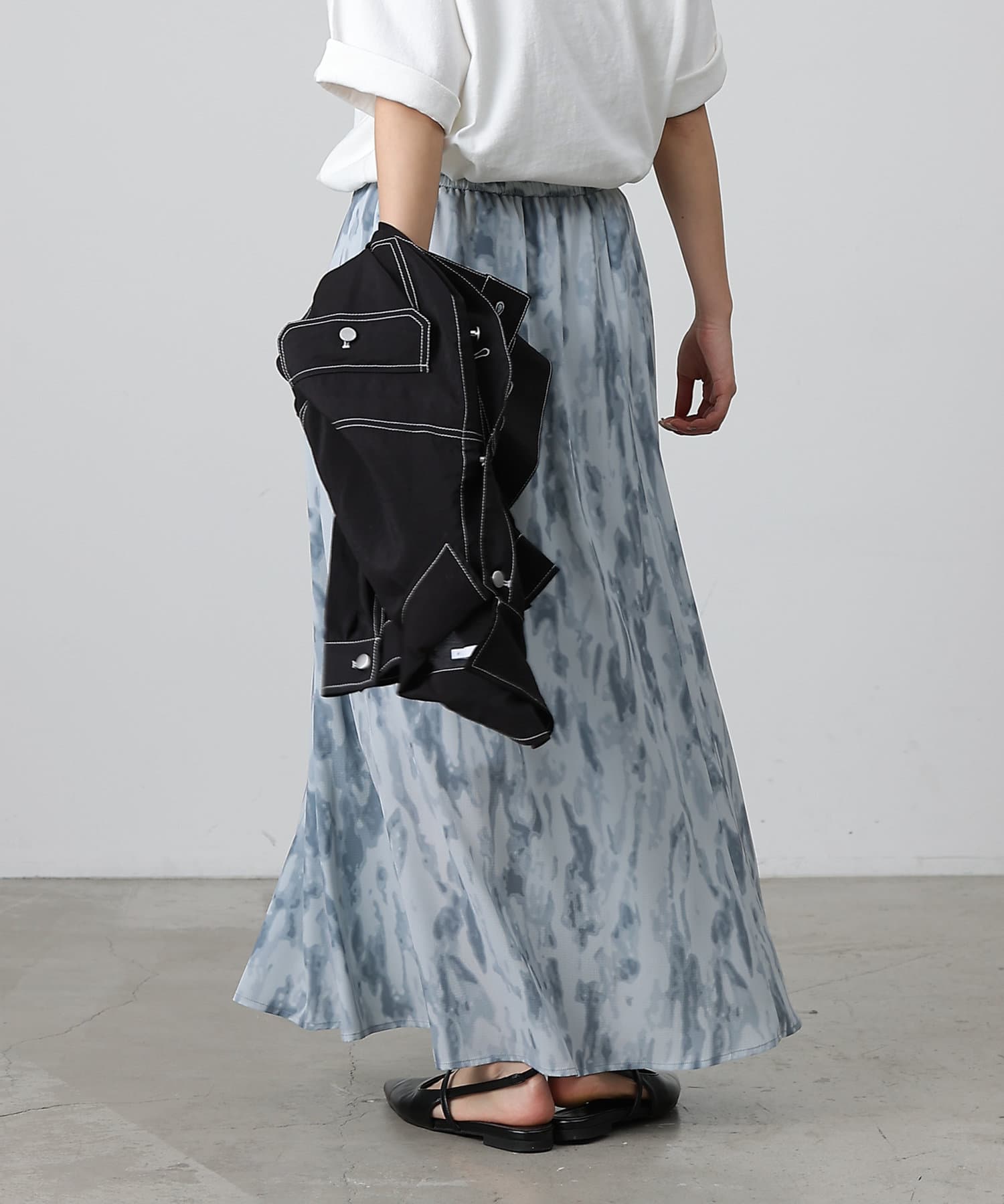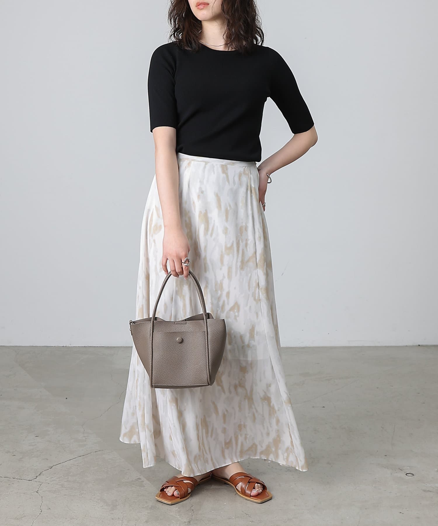 ノイズフローラルプリントが目を引きつつ、コーデに華やかさをプラスしてくれるアイテムです。