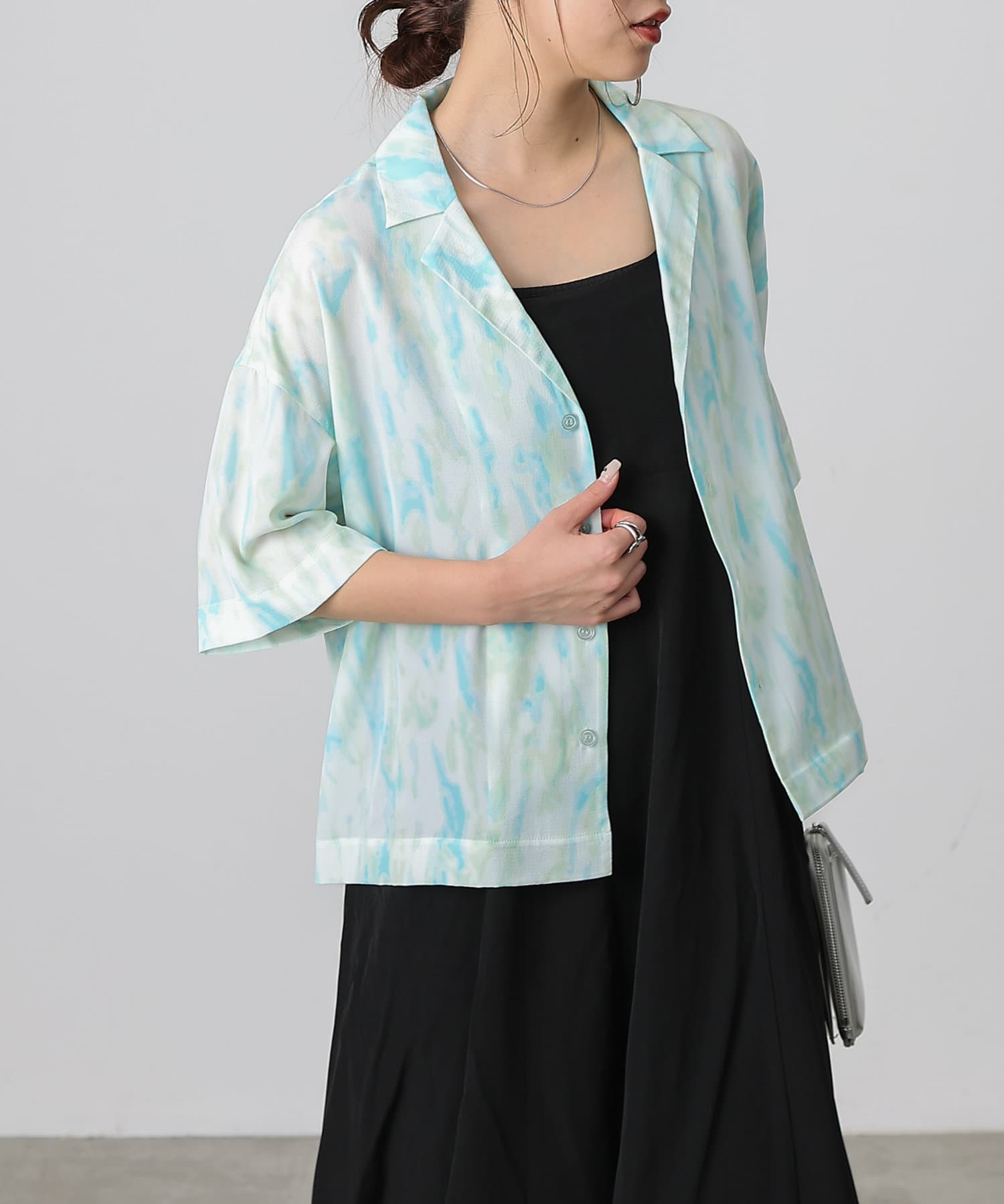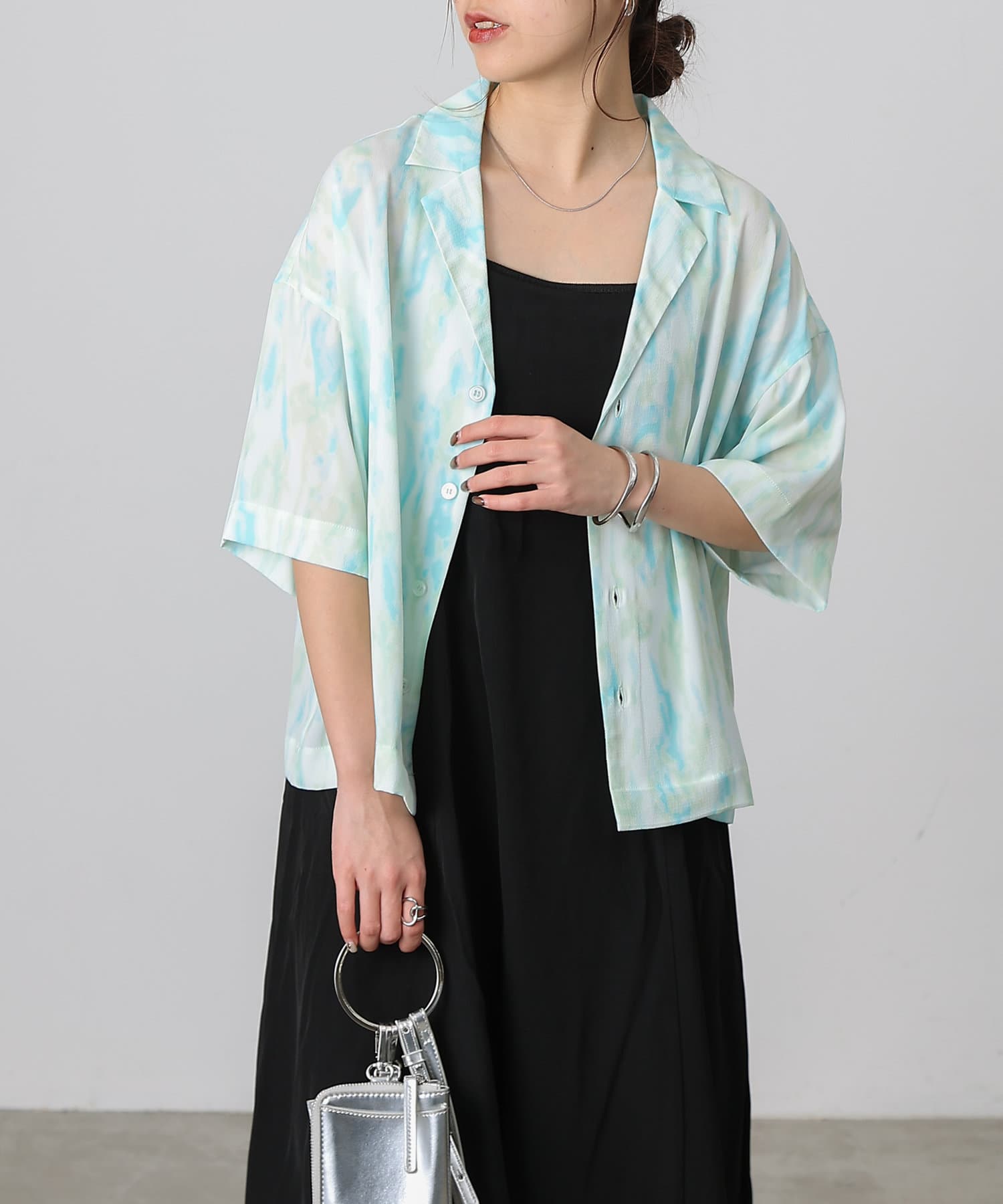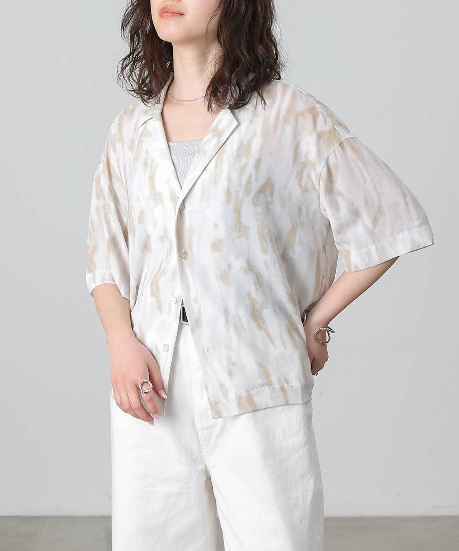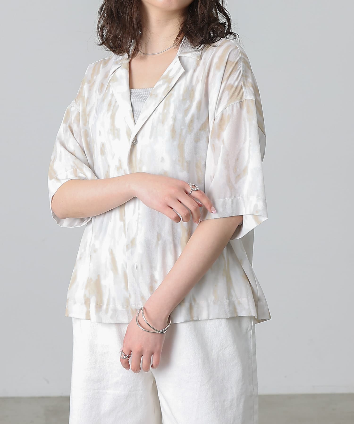 シンプルになりがちな夏コーデのアクセントにぴったりなオープンカラーシャツ。