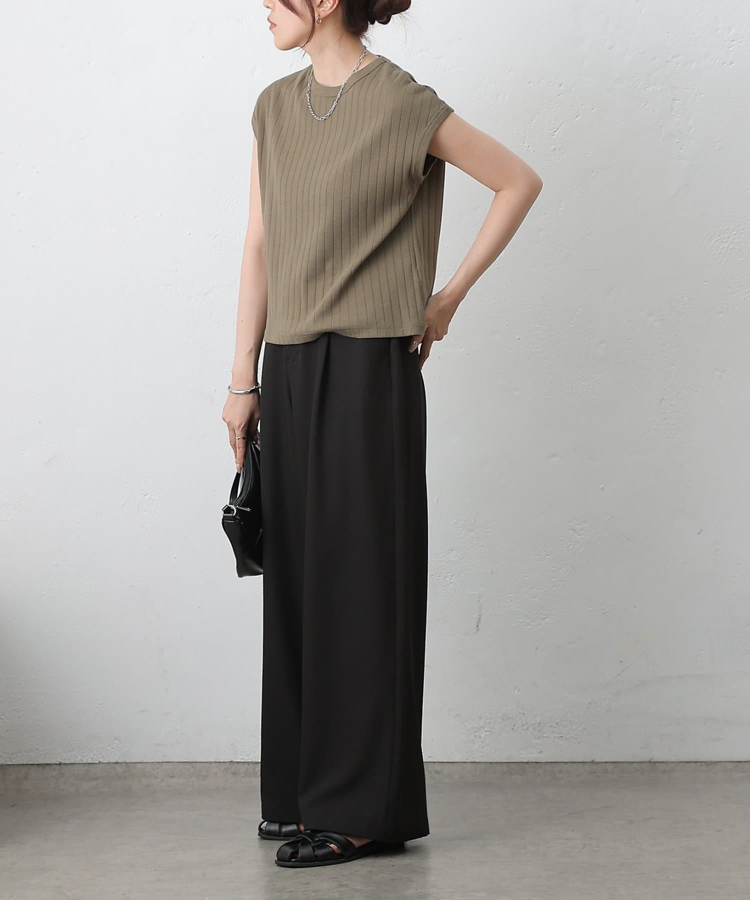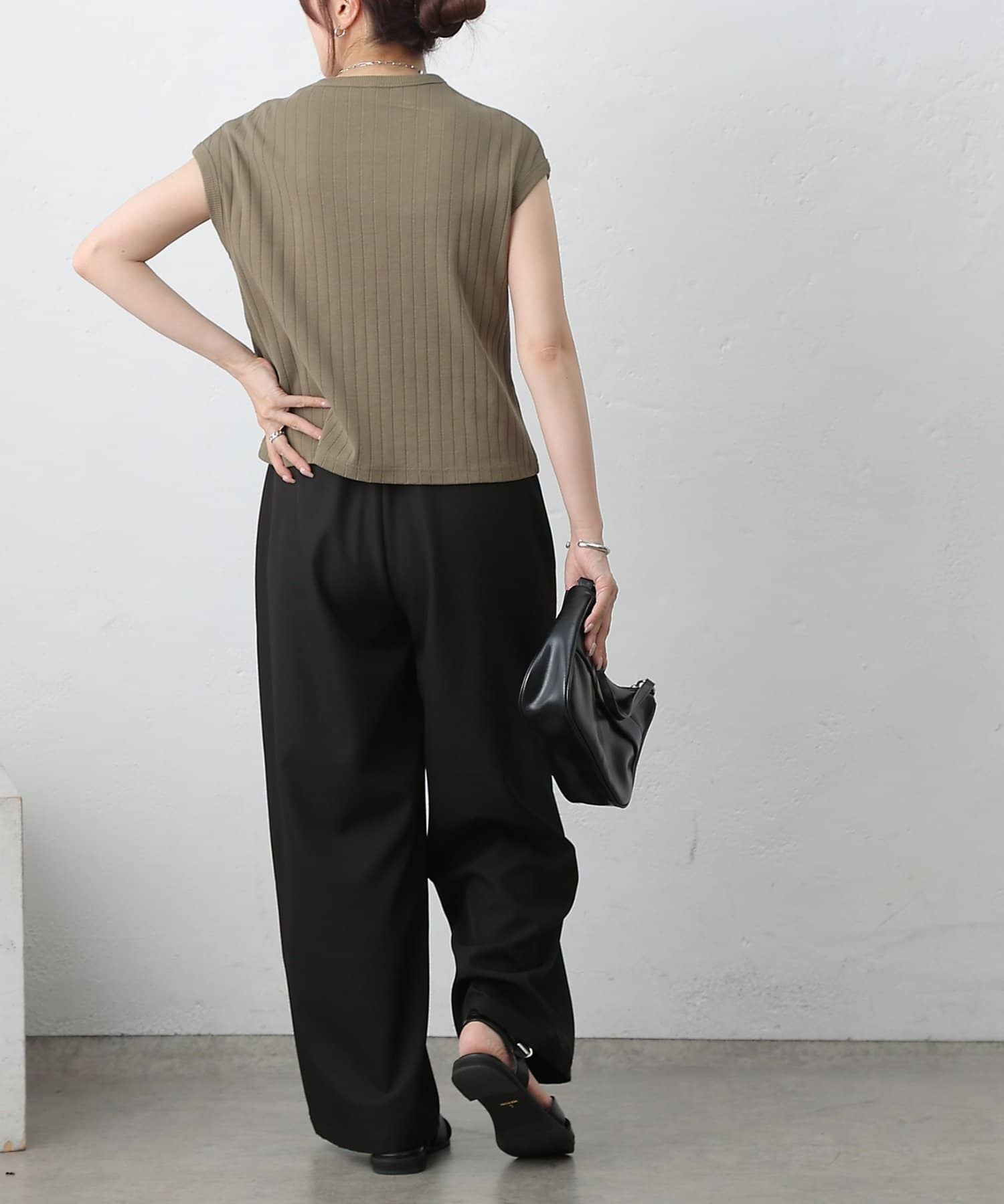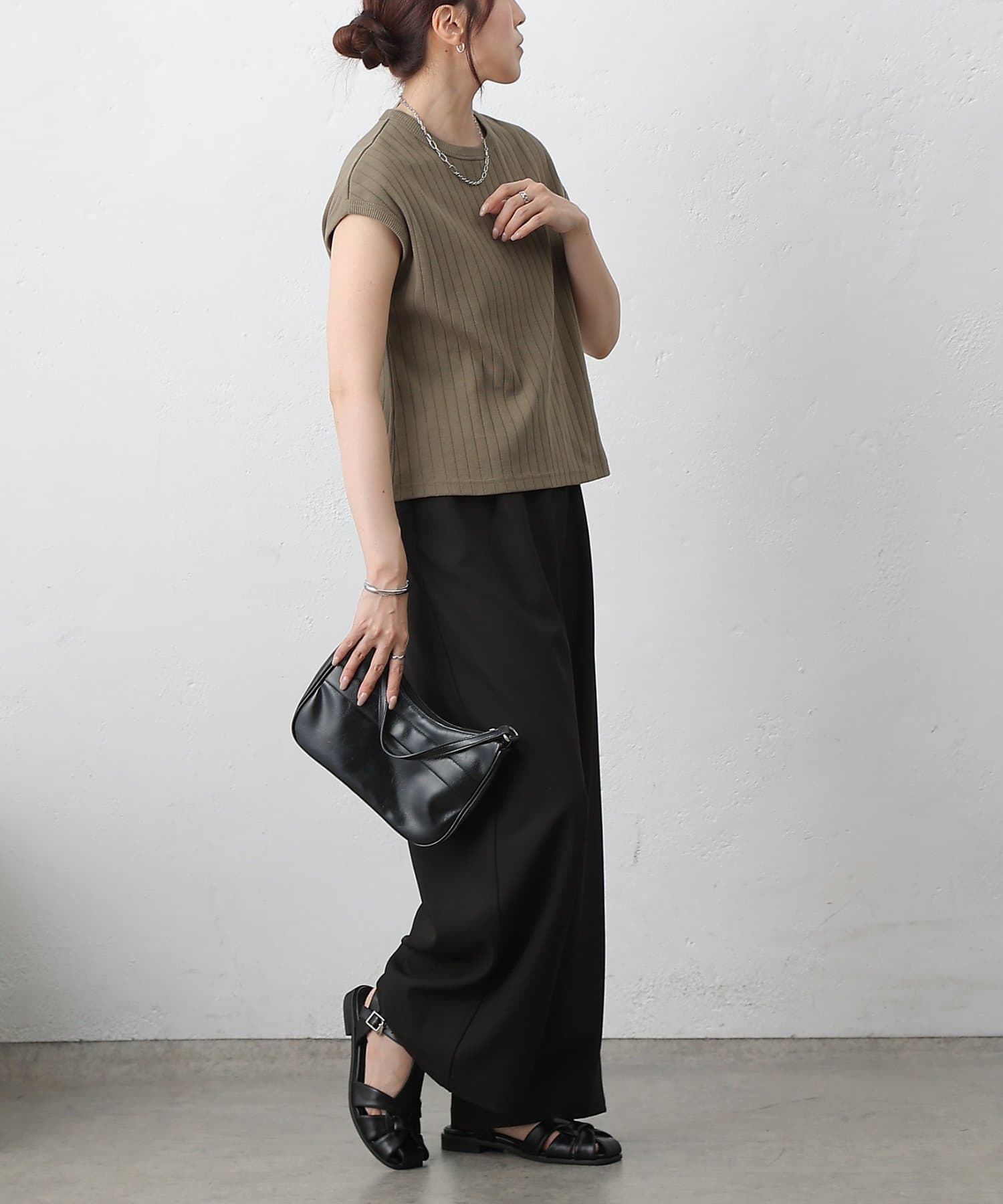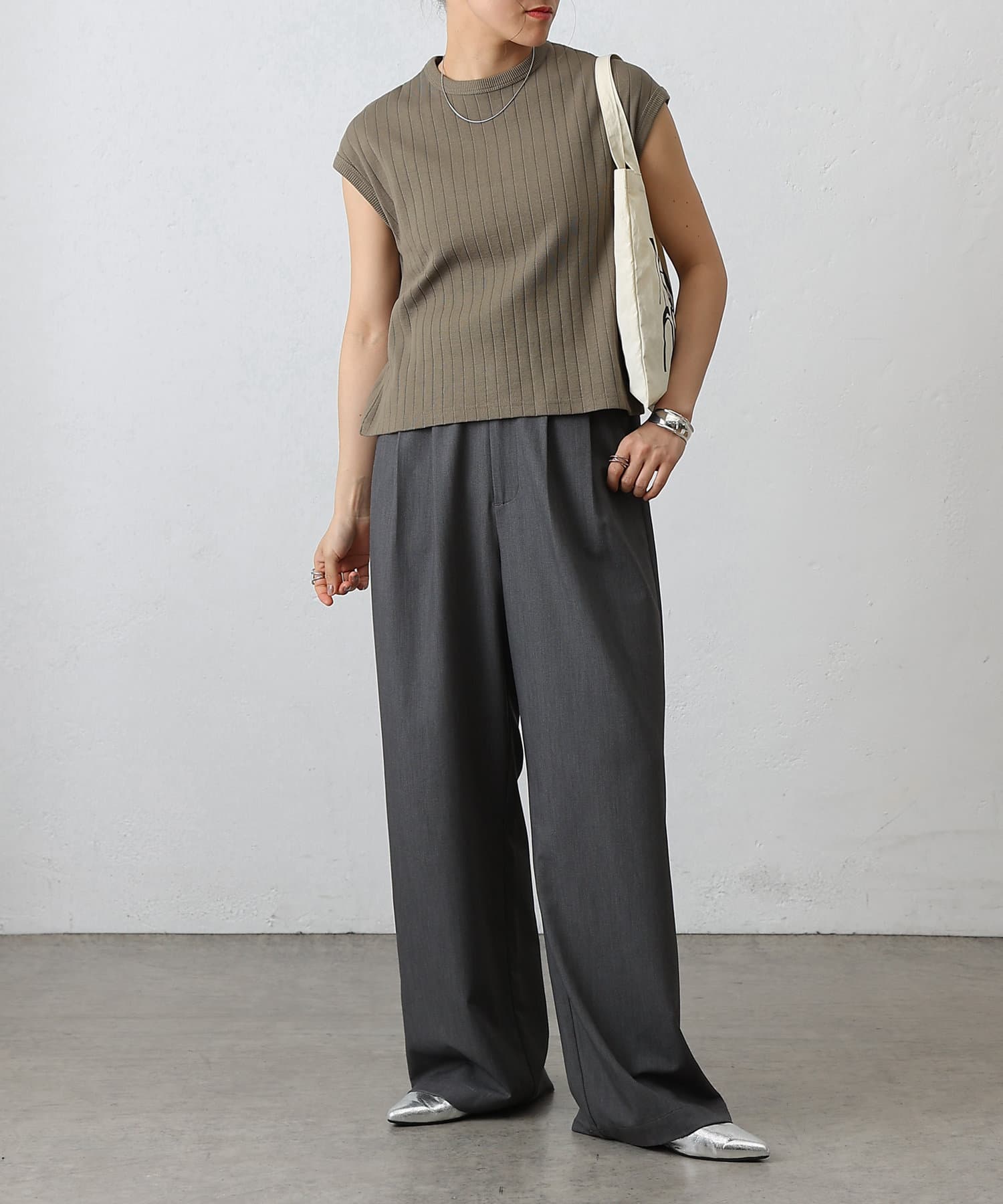 またワイドリブで立体的な素材なので、体のラインを拾いにくくすっきりとみせてくれます。