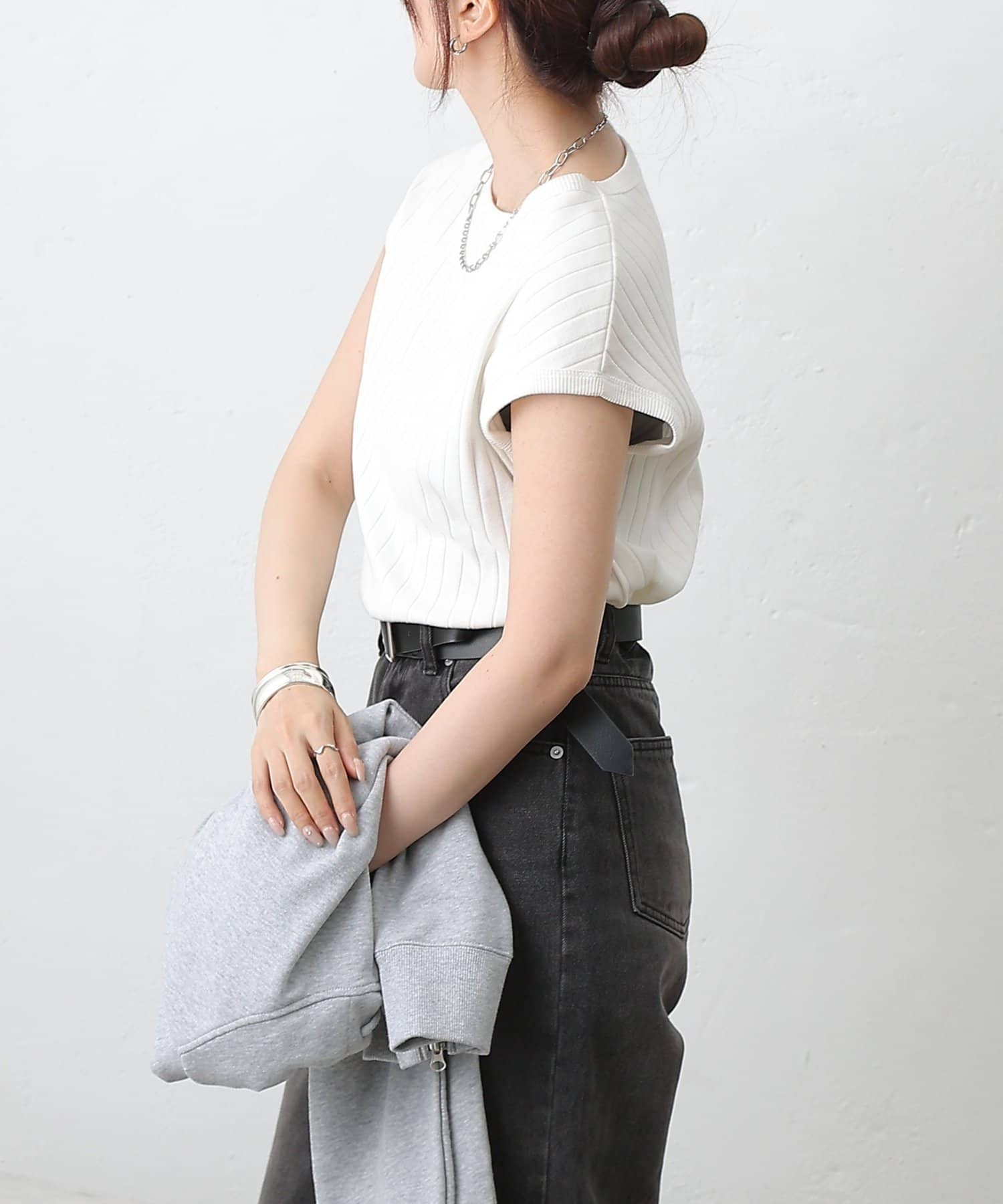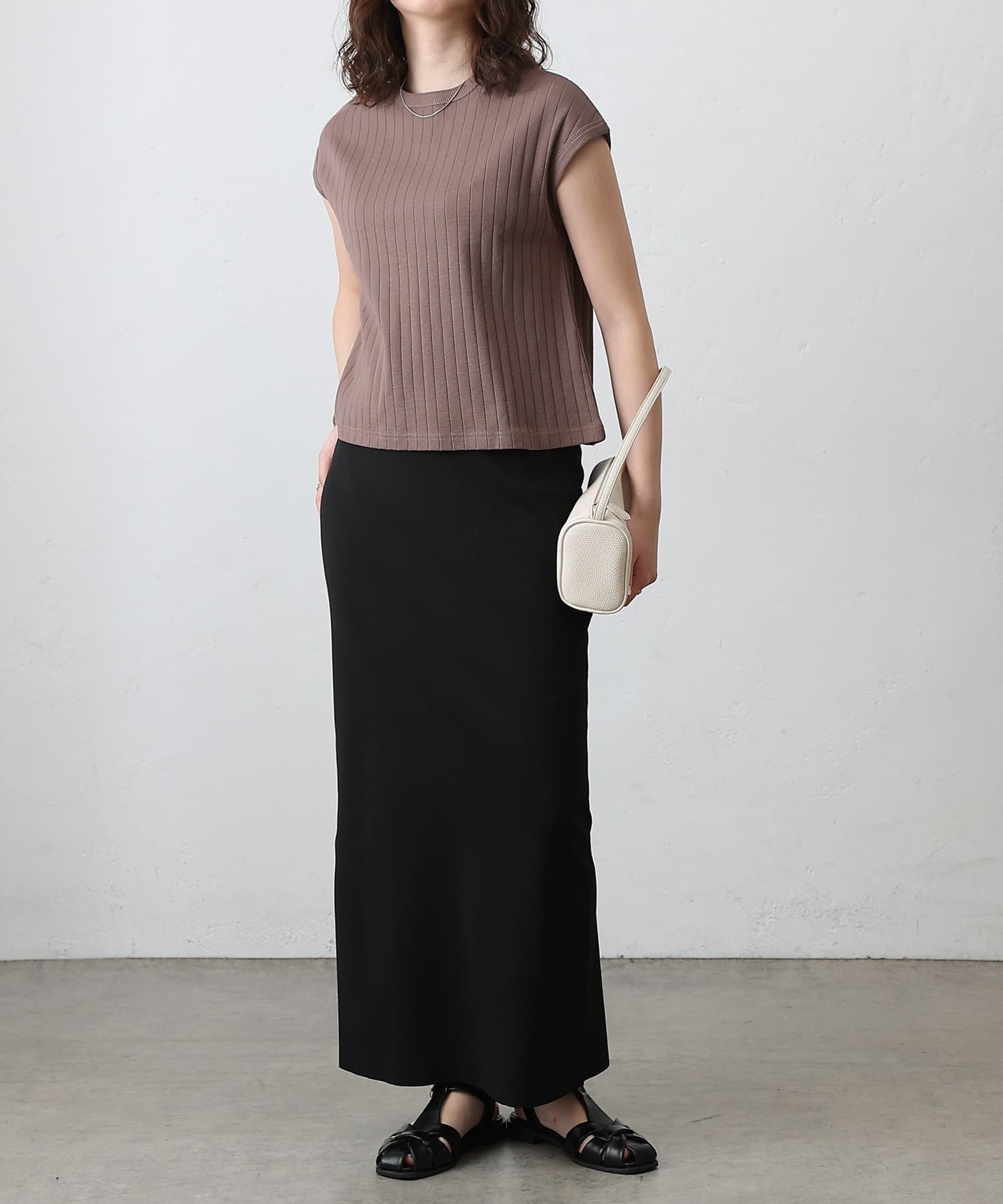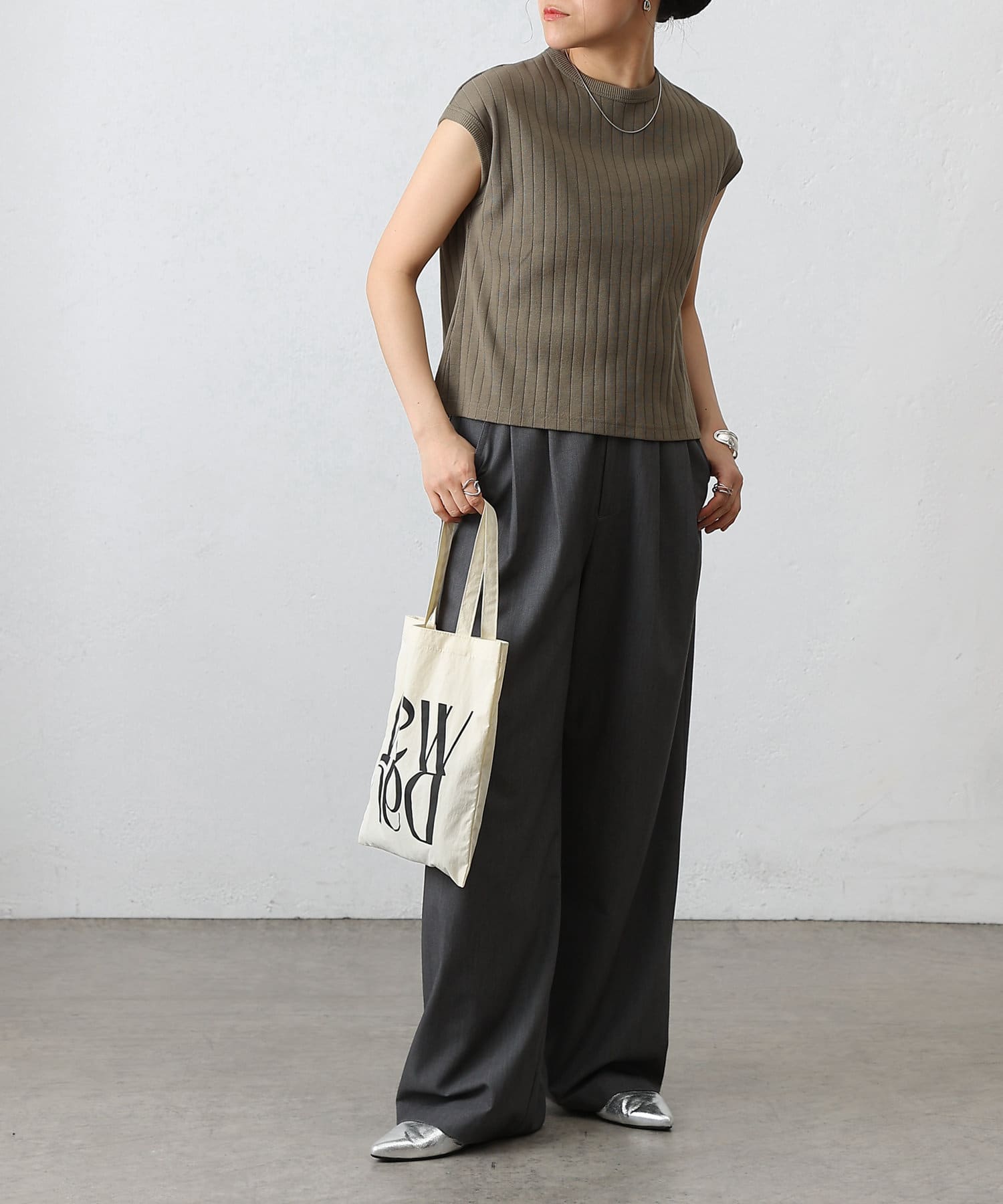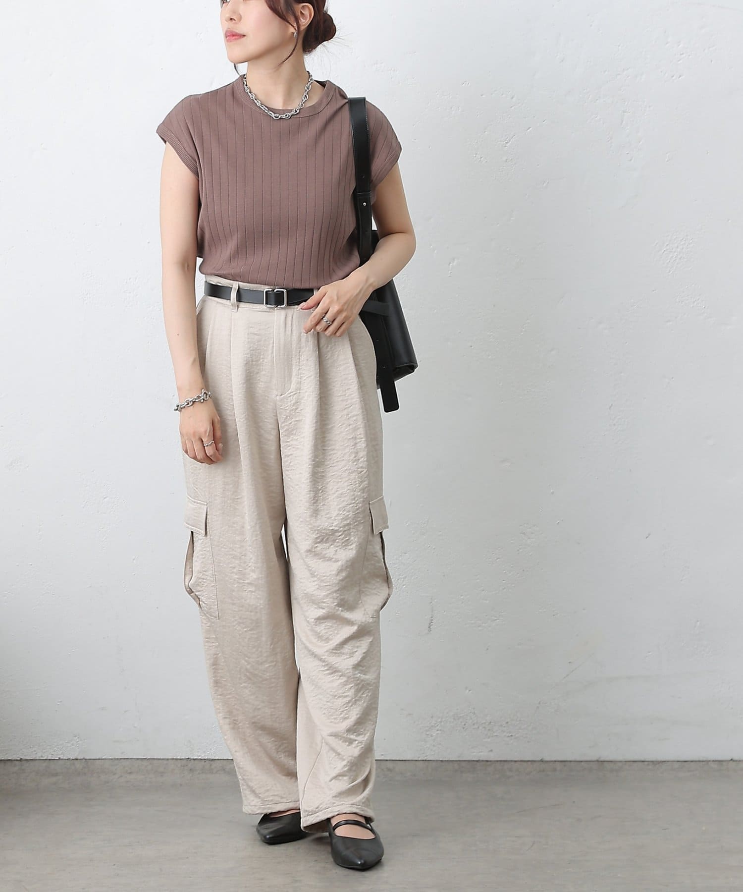 またワイドリブで立体的な素材なので、体のラインを拾いにくくすっきりとみせてくれます。