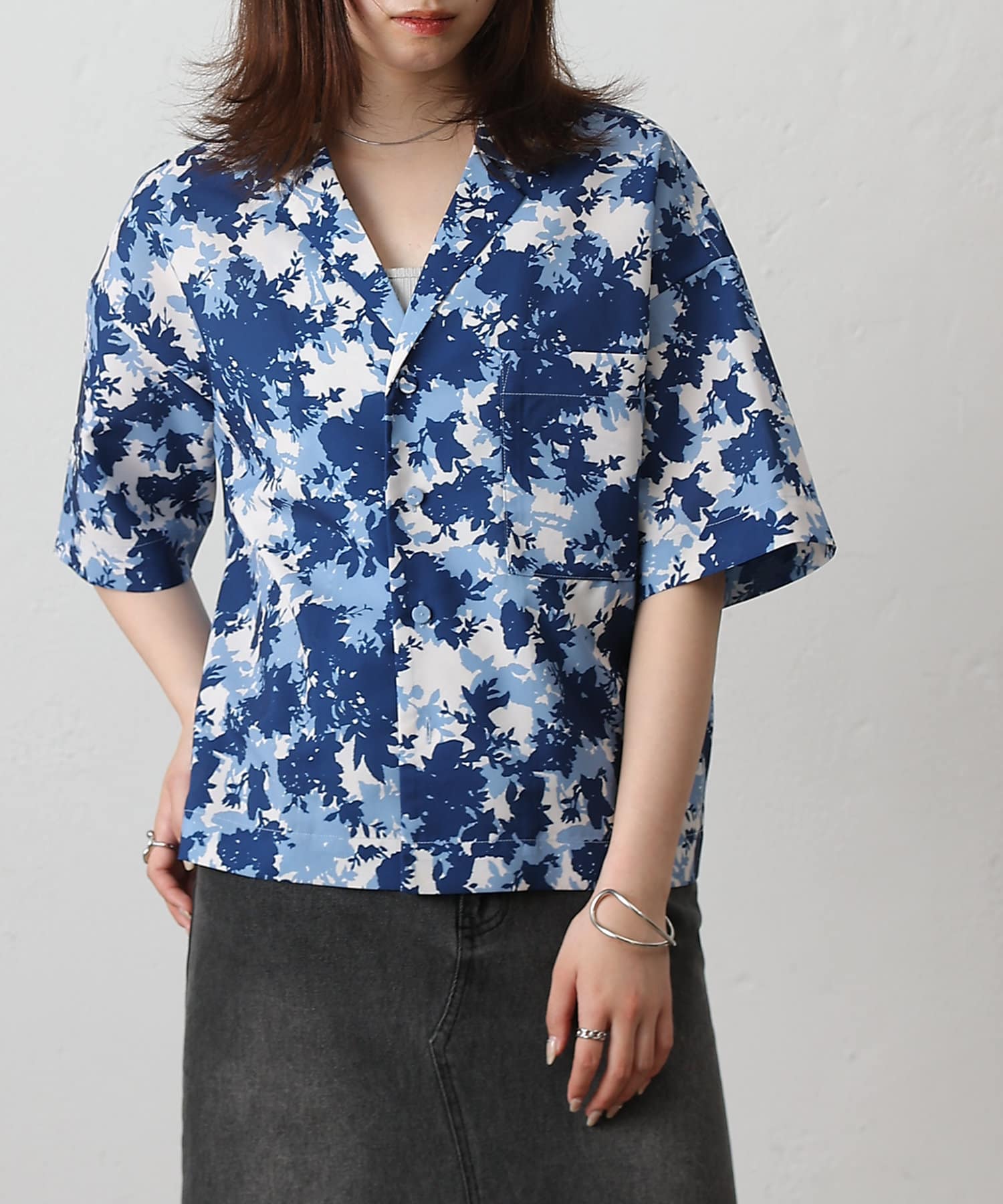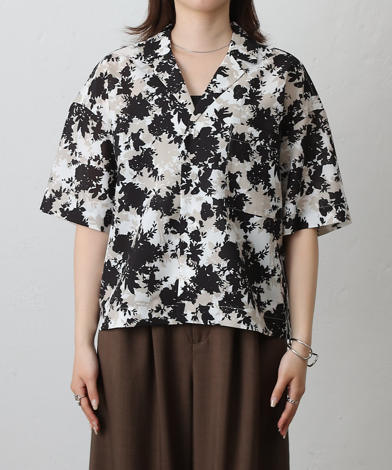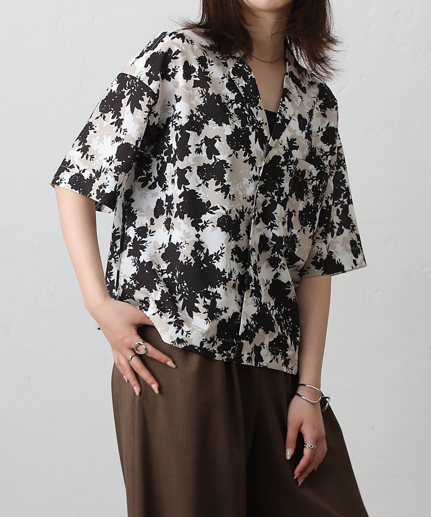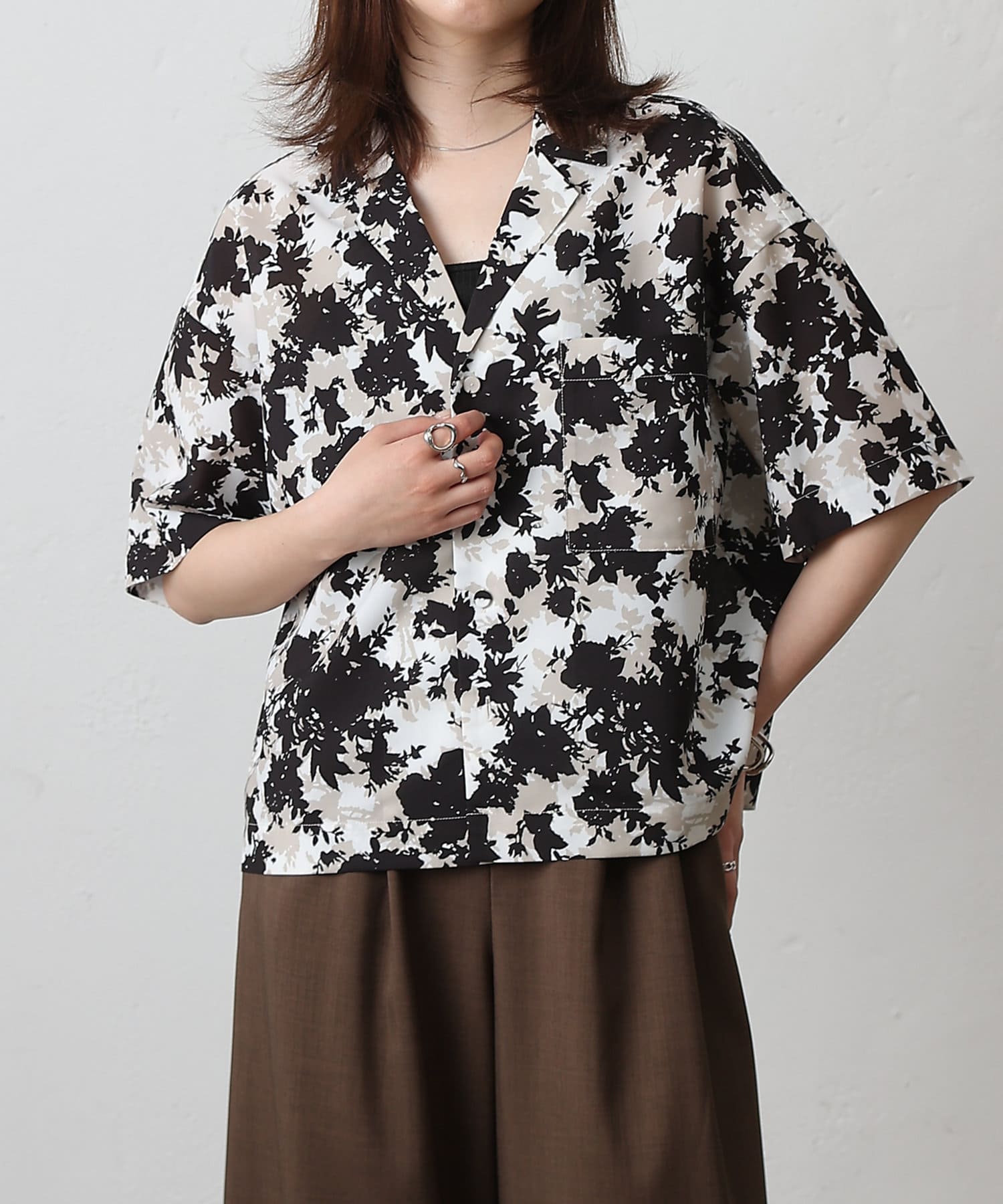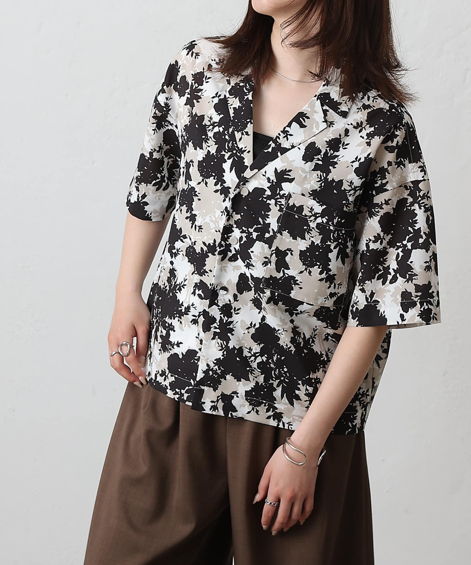 【華やかなボタニカル柄が目を惹く半袖開襟シャツ】