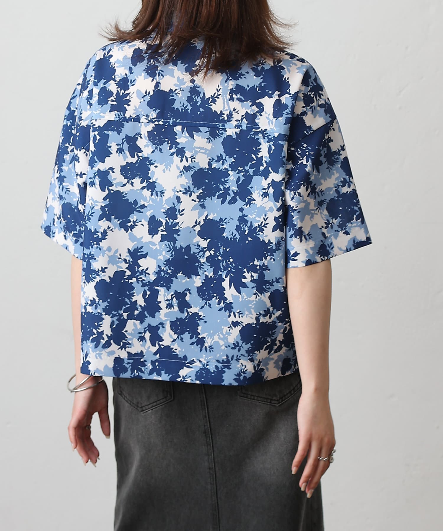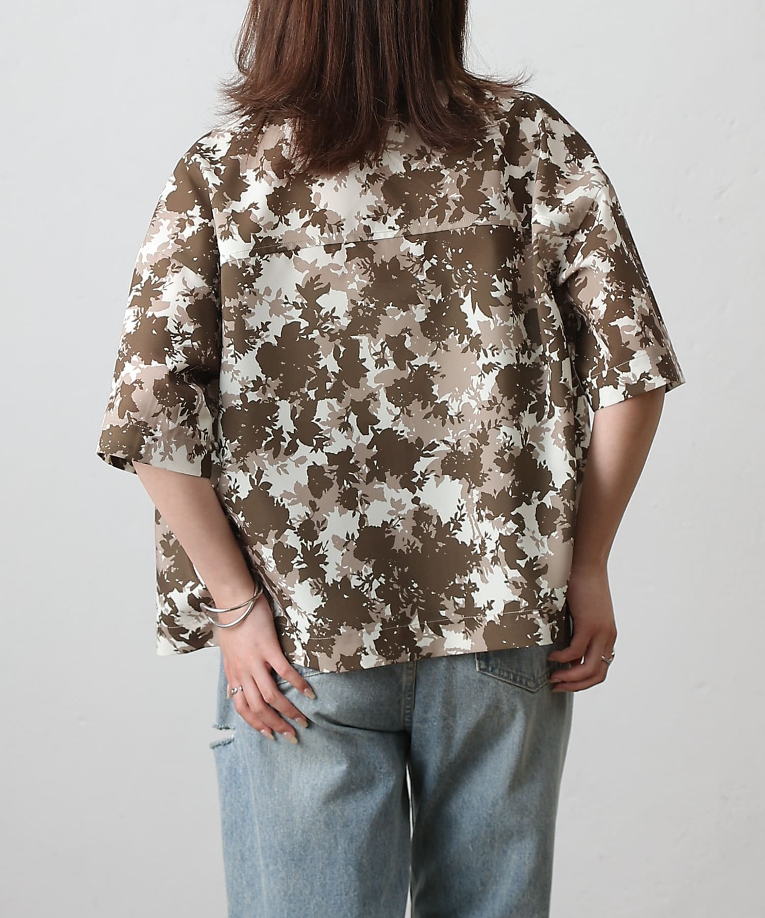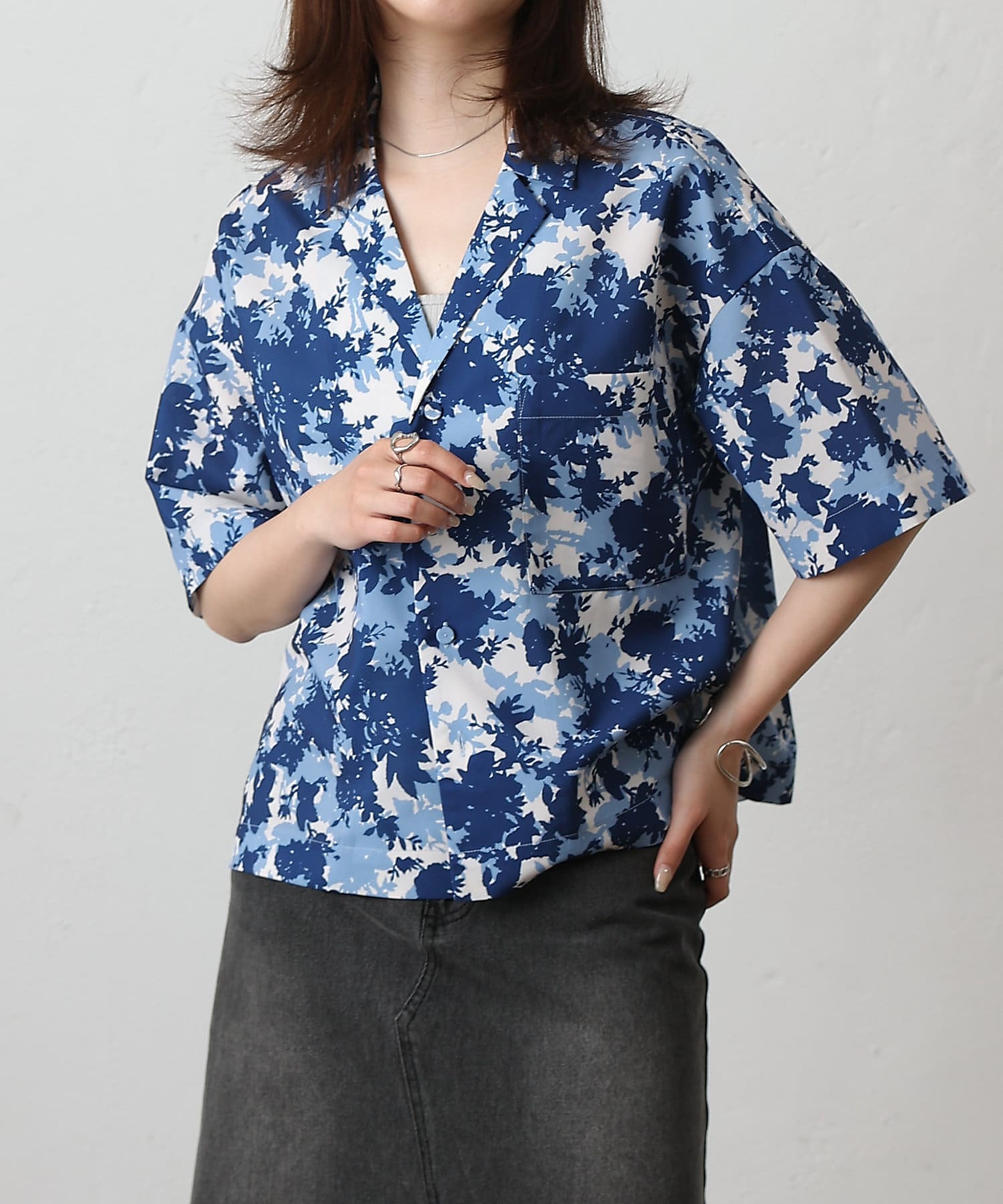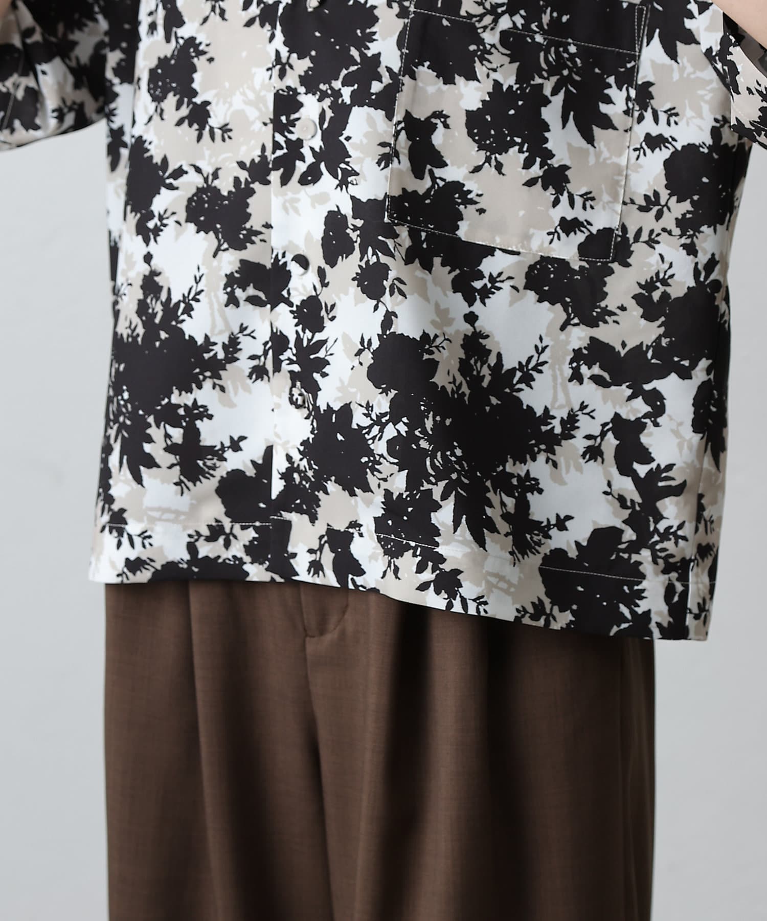 華やかなボタニカル柄プリントがコーディネートの主役になる半袖シャツ。
