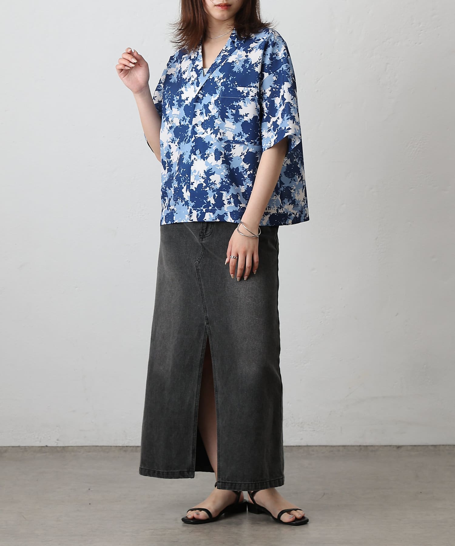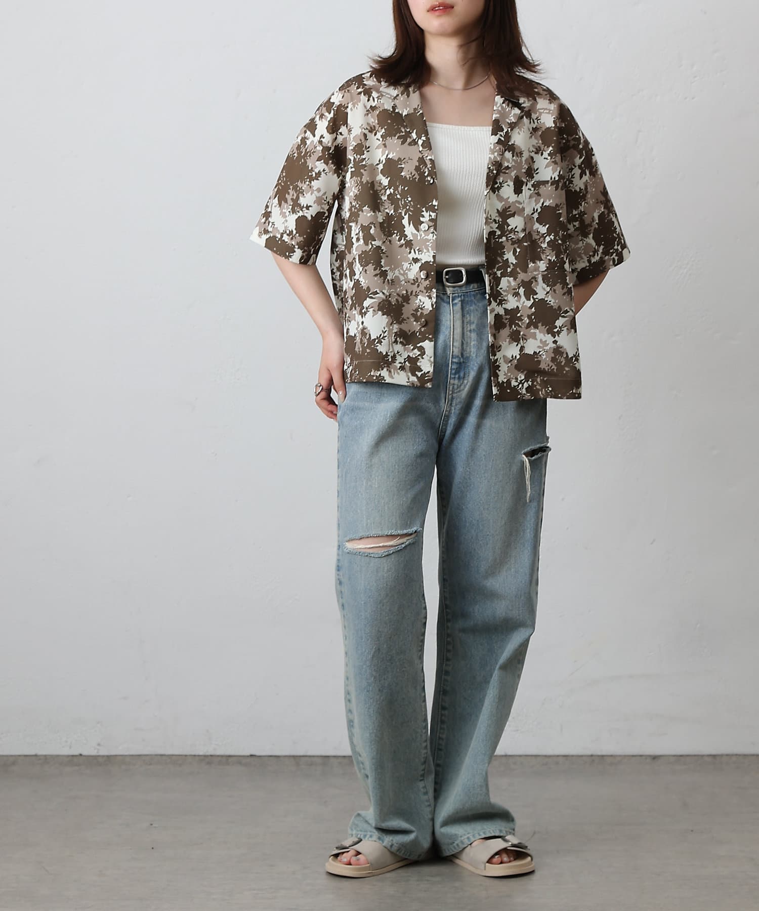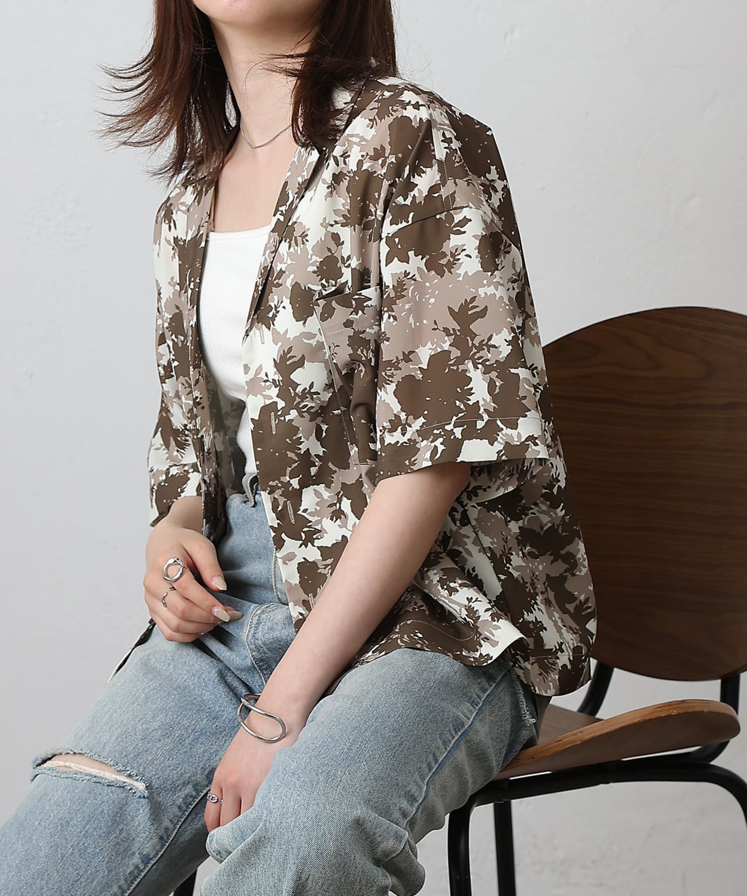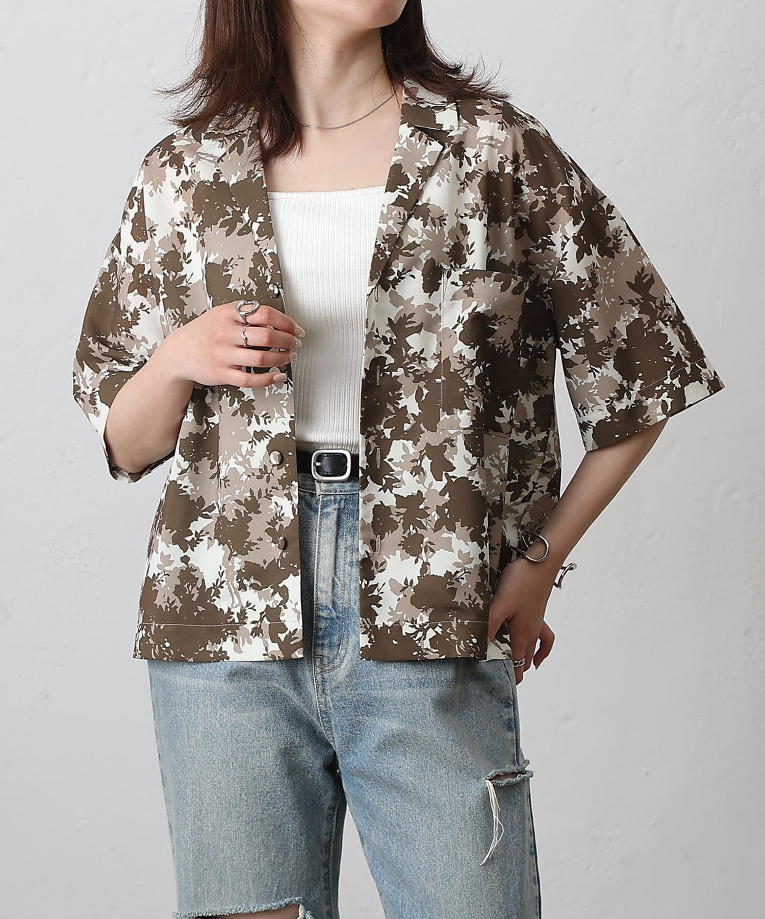 華やかなボタニカル柄プリントがコーディネートの主役になる半袖シャツ。