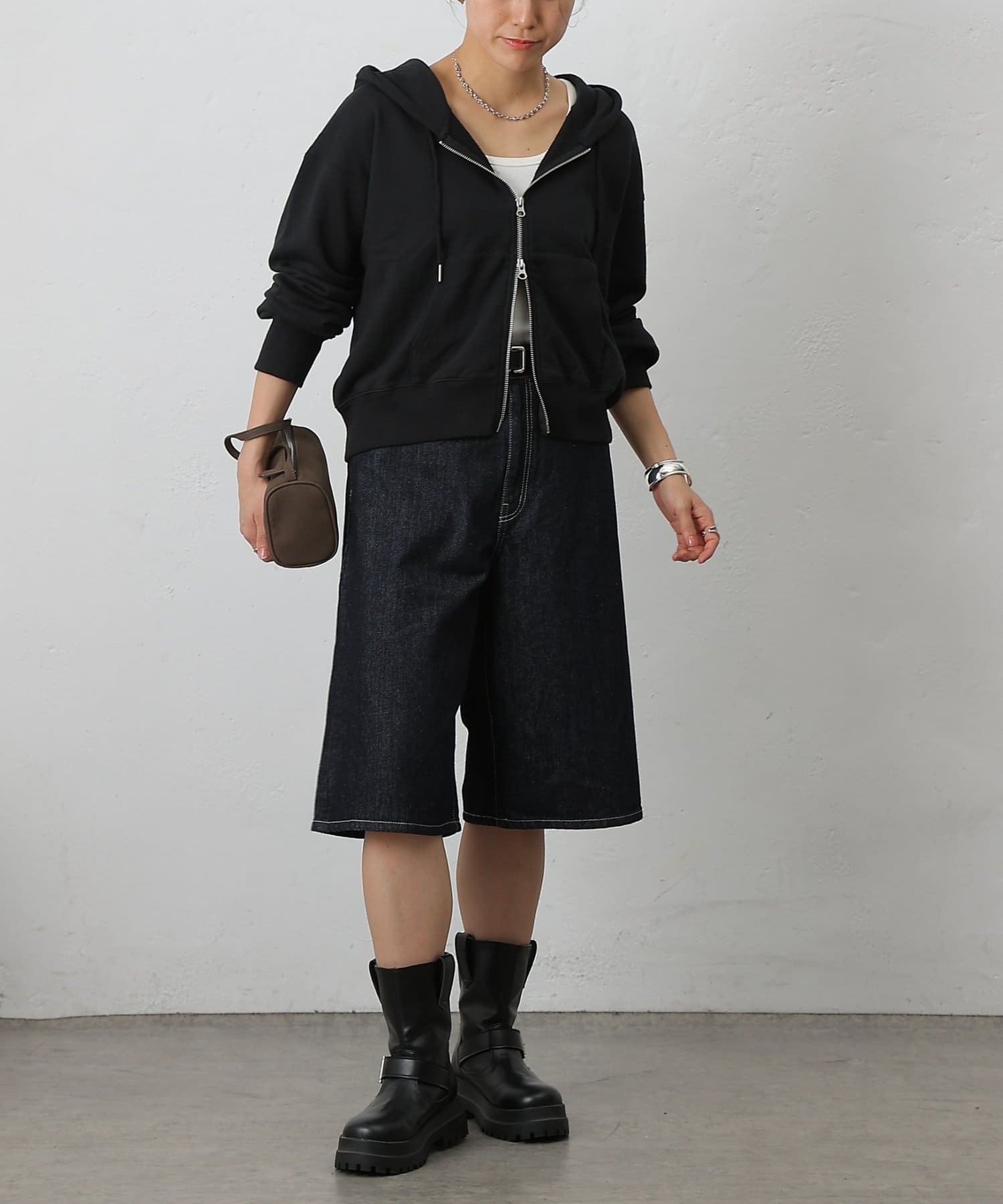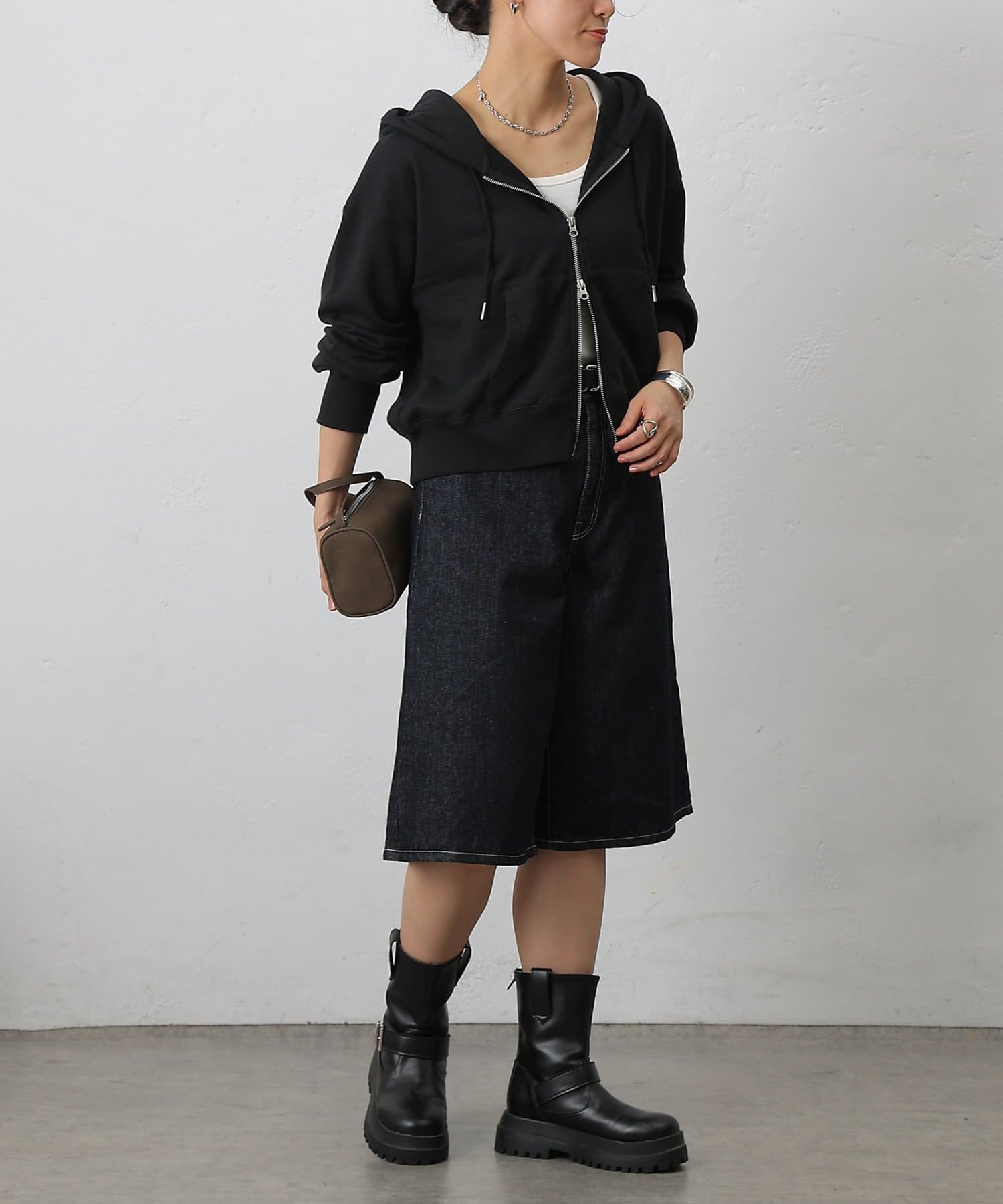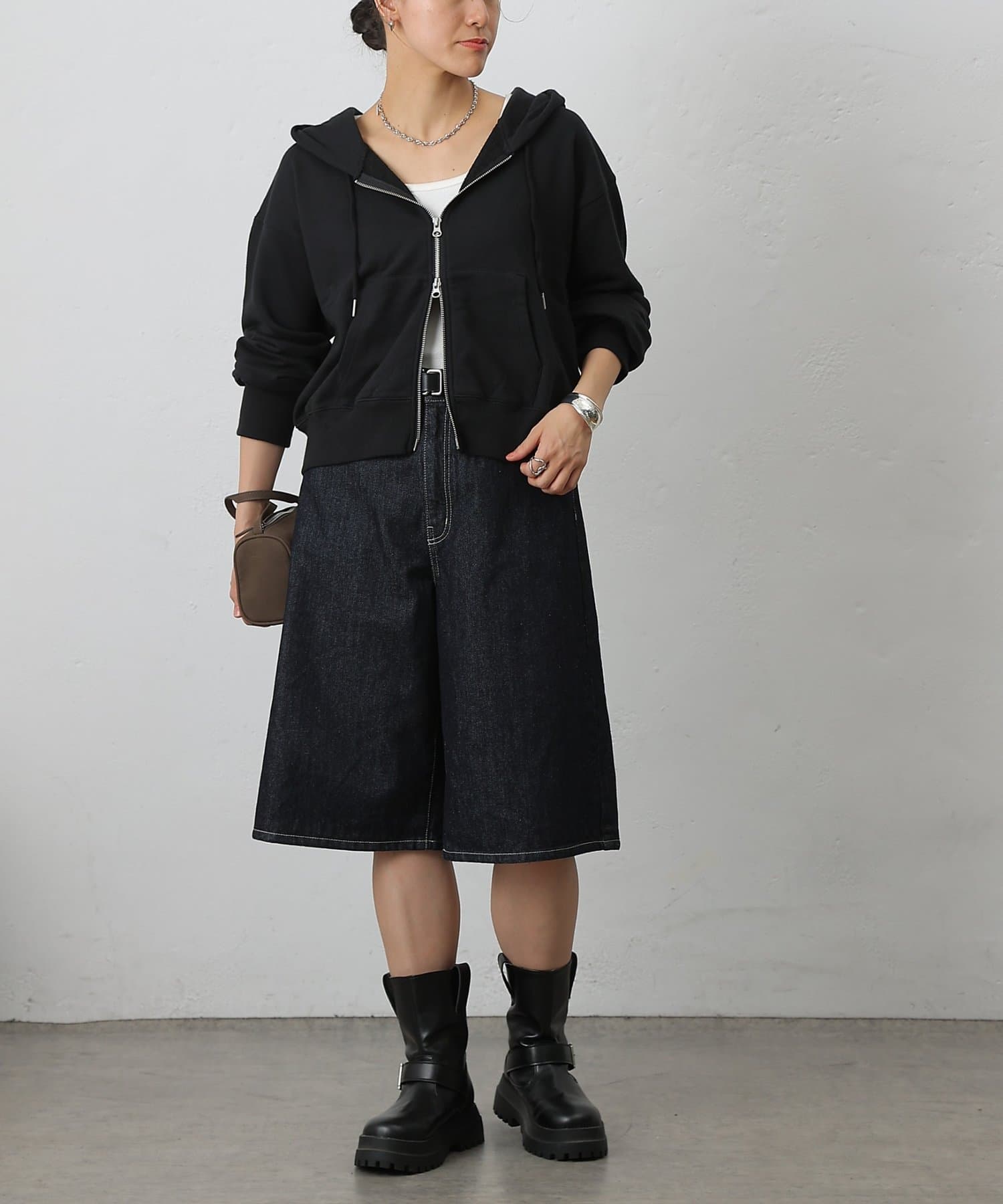 スリット感覚で下ジップを開ければ、抜け感のあるこなれた印象に仕上がる、シルエットやディテールにこだわった一枚です。