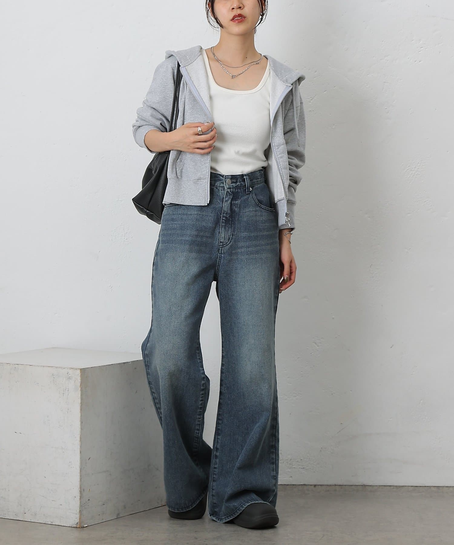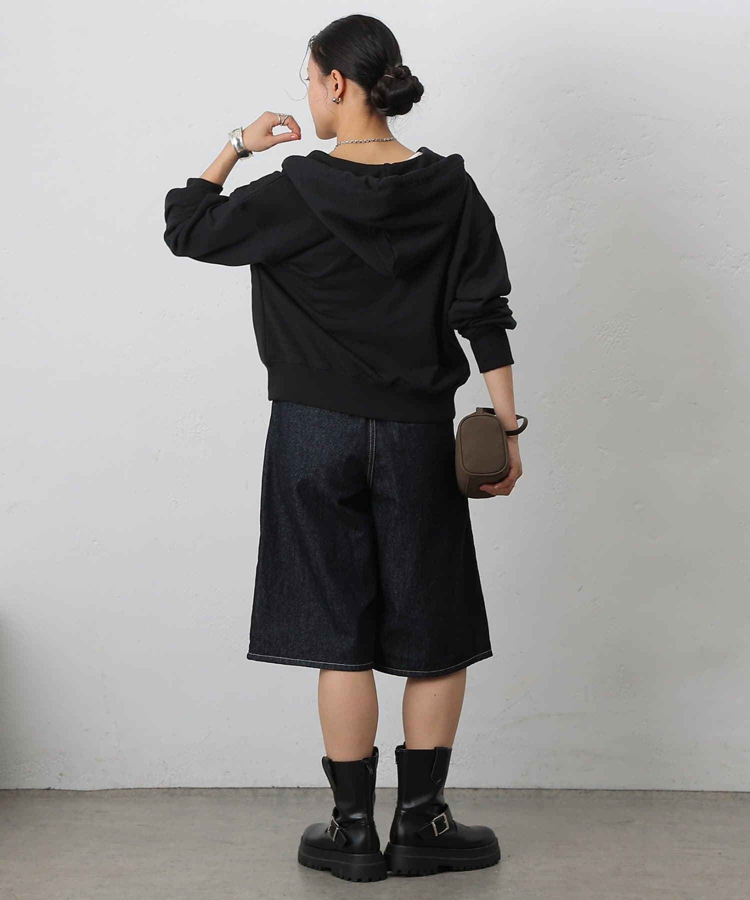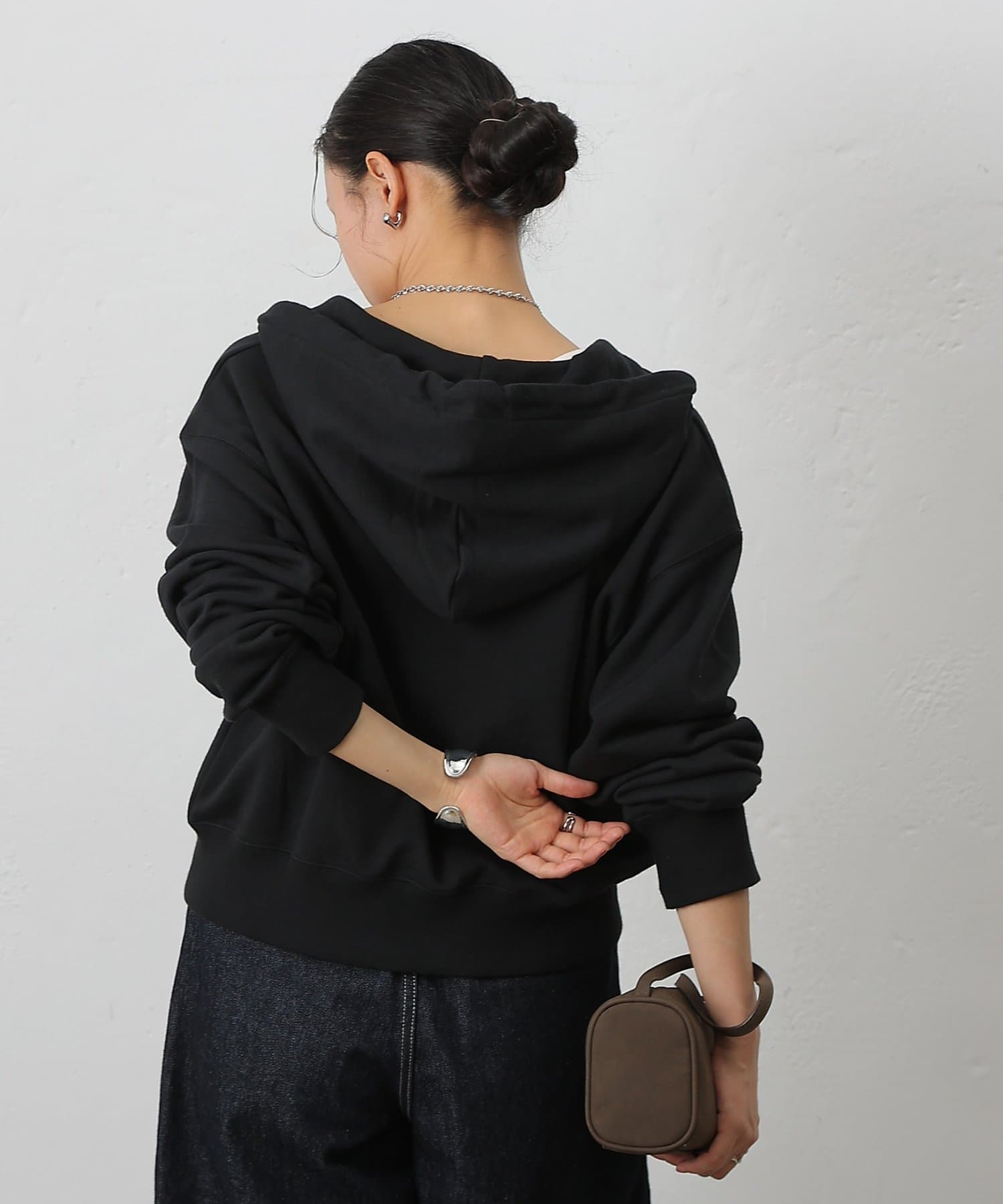スリット感覚で下ジップを開ければ、抜け感のあるこなれた印象に仕上がる、シルエットやディテールにこだわった一枚です。
