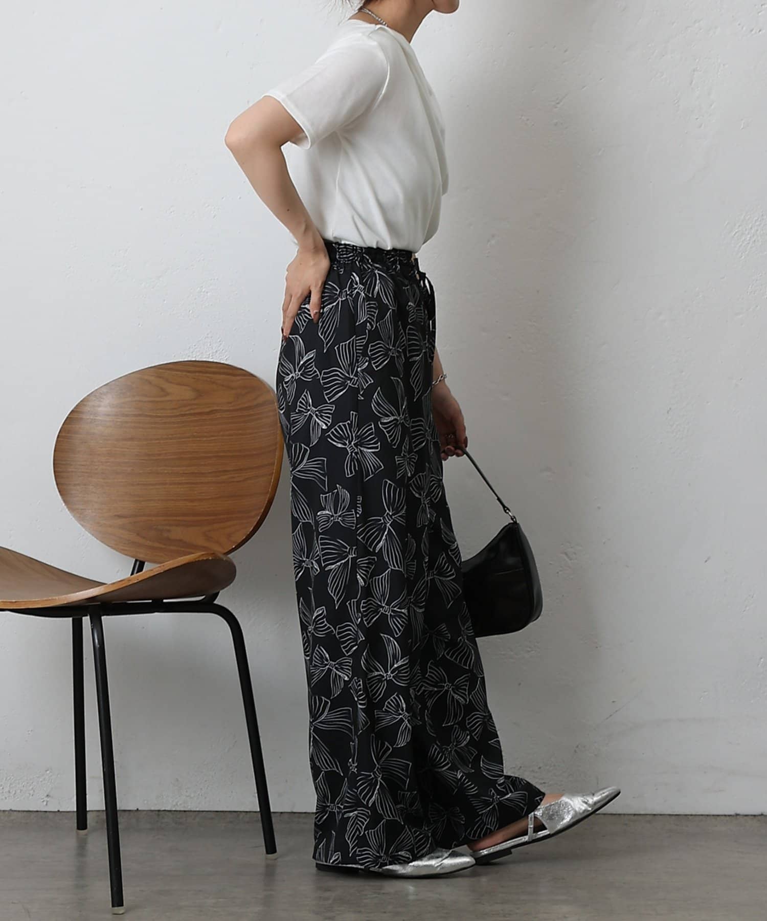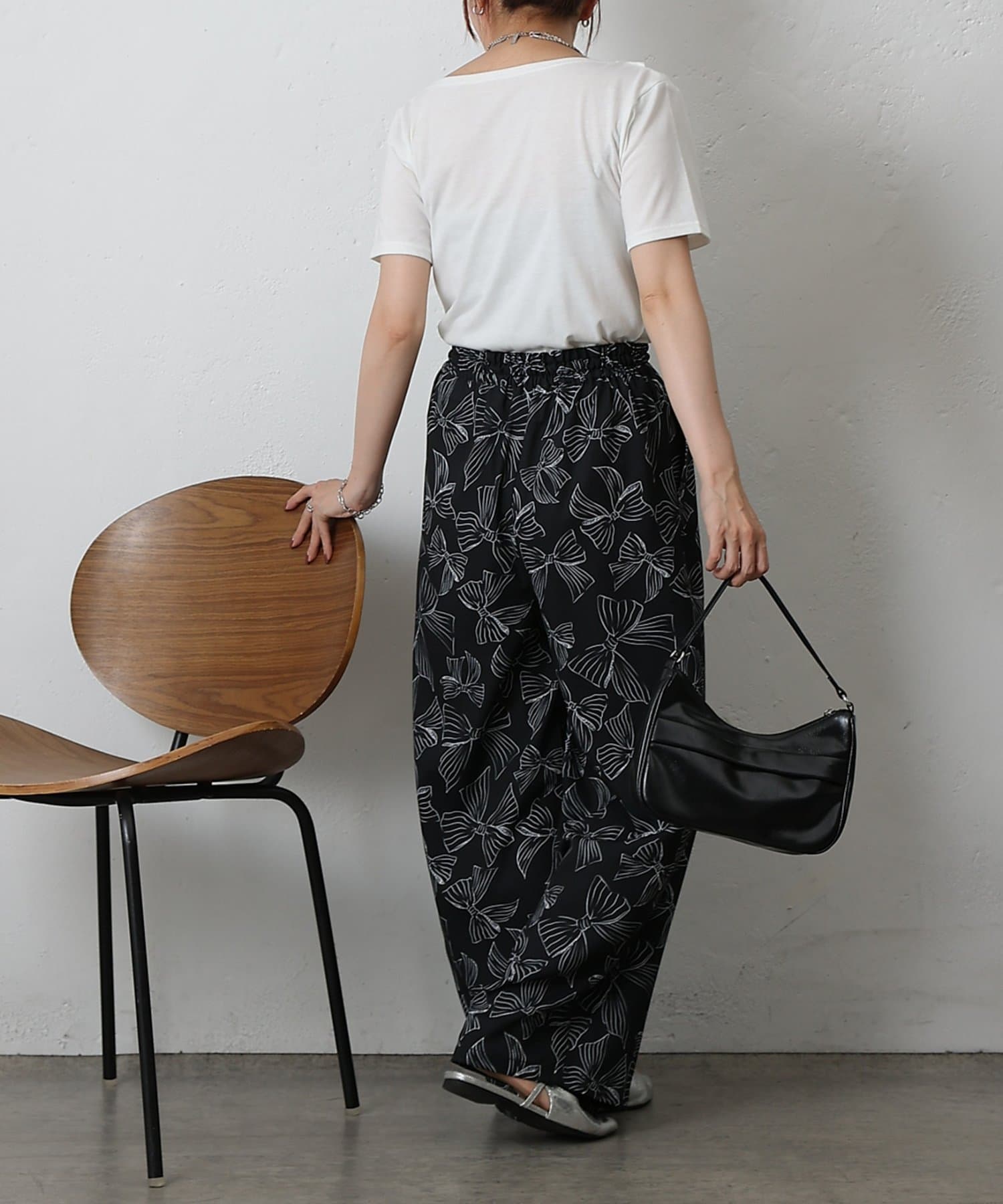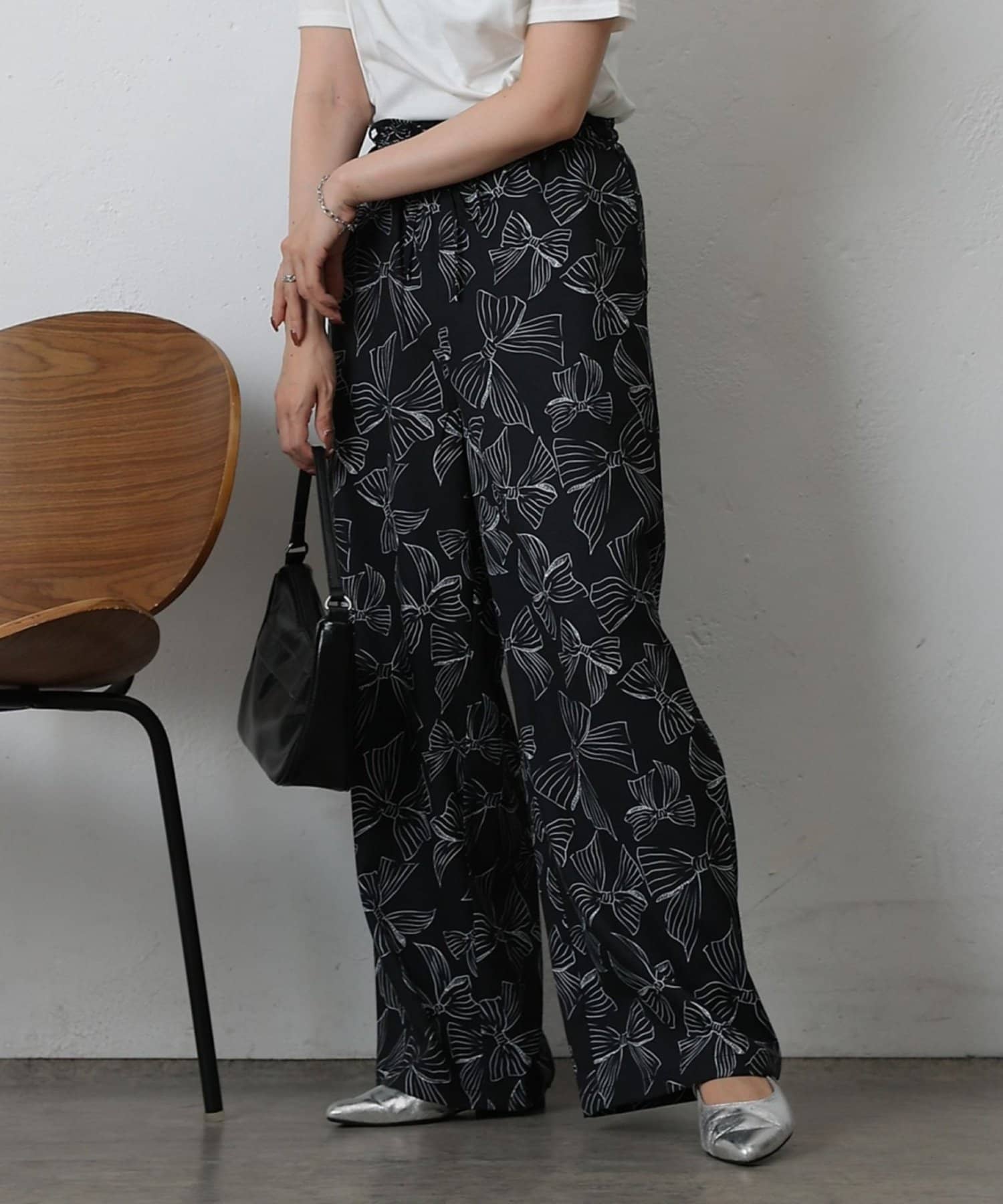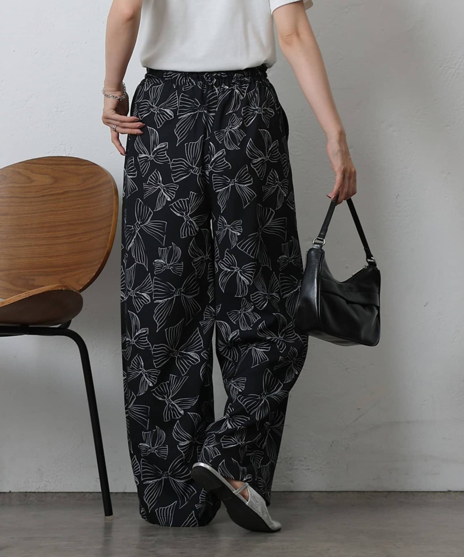 コーディネートに1点プラスするだけで、トレンド感をグッとアップデートしてくれるリボン柄イージーパンツが登場。シンプルなラインで描かれたリボン柄が散りばめられたデザインは、甘すぎない大人の遊び心を感じさせ、カジュアルながらも上品な印象を与えます。カジュアルなTシャツからきれいめなブラウスまで、どんなトップスとも相性抜群です。程よい抜け感で、こなれた雰囲気を演出できるのも嬉しいポイント◎ウエストゴム仕様で、ストレスフリーな着心地。おうちでのリラックスタイムから、ちょっとしたお出かけまで、様々なシーンで活躍します。 程よいワイドシルエットと、大きめのリボン柄が気になる体型をさりげなくカバーするので、スタイルアップ効果も期待できます。シンプルなトップスと合わせるだけで、遊び心のある印象的なスタイリングが完成する1着。