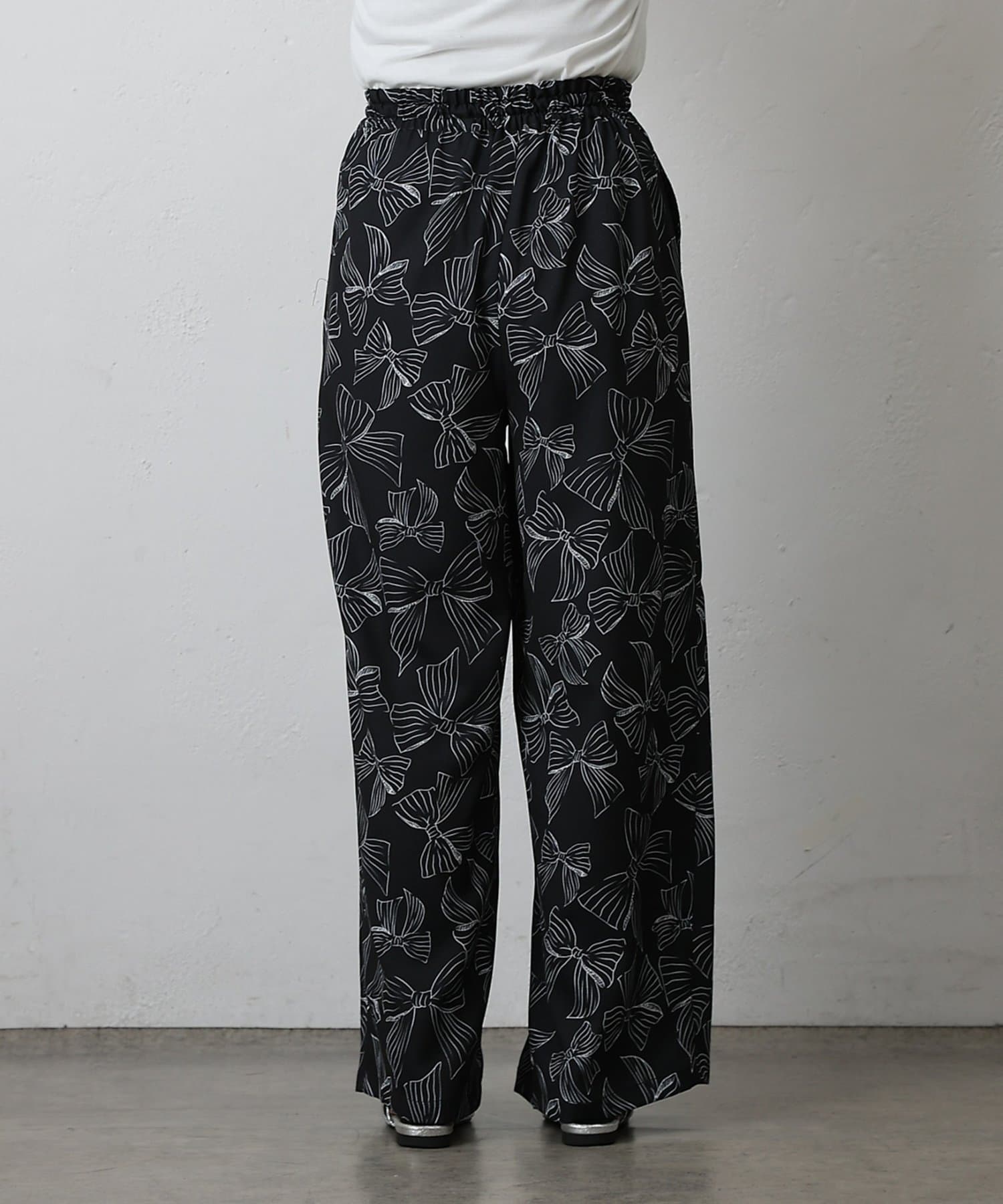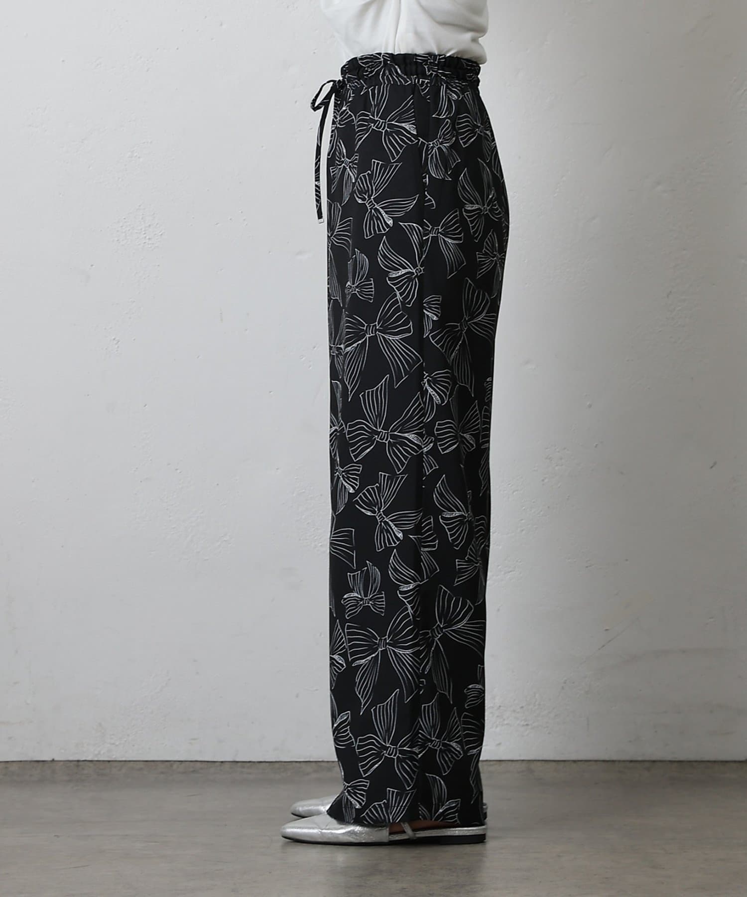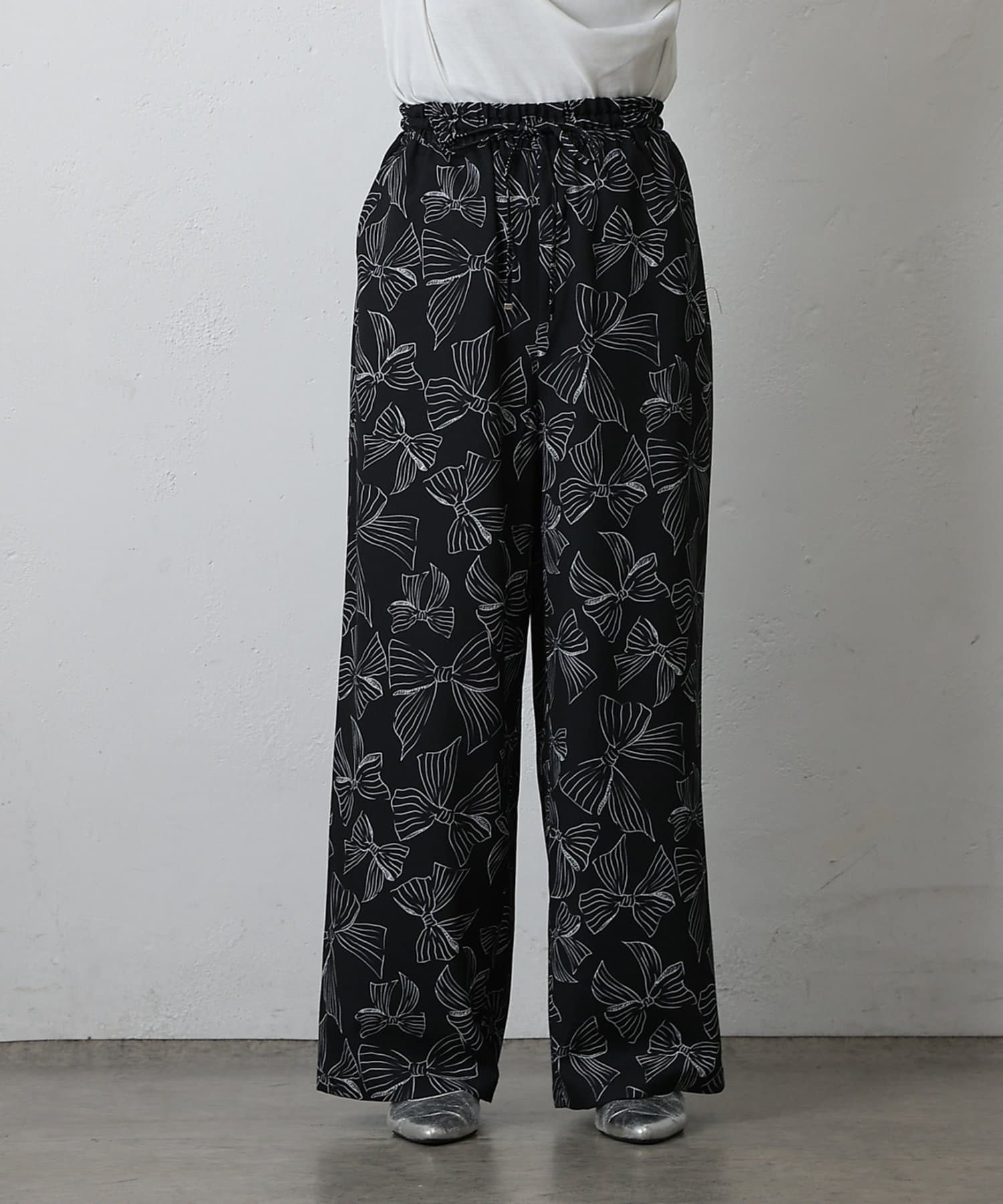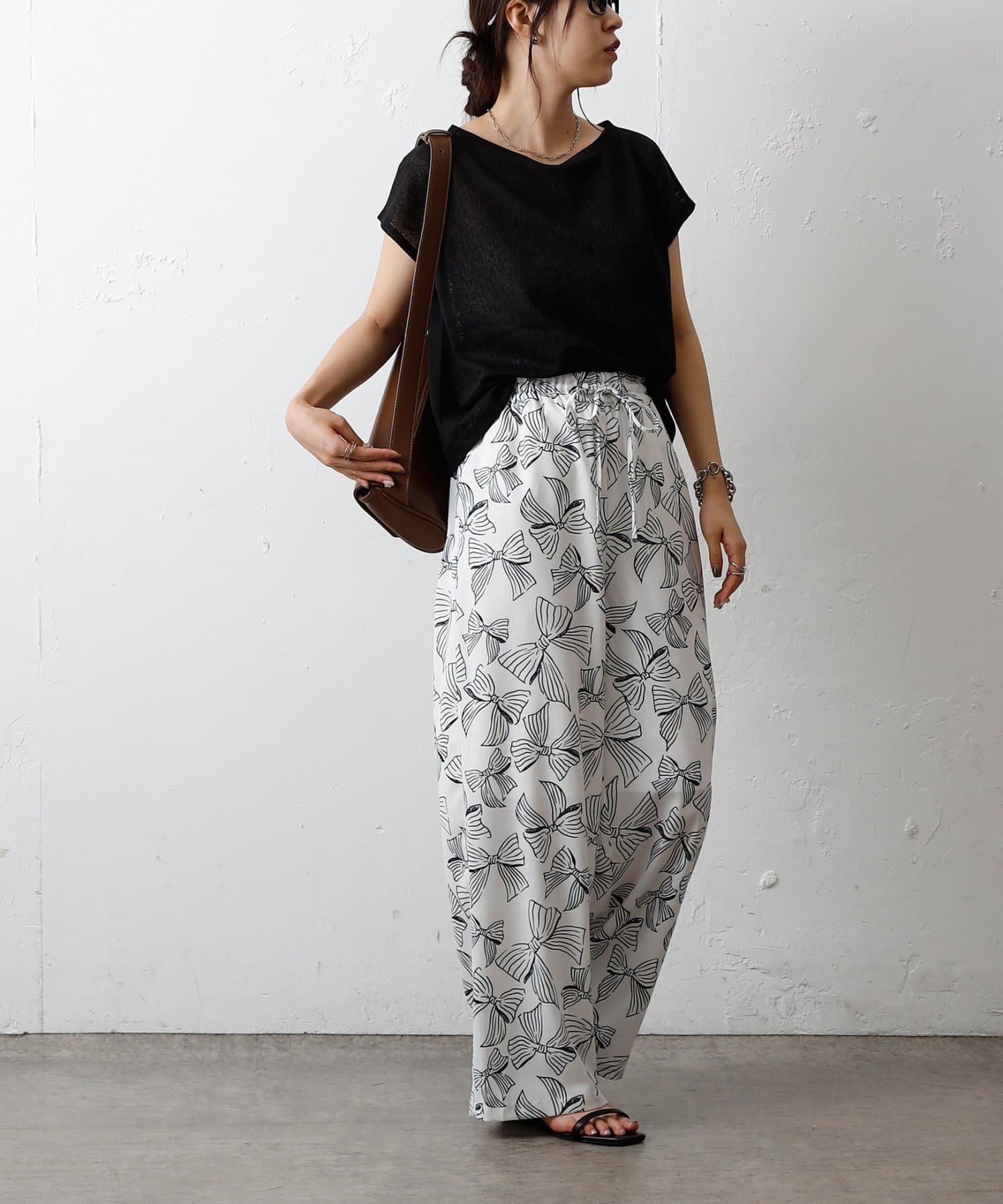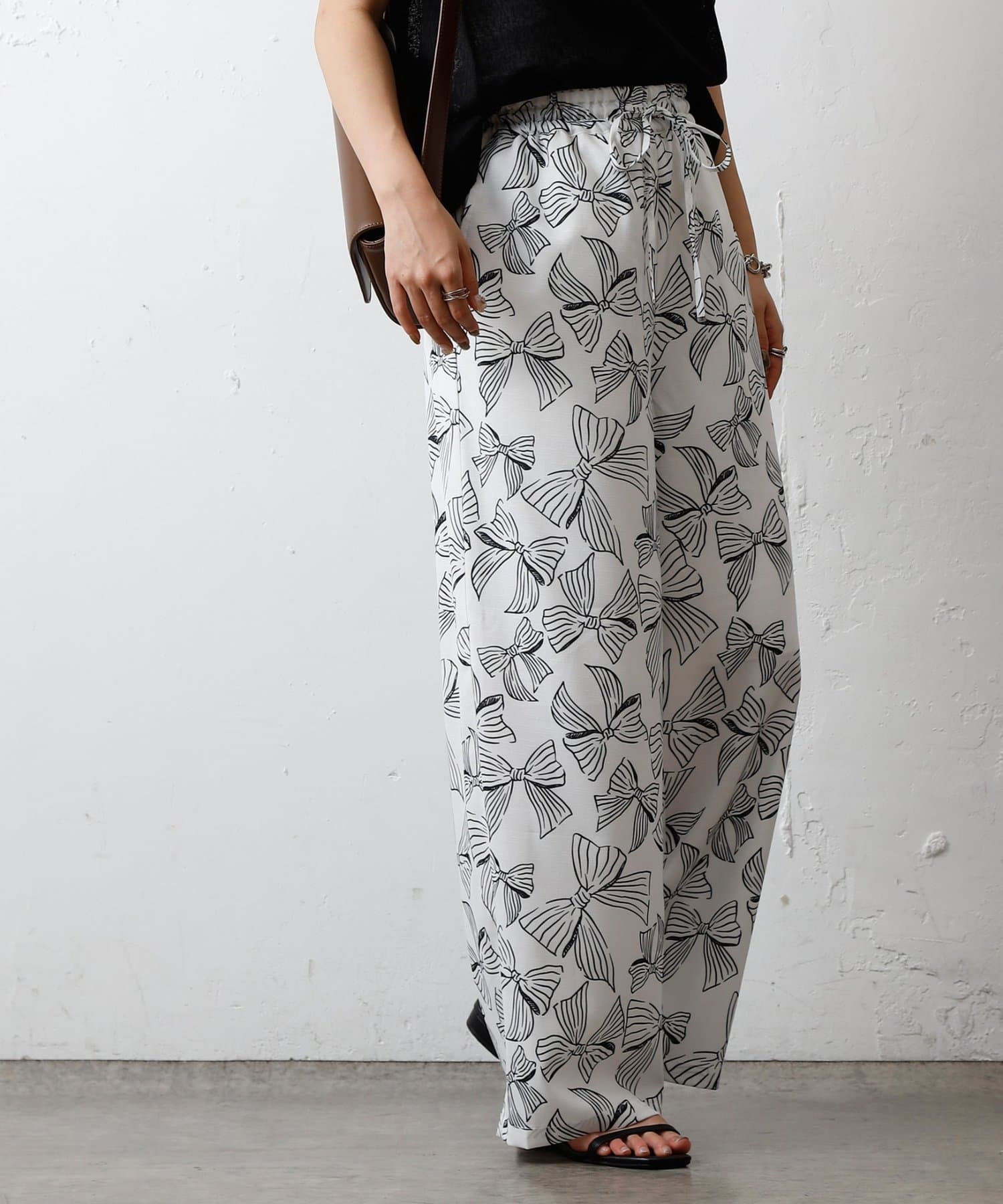 コーディネートに1点プラスするだけで、トレンド感をグッとアップデートしてくれるリボン柄イージーパンツが登場。シンプルなラインで描かれたリボン柄が散りばめられたデザインは、甘すぎない大人の遊び心を感じさせ、カジュアルながらも上品な印象を与えます。カジュアルなTシャツからきれいめなブラウスまで、どんなトップスとも相性抜群です。程よい抜け感で、こなれた雰囲気を演出できるのも嬉しいポイント◎ウエストゴム仕様で、ストレスフリーな着心地。おうちでのリラックスタイムから、ちょっとしたお出かけまで、様々なシーンで活躍します。 程よいワイドシルエットと、大きめのリボン柄が気になる体型をさりげなくカバーするので、スタイルアップ効果も期待できます。シンプルなトップスと合わせるだけで、遊び心のある印象的なスタイリングが完成する1着。
