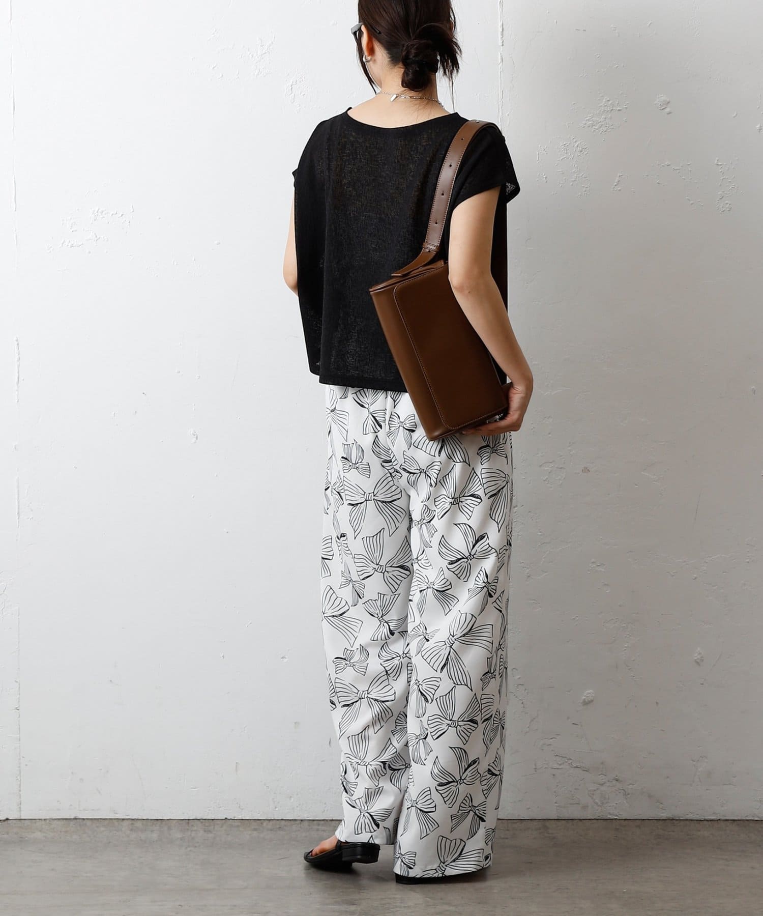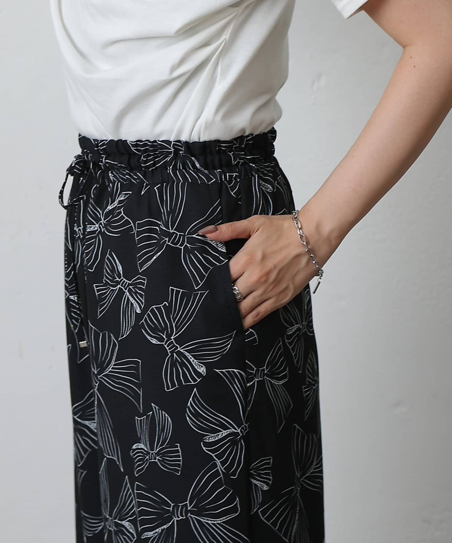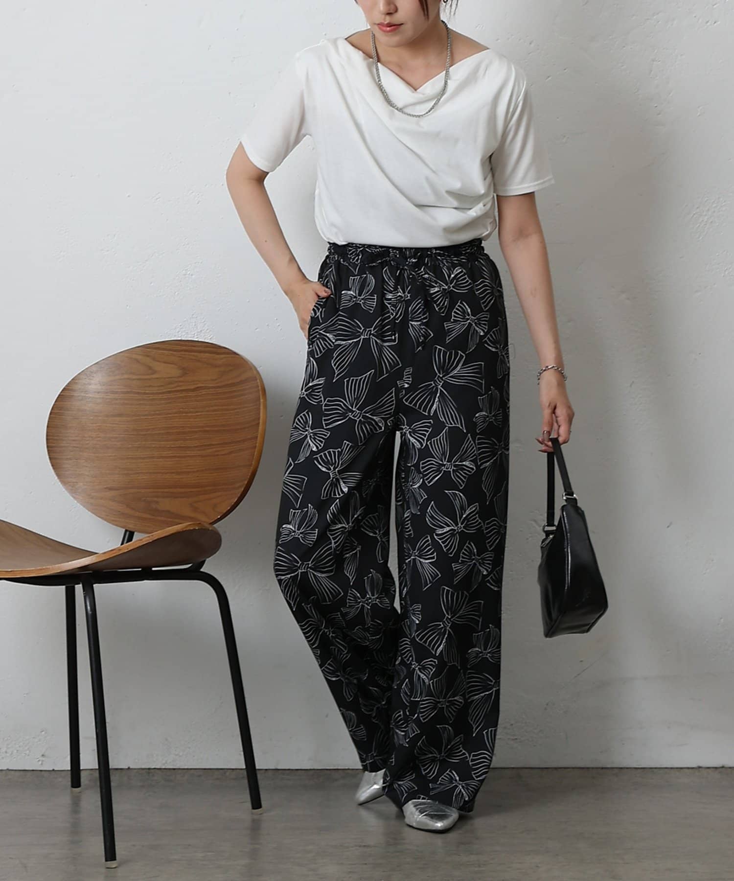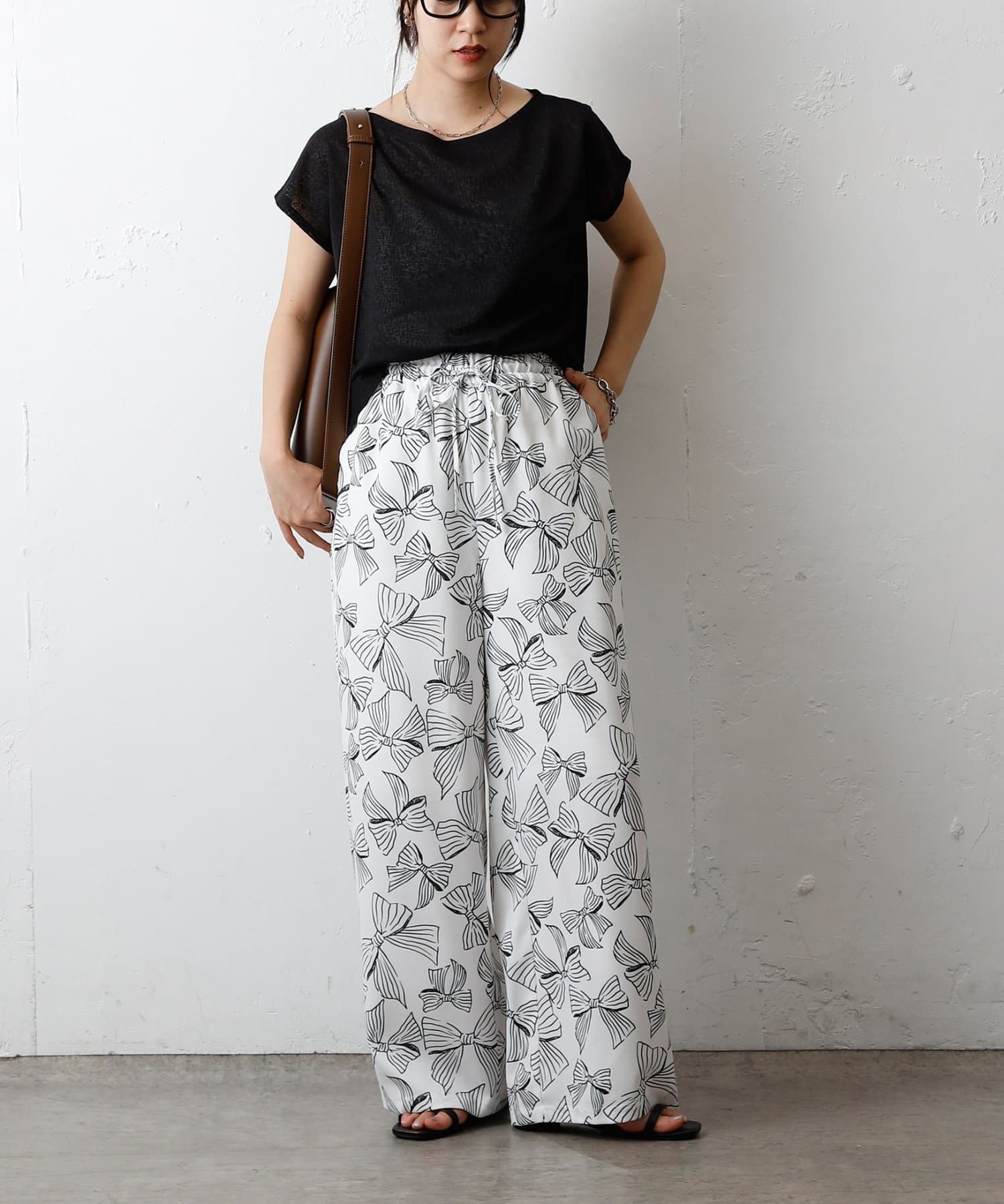 コーディネートに1点プラスするだけで、トレンド感をグッとアップデートしてくれるリボン柄イージーパンツが登場。シンプルなラインで描かれたリボン柄が散りばめられたデザインは、甘すぎない大人の遊び心を感じさせ、カジュアルながらも上品な印象を与えます。カジュアルなTシャツからきれいめなブラウスまで、どんなトップスとも相性抜群です。程よい抜け感で、こなれた雰囲気を演出できるのも嬉しいポイント◎ウエストゴム仕様で、ストレスフリーな着心地。おうちでのリラックスタイムから、ちょっとしたお出かけまで、様々なシーンで活躍します。 程よいワイドシルエットと、大きめのリボン柄が気になる体型をさりげなくカバーするので、スタイルアップ効果も期待できます。シンプルなトップスと合わせるだけで、遊び心のある印象的なスタイリングが完成する1着。