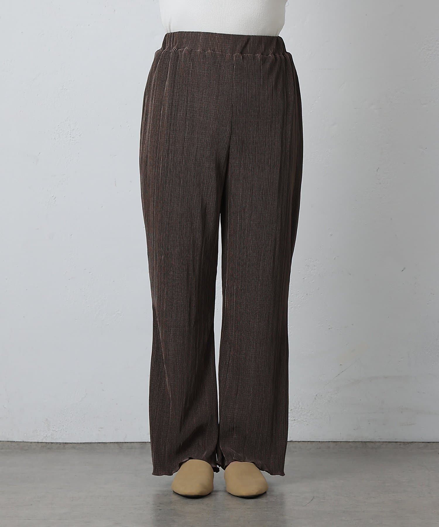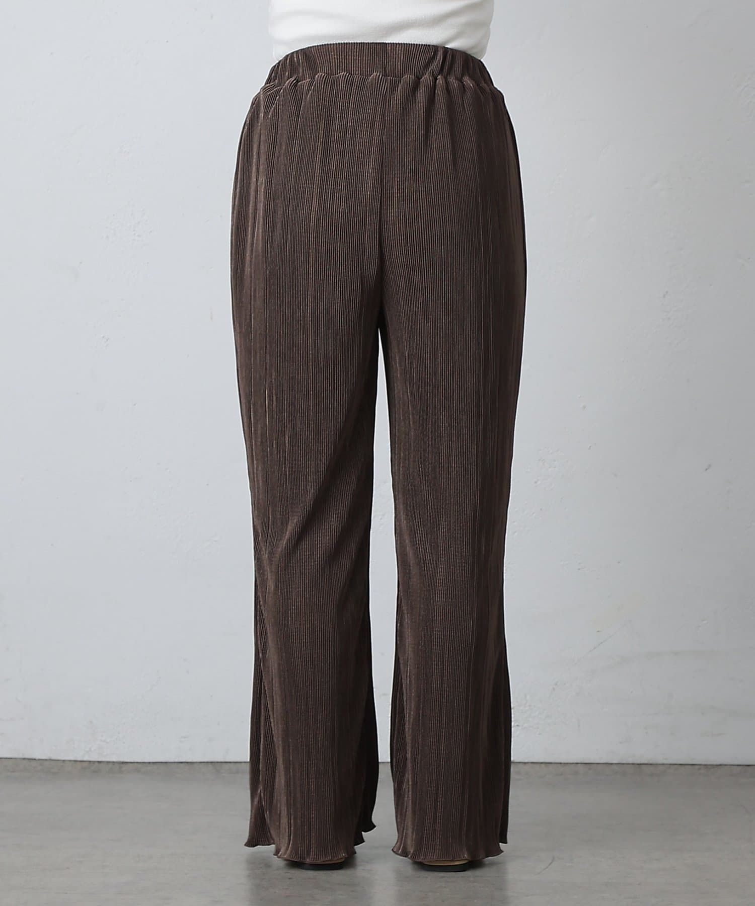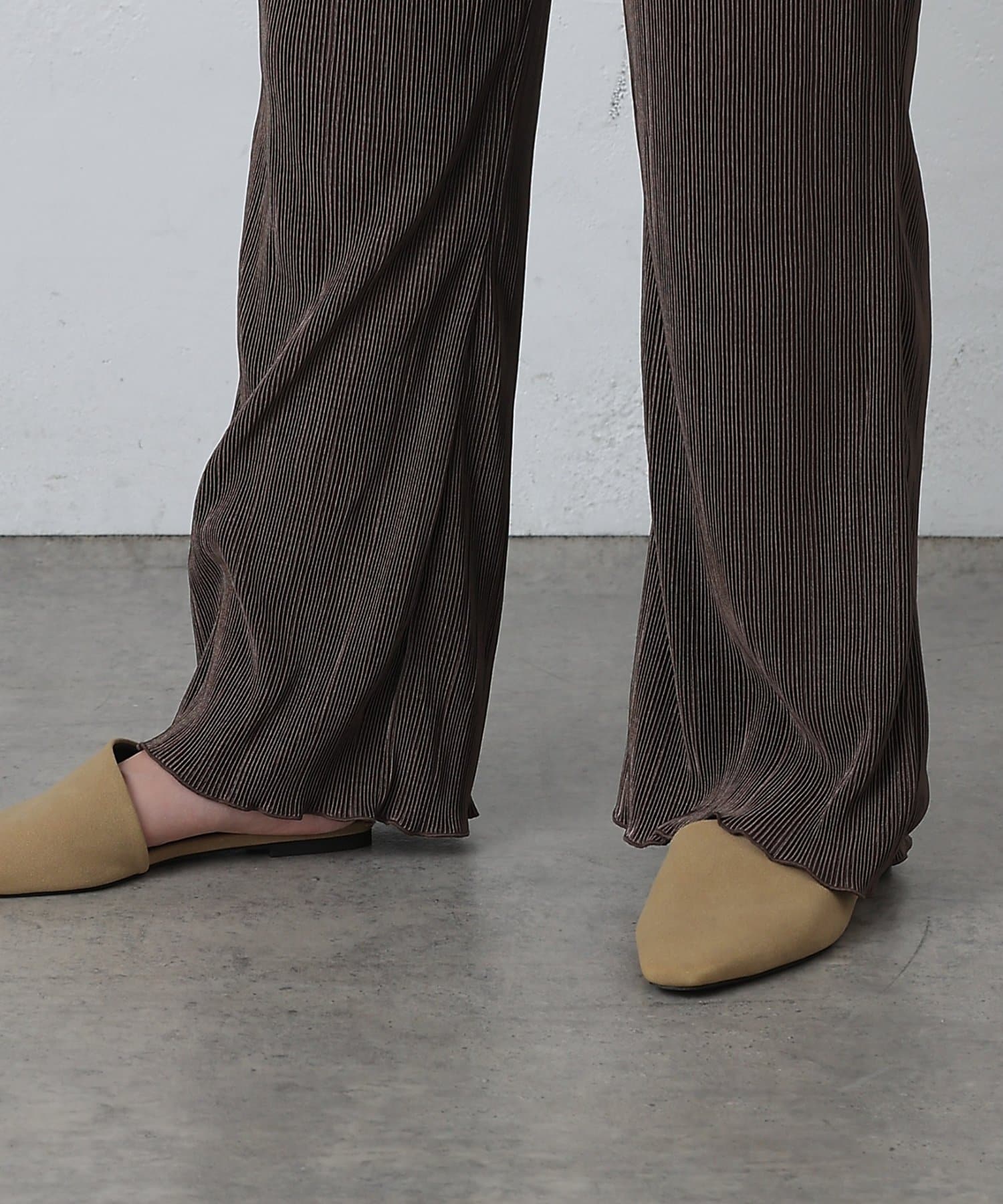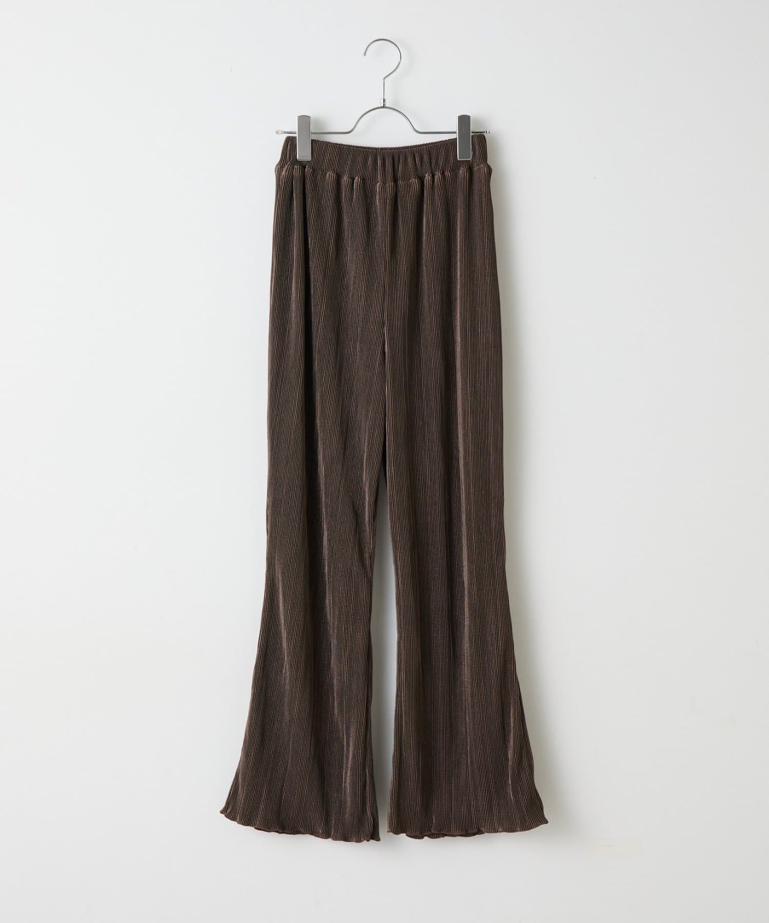 繊細な縦プリーツが、上品な光沢と陰影を生み出すフレアパンツ。