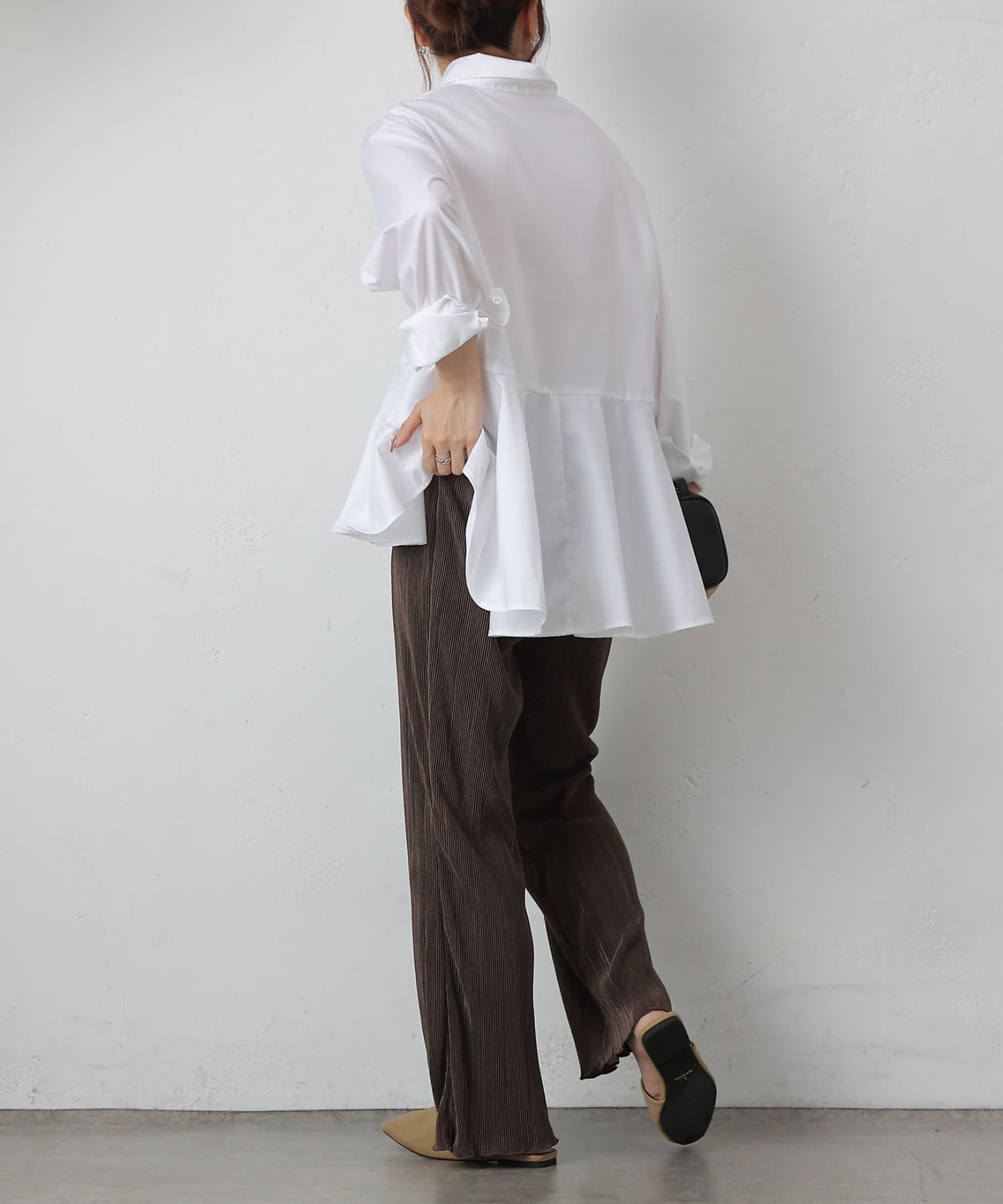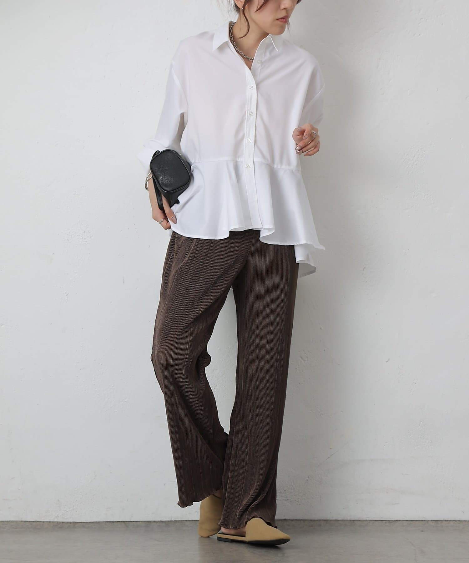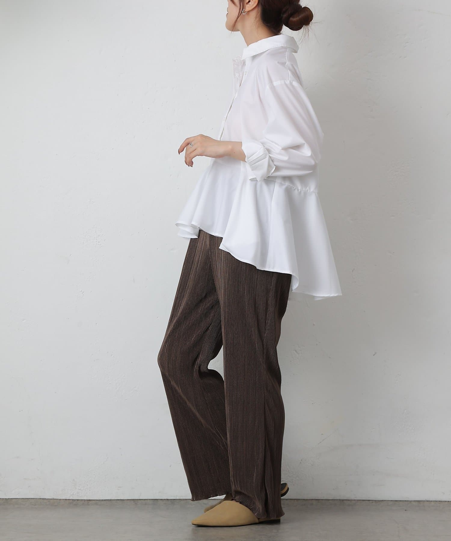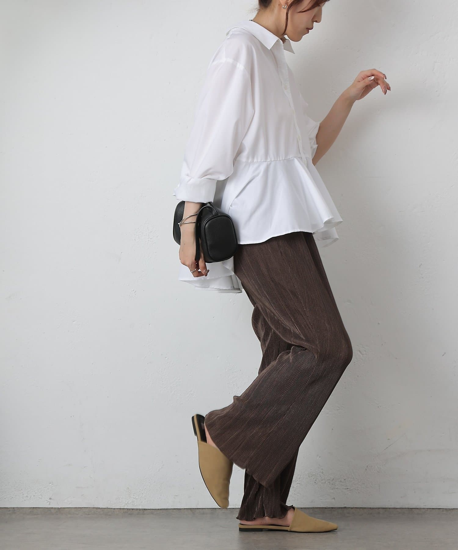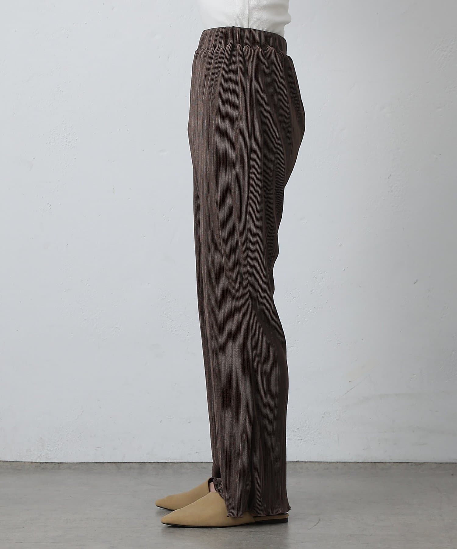 繊細な縦プリーツが、上品な光沢と陰影を生み出すフレアパンツ。