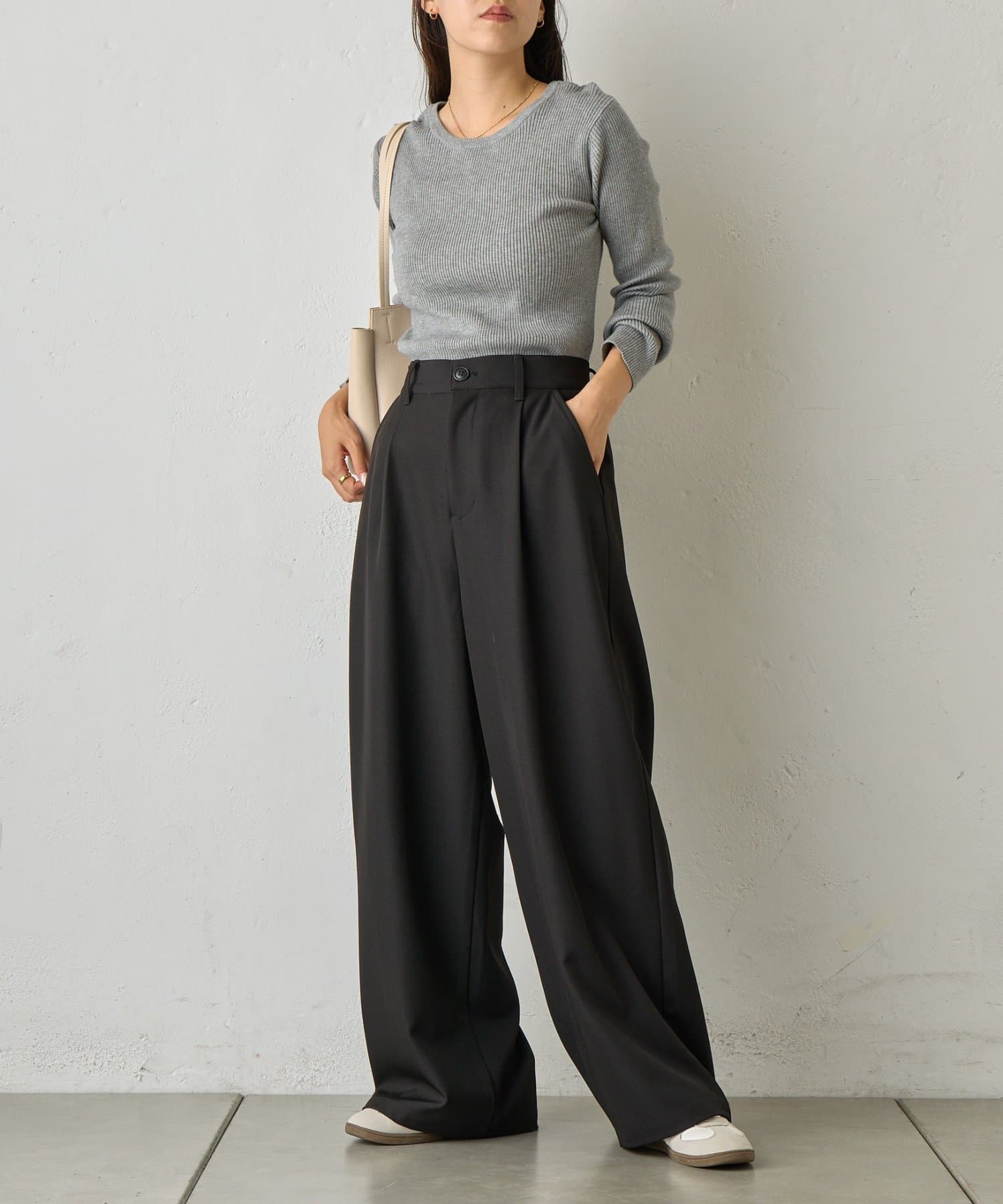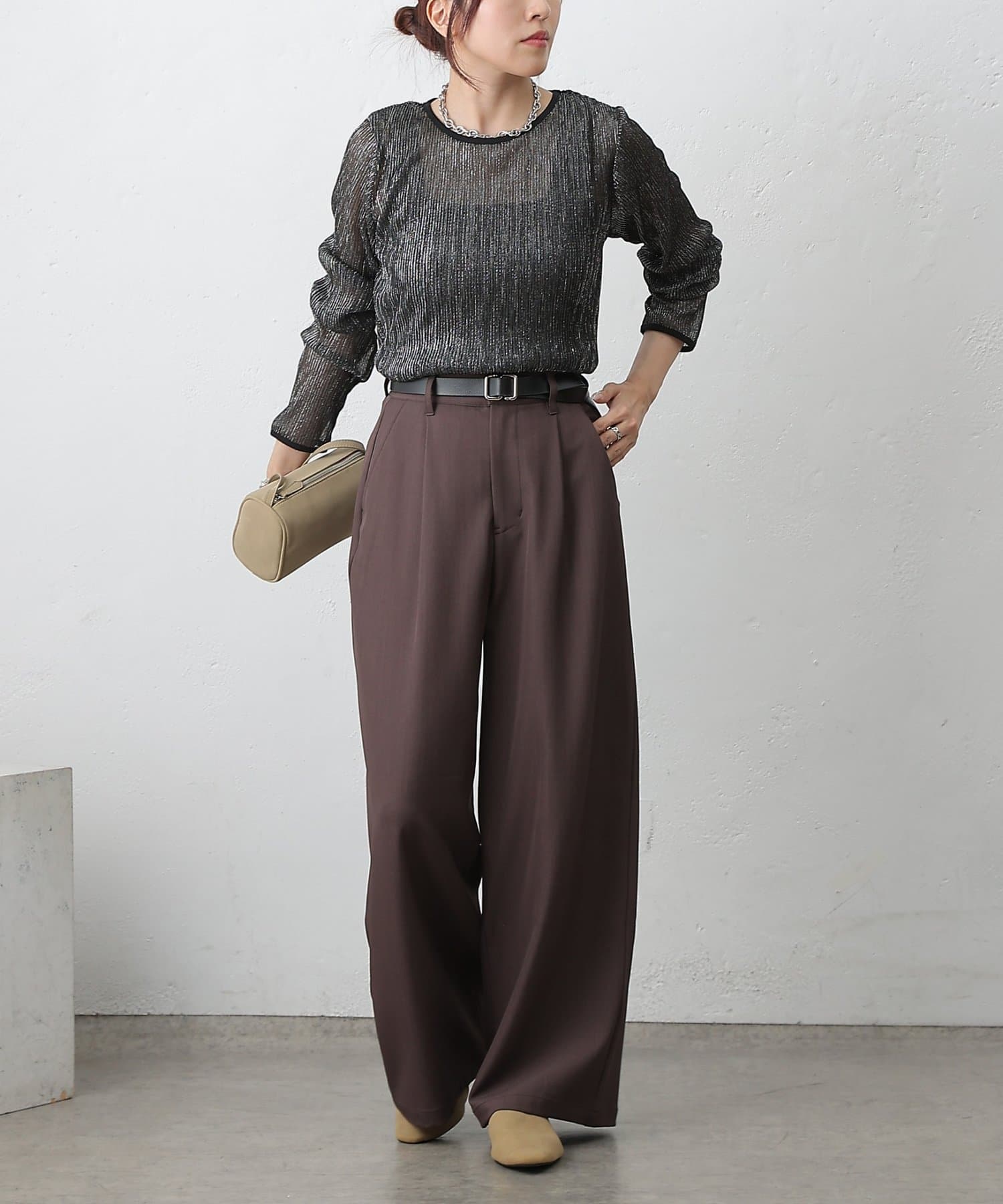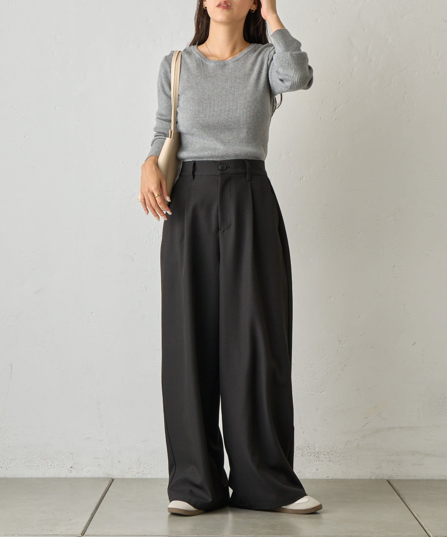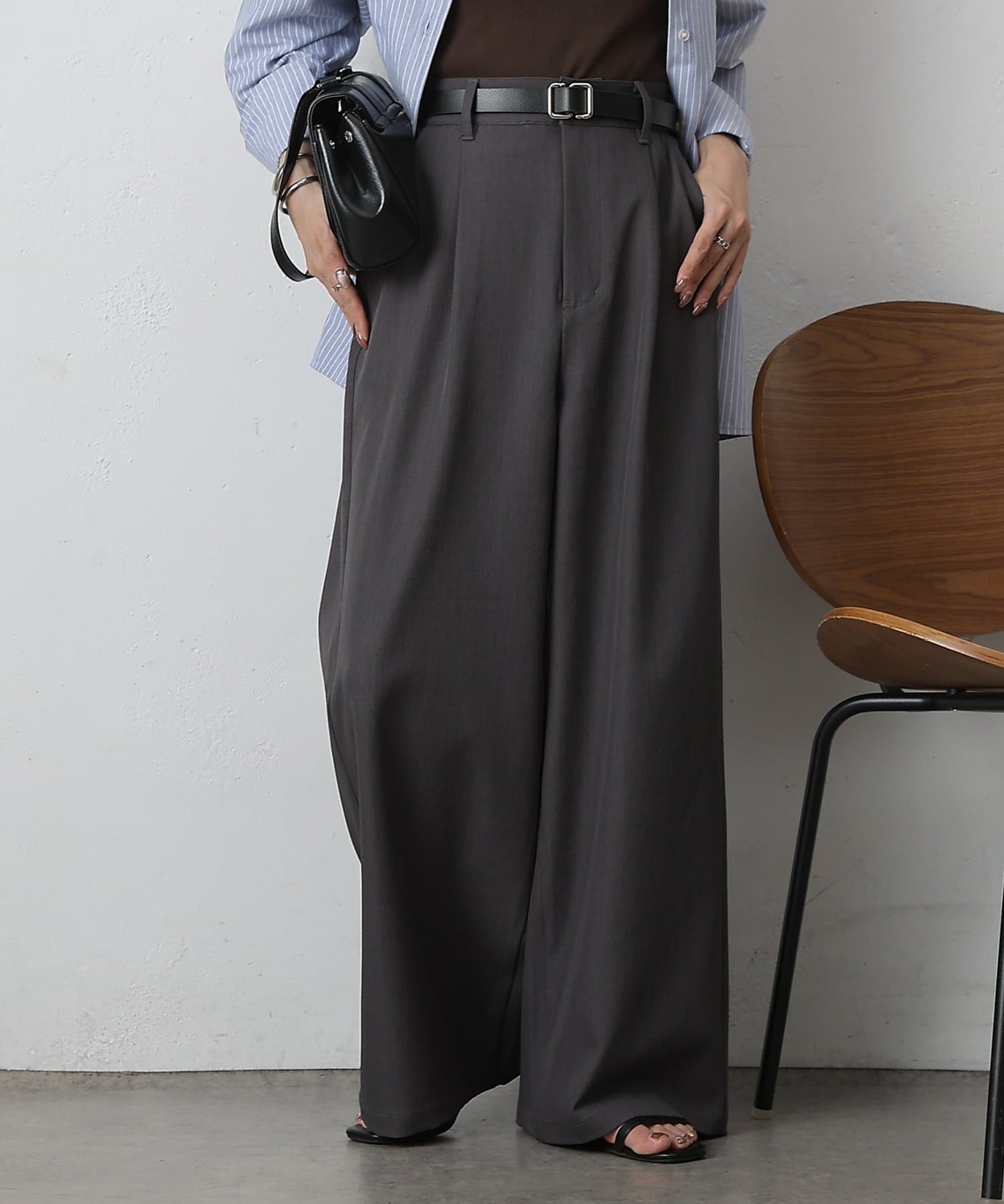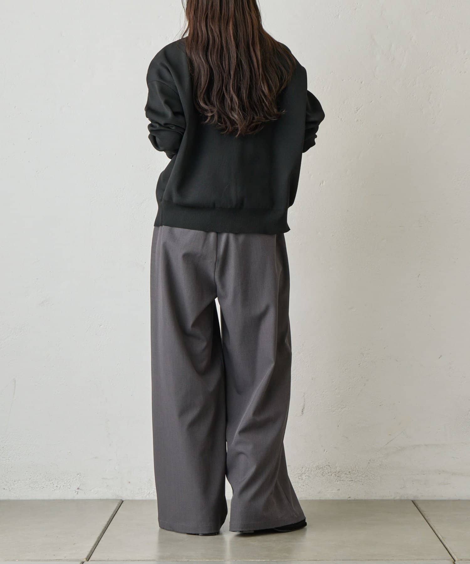 オンオフ問わず着回しの効く、万能ワイドスラックスです。
