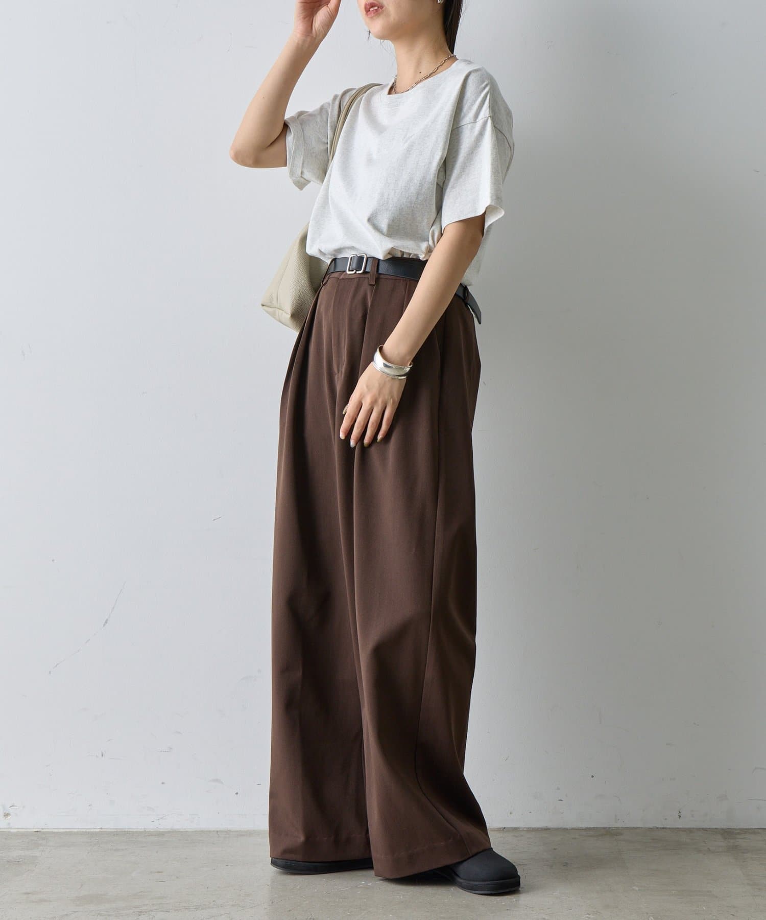 ゆったりとしたワイドシルエットで動きやすく、カジュアルからビジネスまで幅広いシーンにマッチします。