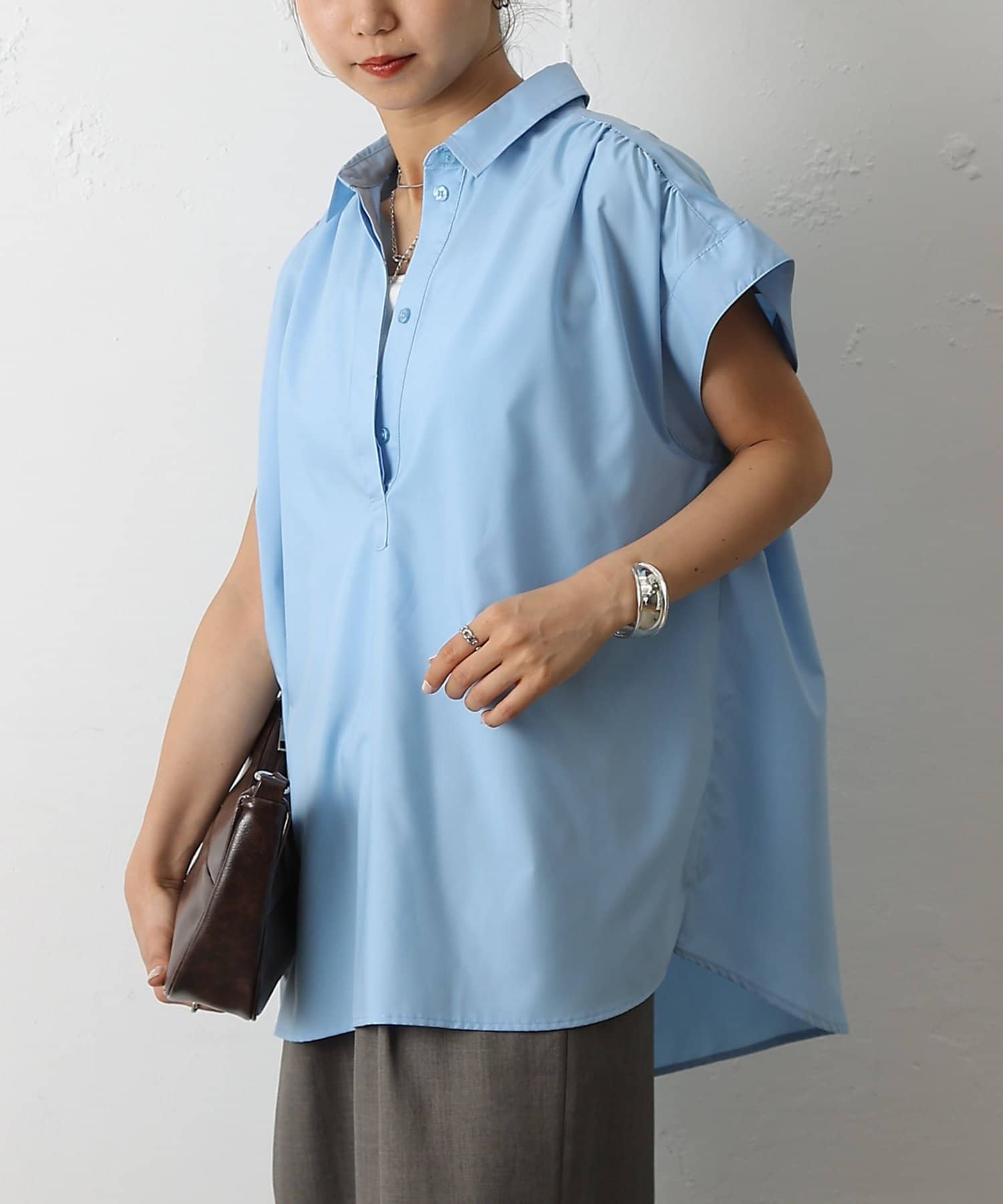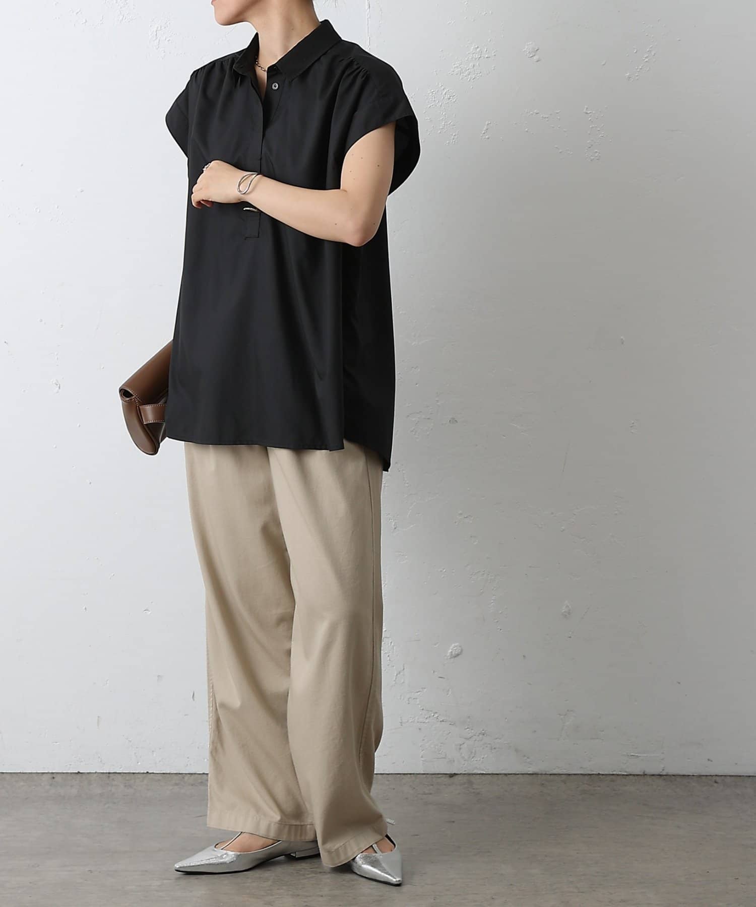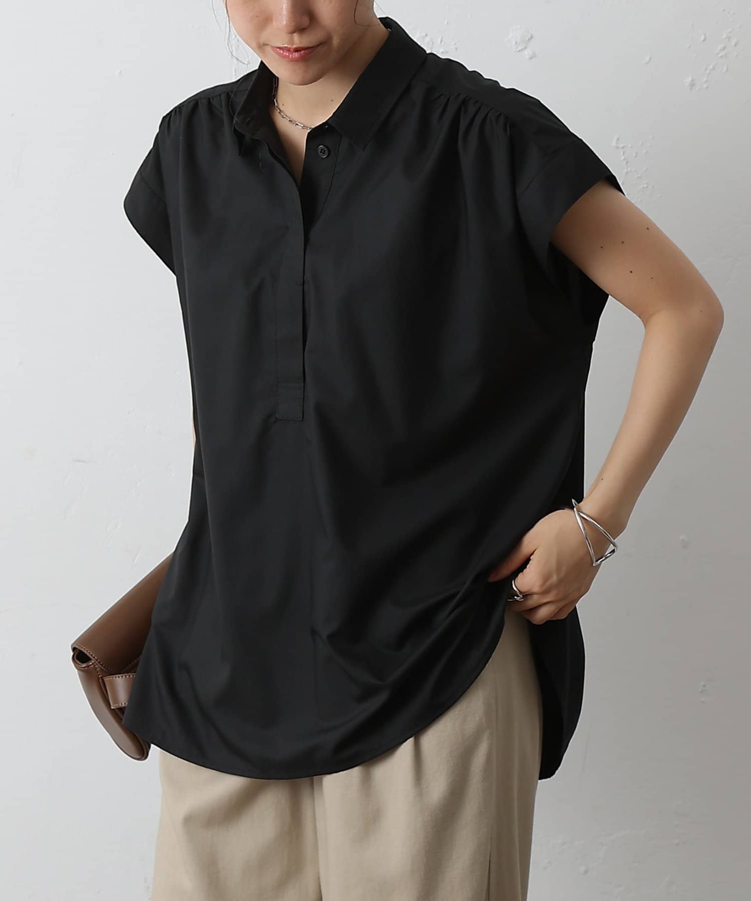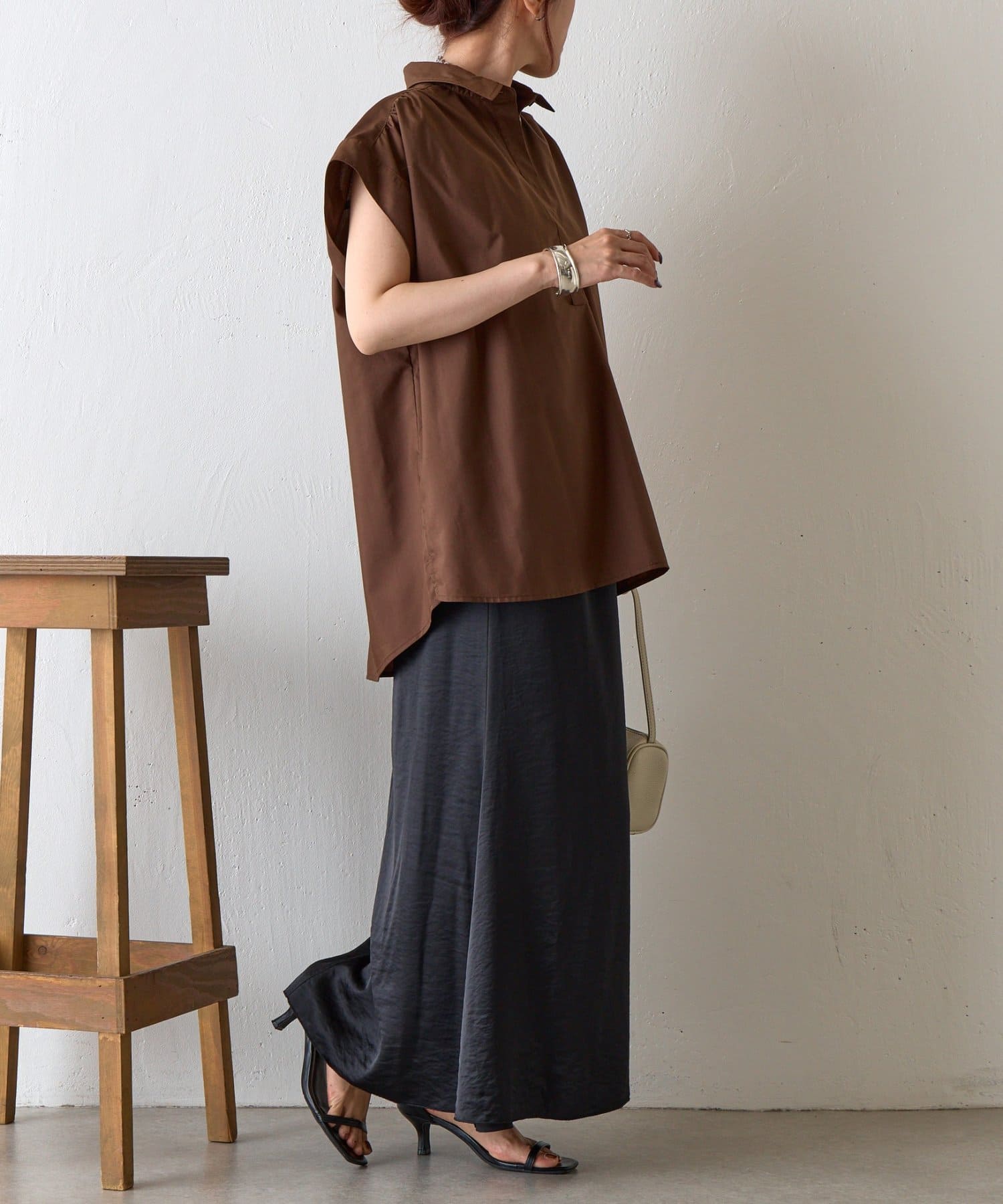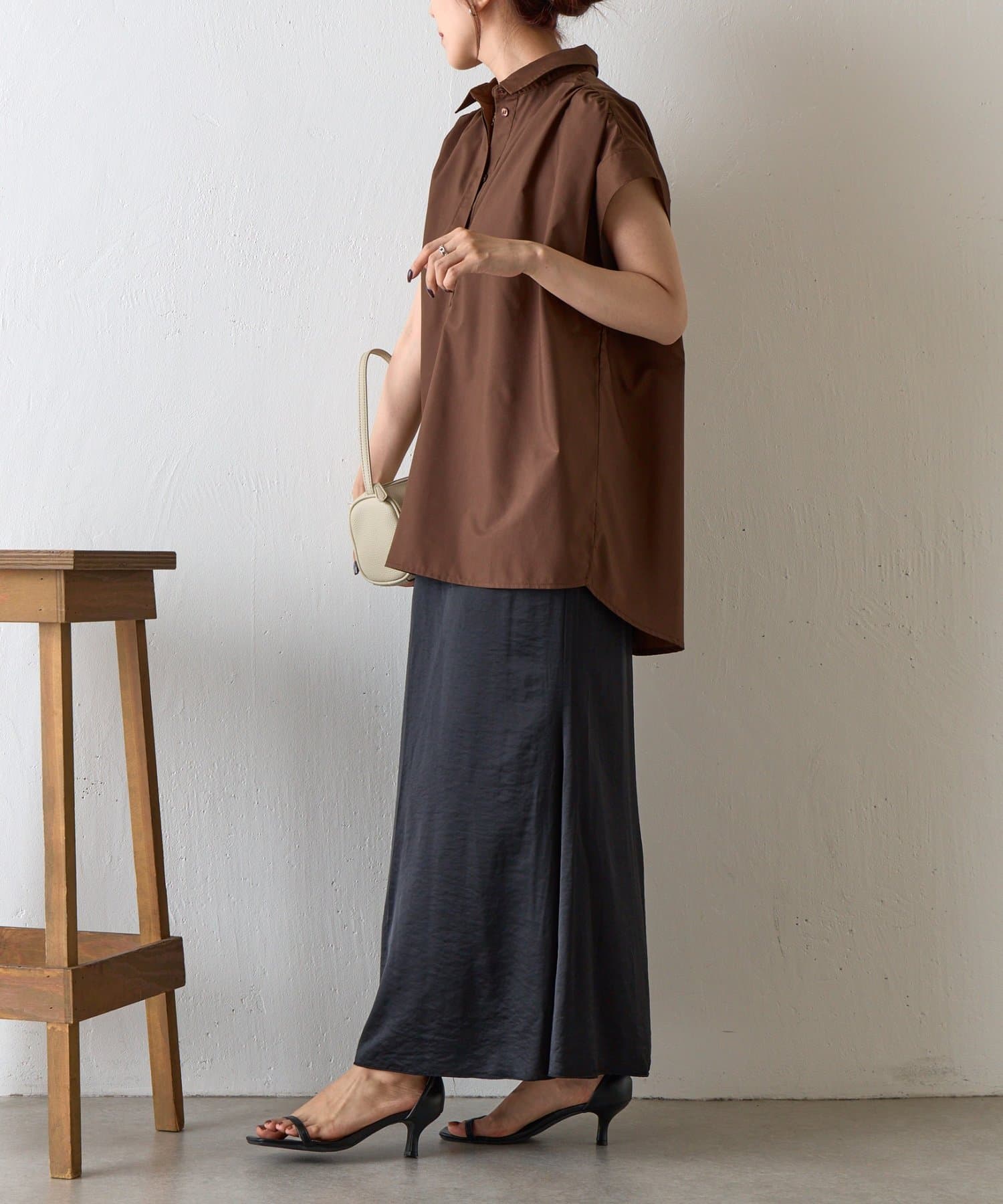 シンプルなデザインながらも、肩のギャザーがさりげないアクセントになったブラウス。露出が控えめなフレンチスリーブは、気になる二の腕をカバーしつつ、華奢見え効果も◎スキッパーネックは首元をすっきりと見せ、抜け感とこなれ感を演出。裾はラウンドヘムでボトムスとのバランスが取りやすく、気になるヒップラインをさりげなくカバーできるデザイン。インスタイルにしてもスタイリングが決まります。微光沢のある生地が高見えで上品な印象を与えてくれます。きれいめなパンツやスカートと合わせてオフィススタイルに、デニムと合わせてカジュアルスタイルにと、様々なシーンで活躍します。カーディガンやジャケットを羽織れば、ロングシーズン着用可能です。