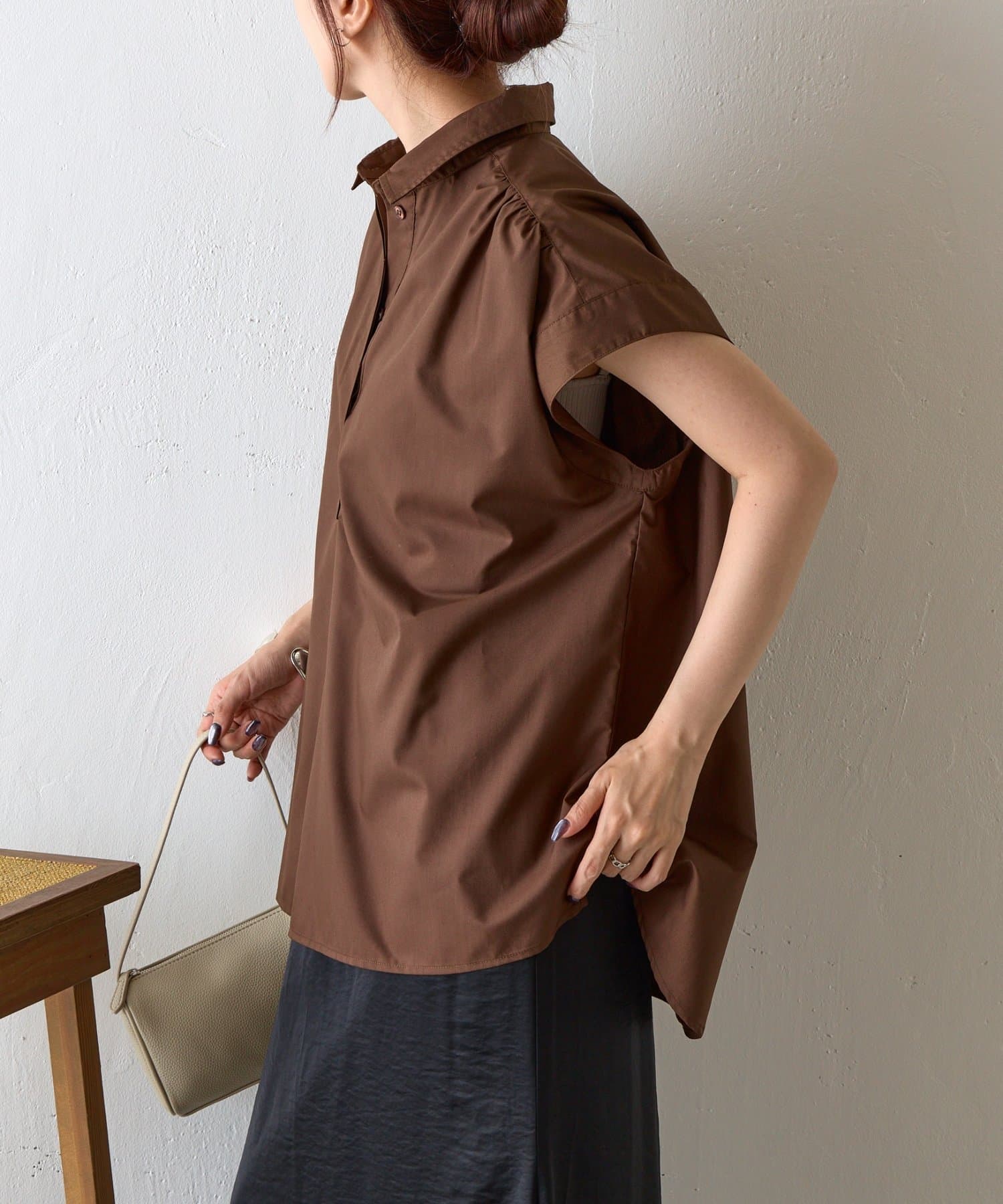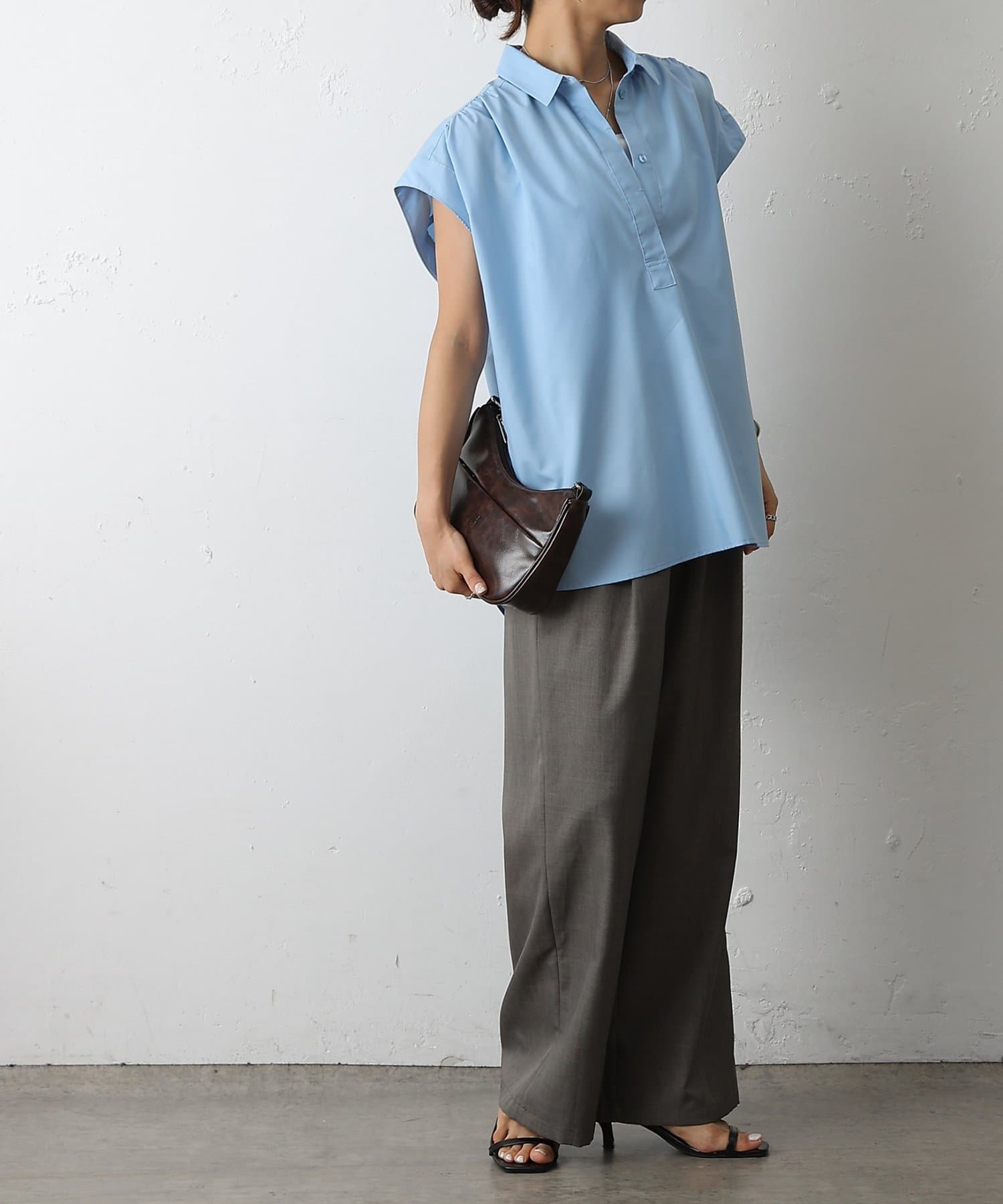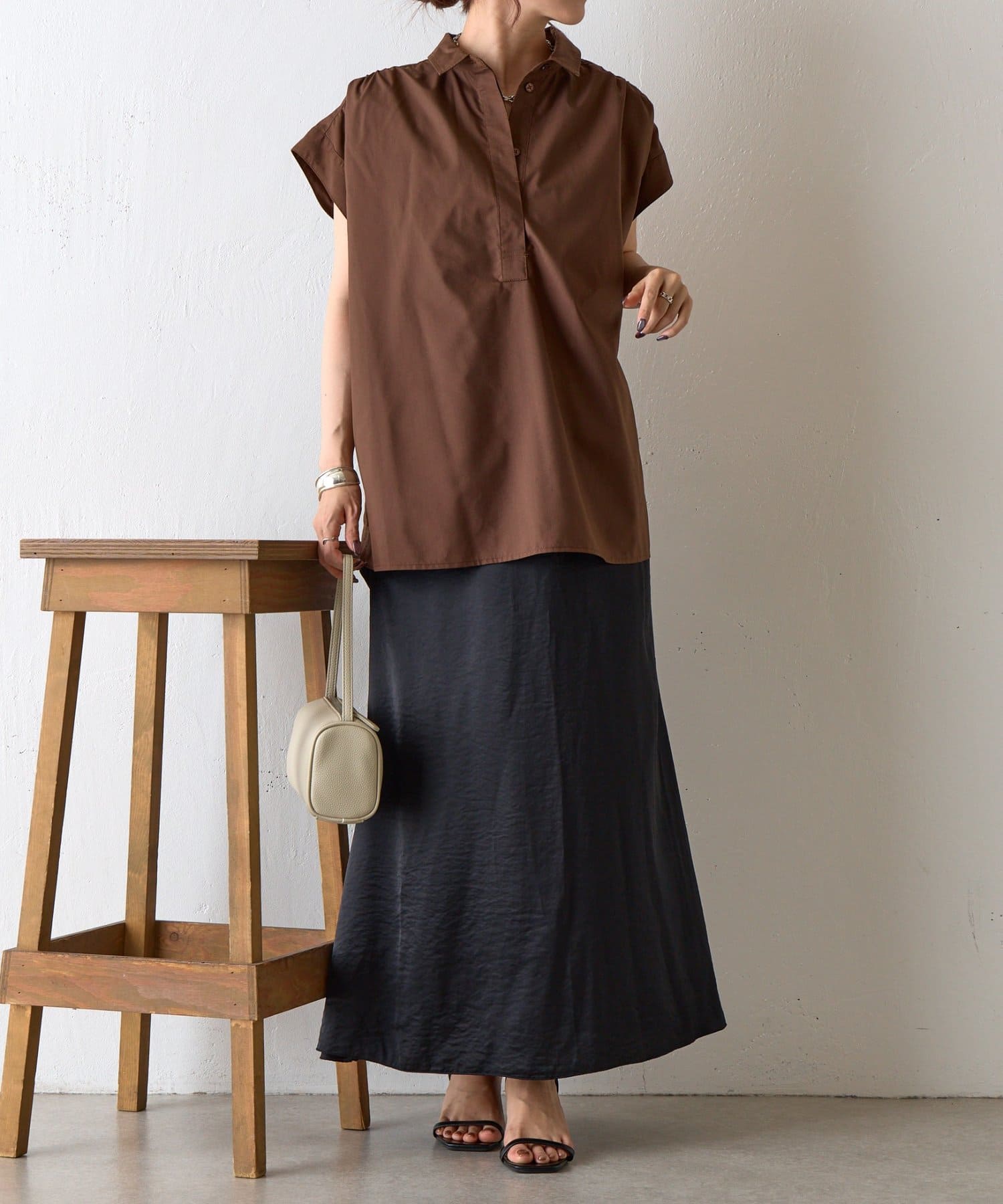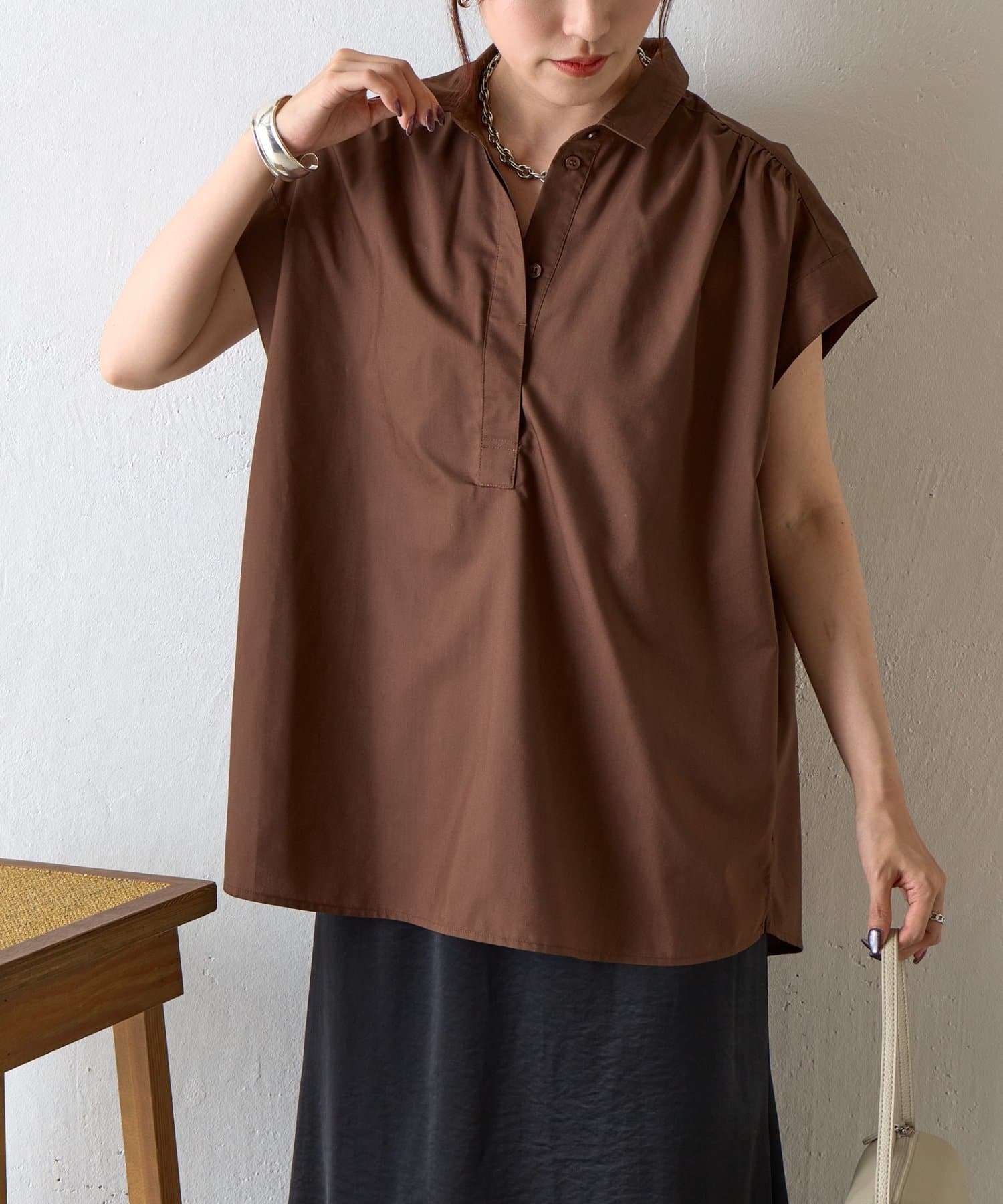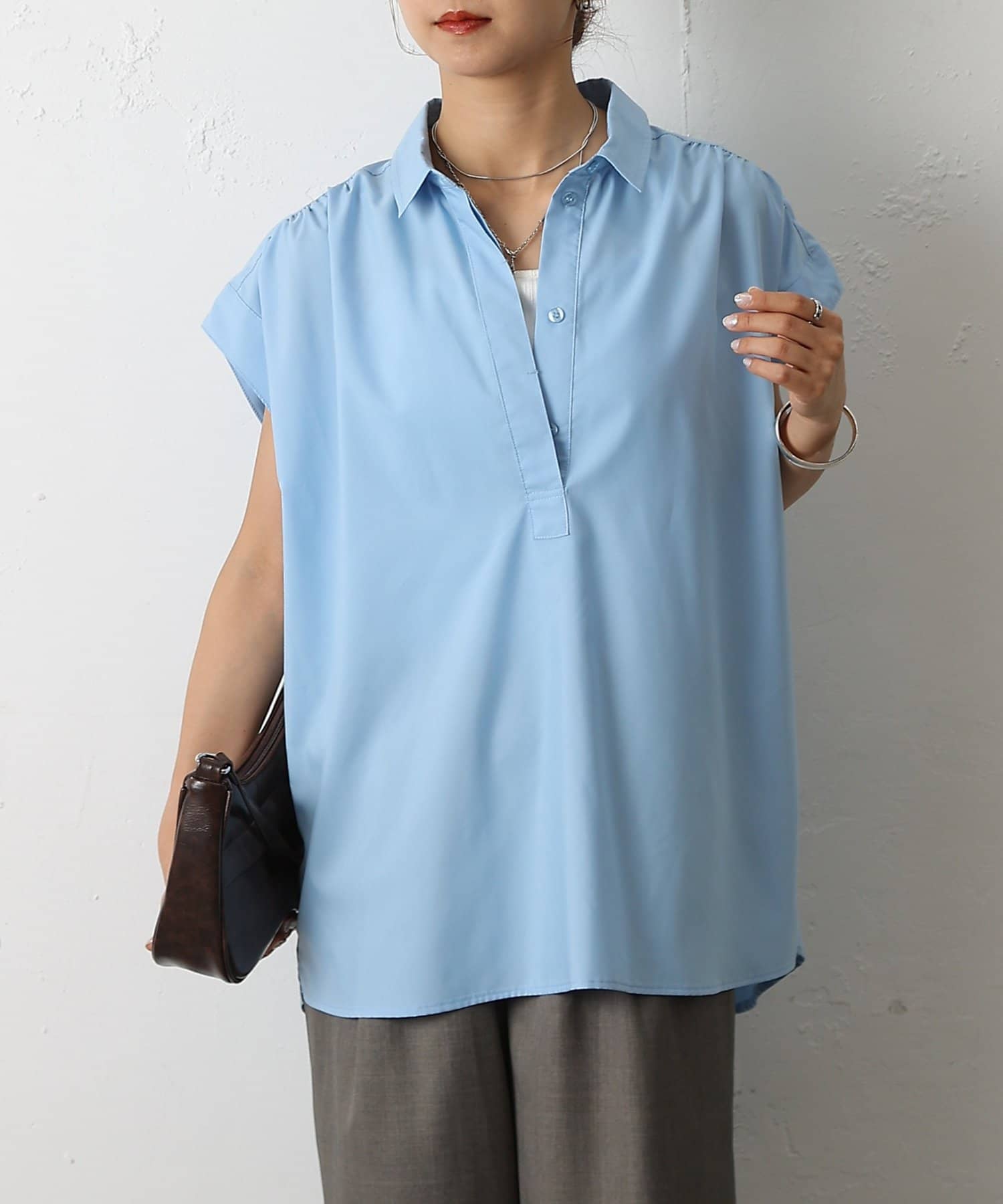 シンプルなデザインながらも、肩のギャザーがさりげないアクセントになったブラウス。露出が控えめなフレンチスリーブは、気になる二の腕をカバーしつつ、華奢見え効果も◎スキッパーネックは首元をすっきりと見せ、抜け感とこなれ感を演出。裾はラウンドヘムでボトムスとのバランスが取りやすく、気になるヒップラインをさりげなくカバーできるデザイン。インスタイルにしてもスタイリングが決まります。微光沢のある生地が高見えで上品な印象を与えてくれます。きれいめなパンツやスカートと合わせてオフィススタイルに、デニムと合わせてカジュアルスタイルにと、様々なシーンで活躍します。カーディガンやジャケットを羽織れば、ロングシーズン着用可能です。