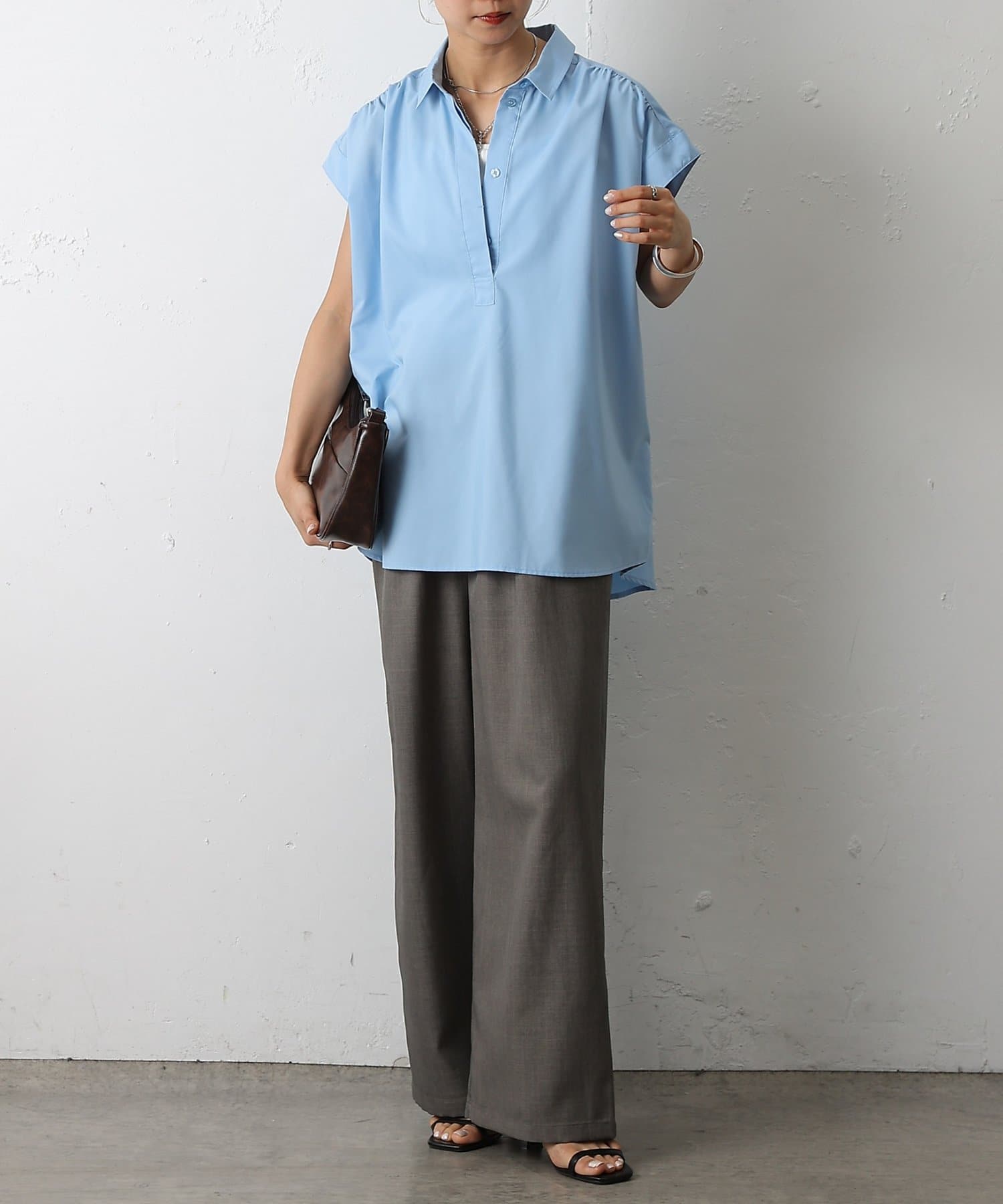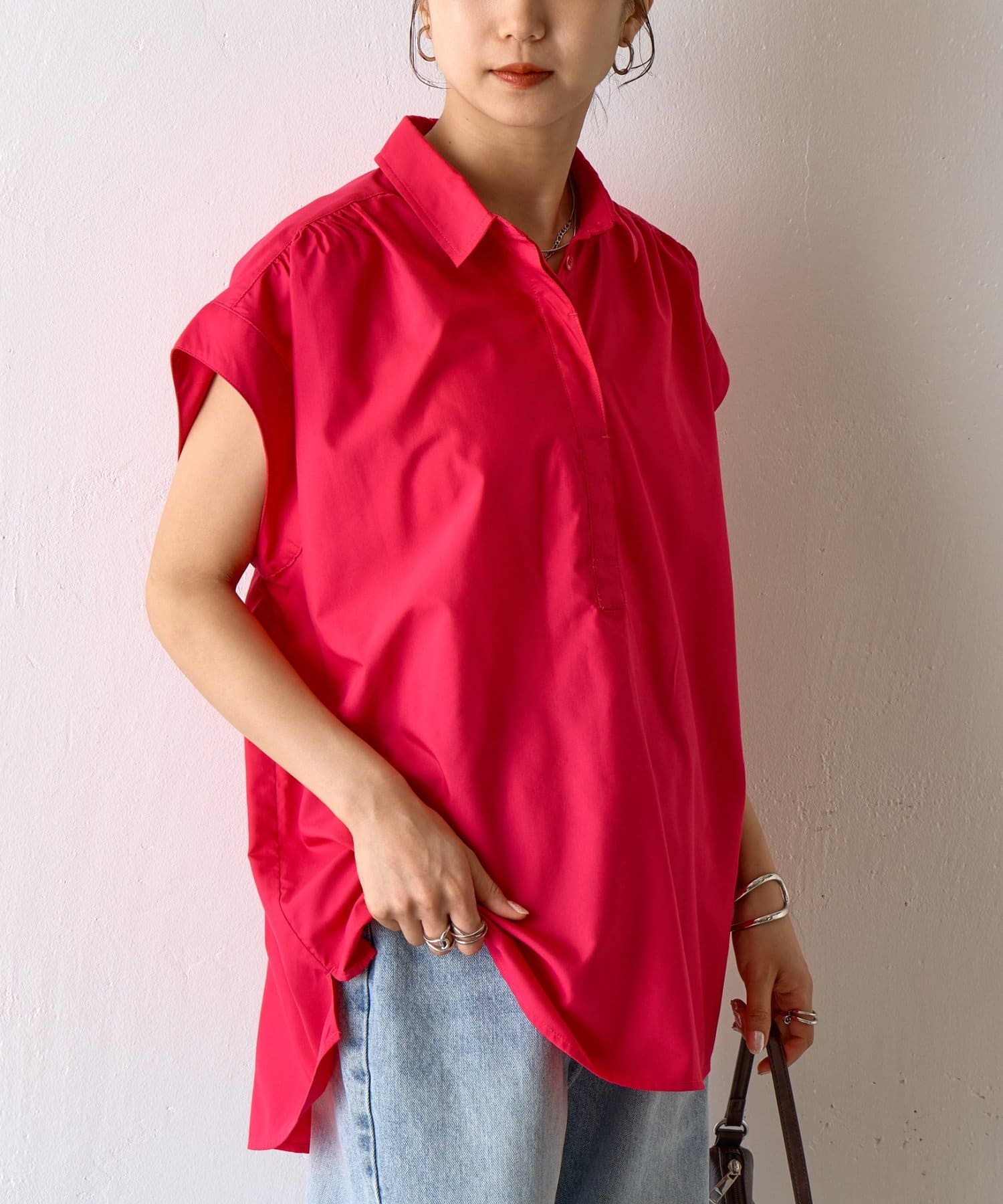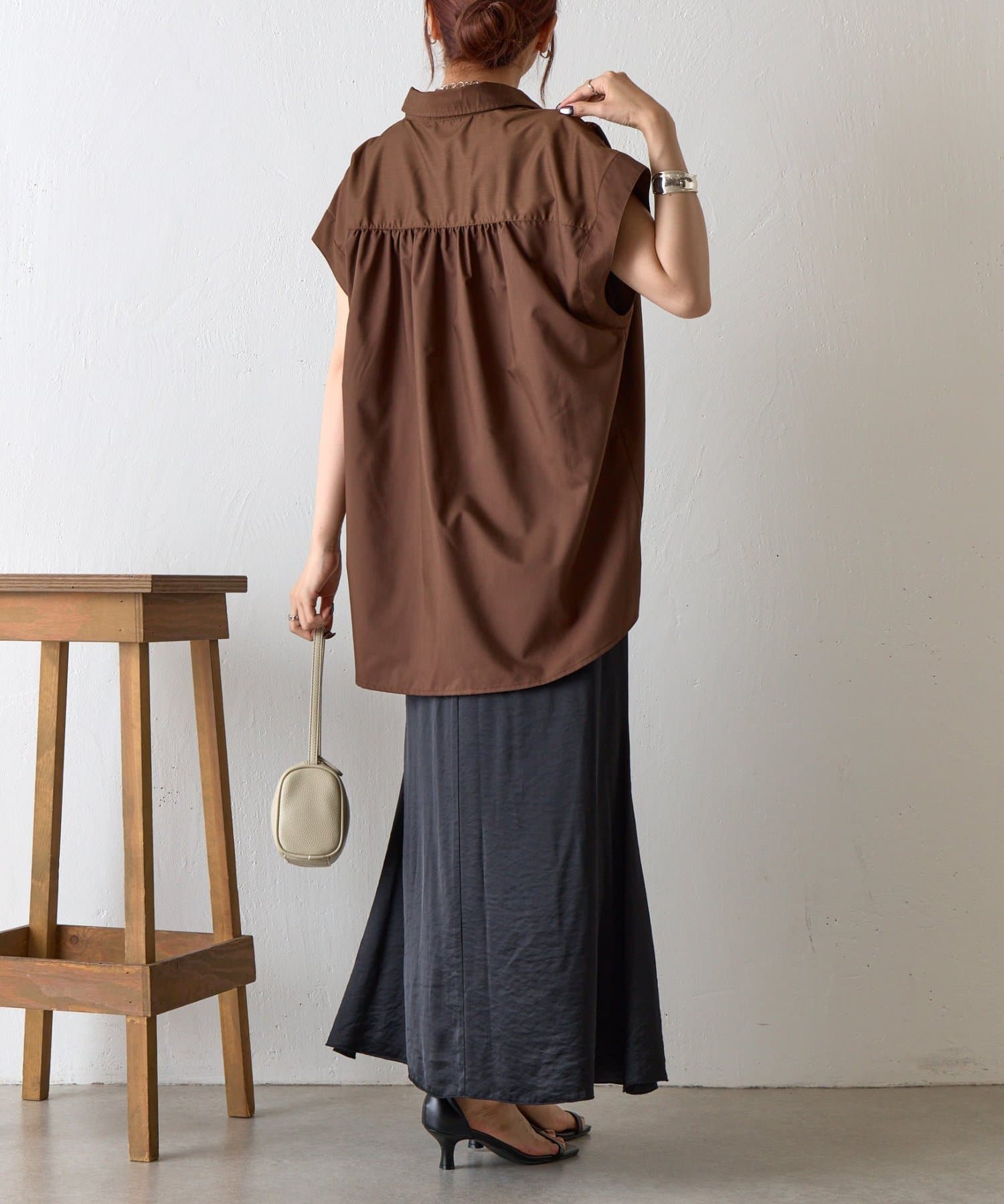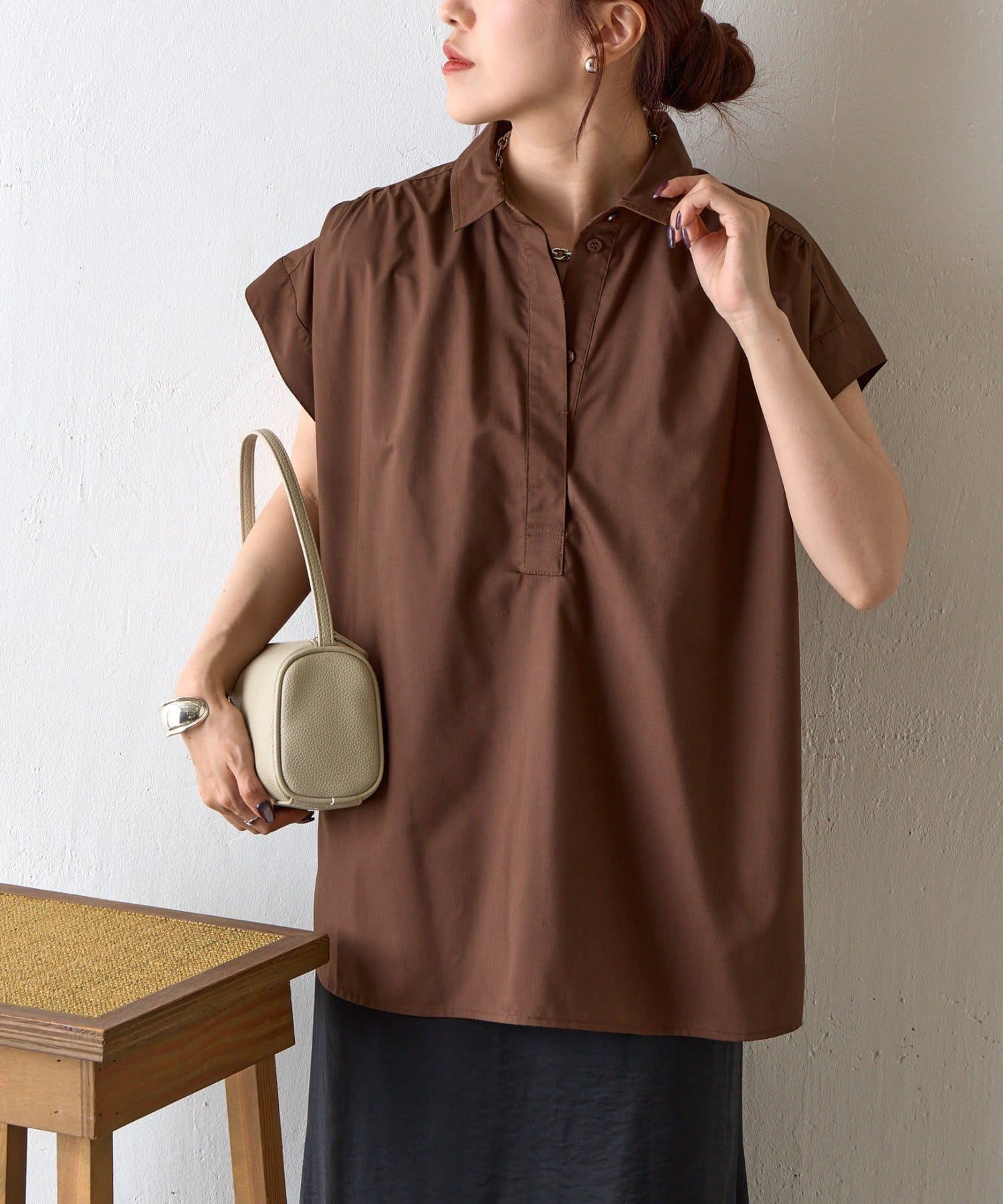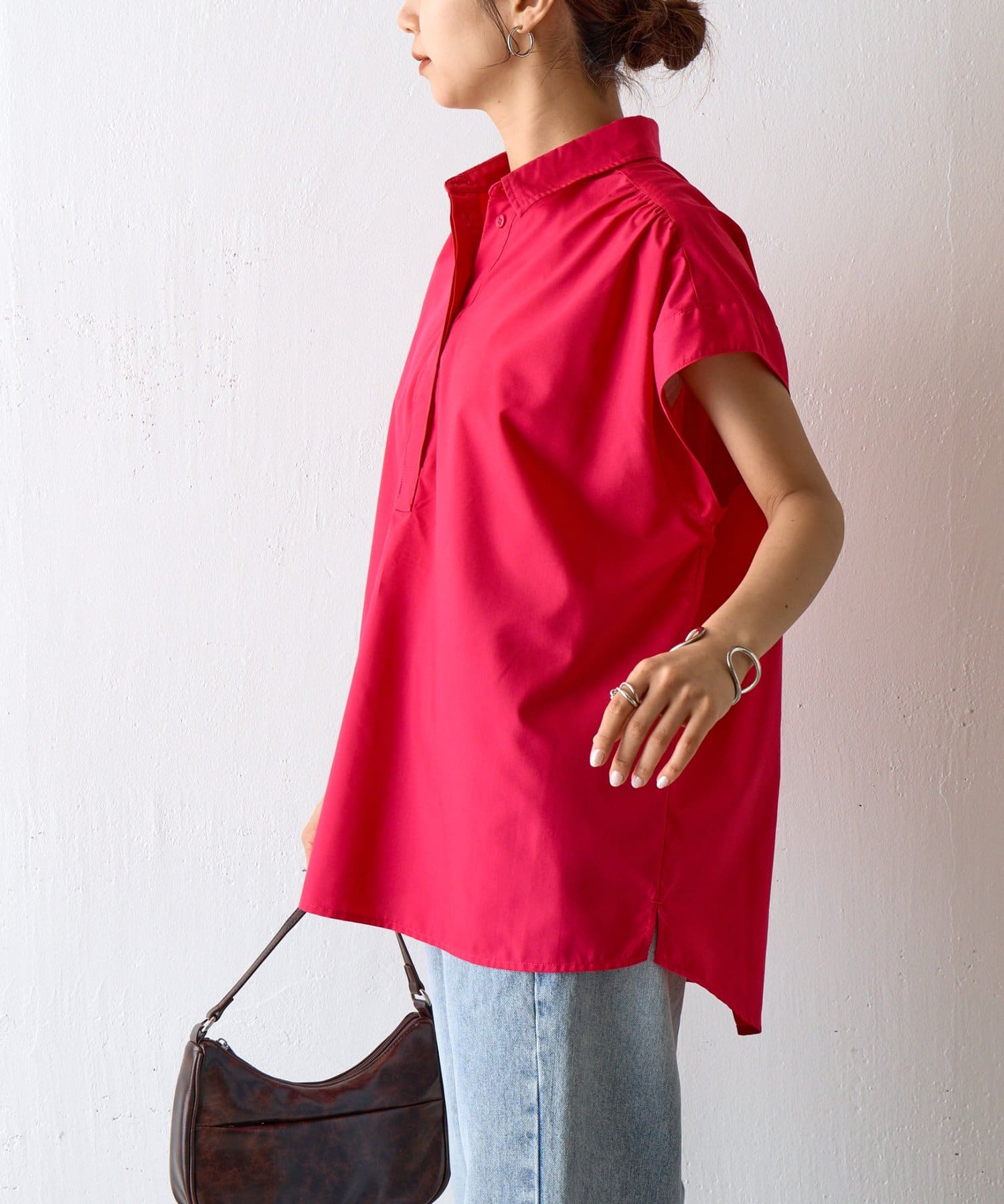 シンプルなデザインながらも、肩のギャザーがさりげないアクセントになったブラウス。露出が控えめなフレンチスリーブは、気になる二の腕をカバーしつつ、華奢見え効果も◎スキッパーネックは首元をすっきりと見せ、抜け感とこなれ感を演出。裾はラウンドヘムでボトムスとのバランスが取りやすく、気になるヒップラインをさりげなくカバーできるデザイン。インスタイルにしてもスタイリングが決まります。微光沢のある生地が高見えで上品な印象を与えてくれます。きれいめなパンツやスカートと合わせてオフィススタイルに、デニムと合わせてカジュアルスタイルにと、様々なシーンで活躍します。カーディガンやジャケットを羽織れば、ロングシーズン着用可能です。