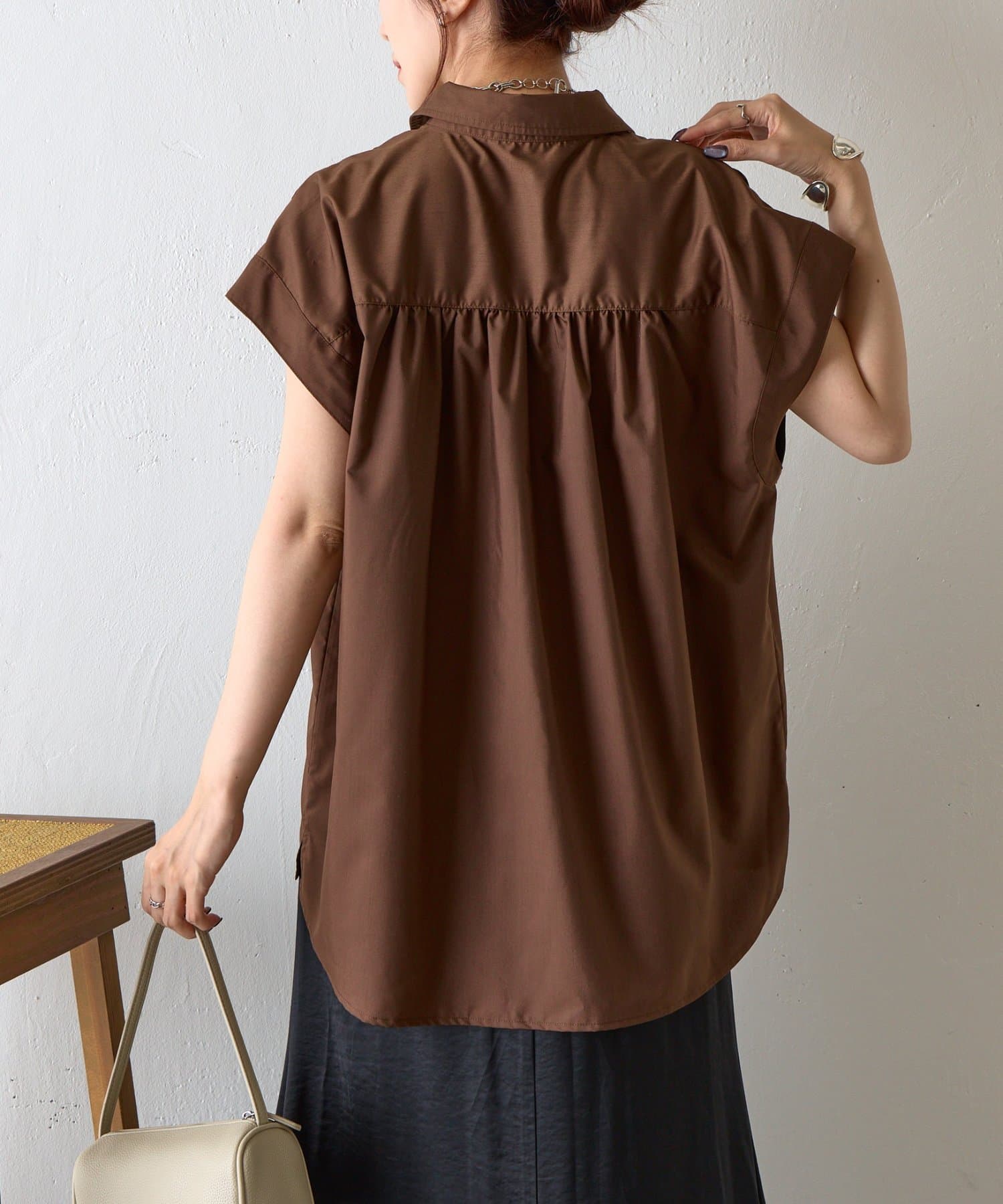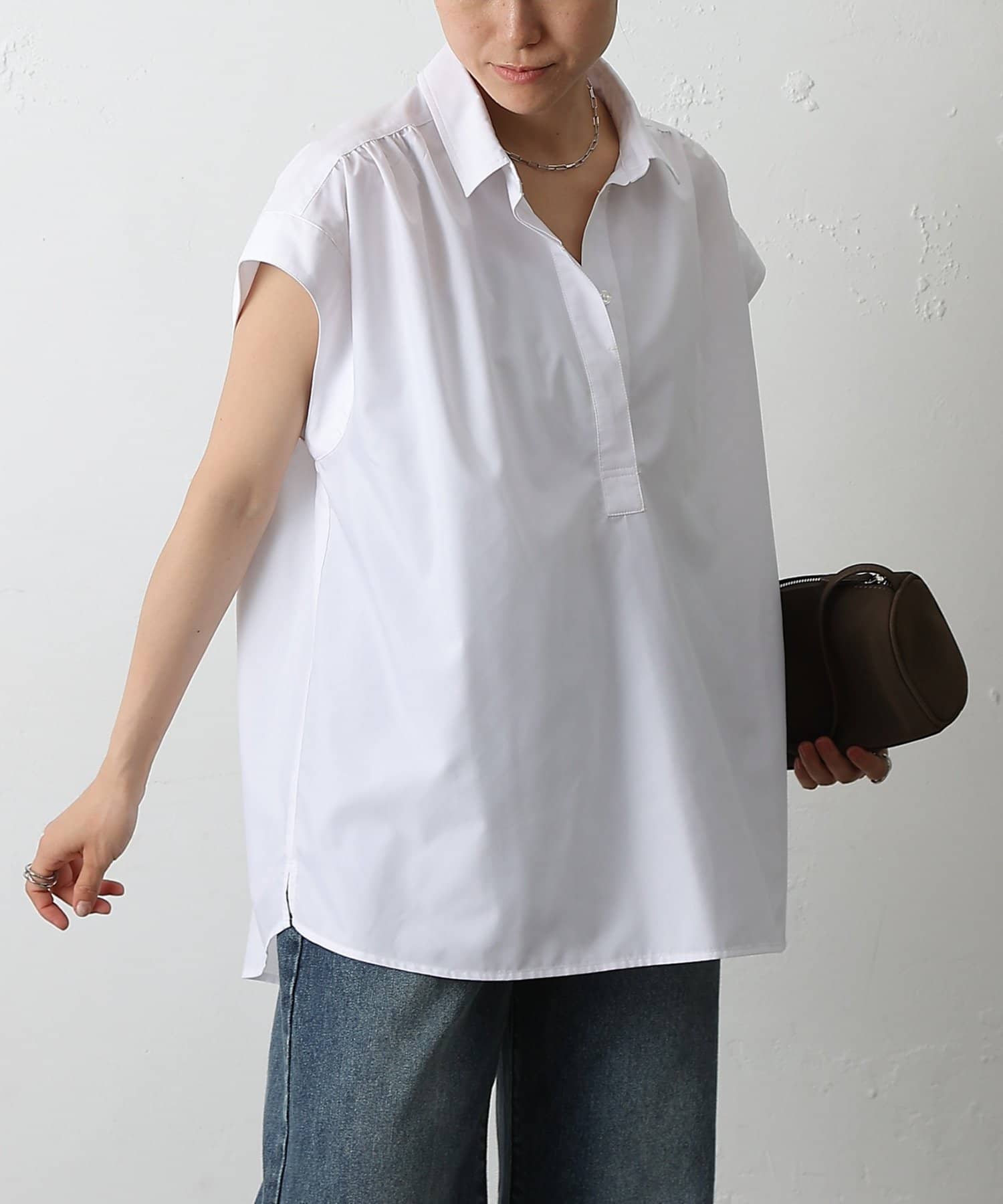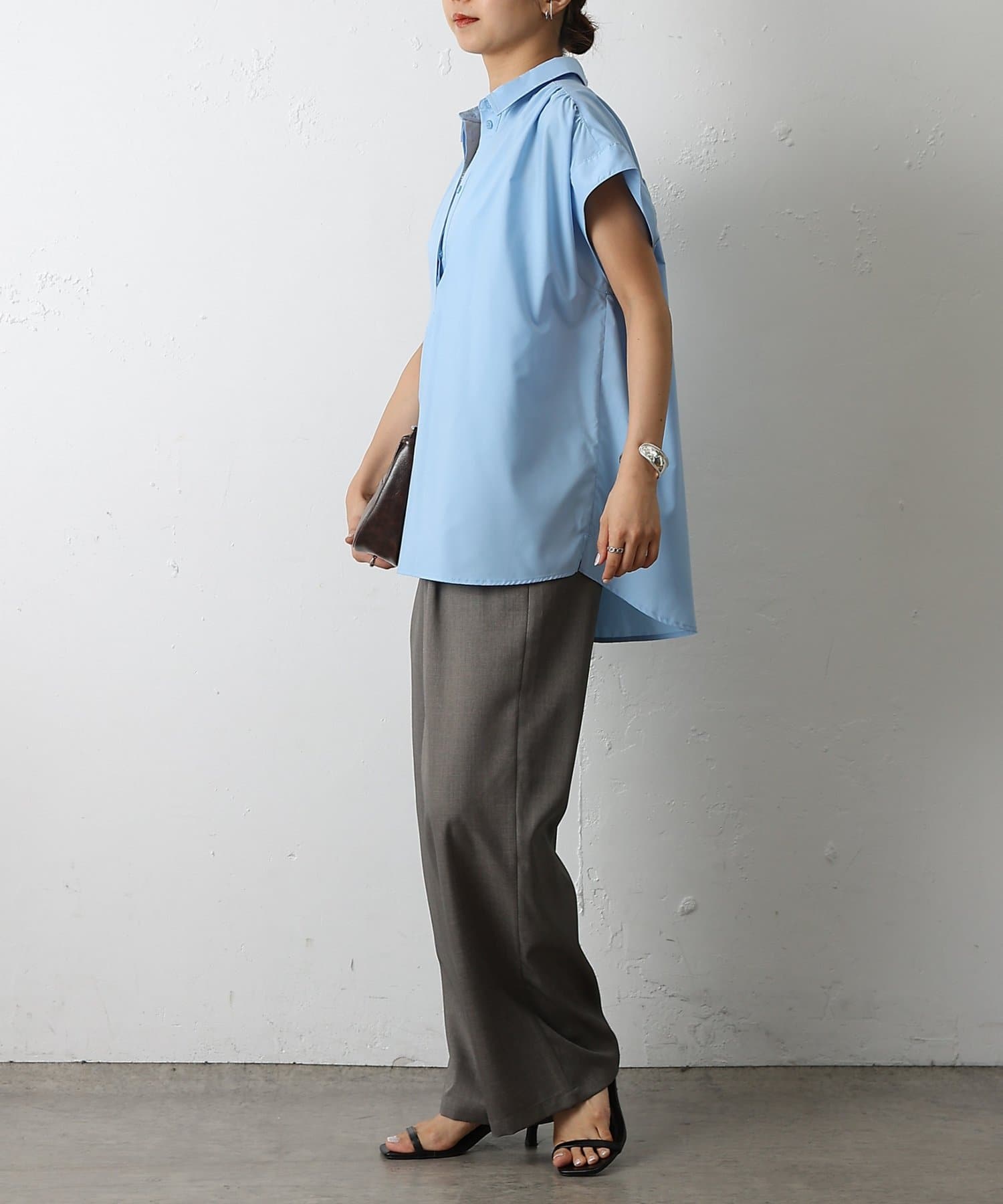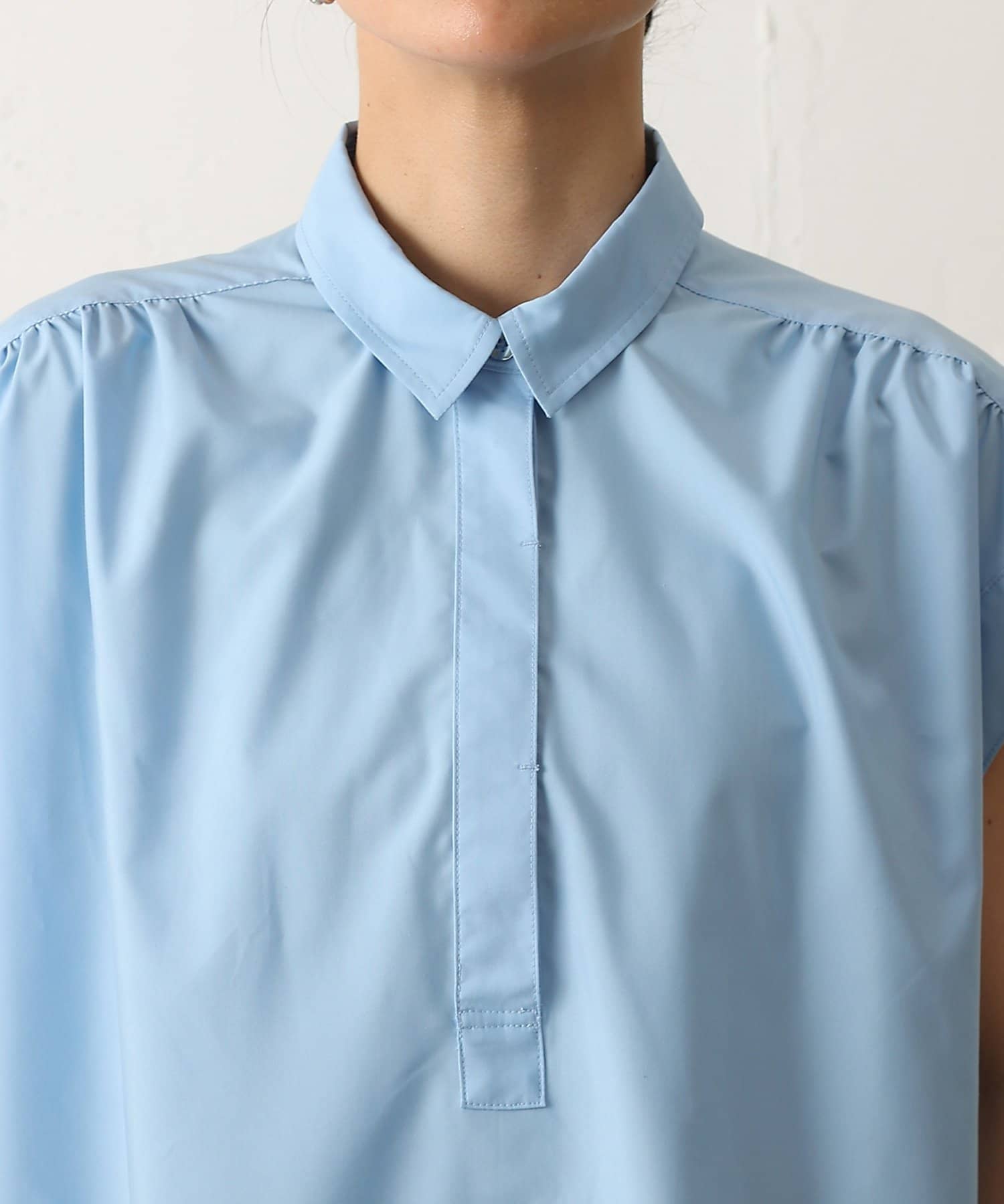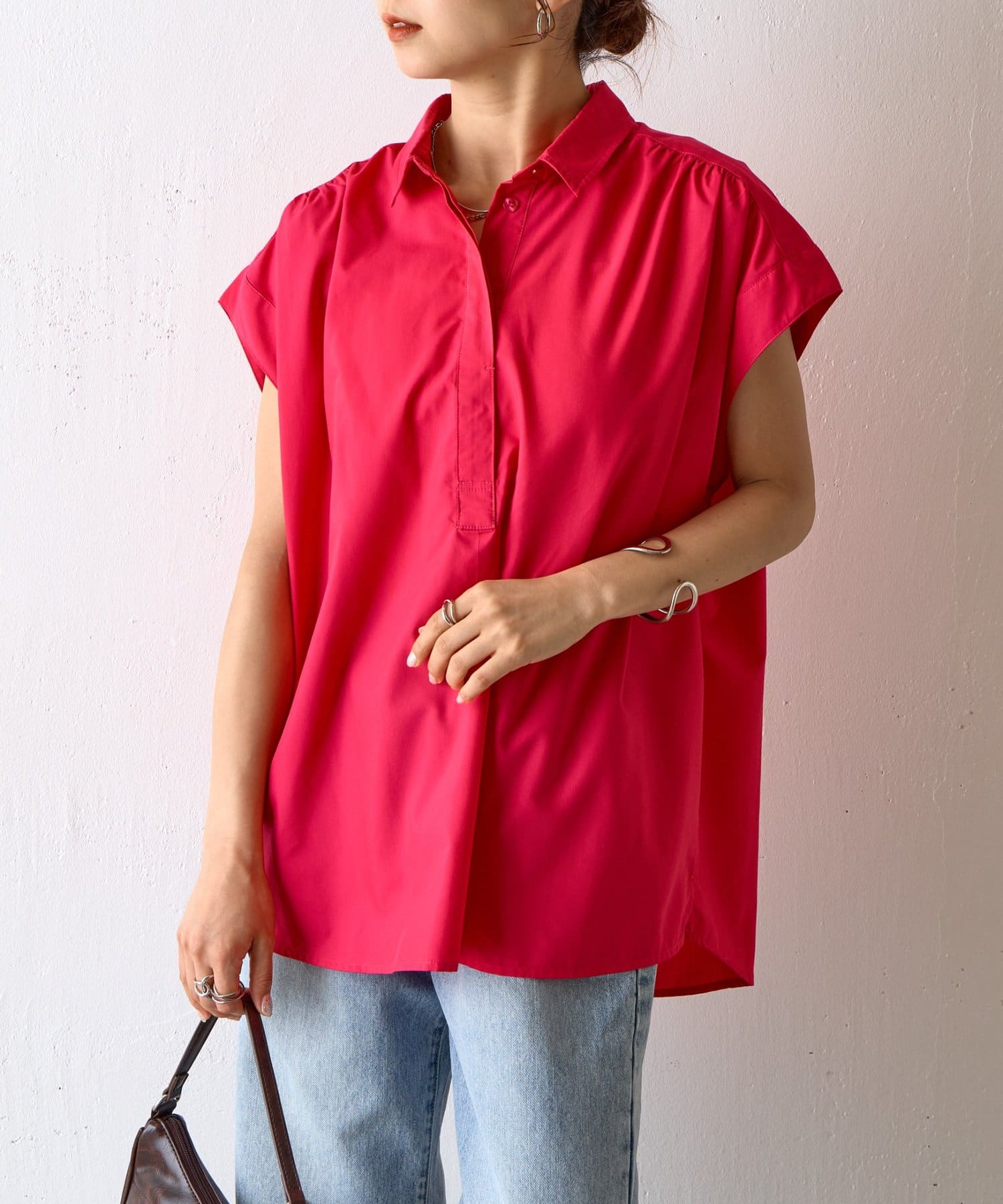 シンプルなデザインながらも、肩のギャザーがさりげないアクセントになったブラウス。露出が控えめなフレンチスリーブは、気になる二の腕をカバーしつつ、華奢見え効果も◎スキッパーネックは首元をすっきりと見せ、抜け感とこなれ感を演出。裾はラウンドヘムでボトムスとのバランスが取りやすく、気になるヒップラインをさりげなくカバーできるデザイン。インスタイルにしてもスタイリングが決まります。微光沢のある生地が高見えで上品な印象を与えてくれます。きれいめなパンツやスカートと合わせてオフィススタイルに、デニムと合わせてカジュアルスタイルにと、様々なシーンで活躍します。カーディガンやジャケットを羽織れば、ロングシーズン着用可能です。